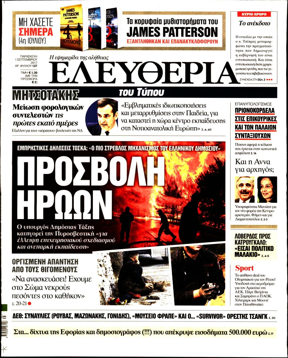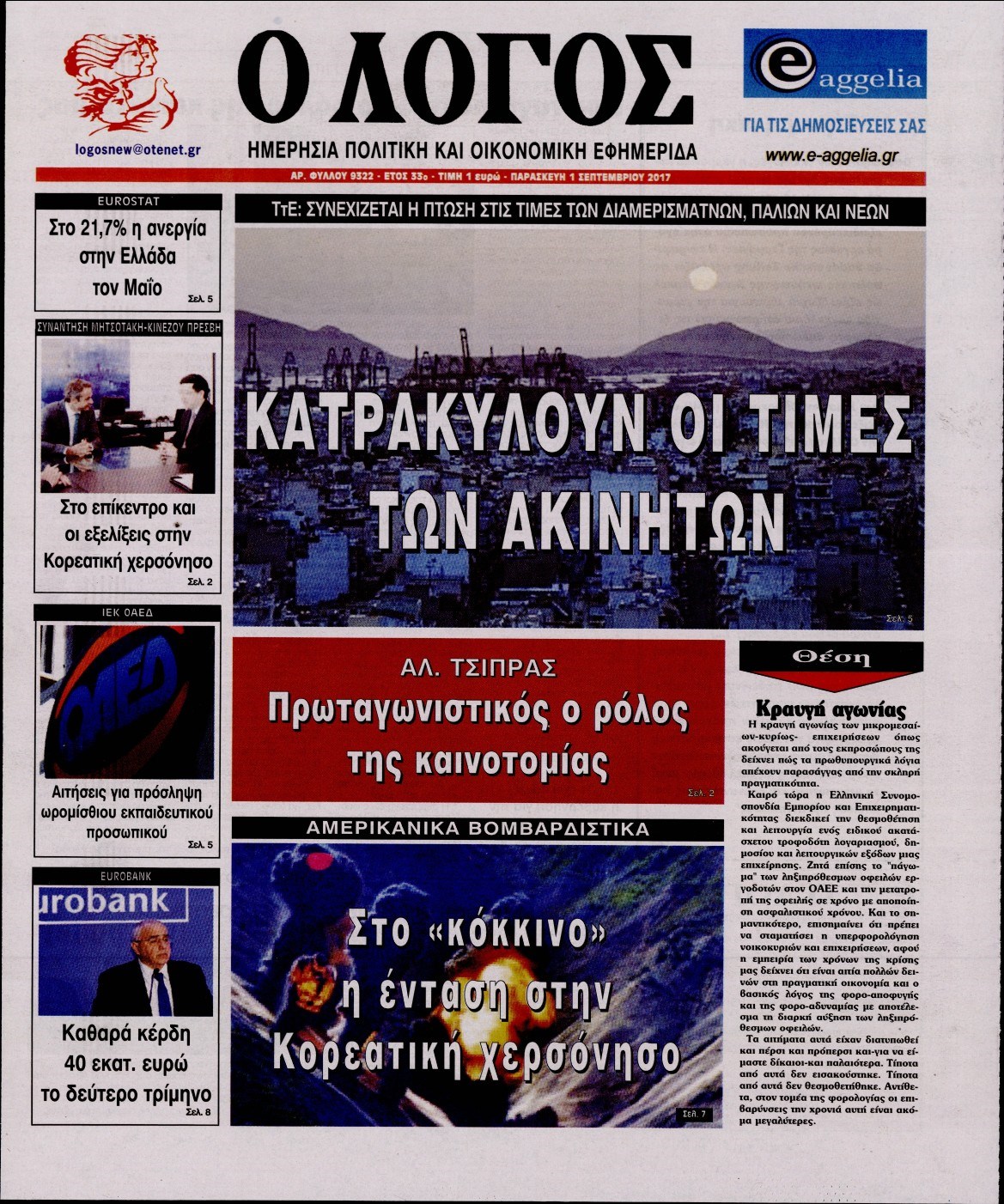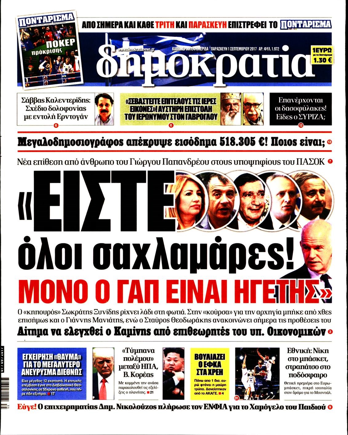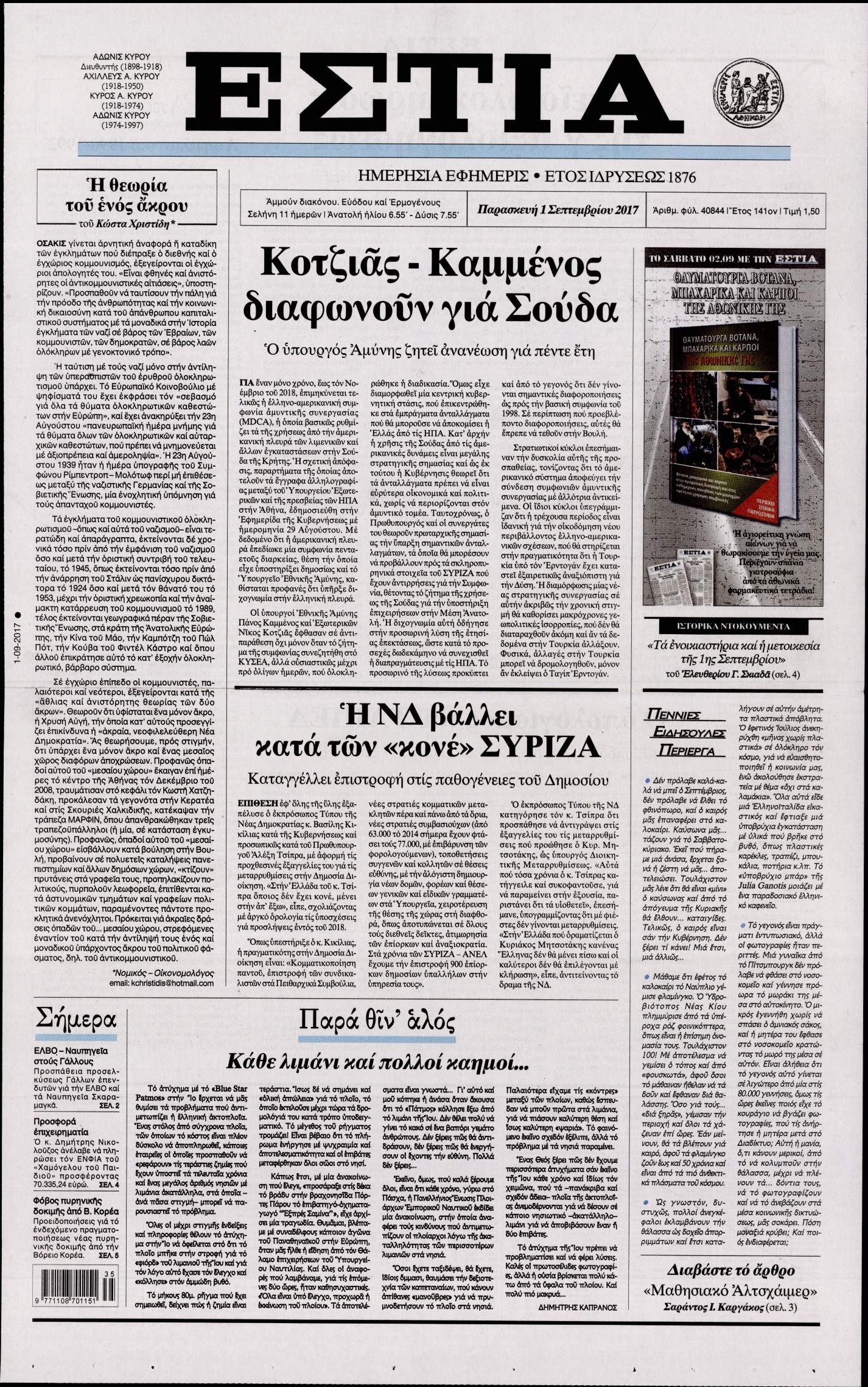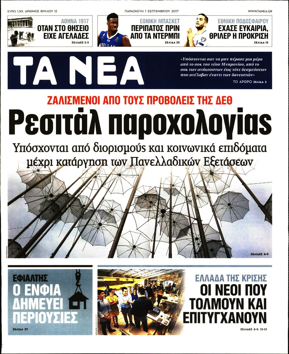 Οι πολιτικές εφημερίδες 1/9/2017 Enikos Newsroom 07:37, Παρασκευή 01 Σεπτεμβρίου 2017 Media Διαβάστε τα σημερινά πρωτοσέλιδα των πολιτικών εφημερίδων: ΠΟΛΙΤΙΚΕΣ ΕΦΗΜΕΡΙΔΕΣ ΠΡΩΤΟΣΕΛΙΔΑ Μοιράσου το: σχολίασε κι εσύ (0 σχόλια) Ακολουθήστε το enikos.gr στο Google News και μάθετε πρώτοι όλες τις ειδήσεις Δείτε όλες τις τελευταίες ειδήσεις από την Ελλάδα και τον Κόσμο στο enikos.gr Ειδήσεις Ροή Ειδήσεων 2 ώρες πριν Χριστούγεννα στα μπλόκα: Επιμένουν στις κινητοποιήσεις τους οι αγρότες – Ανοίγουν τα διόδια το Σαββατοκύριακο 3 ώρες πριν Ουκρανία: Η άνευ προηγουμένου επίθεση σε ρωσικό τάνκερ στη Μεσόγειο και το μήνυμα προς στον Πούτιν – Το «μακρύ χέρι» του Κιέβου 2 ώρες πριν Πούτιν: Τα μηνύματα σε Ευρώπη και ΝΑΤΟ από το μαραθώνιο «σόου» του – Η απαίτηση για «σεβασμό» και η ειρήνη «με τους όρους» της Μόσχας 3 ώρες πριν Τραμπ: Δεν αποκλείει την πιθανότητα ενός πολέμου στη Βενεζουέλα – «Ο Μαδούρο ξέρει καλύτερα από τον καθένα τι ακριβώς θέλω» 4 ώρες πριν Συνεχίζει να προκαλεί ο Μίτσκοσκι: «Για μένα το όνομα Μακεδονία είναι ιερό» 2 ώρες πριν Ανακαλύφθηκαν αρχαία χρυσά νομίσματα 2.200 ετών που απεικονίζουν τον θεό Απόλλωνα – Η άγνωστη σύνδεση με τον Φίλιππο Β΄ της Μακεδονίας 3 ώρες πριν Ύπνος: Μια κρυφή κατάσταση του εγκεφάλου πριν από τον ύπνο μπορεί να είναι το “κλειδί” για υψηλή ευφυΐα και δημιουργικότητα 4 ώρες πριν Αριθμολογία: Οι άνθρωποι που έχουν γεννηθεί αυτές τις 4 ημερομηνίες, συχνά παρεξηγούνται – «Η καλοσύνη τους κρύβει τεράστια δύναμη» 5 ώρες πριν Ξεχάστε το καθάρισμα το Σαββατοκύριακο: Ο «κανόνας των 20 λεπτών» που θα σας λύσει τα χέρια 10 λεπτά πριν Ουκρανία: Ολοκληρώθηκαν οι συνομιλίες με τους Αμερικανούς κι Ευρωπαίους διαπραγματευτές 25 λεπτά πριν Μπαρτσελόνα – Μπασκόνια 134-124: Οι «μπλαουγκράνα» πήραν το ματς της χρονιάς ύστερα από τρεις παρατάσεις 40 λεπτά πριν Φαίη Σκορδά: «Παλιότερα τα κομπλιμέντα τα προσπερνούσα, τώρα τα έχω ανάγκη» 56 λεπτά πριν Βασίλης Σπανούλης: Δεν εμφανίστηκε ούτε ένας δημοσιογράφος στην συνέντευξη Τύπου – «Καλησπέρα στον… κανέναν», δείτε βίντεο 1 ώρα πριν Πόλεμος στην Ουκρανία: Εφτά νεκροί από ρωσική πυραυλική επίθεση στο λιμάνι της Οδησσού ENIKOS NETWORK Το ΕΚΑΒ τιμήθηκε από την Ακαδημία Αθηνών για τα 40 χρόνια προσφοράς του Έχετε πραγματικά μεγάλη καρδιά; 10 χαρακτηριστικά όσων έχουν καλοσύνη Αναστολή μέτρων αναγκαστικής εκτέλεσης για κτηνοτρόφους που πλήττονται από την ευλογιά των αιγοπροβάτων Πλήρης επάρκεια προϊόντων στις λαϊκές της Αττικής, παρά τις αγροτικές κινητοποιήσεις – Τι απαντούν οι πωλητές Χαρτογραφώντας το «σημείο χωρίς επιστροφή»: Για πρώτη φορά αποκαλύπτεται με λεπτομέρεια το ακανθώδες όριο της ατμόσφαιρας τ... Η Google καταργεί τη λειτουργία «dark web report» – Πώς θα μπορούν οι χρήστες να διαγράφουν τα δεδομένα τους περισσότερα 22:42 , Παρασκευή 19 Δεκεμβρίου 2025 Γιώργος Γιαννόπουλος για “Το σόι σου”: “Είναι ευτυχία και ευλογία αυτή η σειρά” «Είναι ευτυχία και ευλογία η συγκυρία αυτής της σειράς», θα πει ο Γιώργος Γιαννόπουλος -ο αγαπ... 20:37 , Παρασκευή 19 Δεκεμβρίου 2025 Don’t Forget The Lyrics: Η Έλλη Κοκκίνου υποδέχεται 4 παίκτες που θα κάνουν τα πάντα για να μη χάσουν ούτε… μισή λέξη από τους στίχους Το «Don’t Forget The Lyrics» επιστρέφει απόψε, Παρασκευή 19 Δεκεμβρίου, στις 21:00 με νέο επει... 19:31 , Παρασκευή 19 Δεκεμβρίου 2025 GNTM: Απόψε ο μεγάλος τελικός για τους 4 φιναλίστ Έπειτα από μήνες γεμάτους μόδα, δημιουργία και έντονες αναμετρήσεις, το GNTM 2025 κορυφώνετ