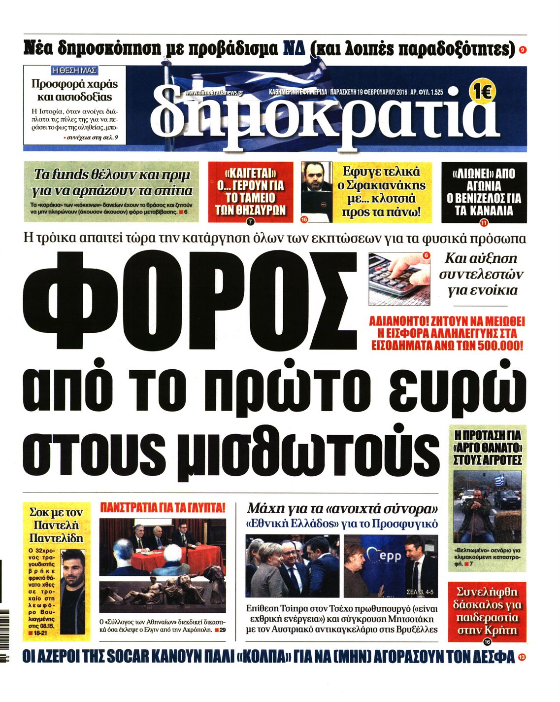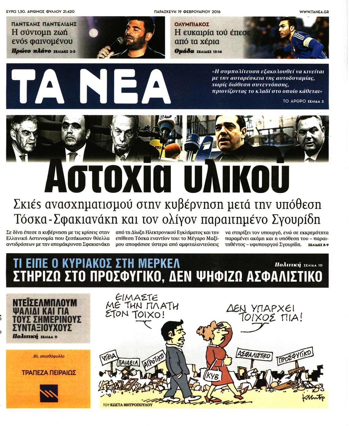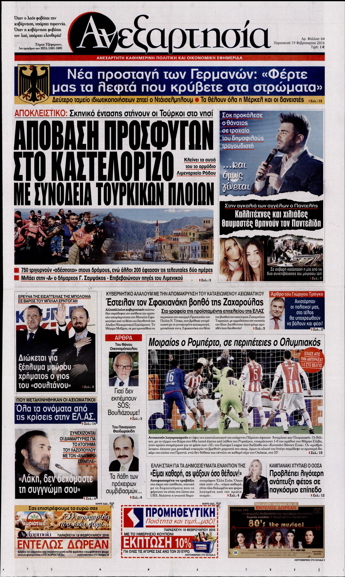 Oι πολιτικές εφημερίδες 19/2/2016 Enikos Newsroom 05:58, Παρασκευή 19 Φεβρουαρίου 2016 Media Διαβάστε τα σημερινά πρωτοσέλιδα των πολιτικών εφημερίδων: ΠΟΛΙΤΙΚΕΣ ΕΦΗΜΕΡΙΔΕΣ ΠΡΩΤΟΣΕΛΙΔΑ Μοιράσου το: σχολίασε κι εσύ (0 σχόλια) Ακολουθήστε το enikos.gr στο Google News και μάθετε πρώτοι όλες τις ειδήσεις Δείτε όλες τις τελευταίες ειδήσεις από την Ελλάδα και τον Κόσμο στο enikos.gr Ειδήσεις Ροή Ειδήσεων 8 ώρες πριν Χριστούγεννα στα μπλόκα: Επιμένουν στις κινητοποιήσεις τους οι αγρότες – Ανοίγουν τα διόδια το Σαββατοκύριακο 8 ώρες πριν Ουκρανία: Η άνευ προηγουμένου επίθεση σε ρωσικό τάνκερ στη Μεσόγειο και το μήνυμα προς στον Πούτιν – Το «μακρύ χέρι» του Κιέβου 7 ώρες πριν Πούτιν: Τα μηνύματα σε Ευρώπη και ΝΑΤΟ από το μαραθώνιο «σόου» του – Η απαίτηση για «σεβασμό» και η ειρήνη «με τους όρους» της Μόσχας 7 ώρες πριν ΗΠΑ: Η κυβέρνηση του Ντόναλντ Τραμπ άρχισε να δημοσιοποιεί τα αρχεία Έπσταϊν 7 ώρες πριν Άνω Λιόσια: Πυροβολισμοί σε επιχείρηση με χαλιά – Εντοπίστηκαν 10 κάλυκες 30 λεπτά πριν Αυγά: Πόσα μπορείτε να τρώτε την ημέρα με ασφάλεια για μέγιστη πρόσληψη πρωτεΐνης 59 λεπτά πριν Τα ζώδια σήμερα, Σάββατο 20 Δεκεμβρίου: Παρθένοι, το σύμπαν σας δίνει το κλειδί 7 ώρες πριν Ανακαλύφθηκαν αρχαία χρυσά νομίσματα 2.200 ετών που απεικονίζουν τον θεό Απόλλωνα – Η άγνωστη σύνδεση με τον Φίλιππο Β΄ της Μακεδονίας 8 ώρες πριν Ύπνος: Μια κρυφή κατάσταση του εγκεφάλου πριν από τον ύπνο μπορεί να είναι το “κλειδί” για υψηλή ευφυΐα και δημιουργικότητα 6 λεπτά πριν Κολομβία: Είκοσι χρόνια κάθειρξη σε πρώην ανώτερο αξιωματικό για 72 εκτελέσεις αμάχων 14 λεπτά πριν Οπτική ψευδαίσθηση: Μόνο αν είσαι ο Σέρλοκ Χολμς θα βρεις τον αριθμό «87» σε 7 δευτερόλεπτα 21 λεπτά πριν Σαρωτικοί οι έλεγχοι στους δρόμους ενόψει εορτών – Μπλόκα της τροχαίας σε κεντρικές αρτηρίες της Αττικής 30 λεπτά πριν Αυγά: Πόσα μπορείτε να τρώτε την ημέρα με ασφάλεια για μέγιστη πρόσληψη πρωτεΐνης 36 λεπτά πριν Σαν σήμερα 20 Δεκεμβρίου: Τα σημαντικότερα γεγονότα της ημέρας ENIKOS NETWORK Το ΕΚΑΒ τιμήθηκε από την Ακαδημία Αθηνών για τα 40 χρόνια προσφοράς του Έχετε πραγματικά μεγάλη καρδιά; 10 χαρακτηριστικά όσων έχουν καλοσύνη Αναστολή μέτρων αναγκαστικής εκτέλεσης για κτηνοτρόφους που πλήττονται από την ευλογιά των αιγοπροβάτων Πλήρης επάρκεια προϊόντων στις λαϊκές της Αττικής, παρά τις αγροτικές κινητοποιήσεις – Τι απαντούν οι πωλητές Χαρτογραφώντας το «σημείο χωρίς επιστροφή»: Για πρώτη φορά αποκαλύπτεται με λεπτομέρεια το ακανθώδες όριο της ατμόσφαιρας τ... Η Google καταργεί τη λειτουργία «dark web report» – Πώς θα μπορούν οι χρήστες να διαγράφουν τα δεδομένα τους περισσότερα 05:48 , Σάββατο 20 Δεκεμβρίου 2025 Οι οικονομικές εφημερίδες 20/12/2025 Διαβάστε τα πρωτοσέλιδα από τις οικονομικές εφημερίδες, σήμερα 20/12/2025. 05:43 , Σάββατο 20 Δεκεμβρίου 2025 Οι αθλητικές εφημερίδες 20/12/2025 Διαβάστε τα πρωτοσέλιδα από τις αθλητικές εφημερίδες, σήμερα 20/12/2025. 05:38 , Σάββατο 20 Δεκεμβρίου 2025 Οι πολιτικές εφημερίδες 20/12/2025 Διαβάστε τα πρωτοσέλιδα από τις πολιτικές εφημερίδες, σήμερα 20/12/2025. 04:20 , Σάββατο 20 Δεκεμβρίου 2025 Αγγελική Νικολούλη: Τα συλλυπητήρια για την απώλεια της Ειρήνης Μαρινάκη Τα συλληπητήρια στον πρόεδρο του Mega, τον Βαγγέλη Μαρινάκη, για την απώλεια της μητέρας του Ε... ΤΕΛΕΥΤΑΙΕΣ ΕΙΔΗΣΕΙΣ 6 λεπτά πριν Κολομβία: Είκοσι χρόνια κάθειρξη σε πρώην ανώτερο... 14 λεπτά πριν Οπτική ψευδαίσθηση: Μόνο αν είσαι ο Σέρλοκ Χολμς θα... 21 λεπτά πριν Σαρωτικοί οι έλεγχοι στους δ