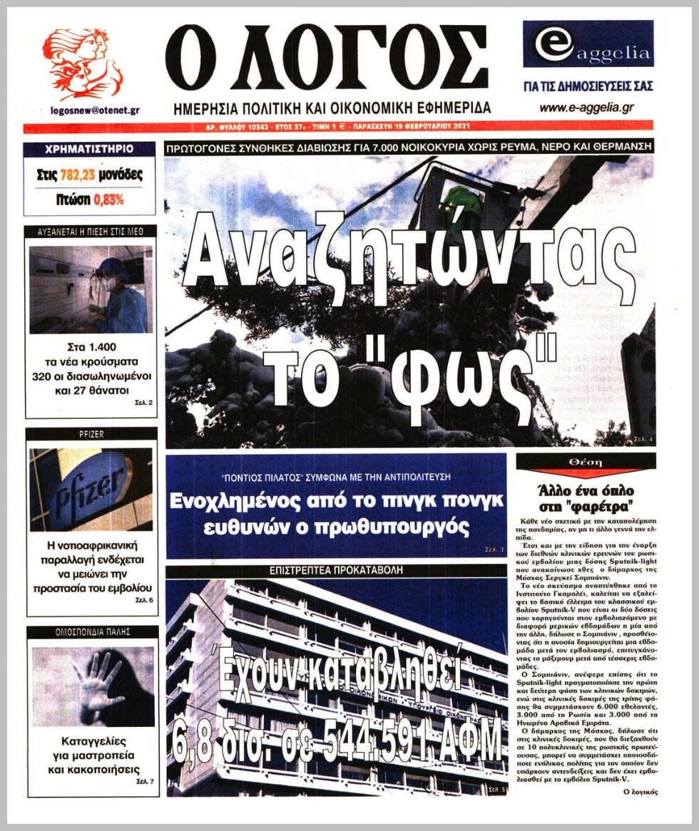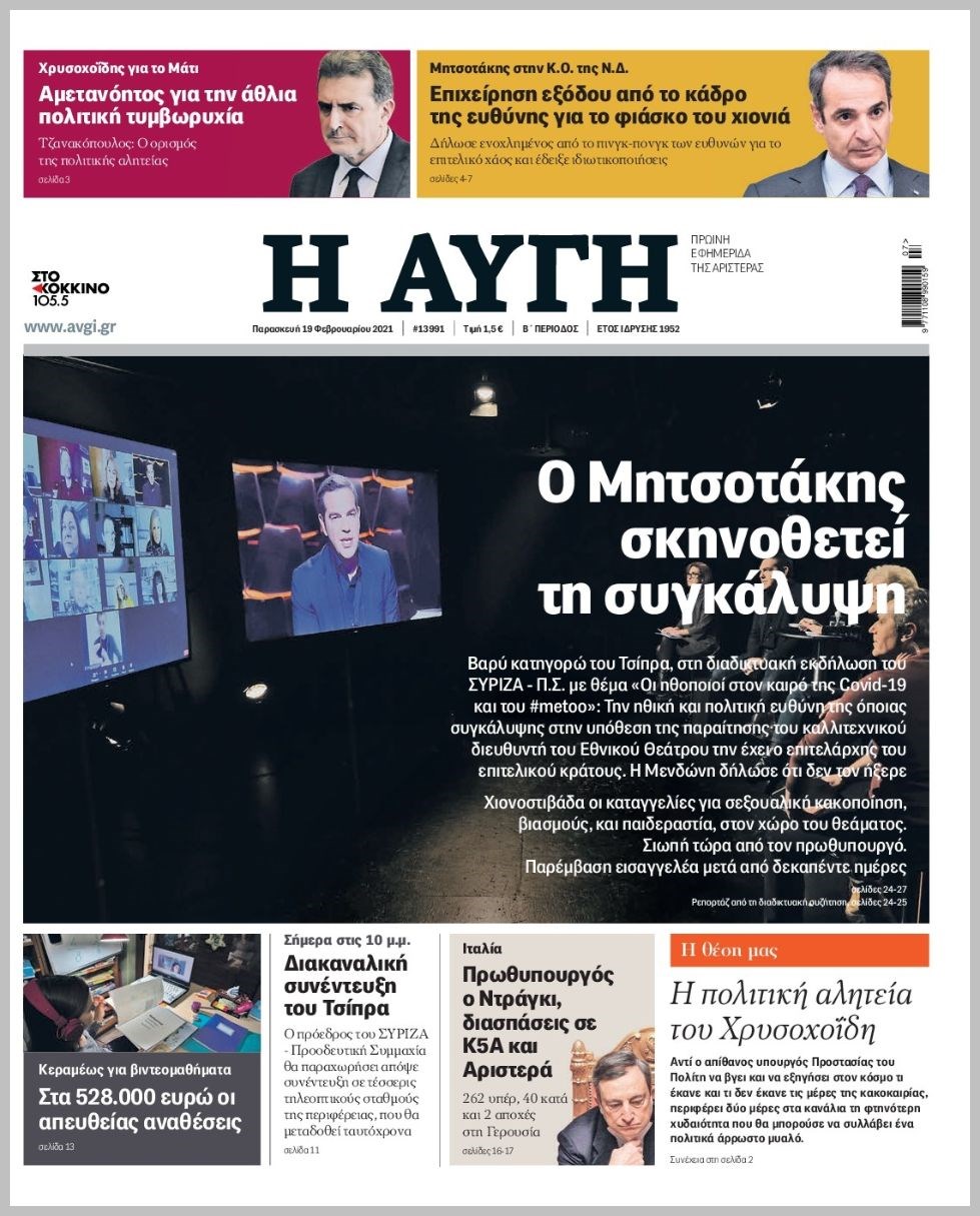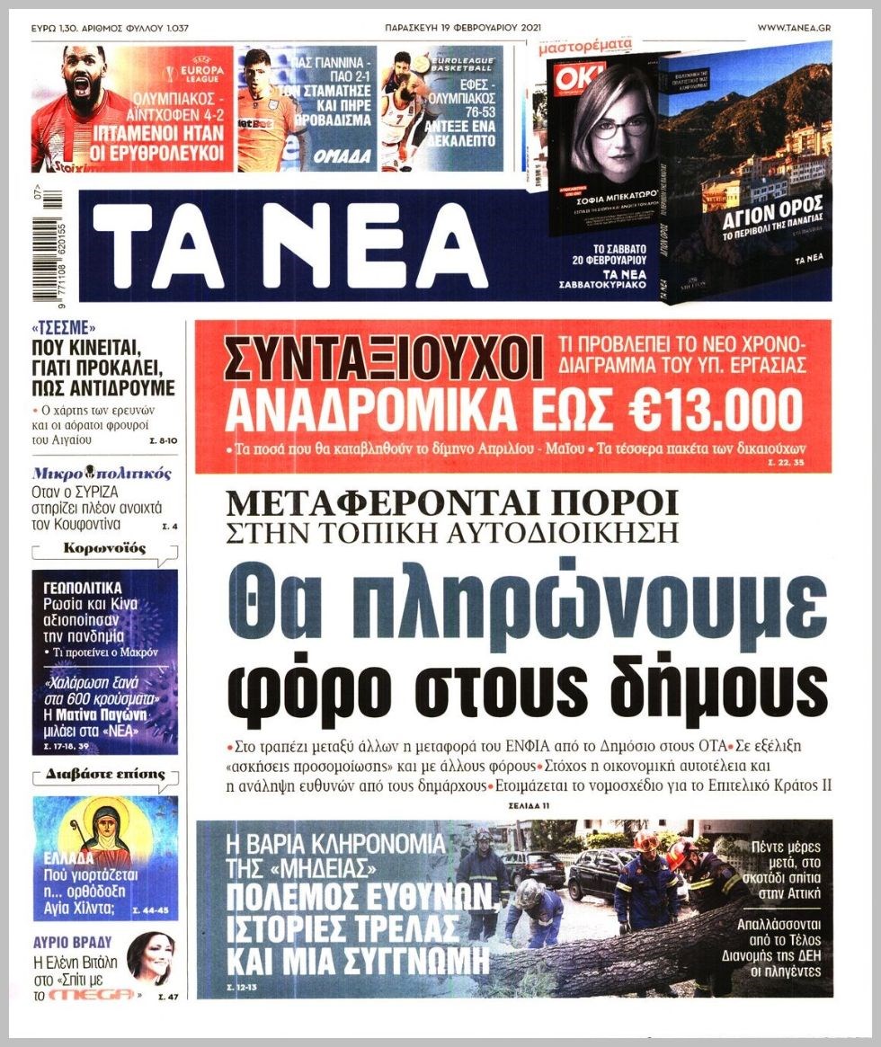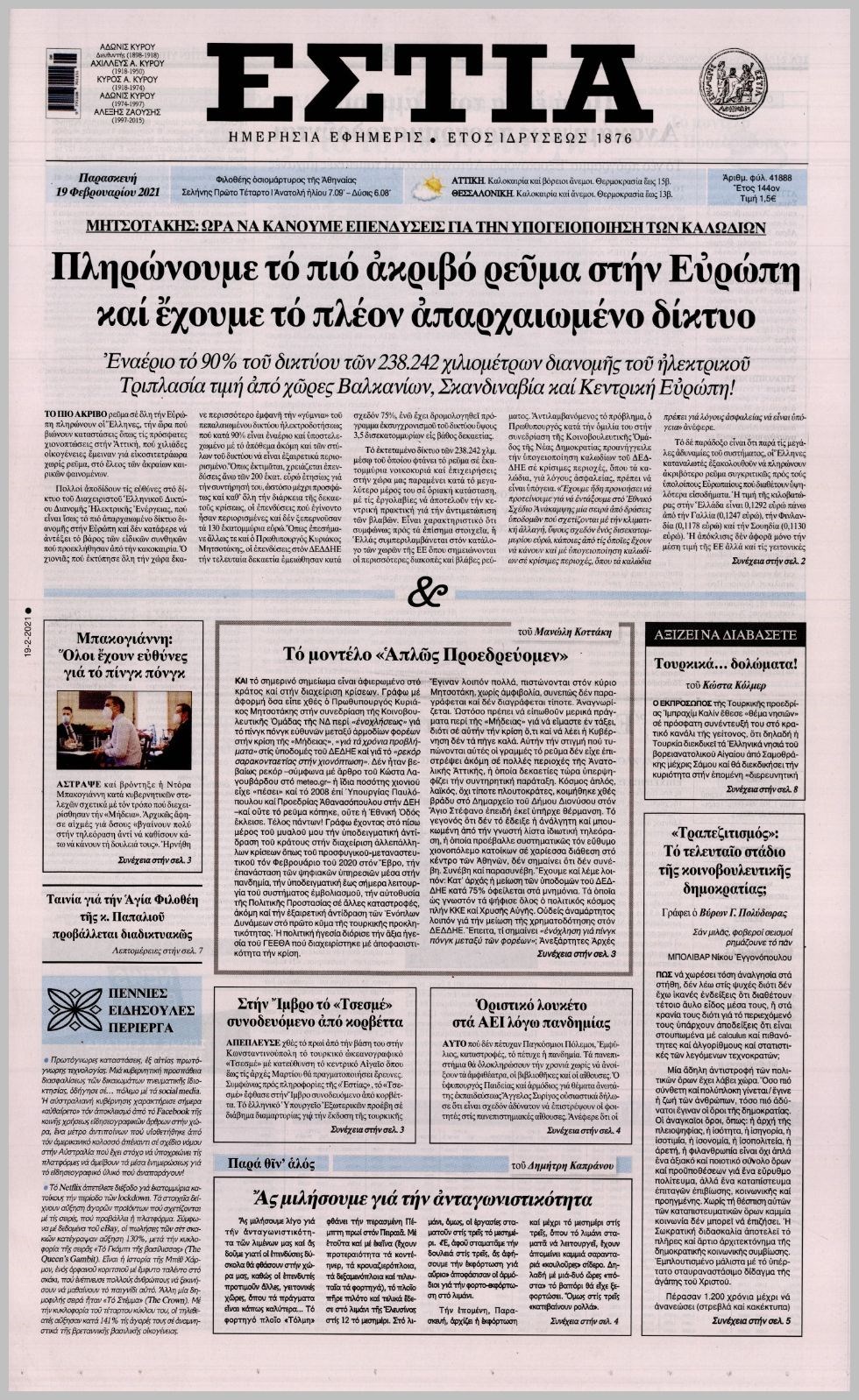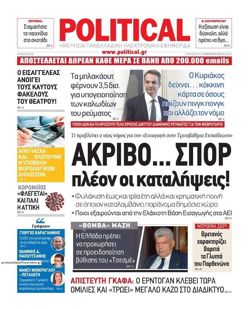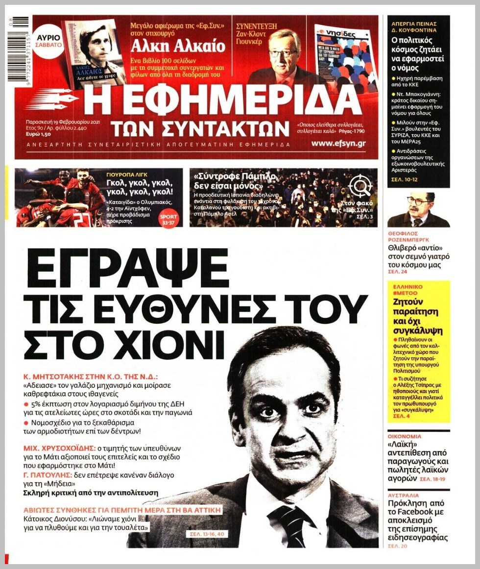Οι πολιτικές εφημερίδες 19/2/2021 Διονύσης Νίκκας 06:12, Παρασκευή 19 Φεβρουαρίου 2021 Media Διαβάστε τα πρωτοσέλιδα των πολιτικών εφημερίδων… ΕΦΗΜΕΡΙΔΕΣ ΠΟΛΙΤΙΚΕΣ ΕΦΗΜΕΡΙΔΕΣ ΠΡΩΤΟΣΕΛΙΔΑ Μοιράσου το: σχολίασε κι εσύ (0 σχόλια) Ακολουθήστε το enikos.gr στο Google News και μάθετε πρώτοι όλες τις ειδήσεις Δείτε όλες τις τελευταίες ειδήσεις από την Ελλάδα και τον Κόσμο στο enikos.gr Ειδήσεις Ροή Ειδήσεων 6 ώρες πριν Χριστούγεννα στα μπλόκα: Επιμένουν στις κινητοποιήσεις τους οι αγρότες – Ανοίγουν τα διόδια το Σαββατοκύριακο 6 ώρες πριν Ουκρανία: Η άνευ προηγουμένου επίθεση σε ρωσικό τάνκερ στη Μεσόγειο και το μήνυμα προς στον Πούτιν – Το «μακρύ χέρι» του Κιέβου 5 ώρες πριν Πούτιν: Τα μηνύματα σε Ευρώπη και ΝΑΤΟ από το μαραθώνιο «σόου» του – Η απαίτηση για «σεβασμό» και η ειρήνη «με τους όρους» της Μόσχας 6 ώρες πριν Τραμπ: Δεν αποκλείει την πιθανότητα ενός πολέμου στη Βενεζουέλα – «Ο Μαδούρο ξέρει καλύτερα από τον καθένα τι ακριβώς θέλω» 7 ώρες πριν Συνεχίζει να προκαλεί ο Μίτσκοσκι: «Για μένα το όνομα Μακεδονία είναι ιερό» 5 ώρες πριν Ανακαλύφθηκαν αρχαία χρυσά νομίσματα 2.200 ετών που απεικονίζουν τον θεό Απόλλωνα – Η άγνωστη σύνδεση με τον Φίλιππο Β΄ της Μακεδονίας 6 ώρες πριν Ύπνος: Μια κρυφή κατάσταση του εγκεφάλου πριν από τον ύπνο μπορεί να είναι το “κλειδί” για υψηλή ευφυΐα και δημιουργικότητα 7 ώρες πριν Αριθμολογία: Οι άνθρωποι που έχουν γεννηθεί αυτές τις 4 ημερομηνίες, συχνά παρεξηγούνται – «Η καλοσύνη τους κρύβει τεράστια δύναμη» 8 ώρες πριν Ξεχάστε το καθάρισμα το Σαββατοκύριακο: Ο «κανόνας των 20 λεπτών» που θα σας λύσει τα χέρια 6 λεπτά πριν Βολιβία: Μαζική διαδηλώσεις εναντίον της κατάργησης των επιδοτήσεων των τιμών των καυσίμων 21 λεπτά πριν Φως στο Τούνελ: Έφτασε η ώρα της αλήθειας για την δολοφονία της χήρας του πρώην υπουργού στο Κολωνάκι 37 λεπτά πριν Ντόναλντ Τραμπ: Προστέθηκε το όνομά του στην πρόσοψη του Κέντρου Κένεντι – Οργισμένη αντίδραση των συγγενών του JFK 51 λεπτά πριν Ταμίλα Κουλίεβα: «Δεν θέλω να είμαι κάποια που πορεύεται συνεχώς με τις ίδιες αναφορές» 1 ώρα πριν Η Ελλάδα προσχωρεί στη Διεθνή Επιτροπή Αποζημιώσεων για την Ουκρανία ENIKOS NETWORK Το ΕΚΑΒ τιμήθηκε από την Ακαδημία Αθηνών για τα 40 χρόνια προσφοράς του Έχετε πραγματικά μεγάλη καρδιά; 10 χαρακτηριστικά όσων έχουν καλοσύνη Αναστολή μέτρων αναγκαστικής εκτέλεσης για κτηνοτρόφους που πλήττονται από την ευλογιά των αιγοπροβάτων Πλήρης επάρκεια προϊόντων στις λαϊκές της Αττικής, παρά τις αγροτικές κινητοποιήσεις – Τι απαντούν οι πωλητές Χαρτογραφώντας το «σημείο χωρίς επιστροφή»: Για πρώτη φορά αποκαλύπτεται με λεπτομέρεια το ακανθώδες όριο της ατμόσφαιρας τ... Η Google καταργεί τη λειτουργία «dark web report» – Πώς θα μπορούν οι χρήστες να διαγράφουν τα δεδομένα τους περισσότερα 02:50 , Σάββατο 20 Δεκεμβρίου 2025 GNTM: Η Ξένια Τσίρκοβα αναδείχθηκε μεγάλη νικήτρια και πήρε τις 50.000 ευρώ – Ποιος βρέθηκε σε απόσταση αναπνοής; Με φαντασμαγορικό τρόπο ολοκληρώθηκε το βράδυ της Παρασκευής ο μεγάλος τελικός του GNTM, μέσα ... 22:42 , Παρασκευή 19 Δεκεμβρίου 2025 Γιώργος Γιαννόπουλος για “Το σόι σου”: “Είναι ευτυχία και ευλογία αυτή η σειρά” «Είναι ευτυχία και ευλογία η συγκυρία αυτής της σειράς», θα πει ο Γιώργος Γιαννόπουλος -ο αγαπ... 20:37 , Παρασκευή 19 Δεκεμβρίου 2025 Don’t Forget The Lyrics: Η Έλλη Κοκκίνου υποδέχεται 4 παίκτες που θα κάνουν τα πάντα για να μη χάσουν ούτε… μισή λέξη από τους στίχους Το «Don’t Forget The Lyrics» ε