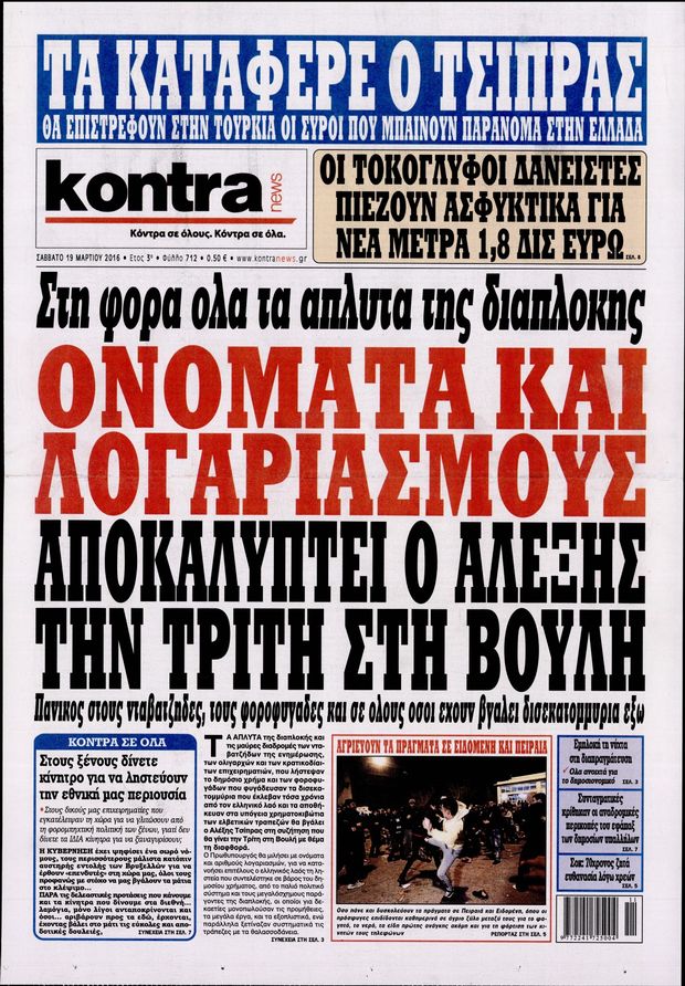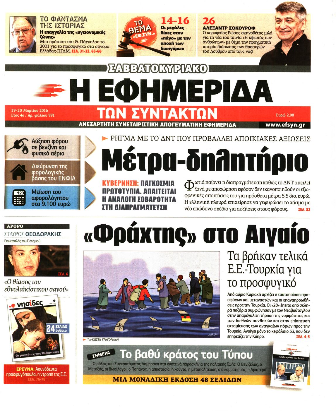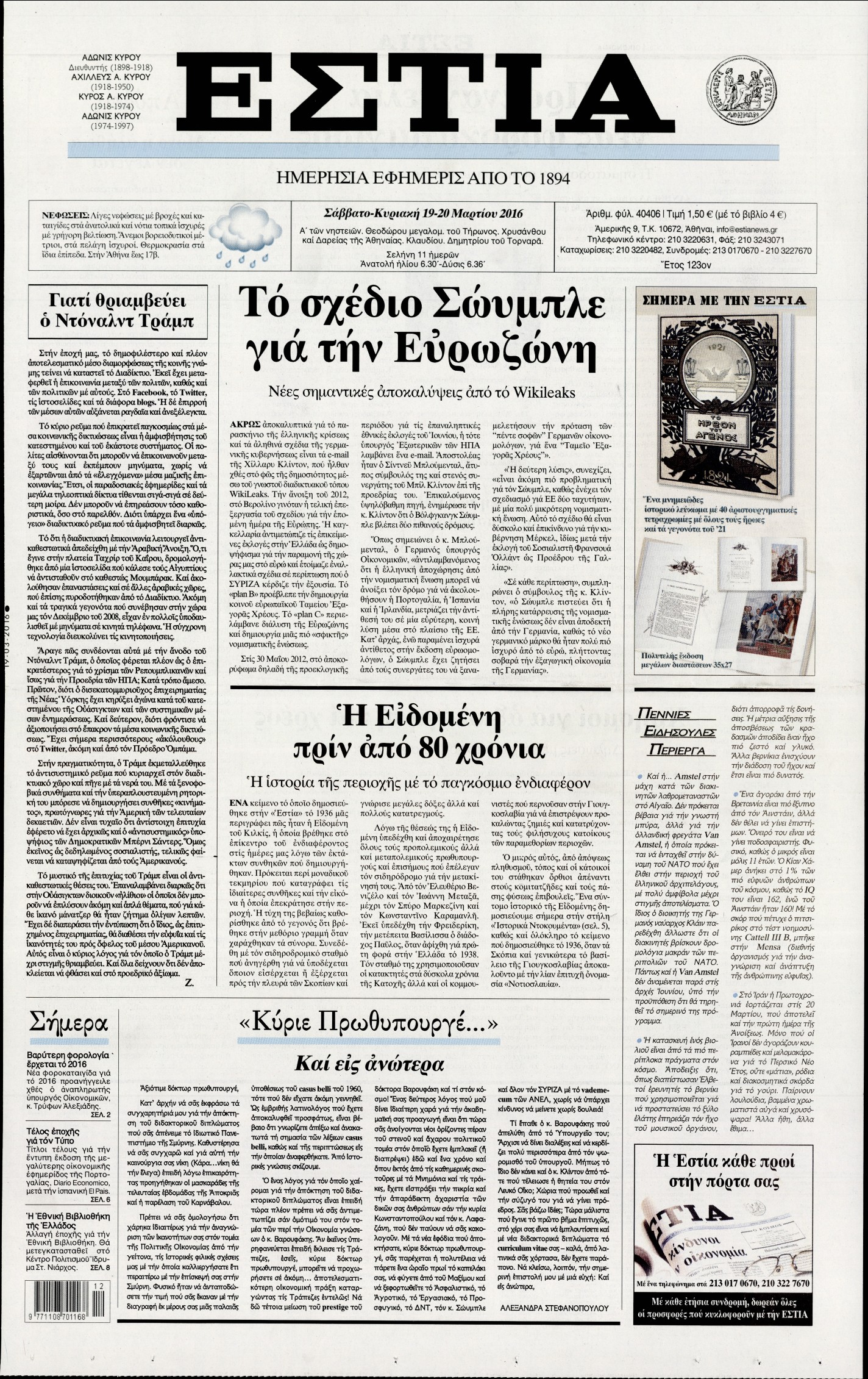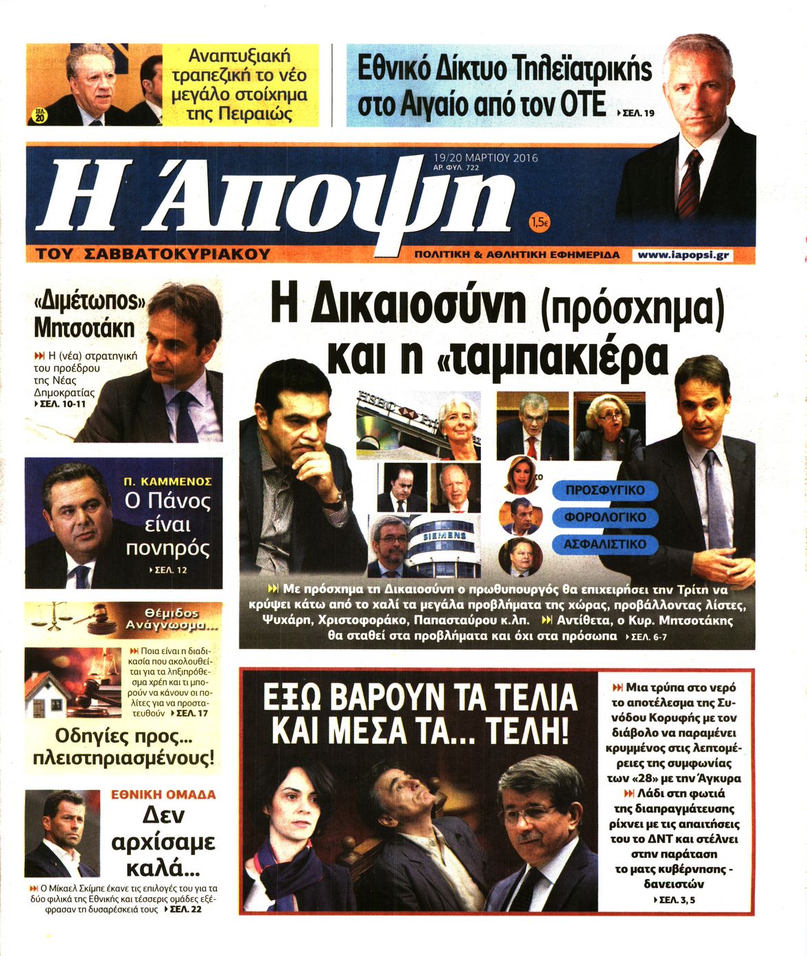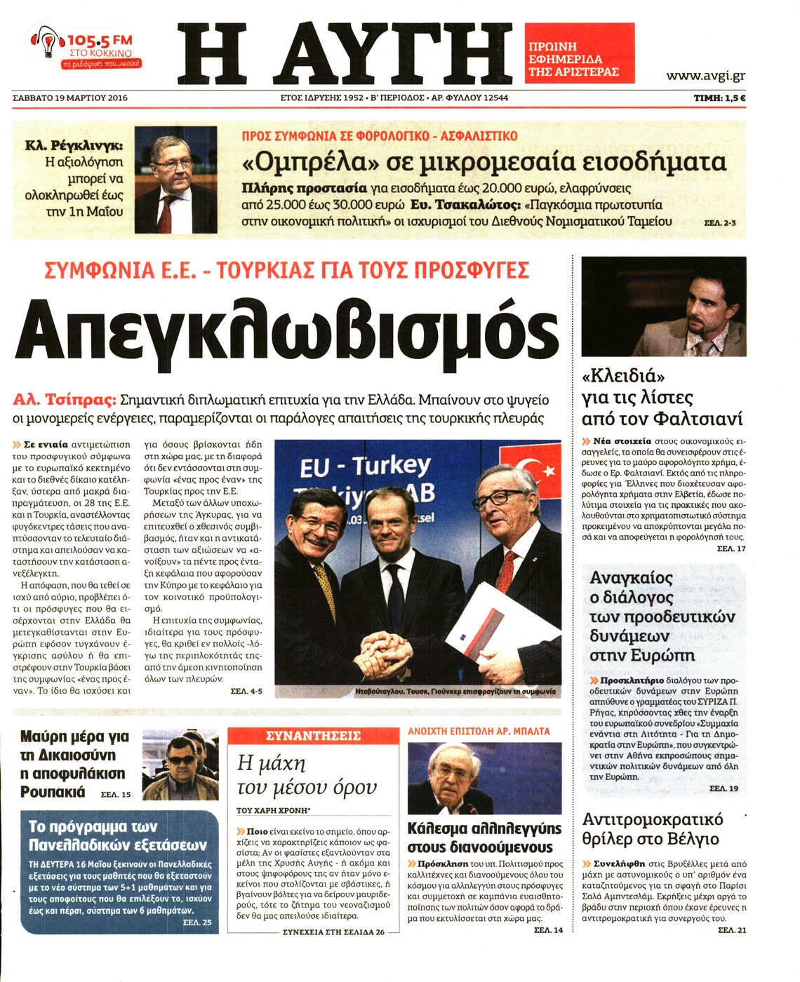Οι πολιτικές εφημερίδες 19/3/2016 Enikos Newsroom 05:41, Σάββατο 19 Μαρτίου 2016 Media Διαβάστε τα σημερινά πρωτοσέλιδα των πολιτικών εφημερίδων: ΠΡΩΤΟΣΕΛΙΔΑ Μοιράσου το: σχολίασε κι εσύ (0 σχόλια) Ακολουθήστε το enikos.gr στο Google News και μάθετε πρώτοι όλες τις ειδήσεις Δείτε όλες τις τελευταίες ειδήσεις από την Ελλάδα και τον Κόσμο στο enikos.gr Ειδήσεις Ροή Ειδήσεων 3 ώρες πριν Χριστούγεννα στα μπλόκα: Επιμένουν στις κινητοποιήσεις τους οι αγρότες – Ανοίγουν τα διόδια το Σαββατοκύριακο 3 ώρες πριν Ουκρανία: Η άνευ προηγουμένου επίθεση σε ρωσικό τάνκερ στη Μεσόγειο και το μήνυμα προς στον Πούτιν – Το «μακρύ χέρι» του Κιέβου 2 ώρες πριν Πούτιν: Τα μηνύματα σε Ευρώπη και ΝΑΤΟ από το μαραθώνιο «σόου» του – Η απαίτηση για «σεβασμό» και η ειρήνη «με τους όρους» της Μόσχας 3 ώρες πριν Τραμπ: Δεν αποκλείει την πιθανότητα ενός πολέμου στη Βενεζουέλα – «Ο Μαδούρο ξέρει καλύτερα από τον καθένα τι ακριβώς θέλω» 4 ώρες πριν Συνεχίζει να προκαλεί ο Μίτσκοσκι: «Για μένα το όνομα Μακεδονία είναι ιερό» 2 ώρες πριν Ανακαλύφθηκαν αρχαία χρυσά νομίσματα 2.200 ετών που απεικονίζουν τον θεό Απόλλωνα – Η άγνωστη σύνδεση με τον Φίλιππο Β΄ της Μακεδονίας 3 ώρες πριν Ύπνος: Μια κρυφή κατάσταση του εγκεφάλου πριν από τον ύπνο μπορεί να είναι το “κλειδί” για υψηλή ευφυΐα και δημιουργικότητα 4 ώρες πριν Αριθμολογία: Οι άνθρωποι που έχουν γεννηθεί αυτές τις 4 ημερομηνίες, συχνά παρεξηγούνται – «Η καλοσύνη τους κρύβει τεράστια δύναμη» 5 ώρες πριν Ξεχάστε το καθάρισμα το Σαββατοκύριακο: Ο «κανόνας των 20 λεπτών» που θα σας λύσει τα χέρια 8 λεπτά πριν Συρία: Μαζικά πλήγματα των ΗΠΑ σε θέσεις του Ισλαμικού Κράτους – Χέγκσεθ: «Δεν είναι αρχή πολέμου, είναι μια δήλωση εκδίκησης» για το θάνατο των στρατιωτών μας 21 λεπτά πριν Ουκρανία: Ολοκληρώθηκαν οι συνομιλίες με τους Αμερικανούς κι Ευρωπαίους διαπραγματευτές 36 λεπτά πριν Μπαρτσελόνα – Μπασκόνια 134-124: Οι «μπλαουγκράνα» πήραν το ματς της χρονιάς ύστερα από τρεις παρατάσεις 51 λεπτά πριν Φαίη Σκορδά: «Παλιότερα τα κομπλιμέντα τα προσπερνούσα, τώρα τα έχω ανάγκη» 1 ώρα πριν Βασίλης Σπανούλης: Δεν εμφανίστηκε ούτε ένας δημοσιογράφος στην συνέντευξη Τύπου – «Καλησπέρα στον… κανέναν», δείτε βίντεο ENIKOS NETWORK Το ΕΚΑΒ τιμήθηκε από την Ακαδημία Αθηνών για τα 40 χρόνια προσφοράς του Έχετε πραγματικά μεγάλη καρδιά; 10 χαρακτηριστικά όσων έχουν καλοσύνη Αναστολή μέτρων αναγκαστικής εκτέλεσης για κτηνοτρόφους που πλήττονται από την ευλογιά των αιγοπροβάτων Πλήρης επάρκεια προϊόντων στις λαϊκές της Αττικής, παρά τις αγροτικές κινητοποιήσεις – Τι απαντούν οι πωλητές Χαρτογραφώντας το «σημείο χωρίς επιστροφή»: Για πρώτη φορά αποκαλύπτεται με λεπτομέρεια το ακανθώδες όριο της ατμόσφαιρας τ... Η Google καταργεί τη λειτουργία «dark web report» – Πώς θα μπορούν οι χρήστες να διαγράφουν τα δεδομένα τους περισσότερα 22:42 , Παρασκευή 19 Δεκεμβρίου 2025 Γιώργος Γιαννόπουλος για “Το σόι σου”: “Είναι ευτυχία και ευλογία αυτή η σειρά” «Είναι ευτυχία και ευλογία η συγκυρία αυτής της σειράς», θα πει ο Γιώργος Γιαννόπουλος -ο αγαπ... 20:37 , Παρασκευή 19 Δεκεμβρίου 2025 Don’t Forget The Lyrics: Η Έλλη Κοκκίνου υποδέχεται 4 παίκτες που θα κάνουν τα πάντα για να μη χάσουν ούτε… μισή λέξη από τους στίχους Το «Don’t Forget The Lyrics» επιστρέφει απόψε, Παρασκευή 19 Δεκεμβρίου, στις 21:00 με νέο επει... 19:31 , Παρασκευή 19 Δεκεμβρίου 2025 GNTM: Απόψε ο μεγάλος τελικός για τους 4 φιναλίστ Έπειτα από μήνες γεμάτους μόδα, δημιουργία κ