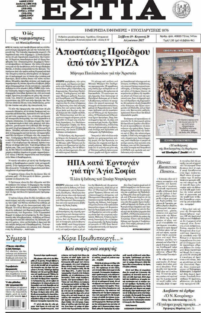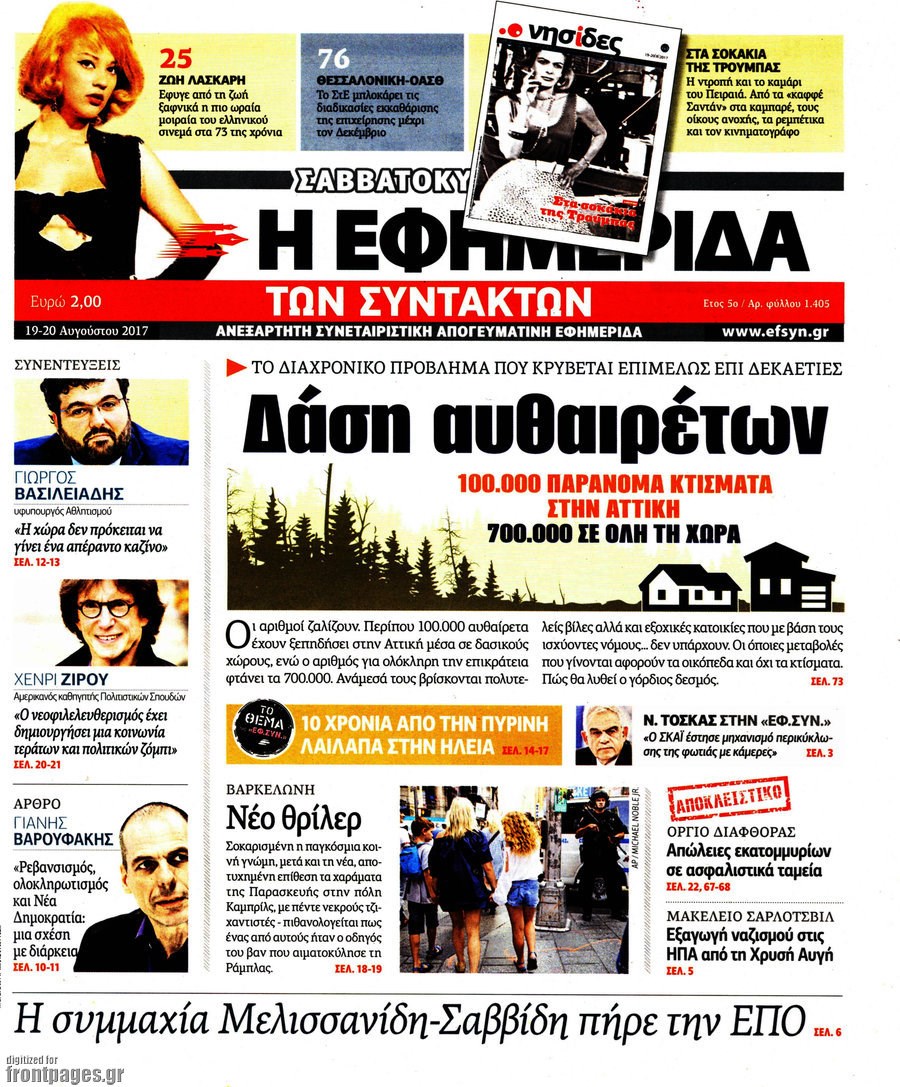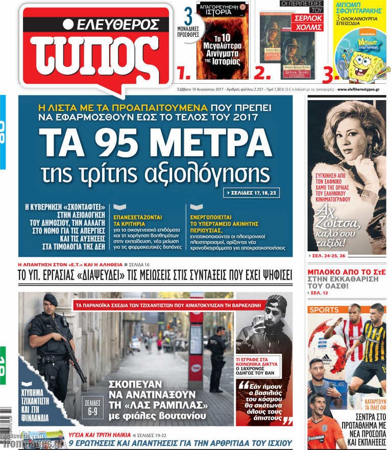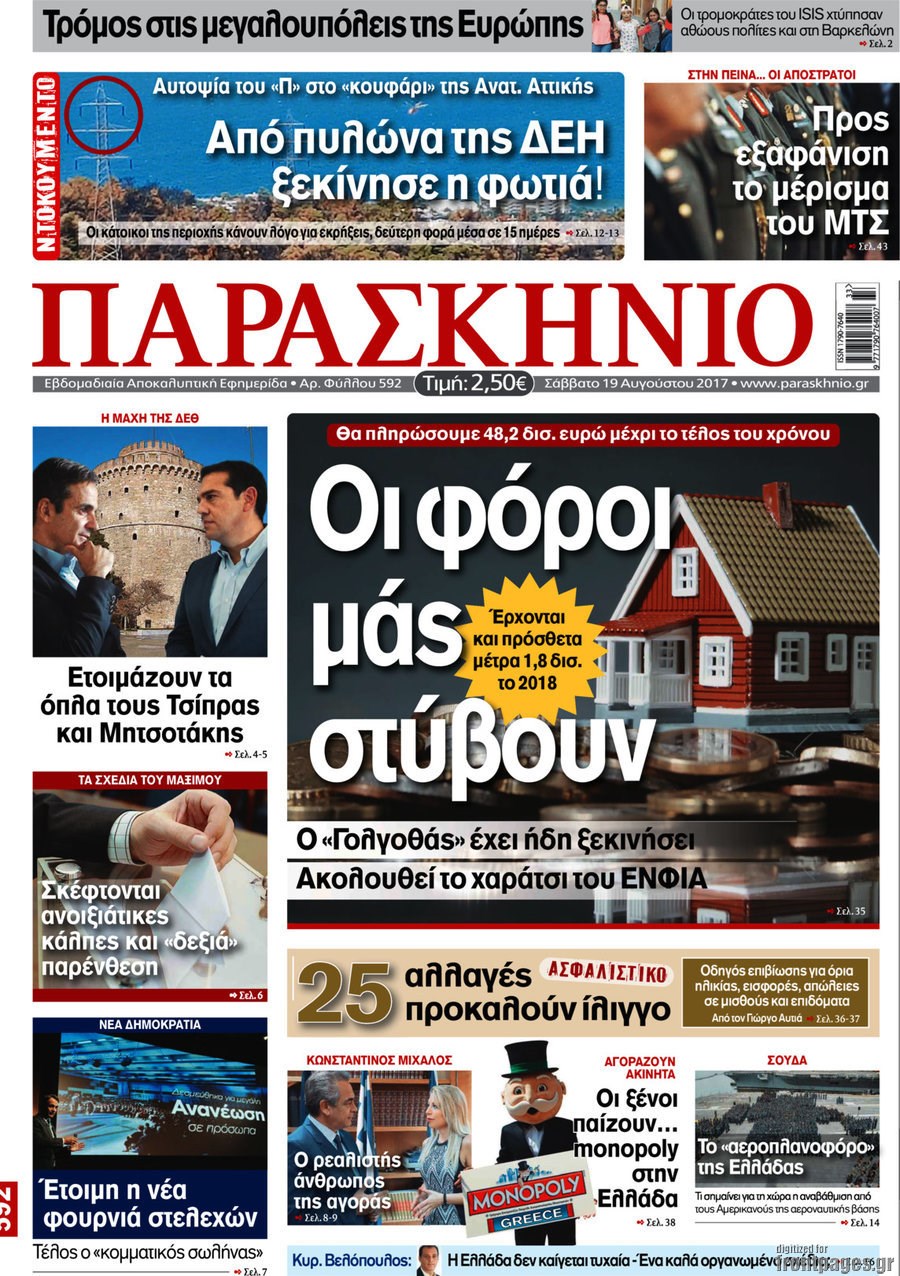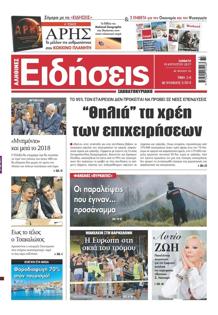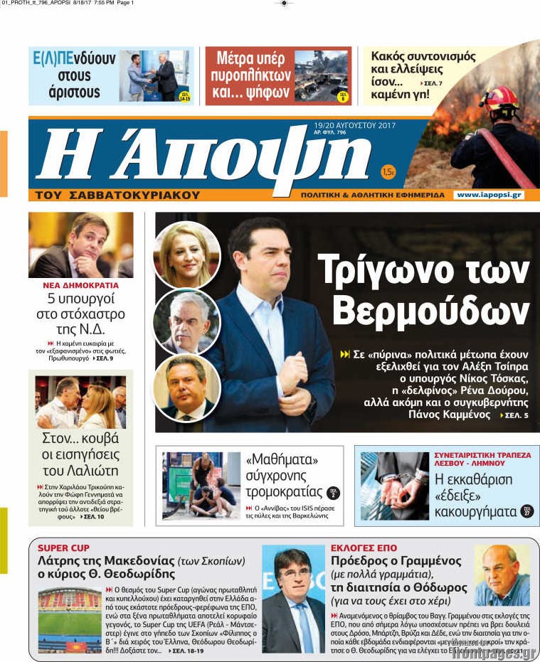 Οι πολιτικές εφημερίδες 19/8/2017 Enikos Newsroom 07:40, Σάββατο 19 Αυγούστου 2017 Media Διαβάστε τα σημερινά πρωτοσέλιδα των πολιτικών εφημερίδων: ΠΟΛΙΤΙΚΕΣ ΕΦΗΜΕΡΙΔΕΣ ΠΡΩΤΟΣΕΛΙΔΑ Μοιράσου το: σχολίασε κι εσύ (0 σχόλια) Ακολουθήστε το enikos.gr στο Google News και μάθετε πρώτοι όλες τις ειδήσεις Δείτε όλες τις τελευταίες ειδήσεις από την Ελλάδα και τον Κόσμο στο enikos.gr Ειδήσεις Ροή Ειδήσεων 3 ώρες πριν Χριστούγεννα στα μπλόκα: Επιμένουν στις κινητοποιήσεις τους οι αγρότες – Ανοίγουν τα διόδια το Σαββατοκύριακο 3 ώρες πριν Ουκρανία: Η άνευ προηγουμένου επίθεση σε ρωσικό τάνκερ στη Μεσόγειο και το μήνυμα προς στον Πούτιν – Το «μακρύ χέρι» του Κιέβου 3 ώρες πριν Πούτιν: Τα μηνύματα σε Ευρώπη και ΝΑΤΟ από το μαραθώνιο «σόου» του – Η απαίτηση για «σεβασμό» και η ειρήνη «με τους όρους» της Μόσχας 4 ώρες πριν Τραμπ: Δεν αποκλείει την πιθανότητα ενός πολέμου στη Βενεζουέλα – «Ο Μαδούρο ξέρει καλύτερα από τον καθένα τι ακριβώς θέλω» 4 ώρες πριν Συνεχίζει να προκαλεί ο Μίτσκοσκι: «Για μένα το όνομα Μακεδονία είναι ιερό» 3 ώρες πριν Ανακαλύφθηκαν αρχαία χρυσά νομίσματα 2.200 ετών που απεικονίζουν τον θεό Απόλλωνα – Η άγνωστη σύνδεση με τον Φίλιππο Β΄ της Μακεδονίας 4 ώρες πριν Ύπνος: Μια κρυφή κατάσταση του εγκεφάλου πριν από τον ύπνο μπορεί να είναι το “κλειδί” για υψηλή ευφυΐα και δημιουργικότητα 5 ώρες πριν Αριθμολογία: Οι άνθρωποι που έχουν γεννηθεί αυτές τις 4 ημερομηνίες, συχνά παρεξηγούνται – «Η καλοσύνη τους κρύβει τεράστια δύναμη» 6 ώρες πριν Ξεχάστε το καθάρισμα το Σαββατοκύριακο: Ο «κανόνας των 20 λεπτών» που θα σας λύσει τα χέρια 17 λεπτά πριν Euroleague: Επέστρεψε στις νίκες ο Ολυμπιακός, πήρε την ματσάρα της χρονιάς η Μπάρτσα – Τα αποτελέσματα και η βαθμολογία 32 λεπτά πριν Συρία: Μαζικά πλήγματα των ΗΠΑ σε θέσεις του Ισλαμικού Κράτους – Χέγκσεθ: «Δεν είναι αρχή πολέμου, είναι μια δήλωση εκδίκησης» για το θάνατο των στρατιωτών μας 45 λεπτά πριν Ουκρανία: Ολοκληρώθηκαν οι συνομιλίες με τους Αμερικανούς κι Ευρωπαίους διαπραγματευτές 1 ώρα πριν Μπαρτσελόνα – Μπασκόνια 134-124: Οι «μπλαουγκράνα» πήραν το ματς της χρονιάς ύστερα από τρεις παρατάσεις 1 ώρα πριν Φαίη Σκορδά: «Παλιότερα τα κομπλιμέντα τα προσπερνούσα, τώρα τα έχω ανάγκη» ENIKOS NETWORK Το ΕΚΑΒ τιμήθηκε από την Ακαδημία Αθηνών για τα 40 χρόνια προσφοράς του Έχετε πραγματικά μεγάλη καρδιά; 10 χαρακτηριστικά όσων έχουν καλοσύνη Αναστολή μέτρων αναγκαστικής εκτέλεσης για κτηνοτρόφους που πλήττονται από την ευλογιά των αιγοπροβάτων Πλήρης επάρκεια προϊόντων στις λαϊκές της Αττικής, παρά τις αγροτικές κινητοποιήσεις – Τι απαντούν οι πωλητές Χαρτογραφώντας το «σημείο χωρίς επιστροφή»: Για πρώτη φορά αποκαλύπτεται με λεπτομέρεια το ακανθώδες όριο της ατμόσφαιρας τ... Η Google καταργεί τη λειτουργία «dark web report» – Πώς θα μπορούν οι χρήστες να διαγράφουν τα δεδομένα τους περισσότερα 22:42 , Παρασκευή 19 Δεκεμβρίου 2025 Γιώργος Γιαννόπουλος για “Το σόι σου”: “Είναι ευτυχία και ευλογία αυτή η σειρά” «Είναι ευτυχία και ευλογία η συγκυρία αυτής της σειράς», θα πει ο Γιώργος Γιαννόπουλος -ο αγαπ... 20:37 , Παρασκευή 19 Δεκεμβρίου 2025 Don’t Forget The Lyrics: Η Έλλη Κοκκίνου υποδέχεται 4 παίκτες που θα κάνουν τα πάντα για να μη χάσουν ούτε… μισή λέξη από τους στίχους Το «Don’t Forget The Lyrics» επιστρέφει απόψε, Παρασκευή 19 Δεκεμβρίου, στις 21:00 με νέο επει... 19:31 , Παρασκευή 19 Δεκεμβρίου 2025 GNTM: Απόψε ο μεγάλος τελικός για τους 4 φιναλίστ Έπειτα από μήνες γεμάτους μόδα, 