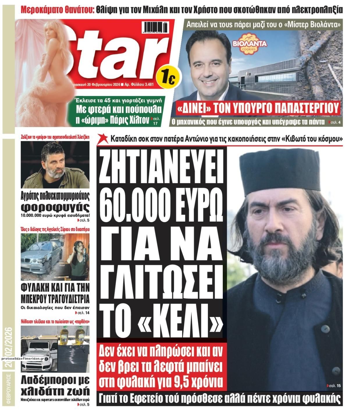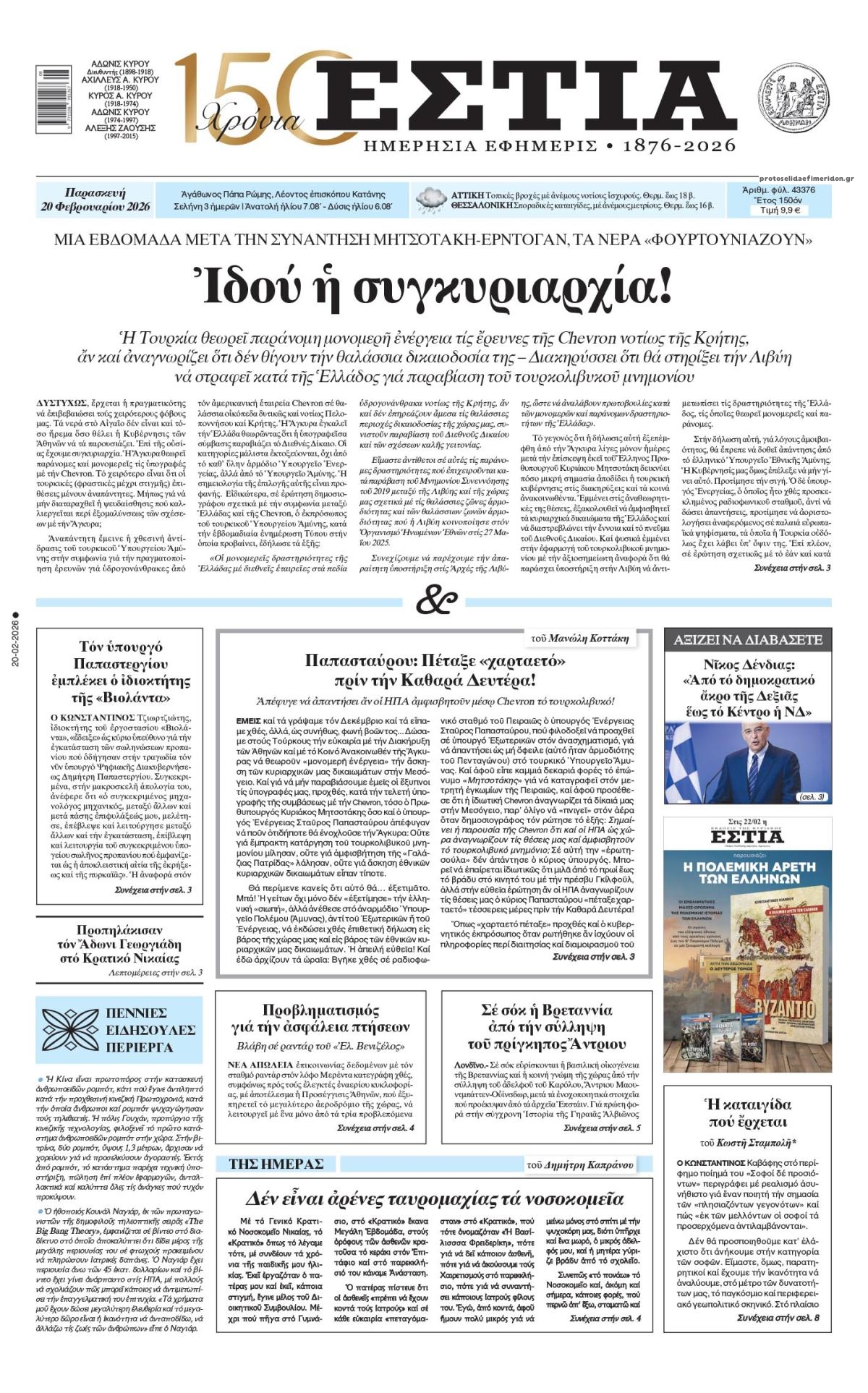 Οι πολιτικές εφημερίδες 20/2/2026 Enikos Newsroom 05:38, Παρασκευή 20 Φεβρουαρίου 2026 Media Διαβάστε τα πρωτοσέλιδα από τις πολιτικές εφημερίδες, σήμερα 20/2/2026. ΕΦΗΜΕΡΙΔΕΣ ΠΟΛΙΤΙΚΕΣ ΕΦΗΜΕΡΙΔΕΣ ΠΡΩΤΟΣΕΛΙΔΑ Μοιράσου το: Ατάραχος στην… Εβδομάδα Μόδας του Λονδίνου ο βασιλιάς Κάρολος μετά τη σύλληψη του αδερφού του, Άντριου Ιράν προς ΟΗΕ: Δεν επιθυμούμε πόλεμο αλλά θα απαντήσουμε αποφασιστικά σε ενδεχόμενη στρατιωτική επίθεση Τουρκία: Δημοσιογράφος της DW συλλαμβάνεται για «διασπορά ψευδών ειδήσεων» και «προσβολή» του προέδρου Ερντογάν σχολίασε κι εσύ (0 σχόλια) Ακολουθήστε το enikos.gr στο Google News και μάθετε πρώτοι όλες τις ειδήσεις Δείτε όλες τις τελευταίες ειδήσεις από την Ελλάδα και τον Κόσμο στο enikos.gr Ειδήσεις Ροή Ειδήσεων 8 ώρες πριν Στα ύψη η πολιτική αντιπαράθεση για τα επεισόδια στο νοσοκομείο Νίκαιας – Γεωργιάδης: «Αν δεν ήταν τα ΜΑΤ θα με είχαν σκοτώσει» 8 ώρες πριν Βιολάντα: Νέα πρόσωπα στο «κάδρο» των ερευνών για τη φονική έκρηξη – Οι αντιφάσεις που οδήγησαν στην προφυλάκιση του ιδιοκτήτη 10 ώρες πριν Δημοσκόπηση Metron Analysis: Στις 12,1% μονάδες η διαφορά ΝΔ-ΠΑΣΟΚ – Πόσοι θα ψήφιζαν Καρυστιανού, Τσίπρα ή Σαμαρά 9 ώρες πριν Κακλαμάνης για τις φωτογραφίες των 200 εκτελεσθέντων της Καισαριανής: «Αναφορές ότι υπάρχει ολόκληρο άλμπουμ, όχι μόνο αυτές που είδαμε» 8 ώρες πριν Άντριου: Ισχυρό πλήγμα στη βασιλική οικογένεια η σύλληψη και η έρευνα εναντίον του – «Κορυφή του παγόβουνου» η υπόθεση Επστάιν 8 ώρες πριν Θησαυρός στον βυθό: 3,5 τόνοι κεραμικών αποκαλύπτουν ένα πανίσχυρο λιμάνι του 14ου αιώνα 13 ώρες πριν Zero Waste στην πράξη: Πώς η Kerouac μετατρέπει τα «απορρίμματα» σε gourmet καινοτόμα προϊόντα 9 ώρες πριν Ύπνος: Γιατρός εξηγεί γιατί η απώλεια βάρους γίνεται πιο δύσκολη όταν κοιμάστε μετά τις 11 το βράδυ 1 ώρα πριν Καφές vs Tσάι: Ποιο ρόφημα είναι πιο αποτελεσματικό στην πρόληψη της άνοιας, σύμφωνα με μελέτη 54 λεπτά πριν Οπτική ψευδαίσθηση: Μόνο όσοι έχουν τέλεια όραση μπορούν να εντοπίσουν τις 3 καρδιές μέσα σε 15 δευτερόλεπτα 24 λεπτά πριν H Γκρέτα Τούνμπεργκ υποστηρίζει κομβόι ανθρωπιστικής βοήθειας με προορισμό την Κούβα τον Μάρτιο 38 λεπτά πριν ΔΕΔΔΗΕ: Διακοπές ρεύματος σήμερα (20/2) στην Αθήνα και σε άλλες 15 περιοχές της Αττικής 54 λεπτά πριν Οπτική ψευδαίσθηση: Μόνο όσοι έχουν τέλεια όραση μπορούν να εντοπίσουν τις 3 καρδιές μέσα σε 15 δευτερόλεπτα 1 ώρα πριν Καφές vs Tσάι: Ποιο ρόφημα είναι πιο αποτελεσματικό στην πρόληψη της άνοιας, σύμφωνα με μελέτη 1 ώρα πριν Σαν σήμερα 20 Φεβρουαρίου: Τα σημαντικότερα γεγονότα της ημέρας ENIKOS NETWORK Μπορείτε να εντοπίσετε το μοναδικό ανάποδο 10; Προσέξτε! Το σημερινό τεστ οπτικής αντίληψης είναι πιο δύσκολο γιατί όλη η φ... Το μαγικό μπαχαρικό από την Ινδία που μπορεί να ενισχύσει το γαστρεντερικό και να αντιμετωπίσει το σκορβούτο Σπανάκης: «115 έργα από το υπουργείο Εσωτερικών στην Αργολίδα» Σ. Ζαχαράκη: «Με έως 12 εκατ. ευρώ χρηματοδοτούμε την αναβάθμιση υποδομών και εξοπλισμού σε Αρεταίειο και Αιγινήτειο» Ευπάθεια στο moltbook ai αποκαλύπτει email, tokens σύνδεσης και api keys Αυτός είναι ο ρόλος της μικρής τρύπας στους νυχοκόπτες – «Είμαι ο μόνος που δεν το ήξερε;»» περισσότερα 02:40 , Παρασκευή 20 Φεβρουαρίου 2026 MasterChef: Δείτε ποιος παίκτης αποχώρησε από την κόκκινη μπριγάδα και ποια προσπάθεια άγγιξε το «τέλειο» «Άγγιξε σχεδόν το τέλειο» το πιάτο του Πάνου στο νέο επεισόδιο του MasterChef της Πέμπτης (19.... 19:55 , Πέμπτη 19 Φεβρουαρίου 2026 «Μπαμπά, σ’ αγαπώ»: Δύο από τ