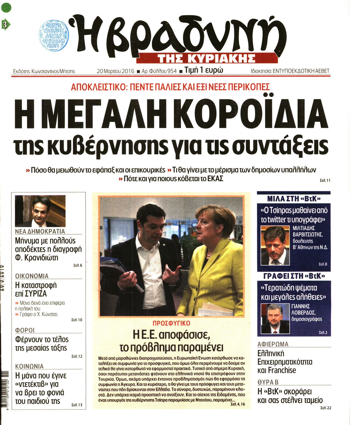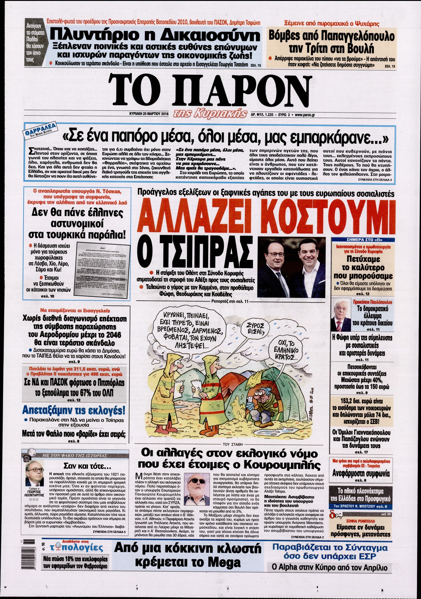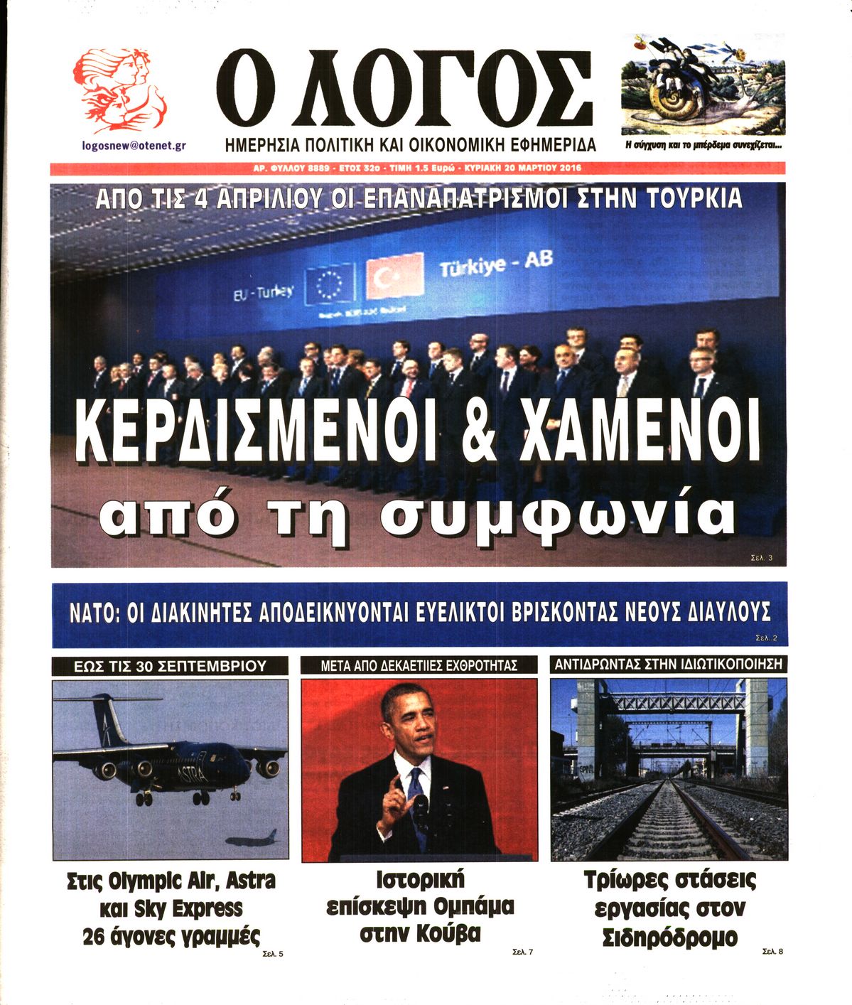 Oι πολιτικές εφημερίδες 20-3-2016 Enikos Newsroom 04:58, Κυριακή 20 Μαρτίου 2016 Media Διαβάστε τα σημερινά πρωτοσέλιδα των πολιτικών εφημερίδων: ΠΟΛΙΤΙΚΕΣ ΕΦΗΜΕΡΙΔΕΣ ΠΡΩΤΟΣΕΛΙΔΑ Μοιράσου το: σχολίασε κι εσύ (0 σχόλια) Ακολουθήστε το enikos.gr στο Google News και μάθετε πρώτοι όλες τις ειδήσεις Δείτε όλες τις τελευταίες ειδήσεις από την Ελλάδα και τον Κόσμο στο enikos.gr Ειδήσεις Ροή Ειδήσεων 1 ώρα πριν Χριστούγεννα στα μπλόκα: Επιμένουν στις κινητοποιήσεις τους οι αγρότες – Ανοίγουν τα διόδια το Σαββατοκύριακο 2 ώρες πριν Ουκρανία: Η άνευ προηγουμένου επίθεση σε ρωσικό τάνκερ στη Μεσόγειο και το μήνυμα προς στον Πούτιν – Το «μακρύ χέρι» του Κιέβου 1 ώρα πριν Πούτιν: Τα μηνύματα σε Ευρώπη και ΝΑΤΟ από το μαραθώνιο «σόου» του – Η απαίτηση για «σεβασμό» και η ειρήνη «με τους όρους» της Μόσχας 2 ώρες πριν Τραμπ: Δεν αποκλείει την πιθανότητα ενός πολέμου στη Βενεζουέλα – «Ο Μαδούρο ξέρει καλύτερα από τον καθένα τι ακριβώς θέλω» 3 ώρες πριν Συνεχίζει να προκαλεί ο Μίτσκοσκι: «Για μένα το όνομα Μακεδονία είναι ιερό» 1 ώρα πριν Ανακαλύφθηκαν αρχαία χρυσά νομίσματα 2.200 ετών που απεικονίζουν τον θεό Απόλλωνα – Η άγνωστη σύνδεση με τον Φίλιππο Β΄ της Μακεδονίας 2 ώρες πριν Ύπνος: Μια κρυφή κατάσταση του εγκεφάλου πριν από τον ύπνο μπορεί να είναι το “κλειδί” για υψηλή ευφυΐα και δημιουργικότητα 3 ώρες πριν Αριθμολογία: Οι άνθρωποι που έχουν γεννηθεί αυτές τις 4 ημερομηνίες, συχνά παρεξηγούνται – «Η καλοσύνη τους κρύβει τεράστια δύναμη» 4 ώρες πριν Ξεχάστε το καθάρισμα το Σαββατοκύριακο: Ο «κανόνας των 20 λεπτών» που θα σας λύσει τα χέρια 5 λεπτά πριν Πόλεμος στην Ουκρανία: Εφτά νεκροί από ρωσική πυραυλική επίθεση στο λιμάνι της Οδησσού 9 λεπτά πριν ΗΠΑ: Η κυβέρνηση του Ντόναλντ Τραμπ άρχισε να δημοσιοποιεί τα αρχεία Έπσταϊν 20 λεπτά πριν Σάμος: Άνοιξε το μπλόκο των αγροτών στον κόμβο Κοκκαρίου – Σε νέα συνεδρίαση θα καθορίσουν την στάση τους 29 λεπτά πριν Άνω Λιόσια: Πυροβολισμοί σε επιχείρηση με χαλιά – Εντοπίστηκαν 10 κάλυκες 36 λεπτά πριν Γάζα: Ισραηλινό πλήγμα σε σχολείο που είχαν καταφύγει εκτοπισμένοι – Τουλάχιστον έξι νεκροί ENIKOS NETWORK Το ΕΚΑΒ τιμήθηκε από την Ακαδημία Αθηνών για τα 40 χρόνια προσφοράς του Έχετε πραγματικά μεγάλη καρδιά; 10 χαρακτηριστικά όσων έχουν καλοσύνη Αναστολή μέτρων αναγκαστικής εκτέλεσης για κτηνοτρόφους που πλήττονται από την ευλογιά των αιγοπροβάτων Πλήρης επάρκεια προϊόντων στις λαϊκές της Αττικής, παρά τις αγροτικές κινητοποιήσεις – Τι απαντούν οι πωλητές Χαρτογραφώντας το «σημείο χωρίς επιστροφή»: Για πρώτη φορά αποκαλύπτεται με λεπτομέρεια το ακανθώδες όριο της ατμόσφαιρας τ... Η Google καταργεί τη λειτουργία «dark web report» – Πώς θα μπορούν οι χρήστες να διαγράφουν τα δεδομένα τους περισσότερα 22:42 , Παρασκευή 19 Δεκεμβρίου 2025 Γιώργος Γιαννόπουλος για “Το σόι σου”: “Είναι ευτυχία και ευλογία αυτή η σειρά” «Είναι ευτυχία και ευλογία η συγκυρία αυτής της σειράς», θα πει ο Γιώργος Γιαννόπουλος -ο αγαπ... 20:37 , Παρασκευή 19 Δεκεμβρίου 2025 Don’t Forget The Lyrics: Η Έλλη Κοκκίνου υποδέχεται 4 παίκτες που θα κάνουν τα πάντα για να μη χάσουν ούτε… μισή λέξη από τους στίχους Το «Don’t Forget The Lyrics» επιστρέφει απόψε, Παρασκευή 19 Δεκεμβρίου, στις 21:00 με νέο επει... 19:31 , Παρασκευή 19 Δεκεμβρίου 2025 GNTM: Απόψε ο μεγάλος τελικός για τους 4 φιναλίστ Έπειτα από μήνες γεμάτους μόδα, δημιουργία και έντονες αναμετρήσεις, το GNTM 2025 κορυφώνεται,... 18:11 , Παρασκευή 19 Δεκεμβρίου 2025 Το σόι σου: Ο Άρης 