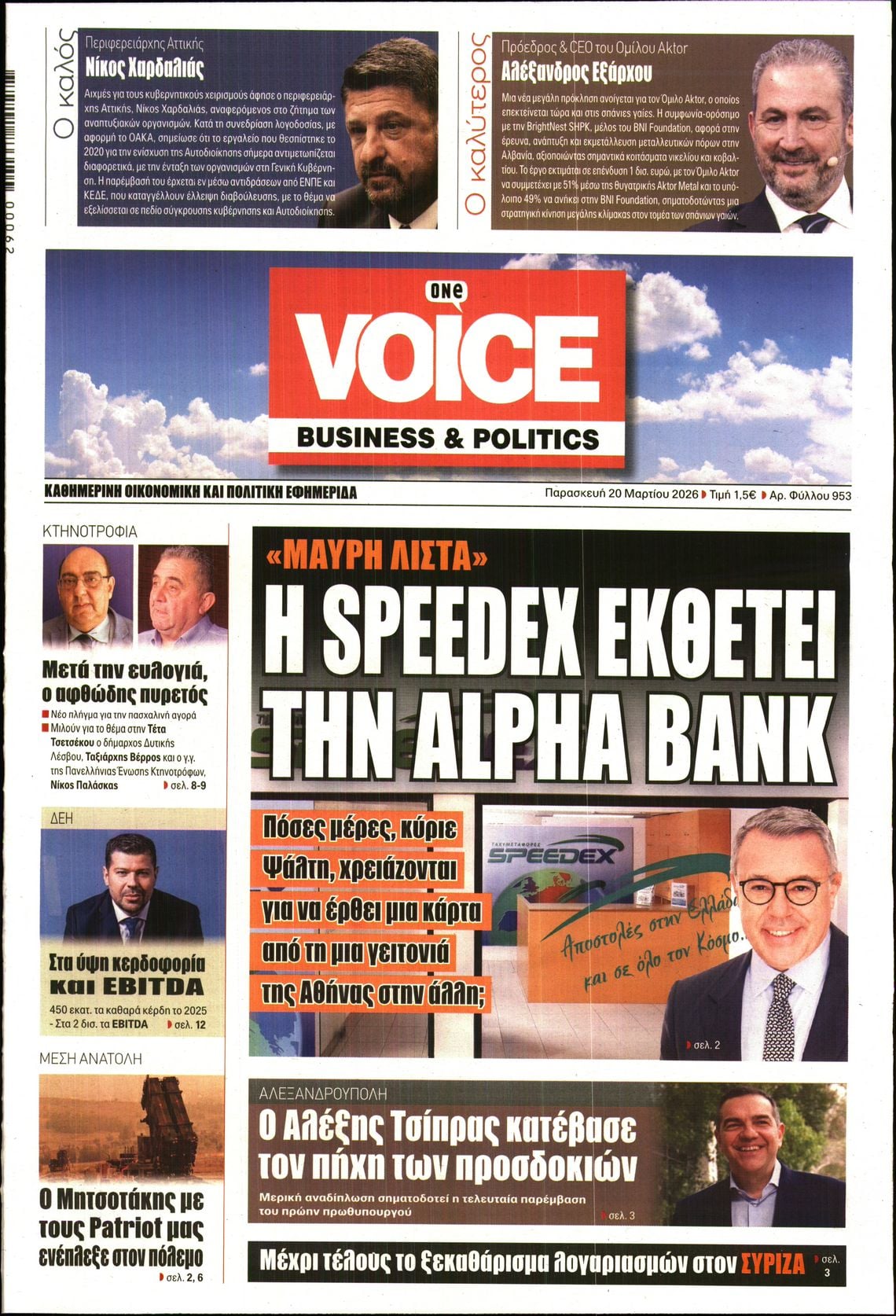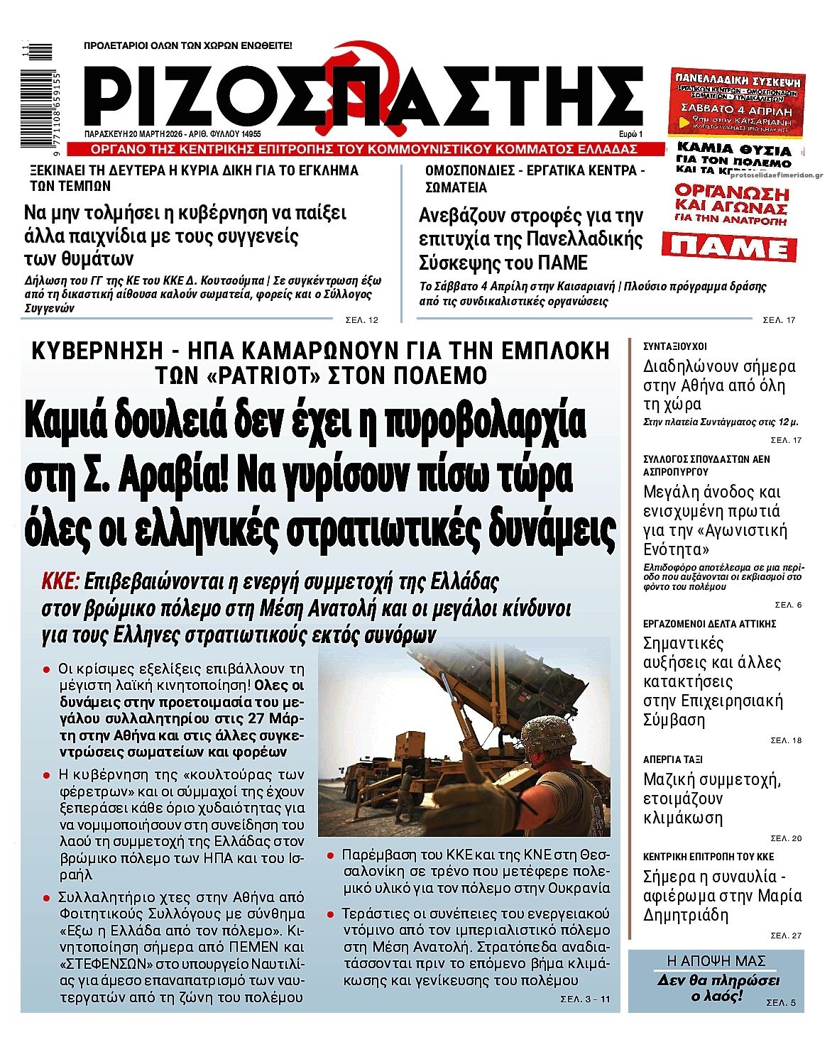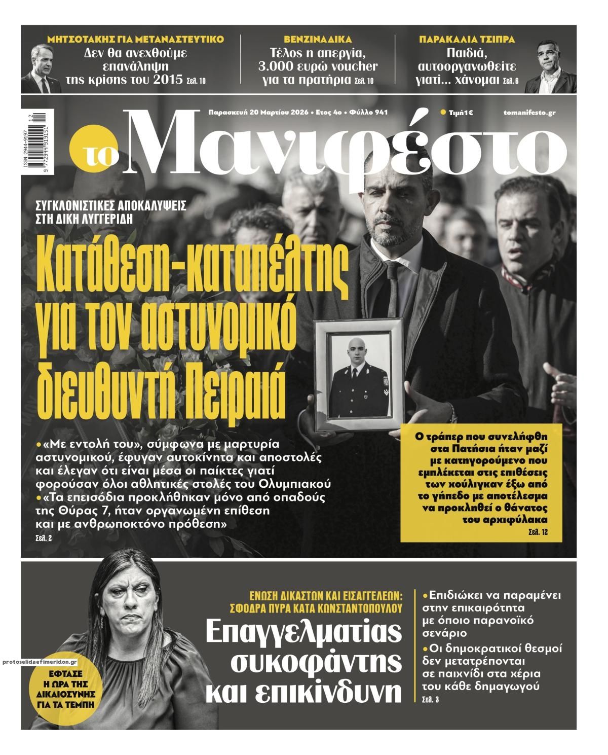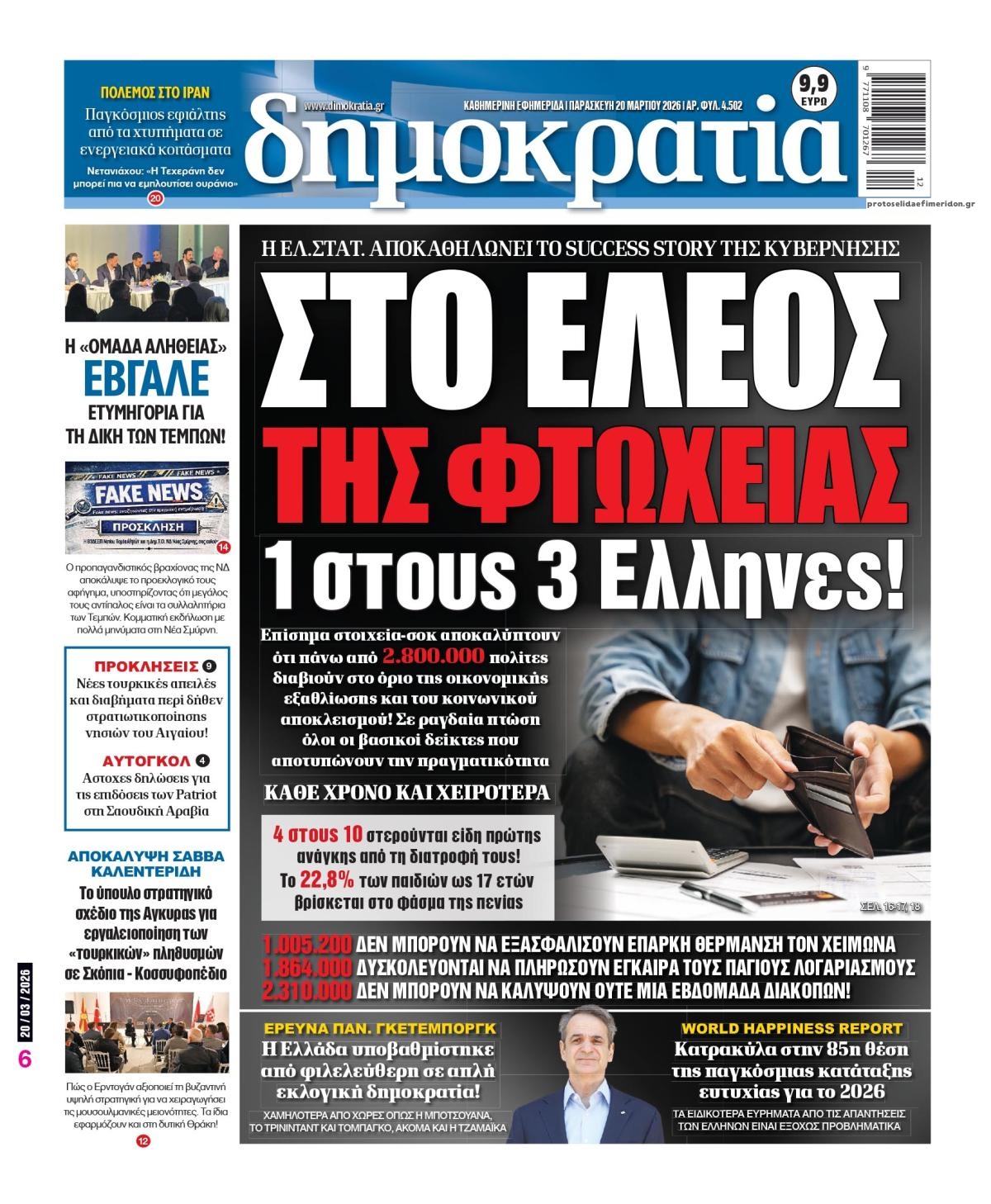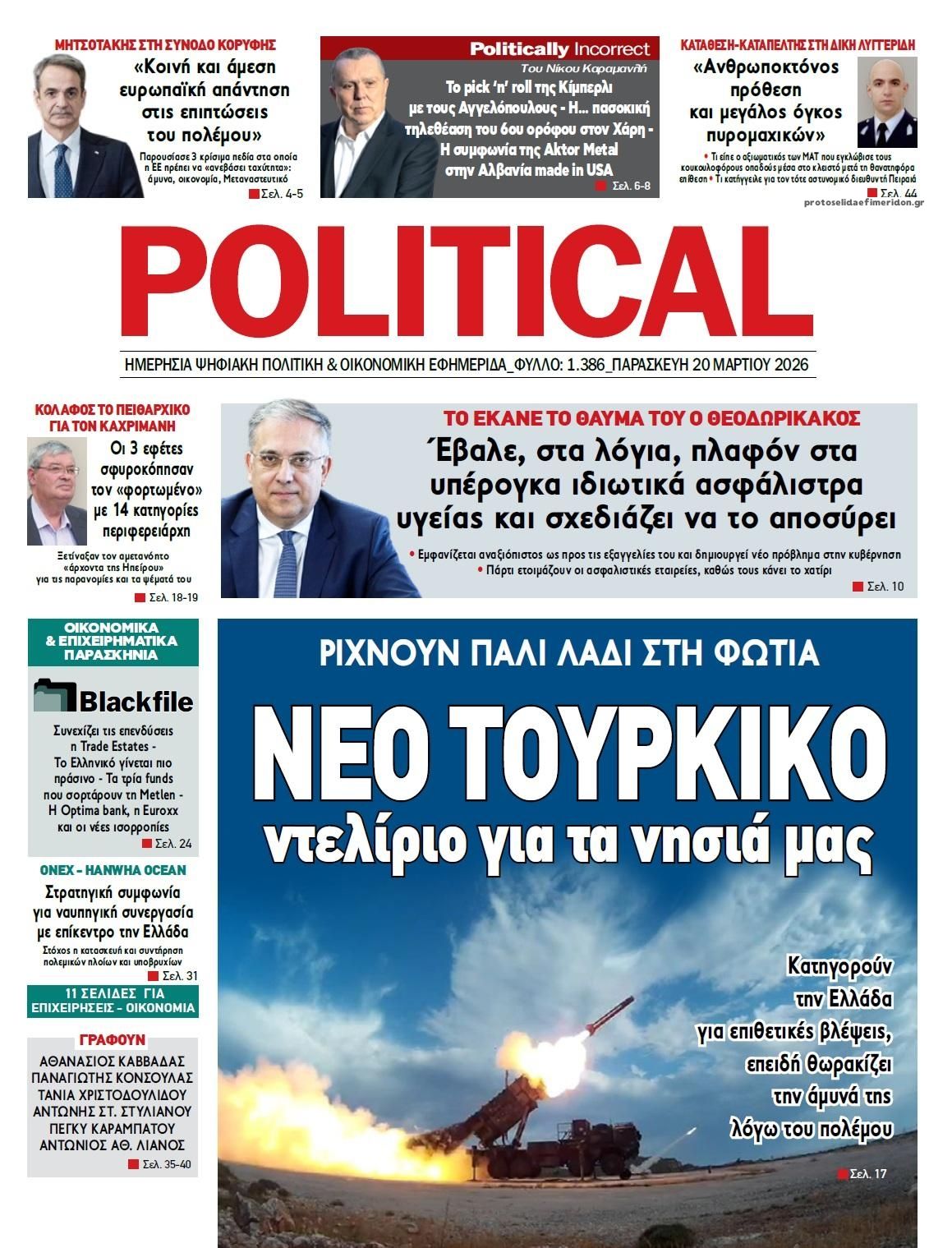 Οι πολιτικές εφημερίδες 20/3/2026 Enikos Newsroom 05:38, Παρασκευή 20 Μαρτίου 2026 Media Διαβάστε τα πρωτοσέλιδα από τις πολιτικές εφημερίδες, σήμερα 20/3/2026. ΕΦΗΜΕΡΙΔΕΣ ΠΟΛΙΤΙΚΕΣ ΕΦΗΜΕΡΙΔΕΣ ΠΡΩΤΟΣΕΛΙΔΑ Μοιράσου το: Εορτολόγιο: Ποιοι γιορτάζουν σήμερα 20 Μαρτίου Σεισμός 4,1 Ρίχτερ στην Ηλεία – Αισθητός σε πολλές περιοχές Φον ντερ Λάιεν: «Η ασφάλεια της Κύπρου είναι η ασφάλεια της ΕΕ» – «Επαινώ τον Πρόεδρο Χριστοδουλίδη» – Μπλόκο 90 δισ. για την Ουκρανία από τον Όρμπαν σχολίασε κι εσύ (0 σχόλια) Ακολουθήστε το Enikos στο Google News και μάθετε πρώτοι όλες τις ειδήσεις Δείτε όλες τις τελευταίες ειδήσεις από την Ελλάδα και τον Κόσμο στο enikos.gr Ειδήσεις Ροή Ειδήσεων 23 ώρες πριν LIVE – 20ή ημέρα πολέμου ΗΠΑ – Ισραήλ με Ιράν – Οι εξελίξεις στη Μέση Ανατολή 5 ώρες πριν Κυριάκος Μητσοτάκης: Η αμυντική διάταξη της Ελλάδας δεν είναι υπό διαπραγμάτευση με κανέναν – Δείτε ολόκληρη τη συνέντευξη 3 ώρες πριν Σεισμός 4,1 Ρίχτερ στην Ηλεία – Αισθητός σε πολλές περιοχές 8 ώρες πριν Μέση Ανατολή: Η νέα προειδοποίηση του Ιράν, τα αντικρουόμενα μηνύματα Τραμπ-Νετανιάχου και ο φόβος για γενικευμένη αποσταθεροποίηση 8 ώρες πριν Θεσσαλονίκη: Το Σάββατο η απολογία του 19χρονου φίλου του Κλεομένη – Η αναβάθμιση κατηγοριών και η έφοδος σε σύνδεσμο φιλάθλων 57 λεπτά πριν Οπτική ψευδαίσθηση: Μόνο όσοι έχουν τέλεια όραση μπορούν να εντοπίσουν την 4η γάτα μέσα σε 14 δευτερόλεπτα 1 ώρα πριν Πρόληψη άνοιας: Η κατανάλωση τροφών πλούσιων σε μαγνήσιο μπορεί να βελτιώσει τη γνωστική λειτουργία, σύμφωνα με μελέτη 4 ώρες πριν Ζώδια 20/3: Ημερήσιες προβλέψεις – Υδροχόοι, είναι η ώρα να μοιραστείτε τις ιδέες σας με άλλους 8 ώρες πριν Μία βυθισμένη αρχαία πόλη 2.400 ετών αποκαλύπτεται – Συγκλονιστικά υποβρύχια πλάνα 22 λεπτά πριν MasterChef: Αποχώρησε η Φωτεινή – «Έφυγε ένα βάρος από την ομάδα» 38 λεπτά πριν ΔΕΔΔΗΕ: Διακοπές ρεύματος σήμερα (20/3) στην Αθήνα και σε άλλες 12 περιοχές της Αττικής 52 λεπτά πριν Πιτ Χέγκσεθ: «Χρειάζονται χρήματα για να σκοτώνεις τους κακούς» 57 λεπτά πριν Οπτική ψευδαίσθηση: Μόνο όσοι έχουν τέλεια όραση μπορούν να εντοπίσουν την 4η γάτα μέσα σε 14 δευτερόλεπτα 1 ώρα πριν Πρόληψη άνοιας: Η κατανάλωση τροφών πλούσιων σε μαγνήσιο μπορεί να βελτιώσει τη γνωστική λειτουργία, σύμφωνα με μελέτη ENIKOS NETWORK Βρείτε τις 3 διαφορές στη φωτογραφία με τα παιδάκια που παίζουν και λύστε το τεστ παρατηρητικότητας Το όσπριο – Αφρικανικό σύμβολο της γονιμότητας που μπορεί να ρυθμίσει το σάκχαρο και να βοηθήσει με την απώλεια βάρους Λαϊκές Αγορές: Το πετρέλαιο κίνησης και τα λιπάσματα «εκτοξεύουν» το κόστος παραγωγής Ψηφιακή κάρτα εργασίας: Αύξηση 53% λόγω Κάρτας Εργασίας στις υπερωρίες το 2025 Jessica Adams: Πρόβλεψη σοκ από τη γνωστή αστρολόγο – Ο παγκόσμιος χάρτης θα ξαναγραφτεί το 2026 Τεστ παρατηρητικότητας: Μπορείτε να βρείτε τις 3 διαφορές στις εικόνες με ένα κοάλα σε 13 δευτερόλεπτα περισσότερα 05:43 , Παρασκευή 20 Μαρτίου 2026 Οι αθλητικές εφημερίδες 20/3/2026 Διαβάστε τα πρωτοσέλιδα από τις αθλητικές εφημερίδες, σήμερα 20/3/2026. 22:40 , Πέμπτη 19 Μαρτίου 2026 «Θάλασσες μας χώρισαν»: Πότε θα δούμε τη σειρά της ΕΡΤ; Η μίνι σειρά της ΕΡΤ, «Θάλασσες μας χώρισαν», μετρά μόλις 8 επεισόδια αλλά προβλέπεται καθηλωτ... 22:23 , Πέμπτη 19 Μαρτίου 2026 Στα παρασκήνια του «MOMENTS» λίγο πριν την πρεμιέρα του στον ΑΝΤ1 Το «Moments» με οικοδέσποινα τη Ζέτα Μακρυπούλια έρχεται στον ΑΝΤ1 το Σάββατο 21 Μαρτίου στις ... 21:31 , Πέμπτη 19 Μαρτίου 2026 Άγιος έρωτας: Ο Νικόλαος έτοιμος για 