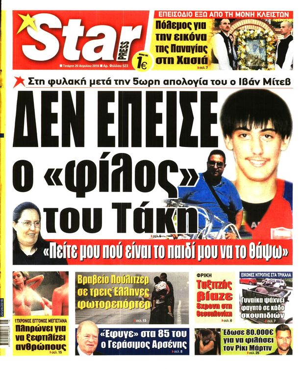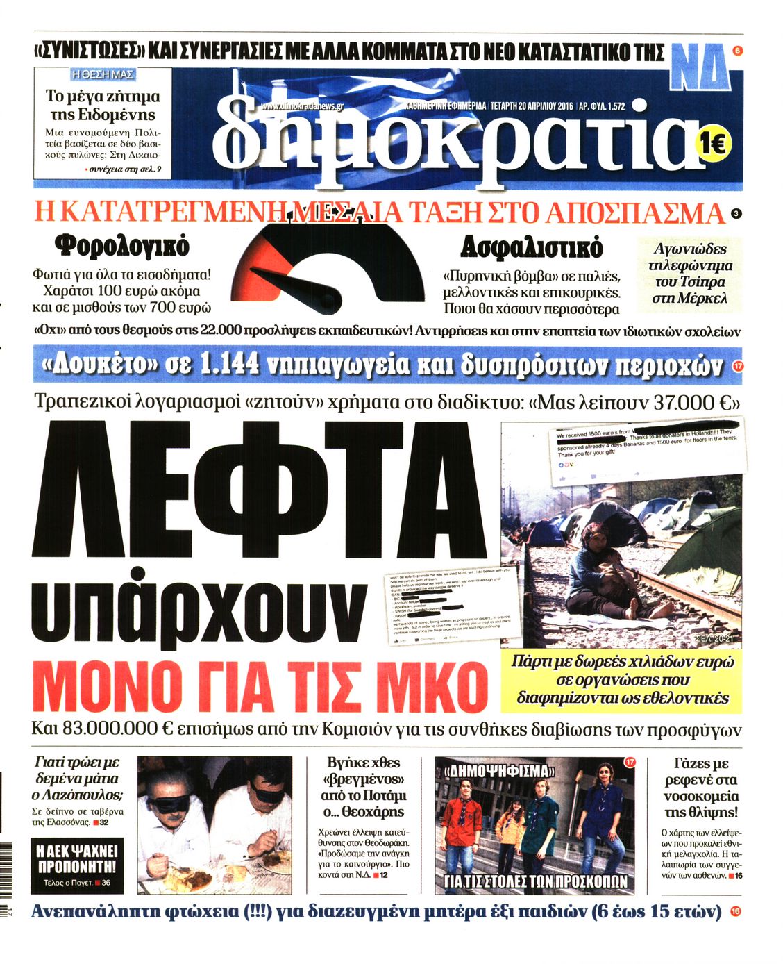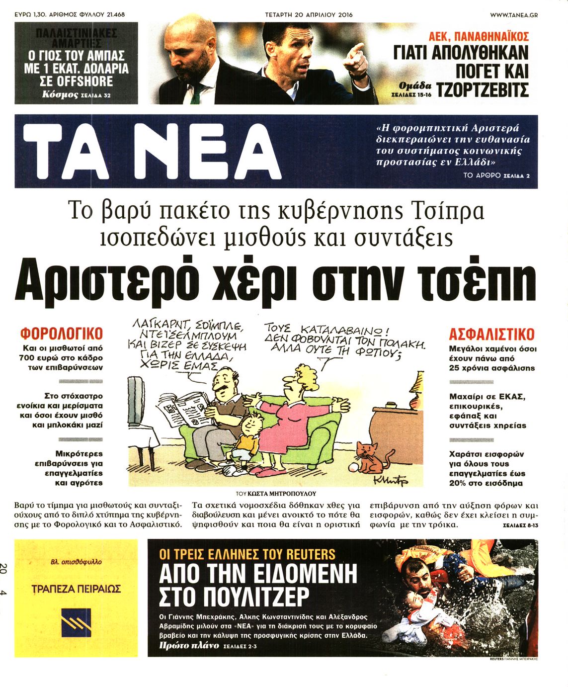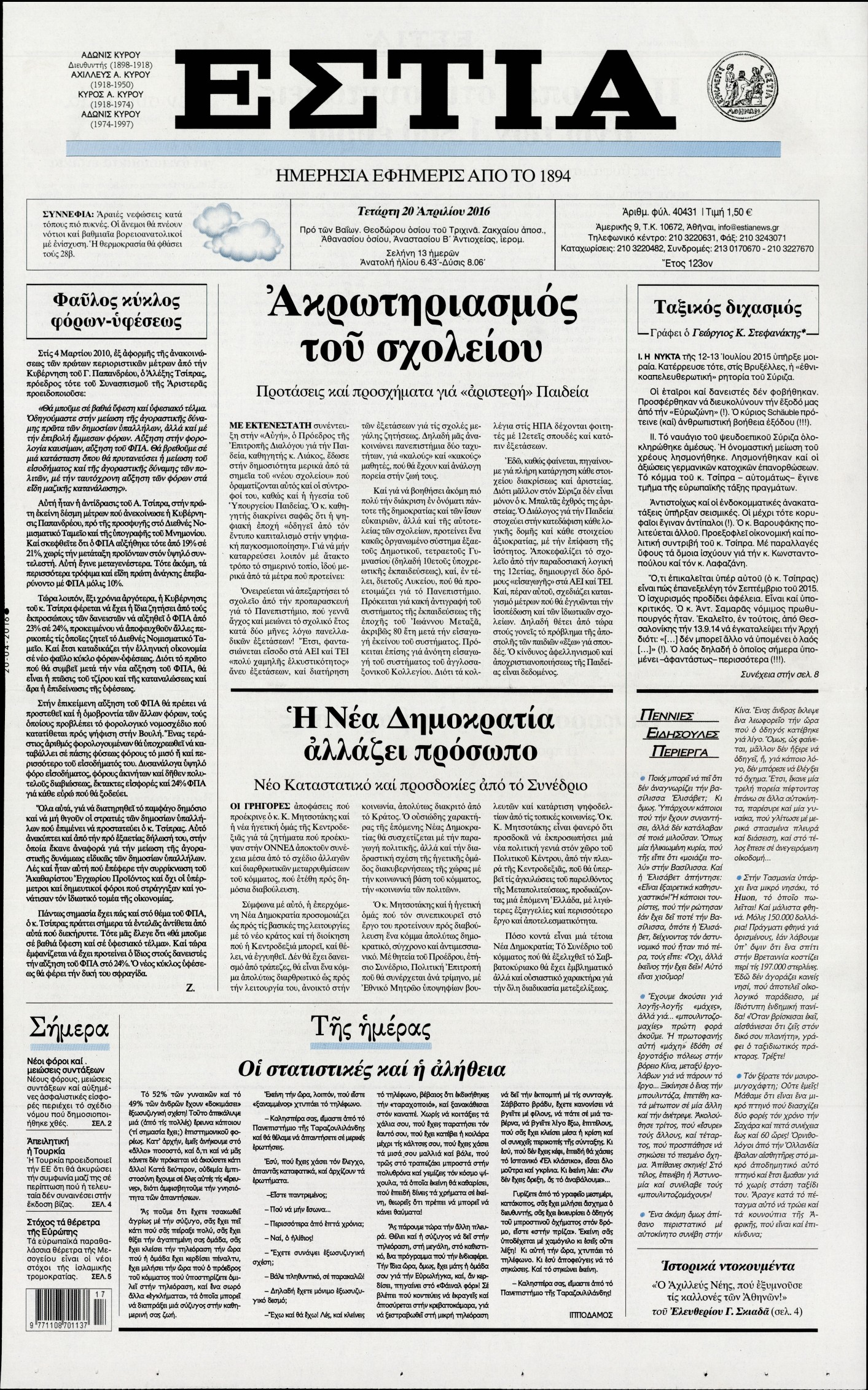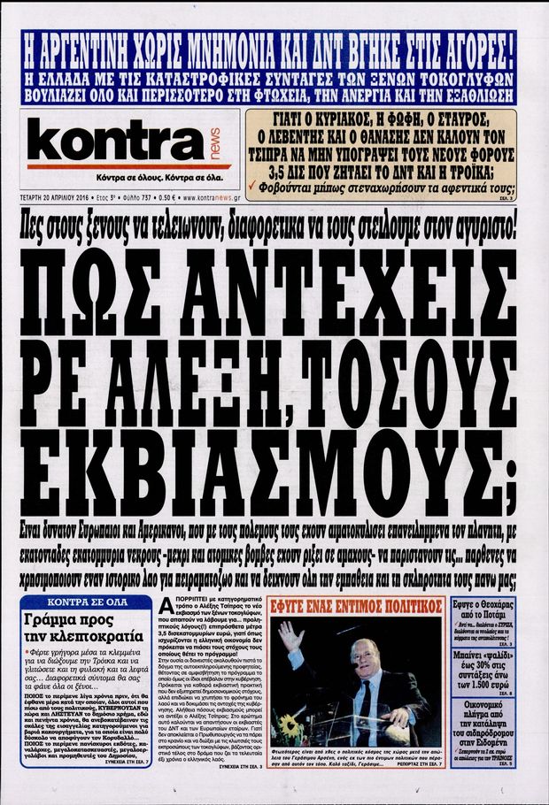 Oι πολιτικές εφημερίδες 20-4-2016 Enikos Newsroom 05:41, Τετάρτη 20 Απριλίου 2016 Media Διαβάστε τα σημερινά πρωτοσέλιδα των πολιτικών εφημερίδων: ΠΟΛΙΤΙΚΕΣ ΕΦΗΜΕΡΙΔΕΣ ΠΡΩΤΟΣΕΛΙΔΑ Μοιράσου το: σχολίασε κι εσύ (0 σχόλια) Ακολουθήστε το enikos.gr στο Google News και μάθετε πρώτοι όλες τις ειδήσεις Δείτε όλες τις τελευταίες ειδήσεις από την Ελλάδα και τον Κόσμο στο enikos.gr Ειδήσεις Ροή Ειδήσεων 6 ώρες πριν Χριστούγεννα στα μπλόκα: Επιμένουν στις κινητοποιήσεις τους οι αγρότες – Ανοίγουν τα διόδια το Σαββατοκύριακο 7 ώρες πριν Ουκρανία: Η άνευ προηγουμένου επίθεση σε ρωσικό τάνκερ στη Μεσόγειο και το μήνυμα προς στον Πούτιν – Το «μακρύ χέρι» του Κιέβου 6 ώρες πριν Πούτιν: Τα μηνύματα σε Ευρώπη και ΝΑΤΟ από το μαραθώνιο «σόου» του – Η απαίτηση για «σεβασμό» και η ειρήνη «με τους όρους» της Μόσχας 7 ώρες πριν Τραμπ: Δεν αποκλείει την πιθανότητα ενός πολέμου στη Βενεζουέλα – «Ο Μαδούρο ξέρει καλύτερα από τον καθένα τι ακριβώς θέλω» 7 ώρες πριν Συνεχίζει να προκαλεί ο Μίτσκοσκι: «Για μένα το όνομα Μακεδονία είναι ιερό» 6 ώρες πριν Ανακαλύφθηκαν αρχαία χρυσά νομίσματα 2.200 ετών που απεικονίζουν τον θεό Απόλλωνα – Η άγνωστη σύνδεση με τον Φίλιππο Β΄ της Μακεδονίας 7 ώρες πριν Ύπνος: Μια κρυφή κατάσταση του εγκεφάλου πριν από τον ύπνο μπορεί να είναι το “κλειδί” για υψηλή ευφυΐα και δημιουργικότητα 8 ώρες πριν Αριθμολογία: Οι άνθρωποι που έχουν γεννηθεί αυτές τις 4 ημερομηνίες, συχνά παρεξηγούνται – «Η καλοσύνη τους κρύβει τεράστια δύναμη» 9 ώρες πριν Ξεχάστε το καθάρισμα το Σαββατοκύριακο: Ο «κανόνας των 20 λεπτών» που θα σας λύσει τα χέρια 9 λεπτά πριν Μοχάμεντ Σαλάχ: Ζήτησε «συγγνώμη» από τους συμπαίκτες του στη Λίβερπουλ για το ξέσπασμά του 24 λεπτά πριν Μάρκο Ρούμπιο: Ανθρωπιστική κατάπαυση του πυρός στο Σουδάν ζητά ο Αμερικανός υπουργός Εξωτερικών 39 λεπτά πριν Αγγελική Νικολούλη: Τα συλλυπητήρια για την απώλεια της Ειρήνης Μαρινάκη 53 λεπτά πριν Βολιβία: Μαζική διαδηλώσεις εναντίον της κατάργησης των επιδοτήσεων των τιμών των καυσίμων 1 ώρα πριν Φως στο Τούνελ: Έφτασε η ώρα της αλήθειας για την δολοφονία της χήρας του πρώην υπουργού στο Κολωνάκι ENIKOS NETWORK Το ΕΚΑΒ τιμήθηκε από την Ακαδημία Αθηνών για τα 40 χρόνια προσφοράς του Έχετε πραγματικά μεγάλη καρδιά; 10 χαρακτηριστικά όσων έχουν καλοσύνη Αναστολή μέτρων αναγκαστικής εκτέλεσης για κτηνοτρόφους που πλήττονται από την ευλογιά των αιγοπροβάτων Πλήρης επάρκεια προϊόντων στις λαϊκές της Αττικής, παρά τις αγροτικές κινητοποιήσεις – Τι απαντούν οι πωλητές Χαρτογραφώντας το «σημείο χωρίς επιστροφή»: Για πρώτη φορά αποκαλύπτεται με λεπτομέρεια το ακανθώδες όριο της ατμόσφαιρας τ... Η Google καταργεί τη λειτουργία «dark web report» – Πώς θα μπορούν οι χρήστες να διαγράφουν τα δεδομένα τους περισσότερα 04:20 , Σάββατο 20 Δεκεμβρίου 2025 Αγγελική Νικολούλη: Τα συλλυπητήρια για την απώλεια της Ειρήνης Μαρινάκη Τα συλληπητήρια στον πρόεδρο του Mega, τον Βαγγέλη Μαρινάκη, για την απώλεια της μητέρας του Ε... 02:50 , Σάββατο 20 Δεκεμβρίου 2025 GNTM: Η Ξένια Τσίρκοβα αναδείχθηκε μεγάλη νικήτρια και πήρε τις 50.000 ευρώ – Ποιος βρέθηκε σε απόσταση αναπνοής; Με φαντασμαγορικό τρόπο ολοκληρώθηκε το βράδυ της Παρασκευής ο μεγάλος τελικός του GNTM, μέσα ... 22:42 , Παρασκευή 19 Δεκεμβρίου 2025 Γιώργος Γιαννόπουλος για “Το σόι σου”: “Είναι ευτυχία και ευλογία αυτή η σειρά” «Είναι ευτυχία και ευλογία η συγκυρία αυτής της σειράς», θα πει ο Γιώργος Γιαννόπουλος -ο αγαπ... 20:37 , 