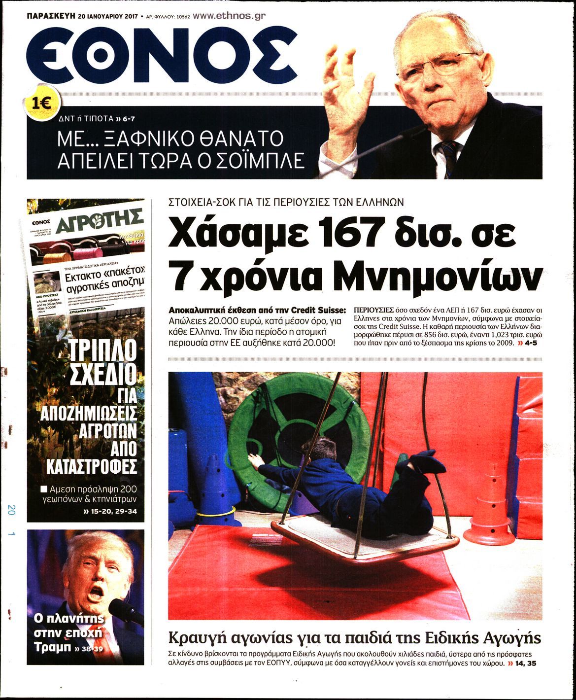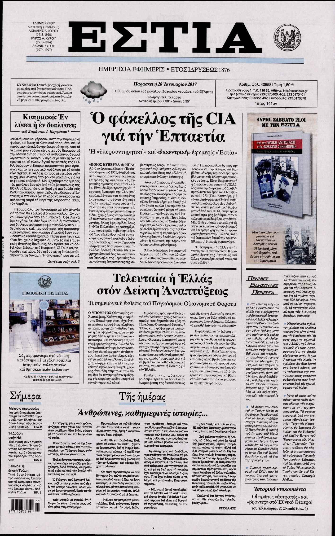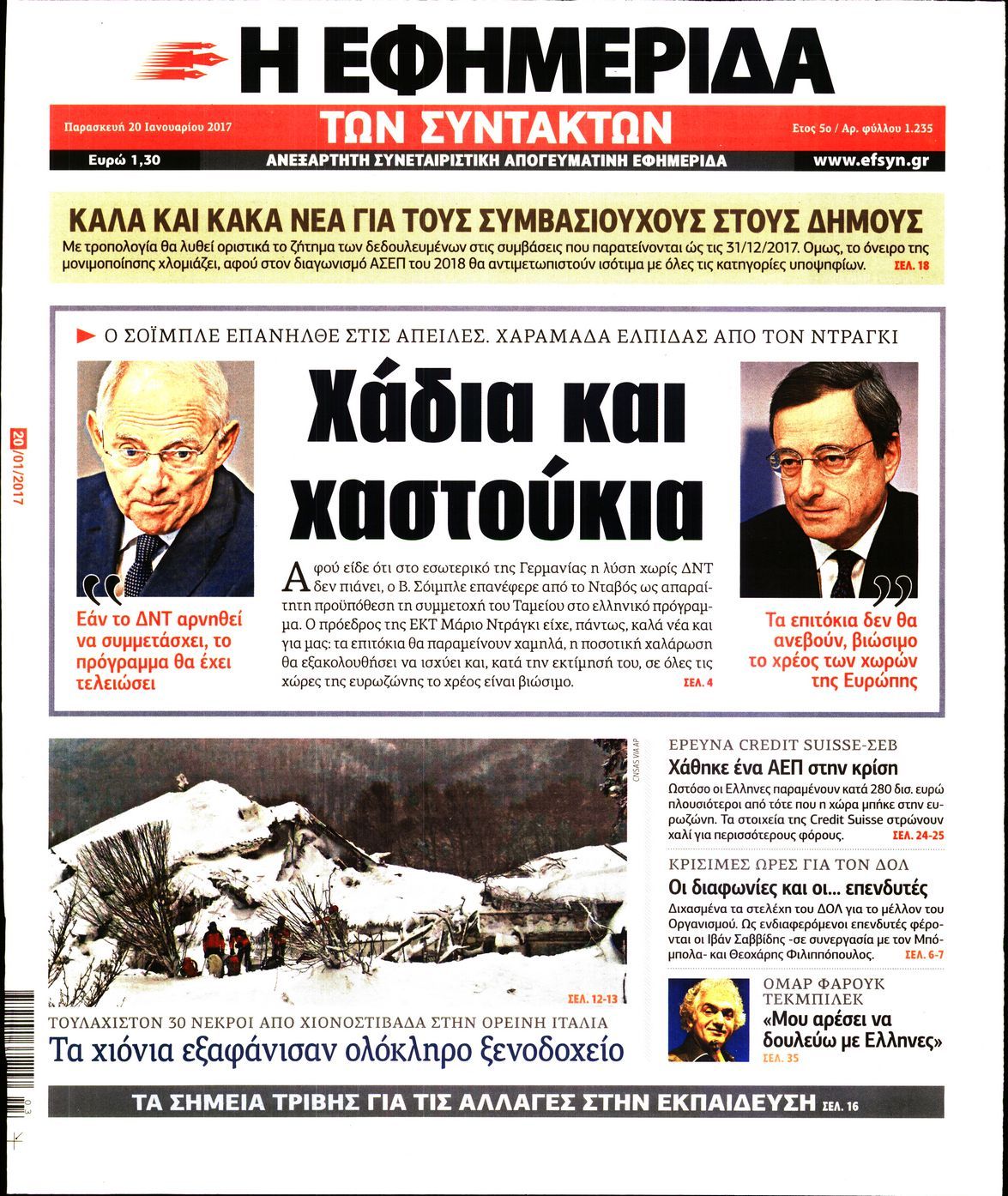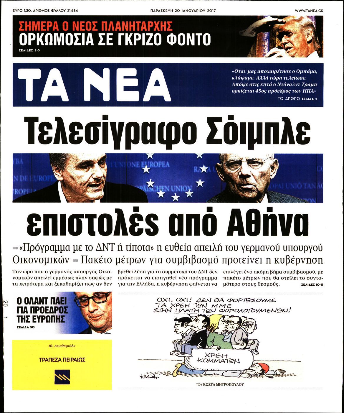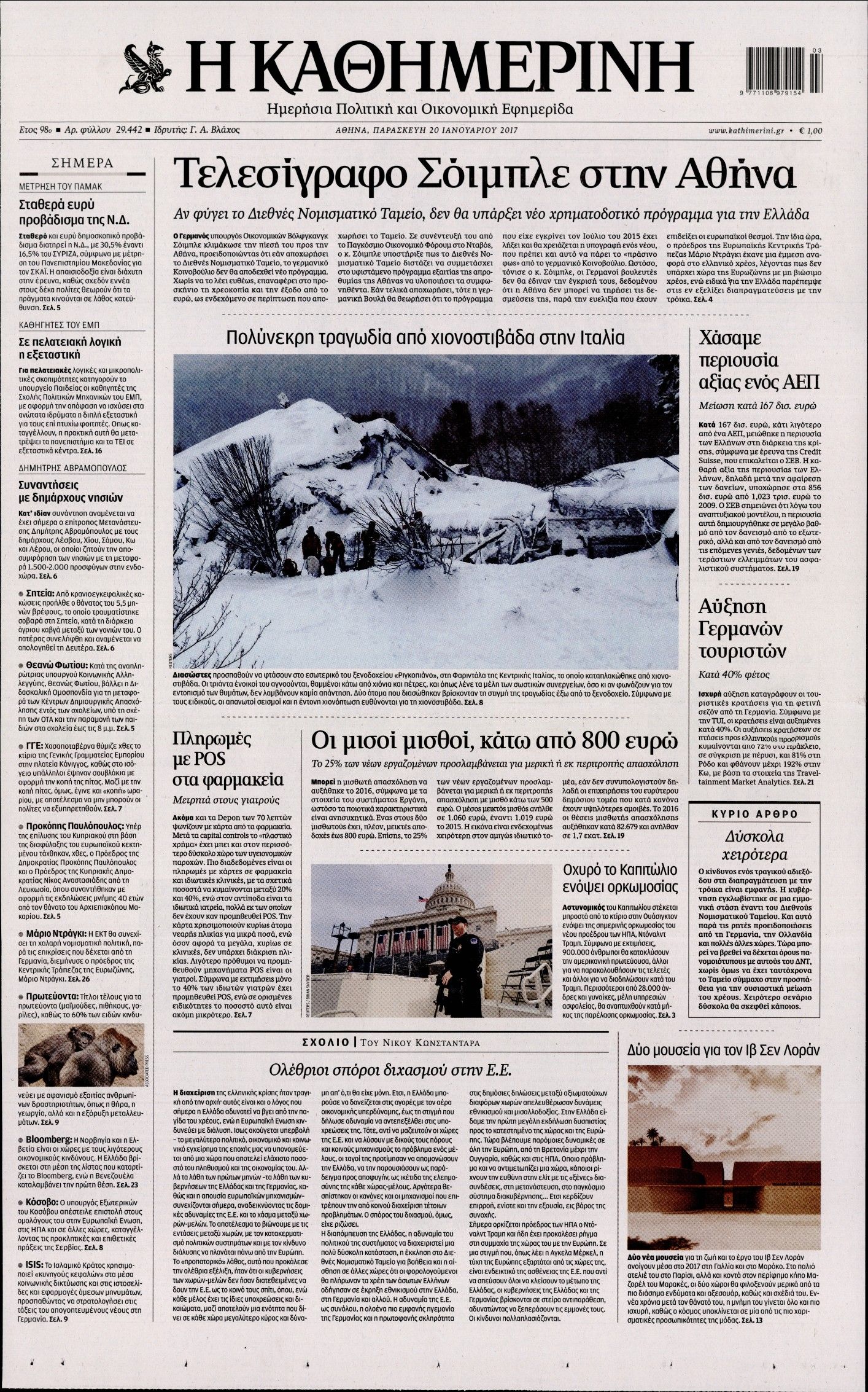Οι πολιτικές εφημερίδες 20/1/2017 Enikos Newsroom 02:08, Παρασκευή 20 Ιανουαρίου 2017 Media Διαβάστε τα σημερινά πρωτοσέλιδα των πολιτικών εφημερίδων: ΠΟΛΙΤΙΚΕΣ ΕΦΗΜΕΡΙΔΕΣ ΠΡΩΤΟΣΕΛΙΔΑ Μοιράσου το: σχολίασε κι εσύ (0 σχόλια) Ακολουθήστε το enikos.gr στο Google News και μάθετε πρώτοι όλες τις ειδήσεις Δείτε όλες τις τελευταίες ειδήσεις από την Ελλάδα και τον Κόσμο στο enikos.gr Ειδήσεις Ροή Ειδήσεων 5 ώρες πριν Χριστούγεννα στα μπλόκα: Επιμένουν στις κινητοποιήσεις τους οι αγρότες – Ανοίγουν τα διόδια το Σαββατοκύριακο 5 ώρες πριν Ουκρανία: Η άνευ προηγουμένου επίθεση σε ρωσικό τάνκερ στη Μεσόγειο και το μήνυμα προς στον Πούτιν – Το «μακρύ χέρι» του Κιέβου 4 ώρες πριν Πούτιν: Τα μηνύματα σε Ευρώπη και ΝΑΤΟ από το μαραθώνιο «σόου» του – Η απαίτηση για «σεβασμό» και η ειρήνη «με τους όρους» της Μόσχας 5 ώρες πριν Τραμπ: Δεν αποκλείει την πιθανότητα ενός πολέμου στη Βενεζουέλα – «Ο Μαδούρο ξέρει καλύτερα από τον καθένα τι ακριβώς θέλω» 6 ώρες πριν Συνεχίζει να προκαλεί ο Μίτσκοσκι: «Για μένα το όνομα Μακεδονία είναι ιερό» 4 ώρες πριν Ανακαλύφθηκαν αρχαία χρυσά νομίσματα 2.200 ετών που απεικονίζουν τον θεό Απόλλωνα – Η άγνωστη σύνδεση με τον Φίλιππο Β΄ της Μακεδονίας 5 ώρες πριν Ύπνος: Μια κρυφή κατάσταση του εγκεφάλου πριν από τον ύπνο μπορεί να είναι το “κλειδί” για υψηλή ευφυΐα και δημιουργικότητα 6 ώρες πριν Αριθμολογία: Οι άνθρωποι που έχουν γεννηθεί αυτές τις 4 ημερομηνίες, συχνά παρεξηγούνται – «Η καλοσύνη τους κρύβει τεράστια δύναμη» 7 ώρες πριν Ξεχάστε το καθάρισμα το Σαββατοκύριακο: Ο «κανόνας των 20 λεπτών» που θα σας λύσει τα χέρια 16 λεπτά πριν Η Ελλάδα προσχωρεί στη Διεθνή Επιτροπή Αποζημιώσεων για την Ουκρανία 30 λεπτά πριν GNTM: Η Ξένια Τσίρκοβα αναδείχθηκε μεγάλη νικήτρια και πήρε τις 50.000 ευρώ – Ποιος βρέθηκε σε απόσταση αναπνοής; 45 λεπτά πριν Θεσσαλονίκη: Εξαφανίστηκε 13χρονος από χώρο φιλοξενίας ασυνόδευτων ανηλίκων στο Ωραιόκαστρο 56 λεπτά πριν Ντόναλντ Τραμπ: «Πολύ βαριά αντίποινα» στη Συρία – «Πλήττουμε πολύ δυνατά οχυρά του Ισλαμικού Κράτους» 1 ώρα πριν Εξάρχεια: Ένταση με μολότοφ, χημικά και κρότου λάμψης ENIKOS NETWORK Το ΕΚΑΒ τιμήθηκε από την Ακαδημία Αθηνών για τα 40 χρόνια προσφοράς του Έχετε πραγματικά μεγάλη καρδιά; 10 χαρακτηριστικά όσων έχουν καλοσύνη Αναστολή μέτρων αναγκαστικής εκτέλεσης για κτηνοτρόφους που πλήττονται από την ευλογιά των αιγοπροβάτων Πλήρης επάρκεια προϊόντων στις λαϊκές της Αττικής, παρά τις αγροτικές κινητοποιήσεις – Τι απαντούν οι πωλητές Χαρτογραφώντας το «σημείο χωρίς επιστροφή»: Για πρώτη φορά αποκαλύπτεται με λεπτομέρεια το ακανθώδες όριο της ατμόσφαιρας τ... Η Google καταργεί τη λειτουργία «dark web report» – Πώς θα μπορούν οι χρήστες να διαγράφουν τα δεδομένα τους περισσότερα 02:50 , Σάββατο 20 Δεκεμβρίου 2025 GNTM: Η Ξένια Τσίρκοβα αναδείχθηκε μεγάλη νικήτρια και πήρε τις 50.000 ευρώ – Ποιος βρέθηκε σε απόσταση αναπνοής; Με φαντασμαγορικό τρόπο ολοκληρώθηκε το βράδυ της Παρασκευής ο μεγάλος τελικός του GNTM, μέσα ... 22:42 , Παρασκευή 19 Δεκεμβρίου 2025 Γιώργος Γιαννόπουλος για “Το σόι σου”: “Είναι ευτυχία και ευλογία αυτή η σειρά” «Είναι ευτυχία και ευλογία η συγκυρία αυτής της σειράς», θα πει ο Γιώργος Γιαννόπουλος -ο αγαπ... 20:37 , Παρασκευή 19 Δεκεμβρίου 2025 Don’t Forget The Lyrics: Η Έλλη Κοκκίνου υποδέχεται 4 παίκτες που θα κάνουν τα πάντα για να μη χάσουν ούτε… μισή λέξη από τους στίχους Το «Don’t Forget The Lyrics» επιστρέφει απόψε, Παρασκευή 19 Δεκεμβρίου, στις 21:0