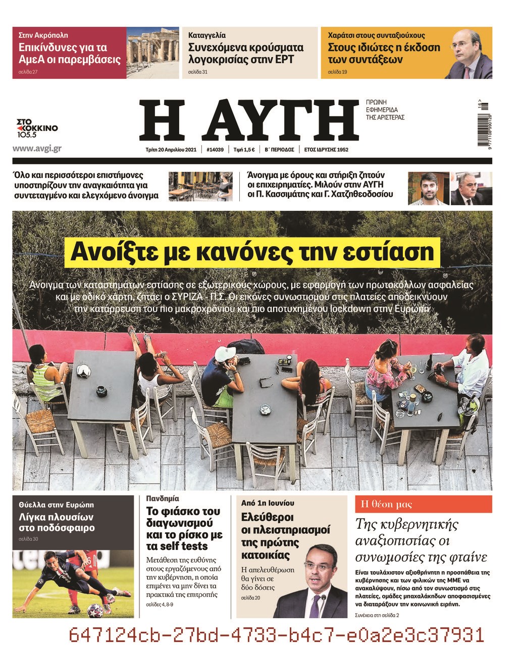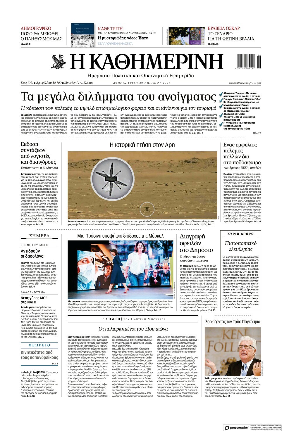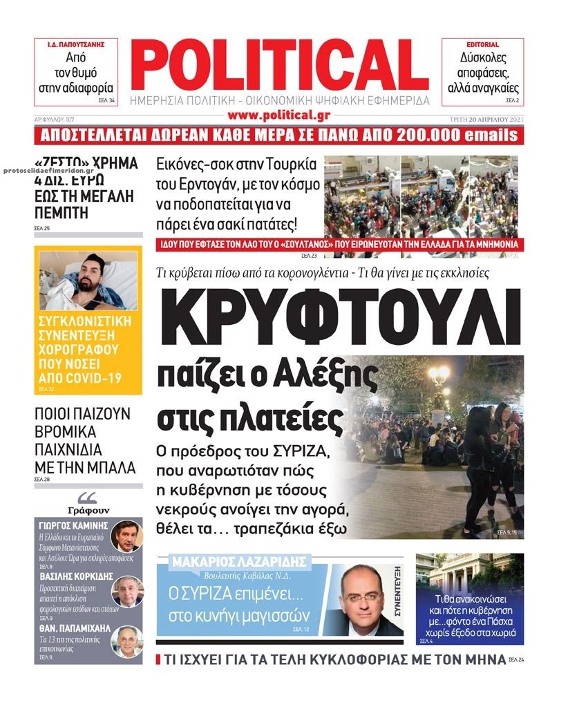 Οι πολιτικές εφημερίδες 20/4/2021 Σήφης Γαρυφαλάκης 06:32, Τρίτη 20 Απριλίου 2021 Media Διαβάστε τα πρωτοσέλιδα των πολιτικών εφημερίδων… ΕΦΗΜΕΡΙΔΕΣ ΠΟΛΙΤΙΚΕΣ ΕΦΗΜΕΡΙΔΕΣ ΠΡΩΤΟΣΕΛΙΔΑ ΠΡΩΤΟΣΕΛΙΔΑ ΕΦΗΜΕΡΙΔΩΝ Μοιράσου το: σχολίασε κι εσύ (0 σχόλια) Ακολουθήστε το enikos.gr στο Google News και μάθετε πρώτοι όλες τις ειδήσεις Δείτε όλες τις τελευταίες ειδήσεις από την Ελλάδα και τον Κόσμο στο enikos.gr Ειδήσεις Ροή Ειδήσεων 2 ώρες πριν Αυξάνουν την πίεση προς την κυβέρνηση οι αγρότες: Κλείνουν παρακαμπτήριους και ανοίγουν διόδια – Τι θα γίνει τις γιορτές 45 λεπτά πριν ΟΠΕΚΕΠΕ: Προφυλακιστέος ο φερόμενος αρχηγός και ο λογιστής της εγκληματικής οργάνωσης 2 ώρες πριν Φοινικούντα: Το Σάββατο απολογείται ο 30χρονος γιος γνωστού επιχειρηματία της Πλάκας που παραδόθηκε – Όσα είπε στους αστυνομικούς και ο ρόλος του στο έγκλημα 1 ώρα πριν Μπορεί ο Μαδούρο να αντέξει τον αποκλεισμό του Τραμπ; Τι θα χρειαστεί η Ουάσινγκτον για να τον ανατρέψει 3 ώρες πριν Πρίγκιπας Ουίλιαμ – Κέιτ: Η νέα οικογενειακή φωτογραφία για τις Χριστουγεννιάτικες κάρτες του 2025 3 ώρες πριν Ύπνος: Η απλή βραδινή ρουτίνα για να προστατεύσετε τα μαλλιά σας από το κρύο κατά τη διάρκεια του χειμώνα 4 ώρες πριν Manifesting: Πώς να συναντήσετε τον σύντροφο της ζωής σας, ανάλογα με τον μήνα γέννησής σας 2 ημέρες πριν 20 χρόνια τα Χριστούγεννα ξεκινούν στα Public με μεγάλη ποικιλία σε δώρα! 1 ώρα πριν Αρχαιολόγοι ανακάλυψαν ρωμαϊκά τεχνουργήματα από μια πόλη που δεν υπήρξε ποτέ – Τα τρία εντυπωσιακά κτίρια και ο αμφορέας με τις… σαρδέλες 25 λεπτά πριν ΑΕΚ – Κραϊόβα 3-2: Επική ανατροπή και πρόκριση στους «16» του Conference League η Ένωση 45 λεπτά πριν ΟΠΕΚΕΠΕ: Προφυλακιστέος ο φερόμενος αρχηγός και ο λογιστής της εγκληματικής οργάνωσης 56 λεπτά πριν Αθηνά Μαξίμου: Η τρυφερή ανάρτηση για τα γενέθλια του Αιμίλιου Χειλάκη – «Είναι η εκλεκτική συγγένειά μου, η επιλογή και η ευθύνη μου» 1 ώρα πριν Παναθηναϊκός – Χάποελ Τελ Αβίβ 93-82: Με… φόρα από την Κωνσταντινούπολη 1 ώρα πριν Μπορεί ο Μαδούρο να αντέξει τον αποκλεισμό του Τραμπ; Τι θα χρειαστεί η Ουάσινγκτον για να τον ανατρέψει ENIKOS NETWORK Σε περίοδο αυξημένης δραστηριότητας η γρίπη στην Ελλάδα-Μέτρα προστασίας από τον ΕΟΔΥ Σκέφτεστε συνέχεια συζητήσεις που έχετε κάνει; Τι σημαίνει αυτό, σύμφωνα με ειδικό Στεγαστικό: Τι λέει η ΠΟΜΙΔΑ για τα νέα μέτρα που ανακοίνωσε ο Κυριάκος Μητσοτάκης Λαγκάρντ: Αισιόδοξη για την ανάπτυξη της Ευρωζώνης, αβέβαιη για τον πληθωρισμό Χαρτογραφώντας το «σημείο χωρίς επιστροφή»: Για πρώτη φορά αποκαλύπτεται με λεπτομέρεια το ακανθώδες όριο της ατμόσφαιρας τ... Η Google καταργεί τη λειτουργία «dark web report» – Πώς θα μπορούν οι χρήστες να διαγράφουν τα δεδομένα τους περισσότερα 17:45 , Πέμπτη 18 Δεκεμβρίου 2025 ROUK ZOUK: Εορταστικό επεισόδιο με καλεσμένους τους πρωταγωνιστές του «Γιατί ρε πατέρα» Το Σάββατο 20 Δεκεμβρίου στις 21:00, η Ζέτα Μακρυπούλια υποδέχεται εκλεκτούς ηθοποιούς που όλο... 17:20 , Πέμπτη 18 Δεκεμβρίου 2025 Άγιος έρωτας: Η Χριστίνα εξομολογείται στον πατέρα Νικόλαο, απόψε στις 21:00 στον Alpha Η Νότα αποφασίζει να εκδικηθεί τον Πέτρο και τον Στέφανο, για χάρη του Λούη, όμως τα πράγματα ... 16:50 , Πέμπτη 18 Δεκεμβρίου 2025 Να μ’ αγαπάς: Ζωή και Φωτεινή συμφιλιώνονται ως μάνα με κόρη, απόψε στις 20:00 Η ταυτότητα του Άγγελου αποκαλύπτεται στο νέο επεισόδιο της σειράς “Να μ’ αγαπάς... 15:52 , Πέμπτη 18 Δεκεμβρίου 2025 Το Σπίτι Δίπλα Στο Ποτάμι: Το καθηλωτικό τελευταίο επεισόδιο για το 2025 απόψε 
