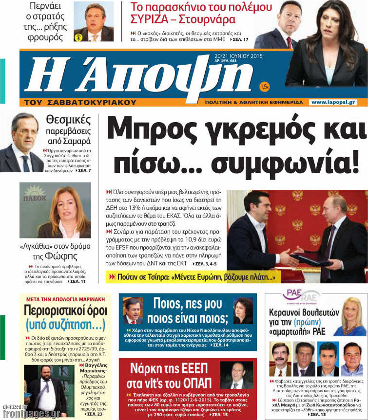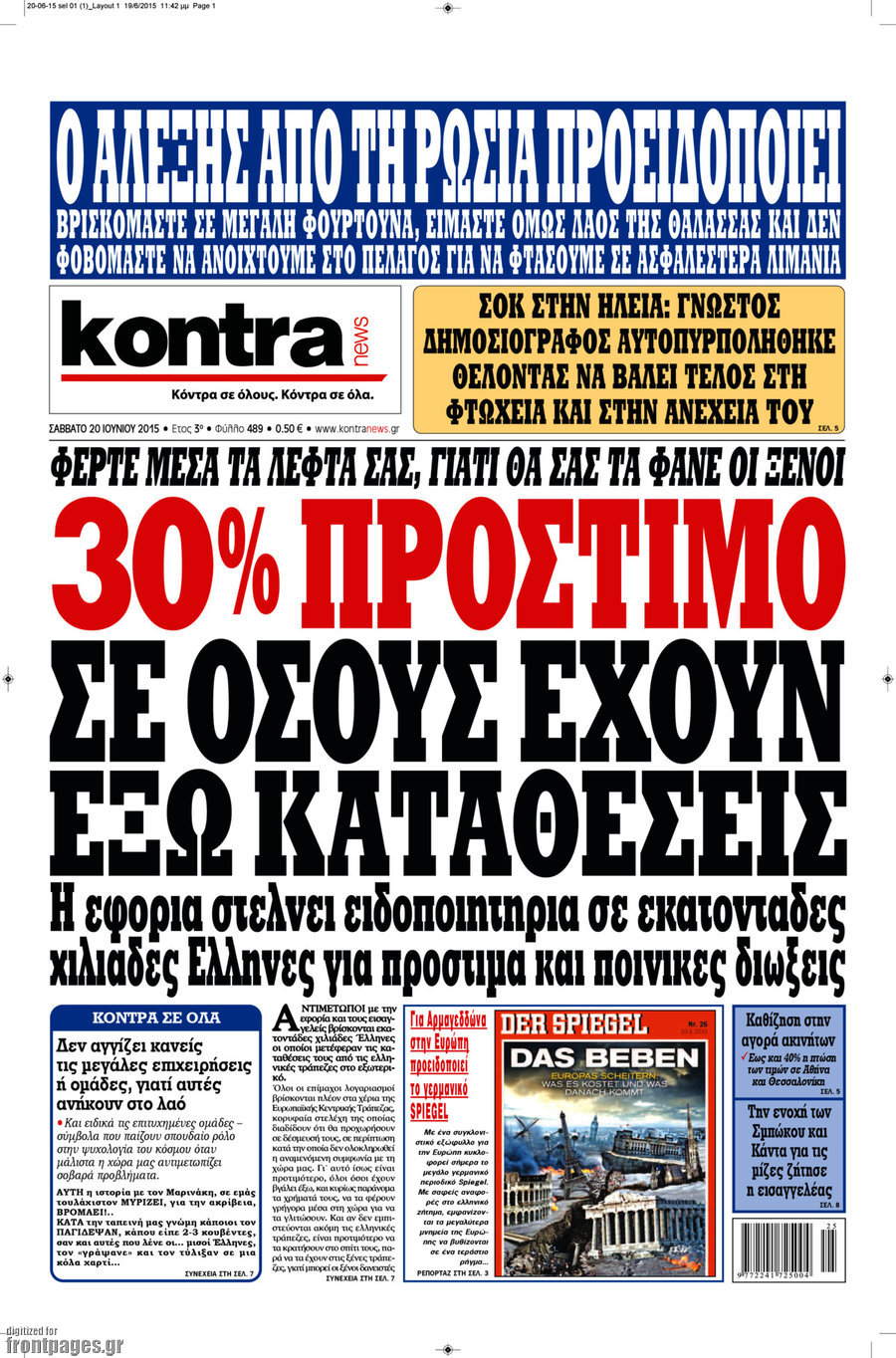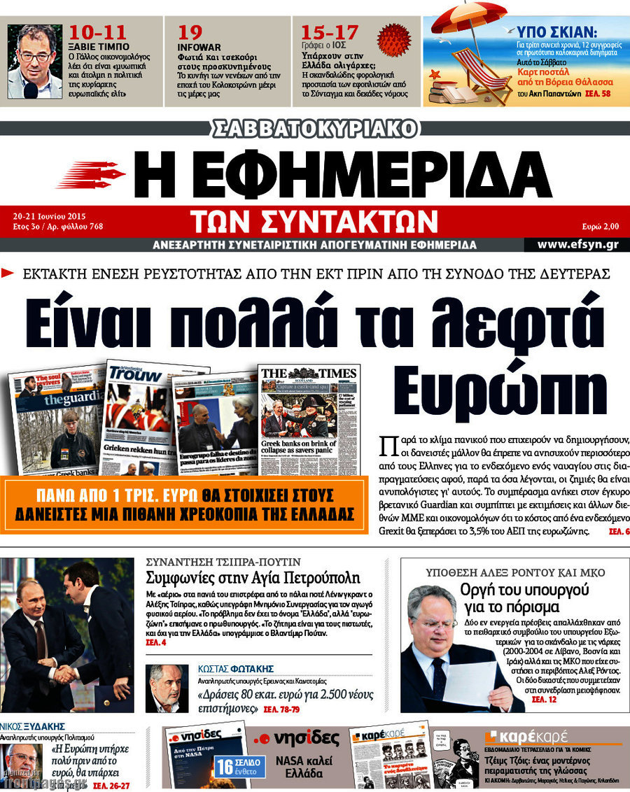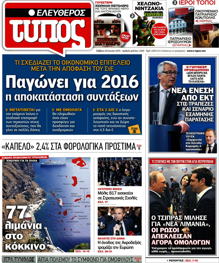 Οι πολιτικές εφημερίδες 20/6/2015 Enikos Newsroom 07:51, Σάββατο 20 Ιουνίου 2015 Media Διαβάστε τα σημερινά πρωτοσέλιδα των πολιτικών εφημερίδων. ΕΦΗΜΕΡΙΔΕΣ ΠΟΛΙΤΙΚΕΣ ΕΦΗΜΕΡΙΔΕΣ ΠΡΩΤΟΣΕΛΙΔΑ Μοιράσου το: σχολίασε κι εσύ (0 σχόλια) Ακολουθήστε το enikos.gr στο Google News και μάθετε πρώτοι όλες τις ειδήσεις Δείτε όλες τις τελευταίες ειδήσεις από την Ελλάδα και τον Κόσμο στο enikos.gr Ειδήσεις Ροή Ειδήσεων 8 ώρες πριν Χριστούγεννα στα μπλόκα: Επιμένουν στις κινητοποιήσεις τους οι αγρότες – Ανοίγουν τα διόδια το Σαββατοκύριακο 8 ώρες πριν Ουκρανία: Η άνευ προηγουμένου επίθεση σε ρωσικό τάνκερ στη Μεσόγειο και το μήνυμα προς στον Πούτιν – Το «μακρύ χέρι» του Κιέβου 8 ώρες πριν Πούτιν: Τα μηνύματα σε Ευρώπη και ΝΑΤΟ από το μαραθώνιο «σόου» του – Η απαίτηση για «σεβασμό» και η ειρήνη «με τους όρους» της Μόσχας 7 ώρες πριν ΗΠΑ: Η κυβέρνηση του Ντόναλντ Τραμπ άρχισε να δημοσιοποιεί τα αρχεία Έπσταϊν 7 ώρες πριν Άνω Λιόσια: Πυροβολισμοί σε επιχείρηση με χαλιά – Εντοπίστηκαν 10 κάλυκες 33 λεπτά πριν Αυγά: Πόσα μπορείτε να τρώτε την ημέρα με ασφάλεια για μέγιστη πρόσληψη πρωτεΐνης 1 ώρα πριν Τα ζώδια σήμερα, Σάββατο 20 Δεκεμβρίου: Παρθένοι, το σύμπαν σας δίνει το κλειδί 8 ώρες πριν Ανακαλύφθηκαν αρχαία χρυσά νομίσματα 2.200 ετών που απεικονίζουν τον θεό Απόλλωνα – Η άγνωστη σύνδεση με τον Φίλιππο Β΄ της Μακεδονίας 9 ώρες πριν Ύπνος: Μια κρυφή κατάσταση του εγκεφάλου πριν από τον ύπνο μπορεί να είναι το “κλειδί” για υψηλή ευφυΐα και δημιουργικότητα 9 λεπτά πριν Κολομβία: Είκοσι χρόνια κάθειρξη σε πρώην ανώτερο αξιωματικό για 72 εκτελέσεις αμάχων 17 λεπτά πριν Οπτική ψευδαίσθηση: Μόνο αν είσαι ο Σέρλοκ Χολμς θα βρεις τον αριθμό «87» σε 7 δευτερόλεπτα 24 λεπτά πριν Σαρωτικοί οι έλεγχοι στους δρόμους ενόψει εορτών – Μπλόκα της τροχαίας σε κεντρικές αρτηρίες της Αττικής 33 λεπτά πριν Αυγά: Πόσα μπορείτε να τρώτε την ημέρα με ασφάλεια για μέγιστη πρόσληψη πρωτεΐνης 39 λεπτά πριν Σαν σήμερα 20 Δεκεμβρίου: Τα σημαντικότερα γεγονότα της ημέρας ENIKOS NETWORK Το ΕΚΑΒ τιμήθηκε από την Ακαδημία Αθηνών για τα 40 χρόνια προσφοράς του Έχετε πραγματικά μεγάλη καρδιά; 10 χαρακτηριστικά όσων έχουν καλοσύνη Αναστολή μέτρων αναγκαστικής εκτέλεσης για κτηνοτρόφους που πλήττονται από την ευλογιά των αιγοπροβάτων Πλήρης επάρκεια προϊόντων στις λαϊκές της Αττικής, παρά τις αγροτικές κινητοποιήσεις – Τι απαντούν οι πωλητές Χαρτογραφώντας το «σημείο χωρίς επιστροφή»: Για πρώτη φορά αποκαλύπτεται με λεπτομέρεια το ακανθώδες όριο της ατμόσφαιρας τ... Η Google καταργεί τη λειτουργία «dark web report» – Πώς θα μπορούν οι χρήστες να διαγράφουν τα δεδομένα τους περισσότερα 05:48 , Σάββατο 20 Δεκεμβρίου 2025 Οι οικονομικές εφημερίδες 20/12/2025 Διαβάστε τα πρωτοσέλιδα από τις οικονομικές εφημερίδες, σήμερα 20/12/2025. 05:43 , Σάββατο 20 Δεκεμβρίου 2025 Οι αθλητικές εφημερίδες 20/12/2025 Διαβάστε τα πρωτοσέλιδα από τις αθλητικές εφημερίδες, σήμερα 20/12/2025. 05:38 , Σάββατο 20 Δεκεμβρίου 2025 Οι πολιτικές εφημερίδες 20/12/2025 Διαβάστε τα πρωτοσέλιδα από τις πολιτικές εφημερίδες, σήμερα 20/12/2025. 04:20 , Σάββατο 20 Δεκεμβρίου 2025 Αγγελική Νικολούλη: Τα συλλυπητήρια για την απώλεια της Ειρήνης Μαρινάκη Τα συλληπητήρια στον πρόεδρο του Mega, τον Βαγγέλη Μαρινάκη, για την απώλεια της μητέρας του Ε... ΤΕΛΕΥΤΑΙΕΣ ΕΙΔΗΣΕΙΣ 9 λεπτά πριν Κολομβία: Είκοσι χρόνια κάθειρξη σε πρώην ανώτερο... 17 λεπτά πριν Οπτική ψευδαίσθηση: Μόνο αν είσαι ο Σέρλοκ Χολμς θα... 24 λεπτά πριν Σαρωτικοί οι έλεγχοι στου