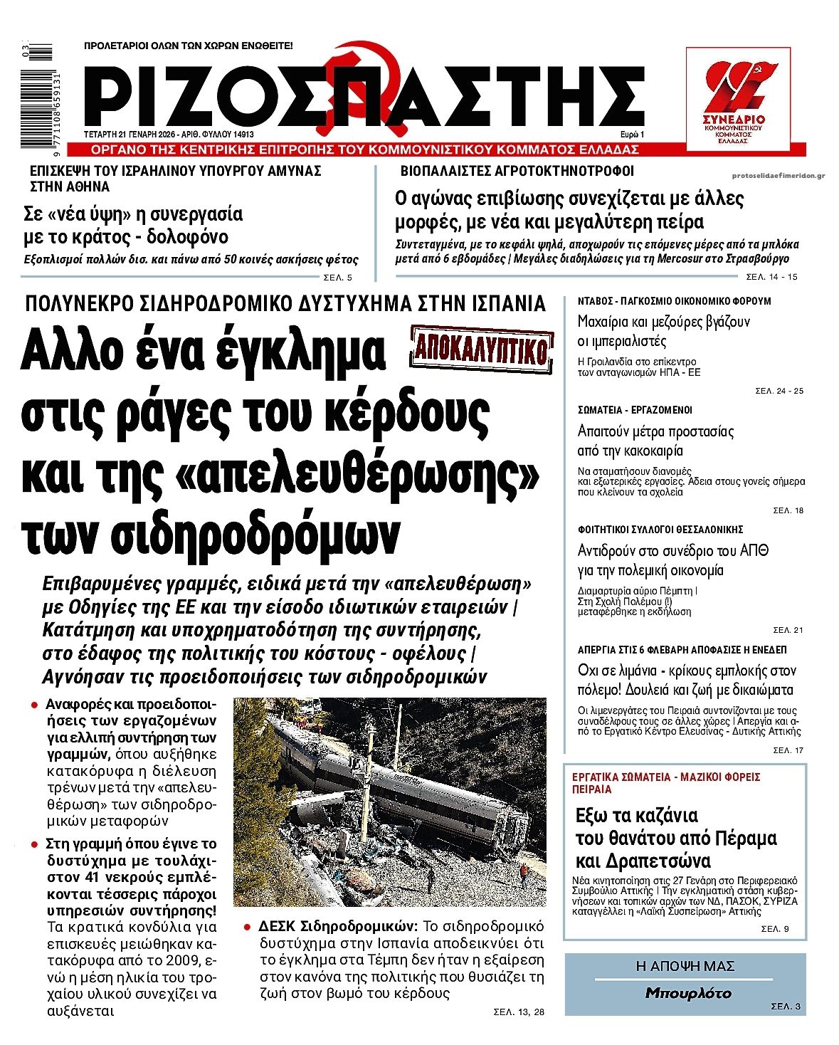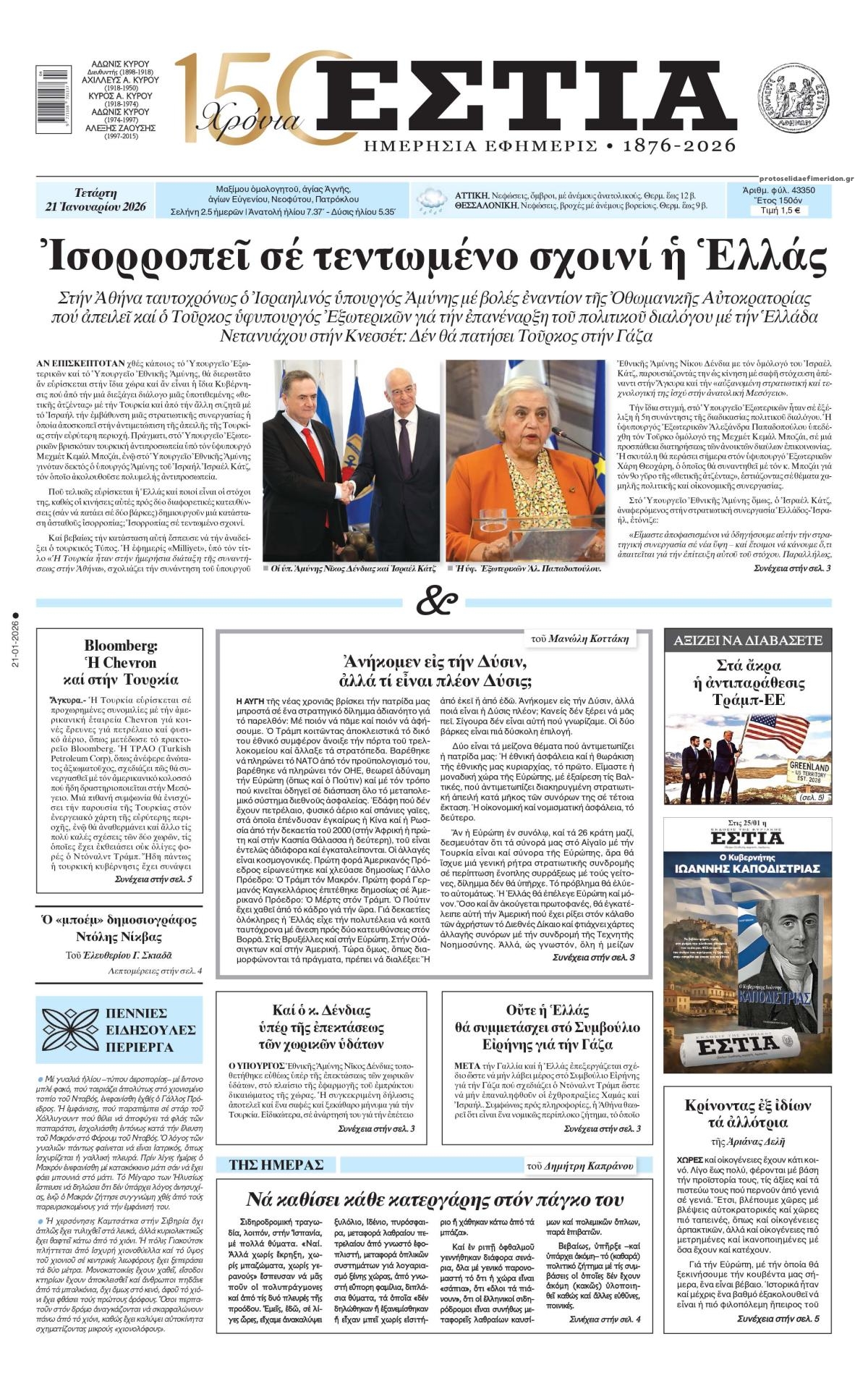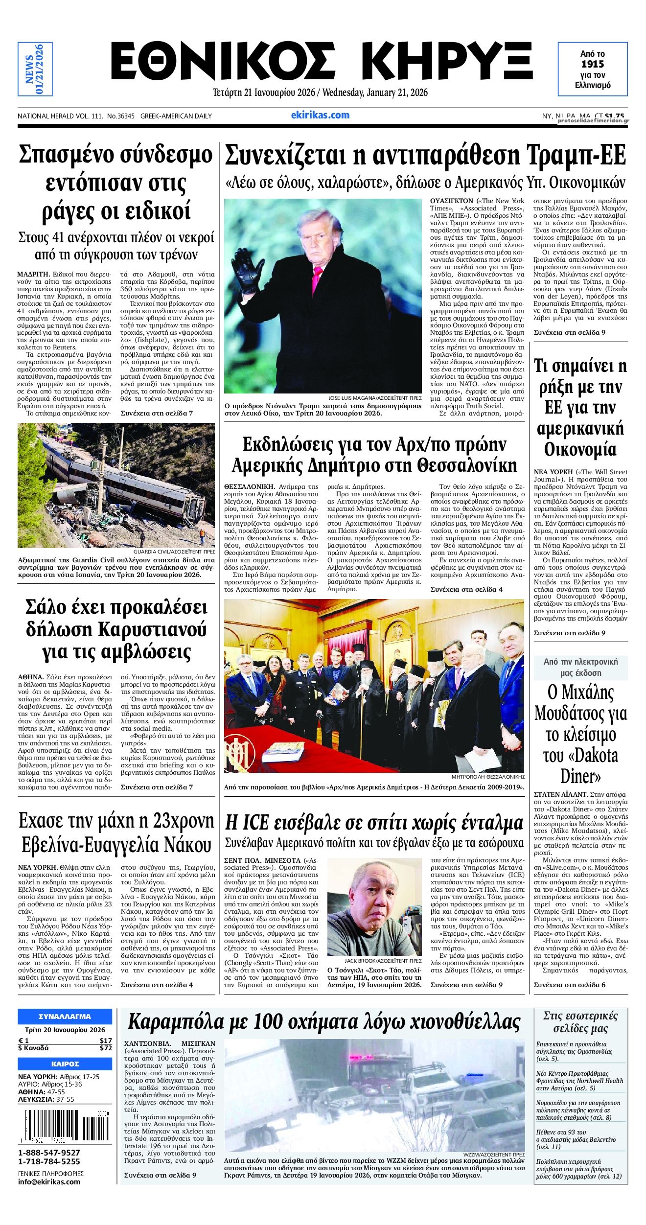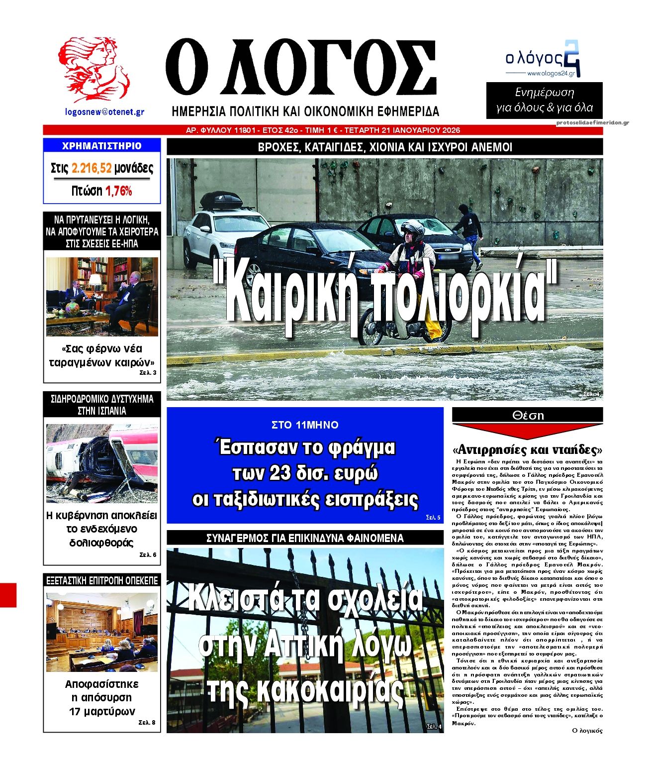 Οι πολιτικές εφημερίδες 21/1/2026 Enikos Newsroom 05:38, Τετάρτη 21 Ιανουαρίου 2026 Media Διαβάστε τα πρωτοσέλιδα από τις πολιτικές εφημερίδες, σήμερα 21/1/2026. ΕΦΗΜΕΡΙΔΕΣ ΠΟΛΙΤΙΚΕΣ ΕΦΗΜΕΡΙΔΕΣ ΠΡΩΤΟΣΕΛΙΔA Μοιράσου το: Δύο νέοι εκτροχιασμοί τρένων μέσα σε λίγες ώρες στην Καταλονία – Έπεσε τοίχος λόγω της κακοκαιρίας – Νεκρός ο οδηγός – 37 τραυματίες, 5 σοβαρά Κακοκαιρία: Φαινόμενα ακραίας επικινδυνότητας και «κόκκινος» συναγερμός σε 5 περιφέρειες την Τετάρτη – Έκτακτα μέτρα, κλειστά σχολεία και φόβοι για πλημμύρες Νταβός: Εκπρόσωπος του Πούτιν είχε «καταλυτικές» συνομιλίες με Αμερικανούς αξιωματούχους για τον τερματισμό του πολέμου στην Ουκρανία σχολίασε κι εσύ (0 σχόλια) Ακολουθήστε το enikos.gr στο Google News και μάθετε πρώτοι όλες τις ειδήσεις Δείτε όλες τις τελευταίες ειδήσεις από την Ελλάδα και τον Κόσμο στο enikos.gr Ειδήσεις Ροή Ειδήσεων 8 ώρες πριν Κακοκαιρία: Φαινόμενα ακραίας επικινδυνότητας και «κόκκινος» συναγερμός σε 5 περιφέρειες την Τετάρτη – Έκτακτα μέτρα, κλειστά σχολεία και φόβοι για πλημμύρες 6 ώρες πριν Δύο νέοι εκτροχιασμοί τρένων μέσα σε λίγες ώρες στην Καταλονία – Έπεσε τοίχος λόγω της κακοκαιρίας – Νεκρός ο οδηγός – 37 τραυματίες, 5 σοβαρά 8 ώρες πριν ΠΑΣΟΚ: Τα μηνύματα Ανδρουλάκη και οι έντονοι διάλογοι με Δούκα και Γερουλάνο – Το παρασκήνιο και όσα έγιναν στην Πολιτική Γραμματεία της ΚΟΕΣ 8 ώρες πριν Αγρίνιο: «O 50χρονος προκαλούσε και απειλούσε τον δράστη» κατέθεσε η σύζυγος του θύματος – Η φυγάδευσή της μετά την κηδεία και τα ενδεχόμενα που εξετάζουν οι Αρχές 7 ώρες πριν New York Times: Το πρώτο έτος της προεδρίας Τραμπ θα μπορούσε να έχει μακροχρόνιες οικονομικές συνέπειες – Αργούν να φανούν, αλλά σαρώνουν 53 λεπτά πριν Τριχόπτωση: 5 τροφές που προκαλούν σταδιακά απώλεια μαλλιών χωρίς να το γνωρίζετε 4 ώρες πριν Τα ζώδια σήμερα, Τετάρτη 21 Ιανουαρίου 2026: Λέοντες, μία νέα γνωριμία θα κάνει την καρδιά σας να χτυπά δυνατά 8 ώρες πριν Επιστήμονες αποκρυπτογράφησαν κείμενα σε αρχαίες πινακίδες 1.800 ετών – Τις είχαν ρίξει σε πηγάδι για να κρατήσουν τα μυστικά τους κρυμμένα για πάντα 10 ώρες πριν Αριθμολογία: Οι ημερομηνίες γέννησης που έχουν την μεγαλύτερη εύνοια του σύμπαντος 18 λεπτά πριν ΔΕΔΔΗΕ: Διακοπές ρεύματος σήμερα (21/1) στην Αθήνα και σε άλλες 12 περιοχές της Αττικής 30 λεπτά πριν Ο Ντόναλντ Τραμπ που κατευθυνόταν στο Νταβός επιστρέφει στη βάση Άντριους λόγω τεχνικού προβλήματος στο Air Force One 38 λεπτά πριν Οπτική ψευδαίσθηση: Μόνο αν έχετε παρατηρητικότητα ντετέκτιβ, θα εντοπίσετε τα 3 πρόσωπα στην εικόνα σε 14 δευτερόλεπτα 53 λεπτά πριν Τριχόπτωση: 5 τροφές που προκαλούν σταδιακά απώλεια μαλλιών χωρίς να το γνωρίζετε 60 λεπτά πριν Σαν σήμερα 21 Ιανουαρίου: Τα σημαντικότερα γεγονότα της ημέρας ENIKOS NETWORK Νιώθετε κουρασμένοι αλλά δεν σας παίρνει ο ύπνος – 4 μυστικά που θα σας βοηθήσουν, σύμφωνα με νευρολόγο ΕΙΝΑΠ: Έντονη αντίδραση για την αναδιάταξη του νοσοκομειακού χάρτη στη Δυτική Αττική Άνοδος 0,7% στον κύκλο εργασιών της ελληνικής βιομηχανίας τον Νοέμβριο – Τα στοιχεία της ΕΛΣΤΑΤ ΑΠΔ: Επιστολή της ΠΟΦΕΕ προς Κεραμέως και διοικητή του e-ΕΦΚΑ-Τι αναφέρει Ο Google Assistant θα παραμείνει λίγο περισσότερο για ορισμένους χρήστες Android Τεστ προσωπικότητας: Το βάζο που θα επιλέξετε αποκαλύπτει πώς λύνετε προβλήματα στη ζωή σας περισσότερα 22:44 , Τρίτη 20 Ιανουαρίου 2026 Μπαμπά σ’ αγαπώ: Ο Μιχάλης Βαλάσογλου αποκαλύπτει για τον ρόλο του στη σειρά Τα «Τρία Μπαμπαδάκια», ο Νί