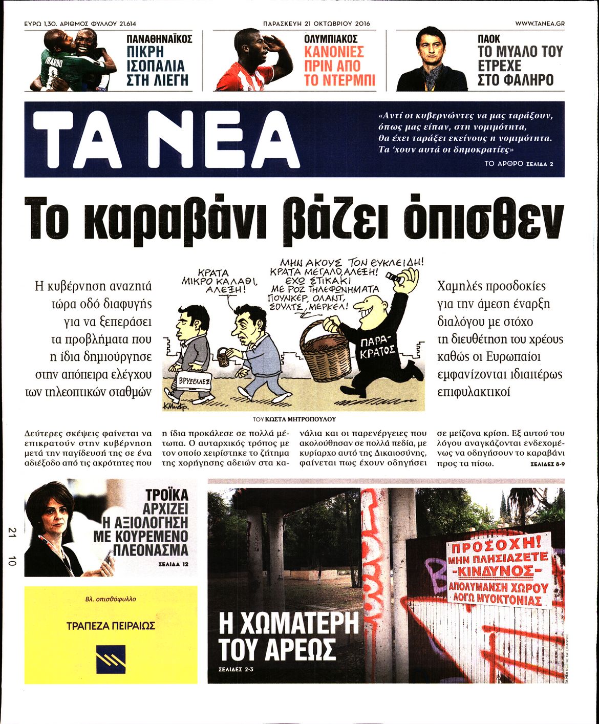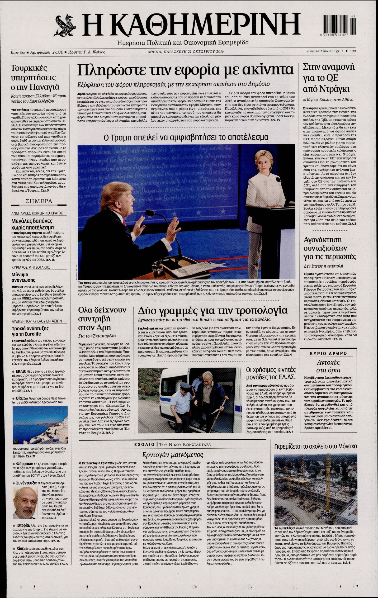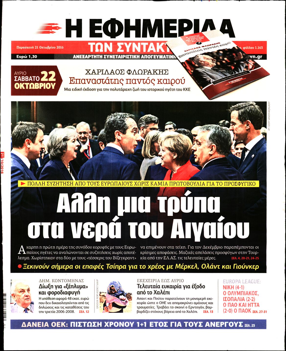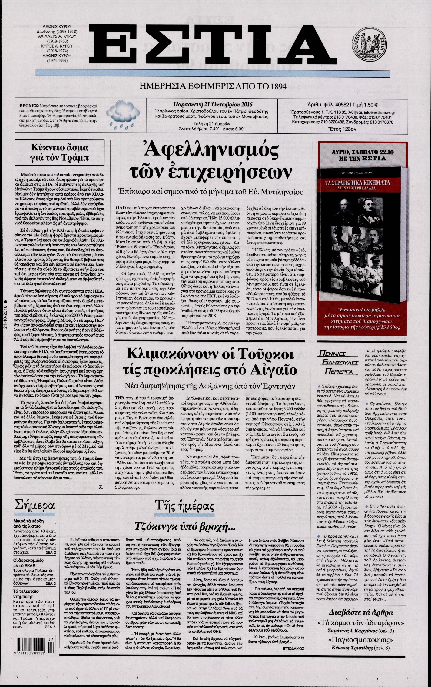 Οι πολιτικές εφημερίδες 21-10-2016 Enikos Newsroom 05:15, Παρασκευή 21 Οκτωβρίου 2016 Media Διαβάστε τα σημερινά πρωτοσέλιδα των πολιτικών εφημερίδων: ΠΟΛΙΤΙΚΕΣ ΕΦΗΜΕΡΙΔΕΣ ΠΡΩΤΟΣΕΛΙΔΑ Μοιράσου το: σχολίασε κι εσύ (0 σχόλια) Ακολουθήστε το enikos.gr στο Google News και μάθετε πρώτοι όλες τις ειδήσεις Δείτε όλες τις τελευταίες ειδήσεις από την Ελλάδα και τον Κόσμο στο enikos.gr Ειδήσεις Ροή Ειδήσεων 6 ώρες πριν Χριστούγεννα στα μπλόκα: Επιμένουν στις κινητοποιήσεις τους οι αγρότες – Ανοίγουν τα διόδια το Σαββατοκύριακο 7 ώρες πριν Ουκρανία: Η άνευ προηγουμένου επίθεση σε ρωσικό τάνκερ στη Μεσόγειο και το μήνυμα προς στον Πούτιν – Το «μακρύ χέρι» του Κιέβου 6 ώρες πριν Πούτιν: Τα μηνύματα σε Ευρώπη και ΝΑΤΟ από το μαραθώνιο «σόου» του – Η απαίτηση για «σεβασμό» και η ειρήνη «με τους όρους» της Μόσχας 7 ώρες πριν Τραμπ: Δεν αποκλείει την πιθανότητα ενός πολέμου στη Βενεζουέλα – «Ο Μαδούρο ξέρει καλύτερα από τον καθένα τι ακριβώς θέλω» 7 ώρες πριν Συνεχίζει να προκαλεί ο Μίτσκοσκι: «Για μένα το όνομα Μακεδονία είναι ιερό» 6 ώρες πριν Ανακαλύφθηκαν αρχαία χρυσά νομίσματα 2.200 ετών που απεικονίζουν τον θεό Απόλλωνα – Η άγνωστη σύνδεση με τον Φίλιππο Β΄ της Μακεδονίας 7 ώρες πριν Ύπνος: Μια κρυφή κατάσταση του εγκεφάλου πριν από τον ύπνο μπορεί να είναι το “κλειδί” για υψηλή ευφυΐα και δημιουργικότητα 8 ώρες πριν Αριθμολογία: Οι άνθρωποι που έχουν γεννηθεί αυτές τις 4 ημερομηνίες, συχνά παρεξηγούνται – «Η καλοσύνη τους κρύβει τεράστια δύναμη» 9 ώρες πριν Ξεχάστε το καθάρισμα το Σαββατοκύριακο: Ο «κανόνας των 20 λεπτών» που θα σας λύσει τα χέρια 22 λεπτά πριν Μάρκο Ρούμπιο: Ανθρωπιστική κατάπαυση του πυρός στο Σουδάν ζητά ο Αμερικανός υπουργός Εξωτερικών 36 λεπτά πριν Αγγελική Νικολούλη: Τα συλλυπητήρια για την απώλεια της Ειρήνης Μαρινάκη 51 λεπτά πριν Βολιβία: Μαζική διαδηλώσεις εναντίον της κατάργησης των επιδοτήσεων των τιμών των καυσίμων 1 ώρα πριν Φως στο Τούνελ: Έφτασε η ώρα της αλήθειας για την δολοφονία της χήρας του πρώην υπουργού στο Κολωνάκι 1 ώρα πριν Ντόναλντ Τραμπ: Προστέθηκε το όνομά του στην πρόσοψη του Κέντρου Κένεντι – Οργισμένη αντίδραση των συγγενών του JFK ENIKOS NETWORK Το ΕΚΑΒ τιμήθηκε από την Ακαδημία Αθηνών για τα 40 χρόνια προσφοράς του Έχετε πραγματικά μεγάλη καρδιά; 10 χαρακτηριστικά όσων έχουν καλοσύνη Αναστολή μέτρων αναγκαστικής εκτέλεσης για κτηνοτρόφους που πλήττονται από την ευλογιά των αιγοπροβάτων Πλήρης επάρκεια προϊόντων στις λαϊκές της Αττικής, παρά τις αγροτικές κινητοποιήσεις – Τι απαντούν οι πωλητές Χαρτογραφώντας το «σημείο χωρίς επιστροφή»: Για πρώτη φορά αποκαλύπτεται με λεπτομέρεια το ακανθώδες όριο της ατμόσφαιρας τ... Η Google καταργεί τη λειτουργία «dark web report» – Πώς θα μπορούν οι χρήστες να διαγράφουν τα δεδομένα τους περισσότερα 04:20 , Σάββατο 20 Δεκεμβρίου 2025 Αγγελική Νικολούλη: Τα συλλυπητήρια για την απώλεια της Ειρήνης Μαρινάκη Τα συλληπητήρια στον πρόεδρο του Mega, τον Βαγγέλη Μαρινάκη, για την απώλεια της μητέρας του Ε... 02:50 , Σάββατο 20 Δεκεμβρίου 2025 GNTM: Η Ξένια Τσίρκοβα αναδείχθηκε μεγάλη νικήτρια και πήρε τις 50.000 ευρώ – Ποιος βρέθηκε σε απόσταση αναπνοής; Με φαντασμαγορικό τρόπο ολοκληρώθηκε το βράδυ της Παρασκευής ο μεγάλος τελικός του GNTM, μέσα ... 22:42 , Παρασκευή 19 Δεκεμβρίου 2025 Γιώργος Γιαννόπουλος για “Το σόι σου”: “Είναι ευτυχία και ευλογία αυτή η σειρά” «Είναι ευτυχία και ευλογία η συγκυρία αυτής της σειράς», θα πει ο Γιώργος Γ