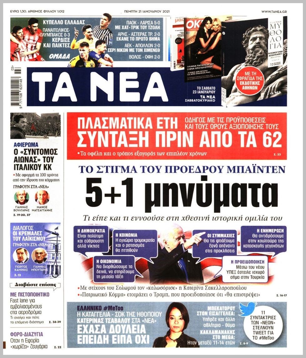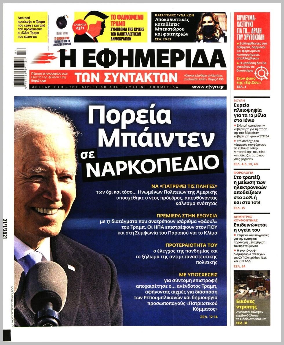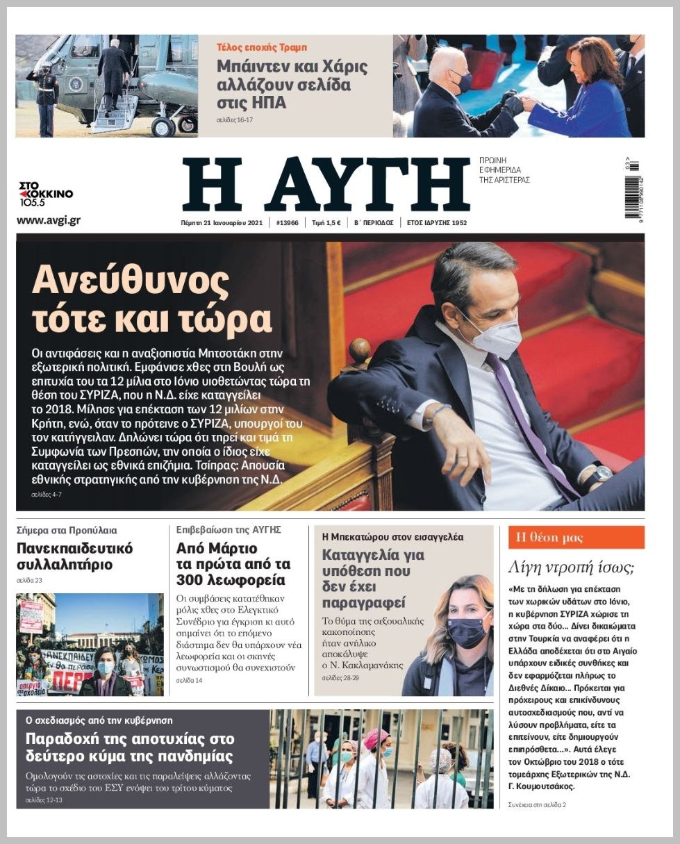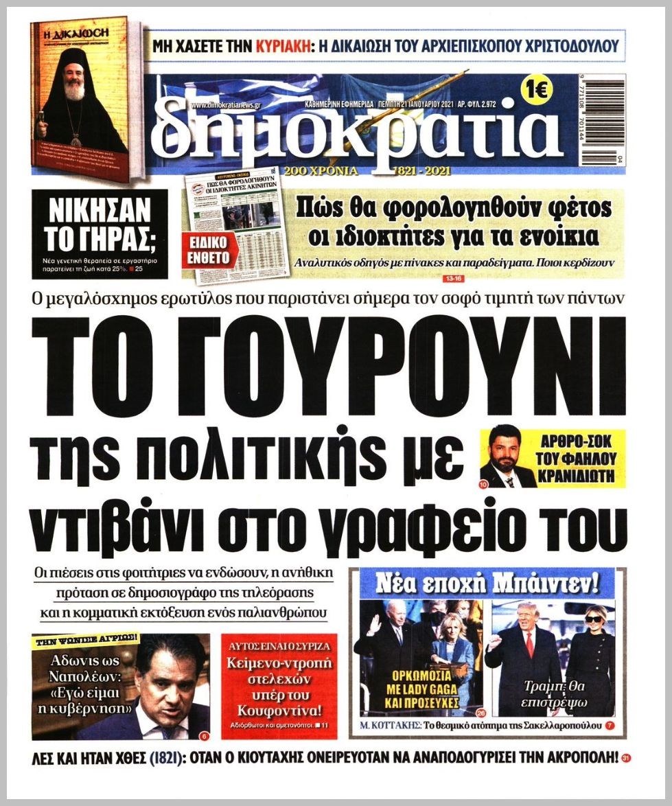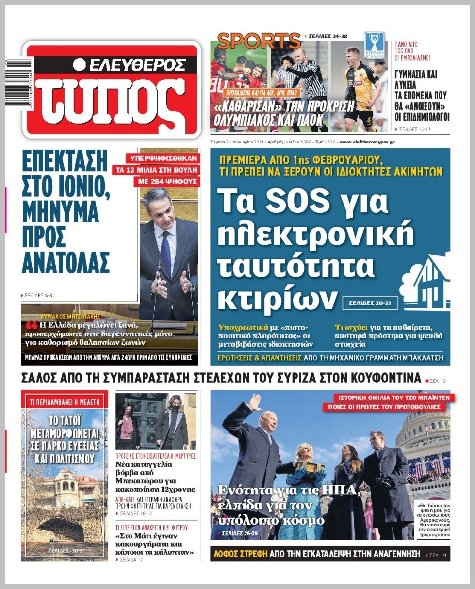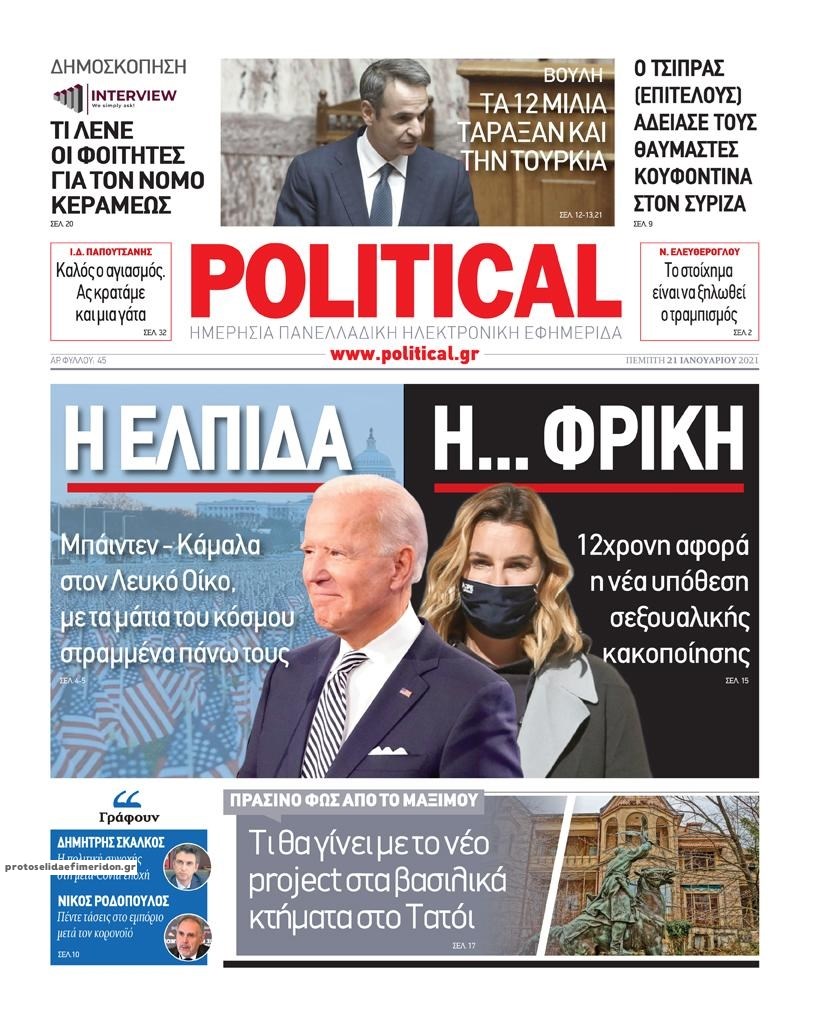 Οι πολιτικές εφημερίδες 21/1/2021 Διονύσης Νίκκας 06:12, Πέμπτη 21 Ιανουαρίου 2021 Media Διαβάστε τα πρωτοσέλιδα των πολιτικών εφημερίδων… ΕΦΗΜΕΡΙΔΕΣ ΠΟΛΙΤΙΚΕΣ ΕΦΗΜΕΡΙΔΕΣ ΠΡΩΤΟΣΕΛΙΔΑ Μοιράσου το: σχολίασε κι εσύ (0 σχόλια) Ακολουθήστε το enikos.gr στο Google News και μάθετε πρώτοι όλες τις ειδήσεις Δείτε όλες τις τελευταίες ειδήσεις από την Ελλάδα και τον Κόσμο στο enikos.gr Ειδήσεις Ροή Ειδήσεων 3 ώρες πριν Υπόθεση Έπσταϊν: Το Υπουργείο Δικαιοσύνης δημοσιοποίησε μια σειρά από εξαιρετικά επεξεργασμένα αρχεία – «Λείπουν τα πιο σημαντικά έγγραφα», λένε οι Δημοκρατικοί 22 λεπτά πριν Γιορτές με μπλόκα για τους αγρότες: Ανοίγουν διόδια και μοιράζουν προϊόντα στους ταξιδιώτες 55 λεπτά πριν Εξαφάνιση 33χρονου γιατρού στην Κρήτη: «Άναψα τα φώτα, τρόμαξε και άρχισε να τρέχει στα χωράφια» – Η τελευταία διαδρομή και η μαρτυρία «κλειδί» 2 ώρες πριν Ο «χάρτης» με τις αυξήσεις και τις φοροελαφρύνσεις του 2026 – Ποιοι και πόσα κερδίζουν 38 λεπτά πριν Τα αρχεία του Έπσταϊν αποκαλύπτουν φωτογραφία του έκπτωτου πρίγκιπα Άντριου – Είναι ξαπλωμένος στην αγκαλιά 5 γυναικών 45 λεπτά πριν Μία νέα «χρυσή» περίοδος αρχίζει για 3 ζώδια από σήμερα – «Μία αναπάντεχη ευκαιρία οδηγεί στην επιτυχία» 5 ώρες πριν Αυγά: Πόσα μπορείτε να τρώτε την ημέρα με ασφάλεια για μέγιστη πρόσληψη πρωτεΐνης 3 ώρες πριν Αρχαιολόγοι ανακάλυψαν σε χωράφι απεικόνιση 600 ετών ενός Αγίου – Τα στοιχεία που δείχνουν ότι μαρτύρησε 2 ώρες πριν Αγχώνεται για το χριστουγεννιάτικο δώρο που πήρε στην πλούσια σύντροφό του – «Φοβάμαι πως θα το βρει φθηνιάρικο, φοράει βραχιόλια Cartier» 6 λεπτά πριν Πώς η κλιματική αλλαγή επηρεάζει εγκύους και βρέφη – Οι επιπτώσεις των υψηλών θερμοκρασιών 14 λεπτά πριν e-ΕΦΚΑ και ΔΥΠΑ: Οι πληρωμές από 22 έως 24 Δεκεμβρίου – Ποιοι θα δουν χρήματα στους λογαριασμούς τους 22 λεπτά πριν Συνελήφθη οδηγός μηχανής που έτρεχε με 161 χλμ στη Συγγρού – Τον έπιασε το ραντάρ της Τροχαίας 22 λεπτά πριν Γιορτές με μπλόκα για τους αγρότες: Ανοίγουν διόδια και μοιράζουν προϊόντα στους ταξιδιώτες 30 λεπτά πριν Τηλεθέαση (19/12): Κυριάρχησε η σειρά «Το σόι σου» – Τι νούμερα έκανε ο τελικός του GNTM ENIKOS NETWORK Είστε μόνιμα απρόσεκτοι; 3 σημάδια που δείχνουν ότι μπορεί να είναι σύμπτωμα πάθησης Πόσα κιλά παίρνουμε πραγματικά τα Χριστούγεννα, σύμφωνα με την επιστήμη – Πώς να το αποτρέψουμε; Επίδομα παιδιού: Τι αλλάζει από το 2026 – Το όφελος από τις φορολογικές ελαφρύνσεις Mega χριστουγεννιάτικη φορολοταρία: «Κλείδωσε» η ημερομηνία για την κλήρωση – Ερωτήσεις και απαντήσεις Χαρτογραφώντας το «σημείο χωρίς επιστροφή»: Για πρώτη φορά αποκαλύπτεται με λεπτομέρεια το ακανθώδες όριο της ατμόσφαιρας τ... Η Google καταργεί τη λειτουργία «dark web report» – Πώς θα μπορούν οι χρήστες να διαγράφουν τα δεδομένα τους περισσότερα 09:30 , Σάββατο 20 Δεκεμβρίου 2025 «Porto Leone: Στη γειτονιά με τα κόκκινα φανάρια» – Ο Χρόνης αποκαλύπτει στην Αλεξάνδρα το μυστικό για το παιδί της Λένας Η μεγάλη δραματική σειρά του Apha «Porto Leone: Στη γειτονιά με τα κόκκινα φανάρια» μας μεταφέ... 08:14 , Σάββατο 20 Δεκεμβρίου 2025 Τρομεροί γονείς: Η Μαρία Καβογιάννη εισβάλλει στο σπίτι της οικογένειας Στεφανίδη Όσα θα δούμε στο νέο διπλό επεισόδιο της σειράς «Τρομεροί γονείς», σήμερα Σάββατο 20 Δεκεμβρίο... 05:48 , Σάββατο 20 Δεκεμβρίου 2025 Οι οικονομικές εφημερίδες 20/12/2025 Διαβάστε τα πρωτοσέλιδα από τις οικονομικές εφημερίδες, σήμερα 20/12/2025. 05:43 , Σάββατο 20 Δεκεμβρίου 2025 Οι αθλητικές εφημερίδες 20/12