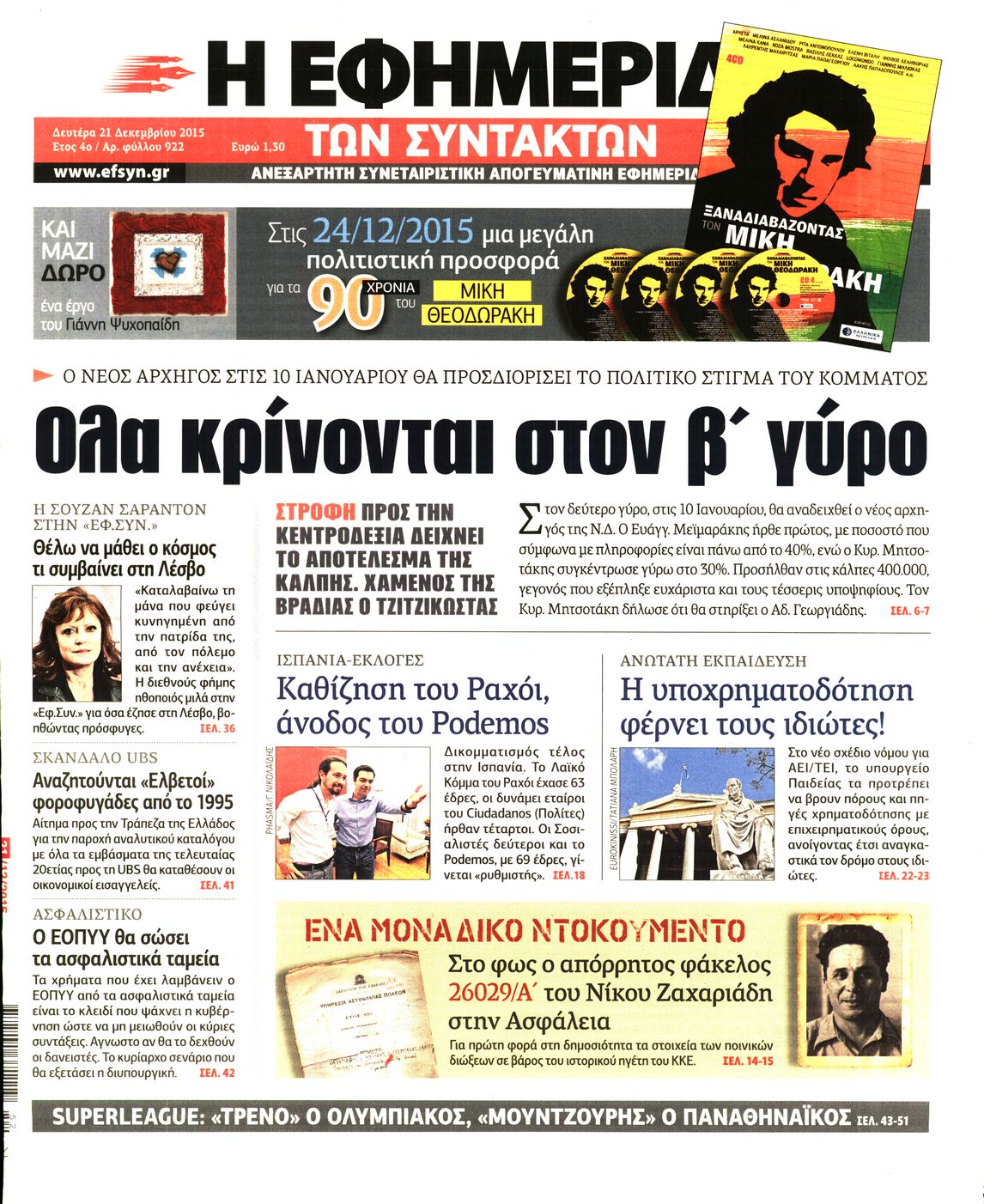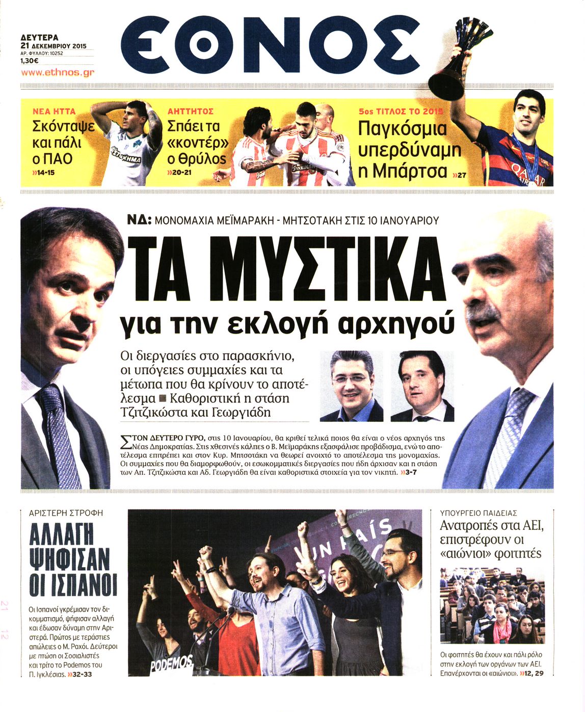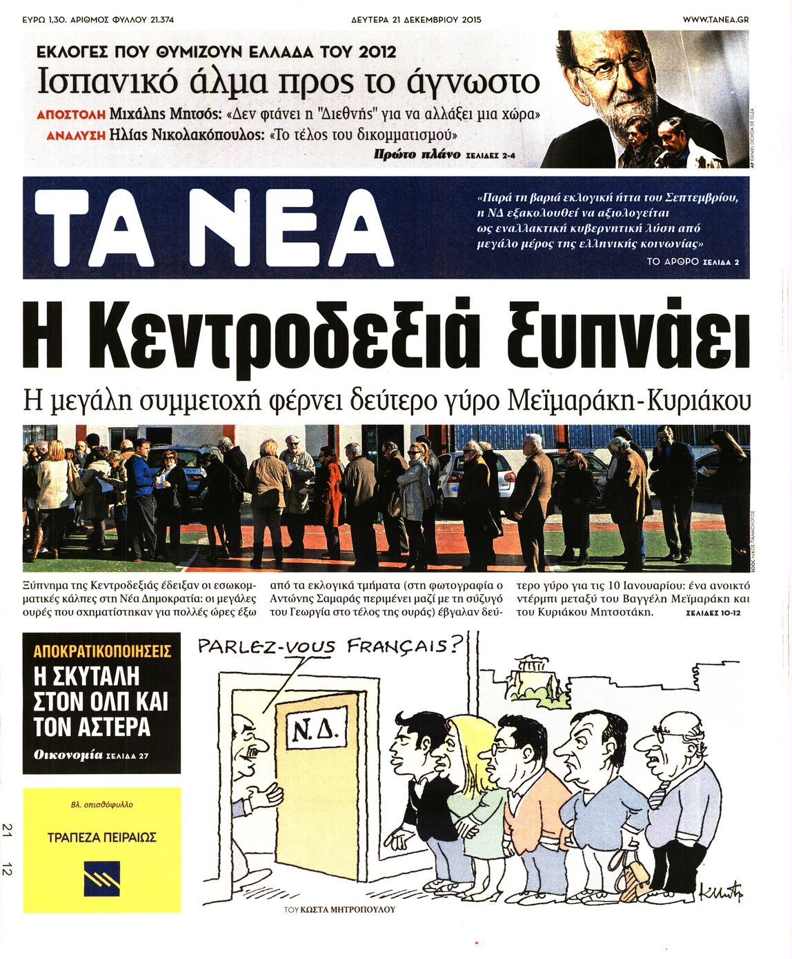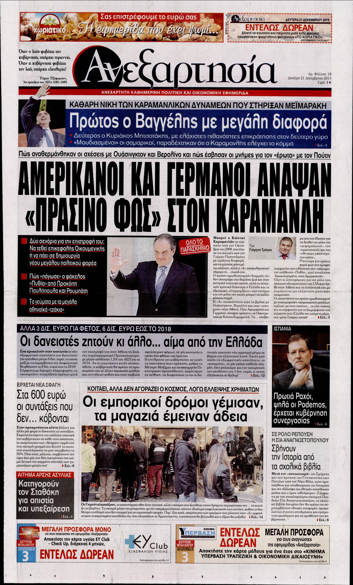 Οι πολιτικές εφημερίδες 21/12/2015 Enikos Newsroom 06:37, Δευτέρα 21 Δεκεμβρίου 2015 Media Διαβάστε τα σημερινά πρωτοσέλιδα των πολιτικών εφημερίδων. ΕΦΗΜΕΡΙΔΕΣ ΠΟΛΙΤΙΚΕΣ ΕΦΗΜΕΡΙΔΕΣ Μοιράσου το: σχολίασε κι εσύ (0 σχόλια) Ακολουθήστε το enikos.gr στο Google News και μάθετε πρώτοι όλες τις ειδήσεις Δείτε όλες τις τελευταίες ειδήσεις από την Ελλάδα και τον Κόσμο στο enikos.gr Ειδήσεις Ροή Ειδήσεων 6 ώρες πριν Χριστούγεννα στα μπλόκα: Επιμένουν στις κινητοποιήσεις τους οι αγρότες – Ανοίγουν τα διόδια το Σαββατοκύριακο 6 ώρες πριν Ουκρανία: Η άνευ προηγουμένου επίθεση σε ρωσικό τάνκερ στη Μεσόγειο και το μήνυμα προς στον Πούτιν – Το «μακρύ χέρι» του Κιέβου 5 ώρες πριν Πούτιν: Τα μηνύματα σε Ευρώπη και ΝΑΤΟ από το μαραθώνιο «σόου» του – Η απαίτηση για «σεβασμό» και η ειρήνη «με τους όρους» της Μόσχας 6 ώρες πριν Τραμπ: Δεν αποκλείει την πιθανότητα ενός πολέμου στη Βενεζουέλα – «Ο Μαδούρο ξέρει καλύτερα από τον καθένα τι ακριβώς θέλω» 7 ώρες πριν Συνεχίζει να προκαλεί ο Μίτσκοσκι: «Για μένα το όνομα Μακεδονία είναι ιερό» 5 ώρες πριν Ανακαλύφθηκαν αρχαία χρυσά νομίσματα 2.200 ετών που απεικονίζουν τον θεό Απόλλωνα – Η άγνωστη σύνδεση με τον Φίλιππο Β΄ της Μακεδονίας 6 ώρες πριν Ύπνος: Μια κρυφή κατάσταση του εγκεφάλου πριν από τον ύπνο μπορεί να είναι το “κλειδί” για υψηλή ευφυΐα και δημιουργικότητα 7 ώρες πριν Αριθμολογία: Οι άνθρωποι που έχουν γεννηθεί αυτές τις 4 ημερομηνίες, συχνά παρεξηγούνται – «Η καλοσύνη τους κρύβει τεράστια δύναμη» 8 ώρες πριν Ξεχάστε το καθάρισμα το Σαββατοκύριακο: Ο «κανόνας των 20 λεπτών» που θα σας λύσει τα χέρια 6 λεπτά πριν Βολιβία: Μαζική διαδηλώσεις εναντίον της κατάργησης των επιδοτήσεων των τιμών των καυσίμων 21 λεπτά πριν Φως στο Τούνελ: Έφτασε η ώρα της αλήθειας για την δολοφονία της χήρας του πρώην υπουργού στο Κολωνάκι 36 λεπτά πριν Ντόναλντ Τραμπ: Προστέθηκε το όνομά του στην πρόσοψη του Κέντρου Κένεντι – Οργισμένη αντίδραση των συγγενών του JFK 51 λεπτά πριν Ταμίλα Κουλίεβα: «Δεν θέλω να είμαι κάποια που πορεύεται συνεχώς με τις ίδιες αναφορές» 1 ώρα πριν Η Ελλάδα προσχωρεί στη Διεθνή Επιτροπή Αποζημιώσεων για την Ουκρανία ENIKOS NETWORK Το ΕΚΑΒ τιμήθηκε από την Ακαδημία Αθηνών για τα 40 χρόνια προσφοράς του Έχετε πραγματικά μεγάλη καρδιά; 10 χαρακτηριστικά όσων έχουν καλοσύνη Αναστολή μέτρων αναγκαστικής εκτέλεσης για κτηνοτρόφους που πλήττονται από την ευλογιά των αιγοπροβάτων Πλήρης επάρκεια προϊόντων στις λαϊκές της Αττικής, παρά τις αγροτικές κινητοποιήσεις – Τι απαντούν οι πωλητές Χαρτογραφώντας το «σημείο χωρίς επιστροφή»: Για πρώτη φορά αποκαλύπτεται με λεπτομέρεια το ακανθώδες όριο της ατμόσφαιρας τ... Η Google καταργεί τη λειτουργία «dark web report» – Πώς θα μπορούν οι χρήστες να διαγράφουν τα δεδομένα τους περισσότερα 02:50 , Σάββατο 20 Δεκεμβρίου 2025 GNTM: Η Ξένια Τσίρκοβα αναδείχθηκε μεγάλη νικήτρια και πήρε τις 50.000 ευρώ – Ποιος βρέθηκε σε απόσταση αναπνοής; Με φαντασμαγορικό τρόπο ολοκληρώθηκε το βράδυ της Παρασκευής ο μεγάλος τελικός του GNTM, μέσα ... 22:42 , Παρασκευή 19 Δεκεμβρίου 2025 Γιώργος Γιαννόπουλος για “Το σόι σου”: “Είναι ευτυχία και ευλογία αυτή η σειρά” «Είναι ευτυχία και ευλογία η συγκυρία αυτής της σειράς», θα πει ο Γιώργος Γιαννόπουλος -ο αγαπ... 20:37 , Παρασκευή 19 Δεκεμβρίου 2025 Don’t Forget The Lyrics: Η Έλλη Κοκκίνου υποδέχεται 4 παίκτες που θα κάνουν τα πάντα για να μη χάσουν ούτε… μισή λέξη από τους στίχους Το «Don’t Forget The Lyrics» επιστρέφει απόψ