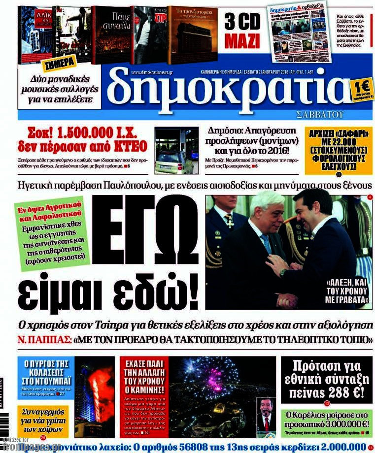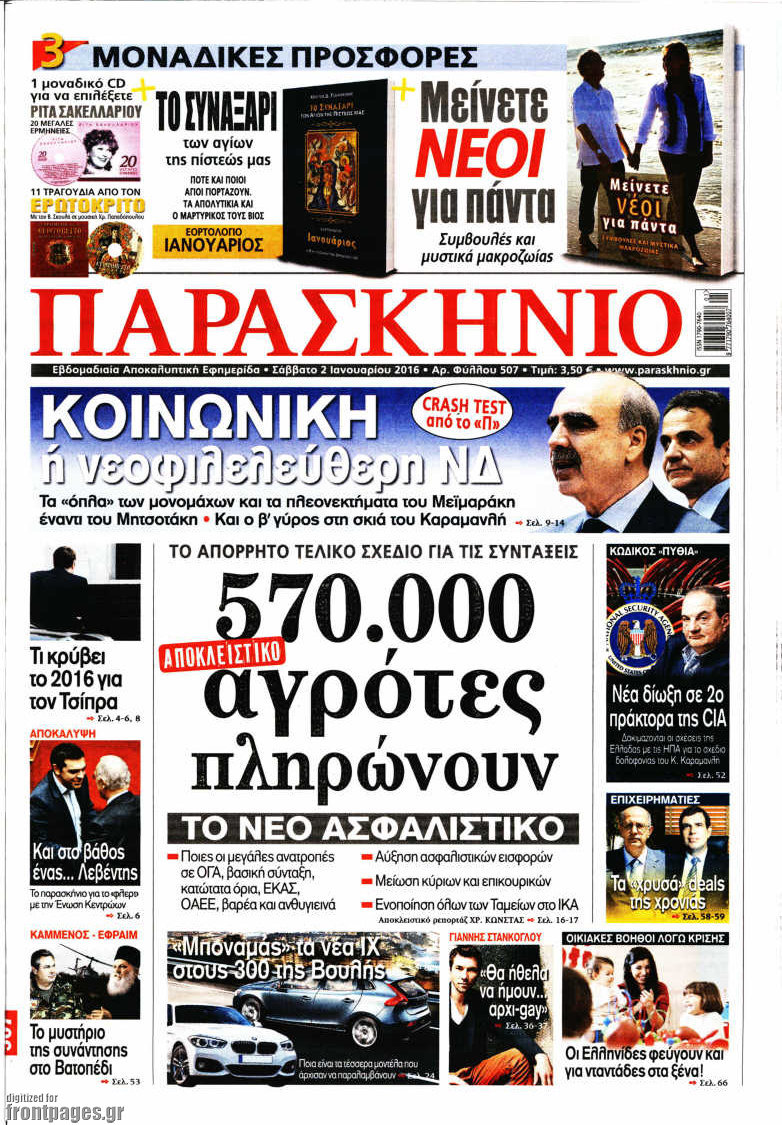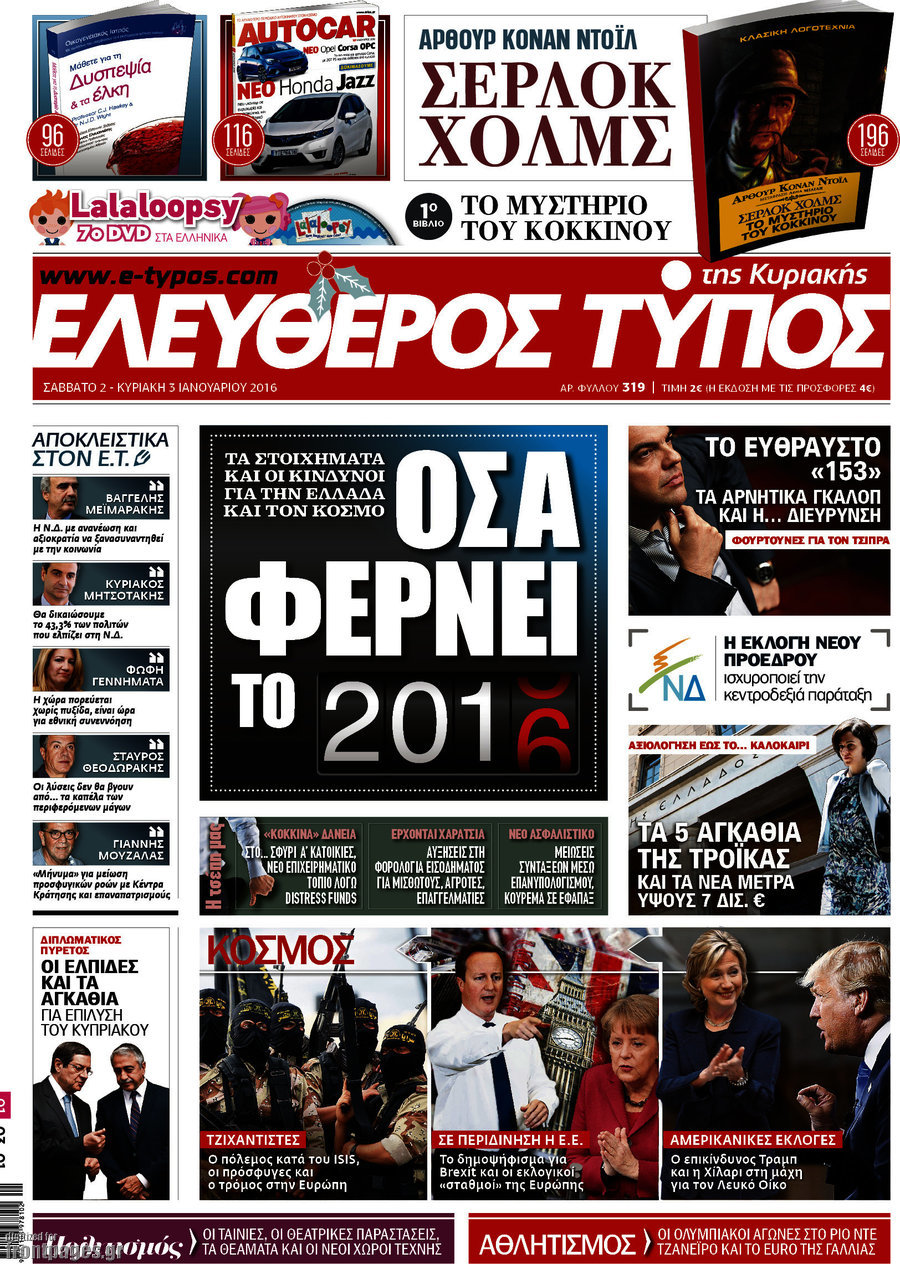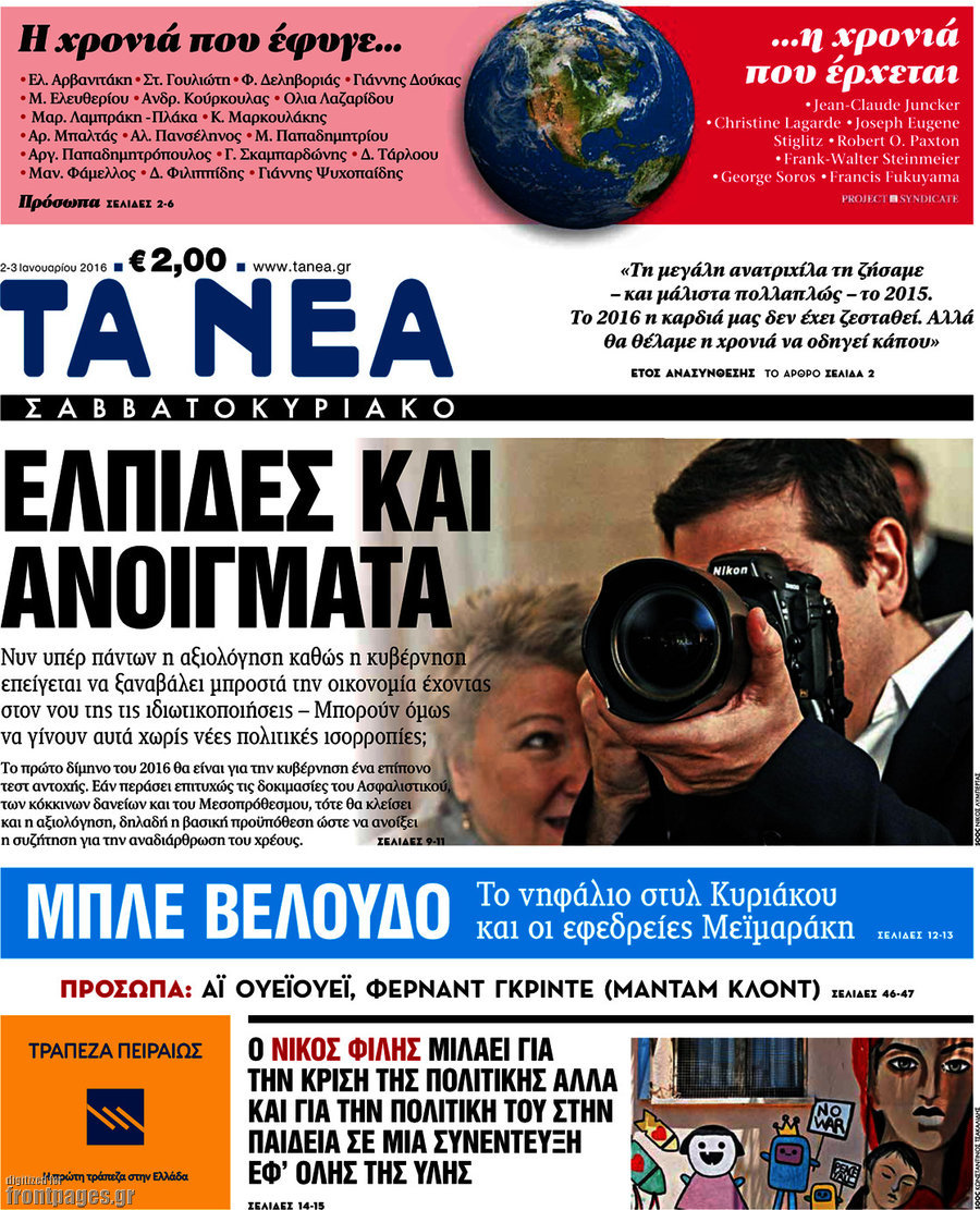 Οι πολιτικές εφημερίδες 2/1/2016 Enikos Newsroom 08:42, Σάββατο 02 Ιανουαρίου 2016 Media Διαβάστε τα σημερινά πρωτοσέλιδα των πολιτικών εφημερίδων: ΠΟΛΙΤΙΚΕΣ ΕΦΗΜΕΡΙΔΕΣ Μοιράσου το: σχολίασε κι εσύ (0 σχόλια) Ακολουθήστε το enikos.gr στο Google News και μάθετε πρώτοι όλες τις ειδήσεις Δείτε όλες τις τελευταίες ειδήσεις από την Ελλάδα και τον Κόσμο στο enikos.gr Ειδήσεις Ροή Ειδήσεων 2 ώρες πριν Μπλόκα: Οι αγρότες σηκώνουν τις μπάρες σε διόδια για τους εκδρομείς των Χριστουγέννων και μοιράζουν προϊόντα – Βίντεο 2 ώρες πριν Τσιάρας προς αγρότες: Τα μπλόκα και τα πείσματα δεν ωφελούν – Οι λύσεις περνούν μέσα από τον διάλογο 3 ώρες πριν Αρχεία Έπσταϊν: Οι συγκλονιστικές φωτογραφίες – Ο Μάικλ Τζάκσον, ο Μικ Τζάγκερ και ο Κέβιν Σπέισι ανάμεσα στους διάσημους που απεικονίζονται 54 λεπτά πριν Μαθητές διακινούσαν κοκαΐνη και χασίς σε σχολείο της Αττικής – 12 συλλήψεις 60 λεπτά πριν Βέλγιο: Άγνωστοι έριξαν κόκκινη μπογιά στο προξενείο της Πολωνίας στις Βρυξέλλες 5 ώρες πριν Μία νέα «χρυσή» περίοδος αρχίζει για 3 ζώδια από σήμερα – «Μία αναπάντεχη ευκαιρία οδηγεί στην επιτυχία» 3 ώρες πριν Διαιτολόγος αποκαλύπτει 9 πρωινές συνήθειες που «λιώνουν» το κοιλιακό λίπος – «Υποστηρίζουν την υγιεινή απώλεια βάρους» 4 ώρες πριν Οι 7 φράσεις που δεν λένε ποτέ οι συναισθηματικά έξυπνοι άνθρωποι κατά τη διάρκεια ενός καβγά 6 ώρες πριν Enerwave: Το νέο «ρεύμα» στη λιανική ενέργειας που αλλάζει την εμπειρία του καταναλωτή 3 λεπτά πριν Μαρινάκης στον Realfm 97,8: Η κυβέρνηση σέβεται κάθε λογική διεκδίκηση των αγροτών, αλλά και το αίτημα των πολιτών να μην ταλαιπωρούνται 9 λεπτά πριν O Πάντερ MVP της 17ης αγωνιστικής στην Euroleague 17 λεπτά πριν Πέθανε η τραγουδίστρια Κλαούντια Ντελμέρ 25 λεπτά πριν Μία ανεκμετάλλευτη πηγή θα μπορούσε να προσφέρει ανεξάντλητη ενέργεια – Οι επιστήμονες ίσως γνωρίζουν πώς να την ξεκλειδώσουν 34 λεπτά πριν Θεσσαλονίκη: Ανήλικος που είχε εξαφανιστεί βρέθηκε στο σπίτι Τούρκων μετά από αστυνομική επιχείρηση ENIKOS NETWORK Η αποχή από την αναπαραγωγή παρατείνει τη ζωή στα ζώα, σύμφωνα με μελέτη – Τι ισχύει για τους ανθρώπους; Σημαντικές επαφές στις ΗΠΑ είχε ο υπουργός Υγείας Άδωνις Γεωργιάδης Ευλογιά αιγοπροβάτων: Παρατεταμένη επιζωοτία, αυστηρά μέτρα – Τι ισχύει για τον εμβολιασμό και την ανασύσταση του ζωικού κε... Τσιάρας προς αγρότες: Έχει ικανοποιηθεί το 74% των αιτημάτων – Τα μπλόκα και τα πείσματα δεν ωφελούν Χαρτογραφώντας το «σημείο χωρίς επιστροφή»: Για πρώτη φορά αποκαλύπτεται με λεπτομέρεια το ακανθώδες όριο της ατμόσφαιρας τ... Η Google καταργεί τη λειτουργία «dark web report» – Πώς θα μπορούν οι χρήστες να διαγράφουν τα δεδομένα τους περισσότερα 14:04 , Σάββατο 20 Δεκεμβρίου 2025 Η Realnews αυτής της Κυριακής (21/12/2025) Με τίτλο: «Ασπίδα προστασίας για την Ελλάδα» κυκλοφορεί, αυτήν την Κυριακή, η Realnews. Σημαντ... 12:53 , Σάββατο 20 Δεκεμβρίου 2025 Να μ’ αγαπάς: Το παρελθόν έρχεται στο φως – Καταιγιστικές εξελίξεις στα τελευταία επεισόδια του 2025 Ο Άγγελος αποκαλύπτεται, η Φωτεινή ανησυχεί για τον Λευτέρη και η Ζωή έρχεται αντιμέτωπη με το... 11:41 , Σάββατο 20 Δεκεμβρίου 2025 «Η αγάπη δεν χάνεται ποτέ»: Η μικρού μήκους ταινία κινουμένων σχεδίων που θέτει ερωτήματα για τη ζωή και τον θάνατο Ο θάνατος είναι ένα από τα πιο σκληρά θέματα που καλείται να διαχειριστεί κάποιος στη διάρκεια... 09:30 , Σάββατο 20 Δεκεμβρίου 2025 «Porto Leone: Στη γειτονιά με τα κόκκινα φανάρια» – Ο Χρόνης αποκαλύπτει στην Αλεξάνδρα το μυστικό για το π
