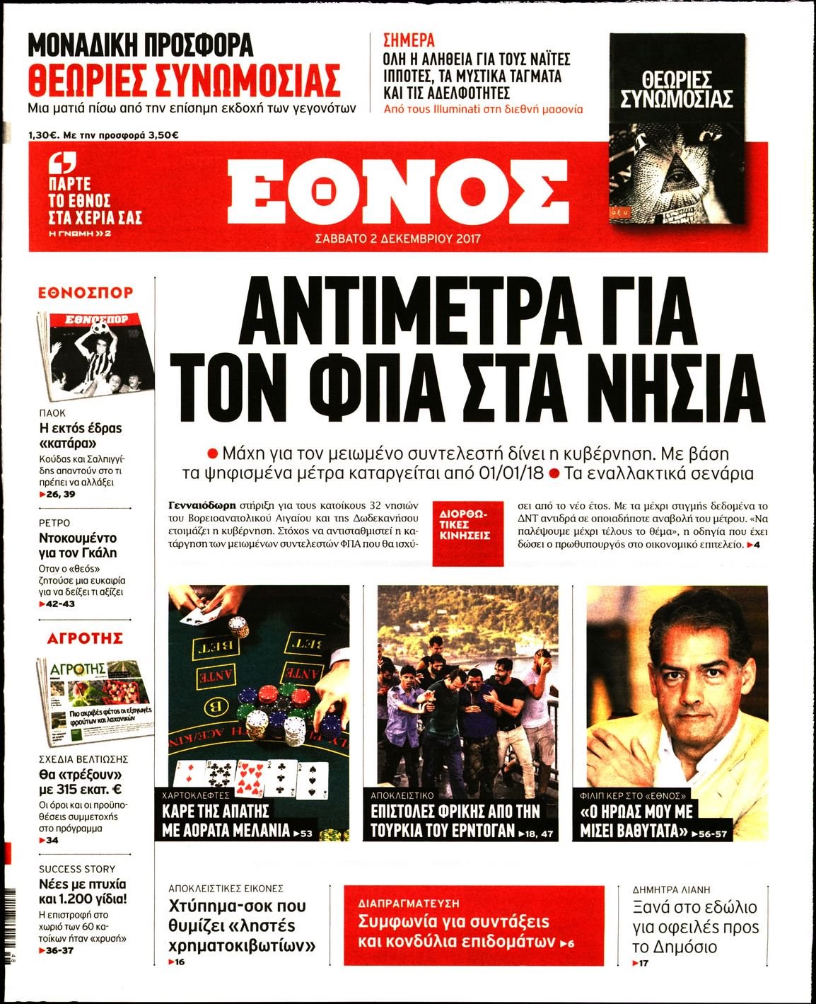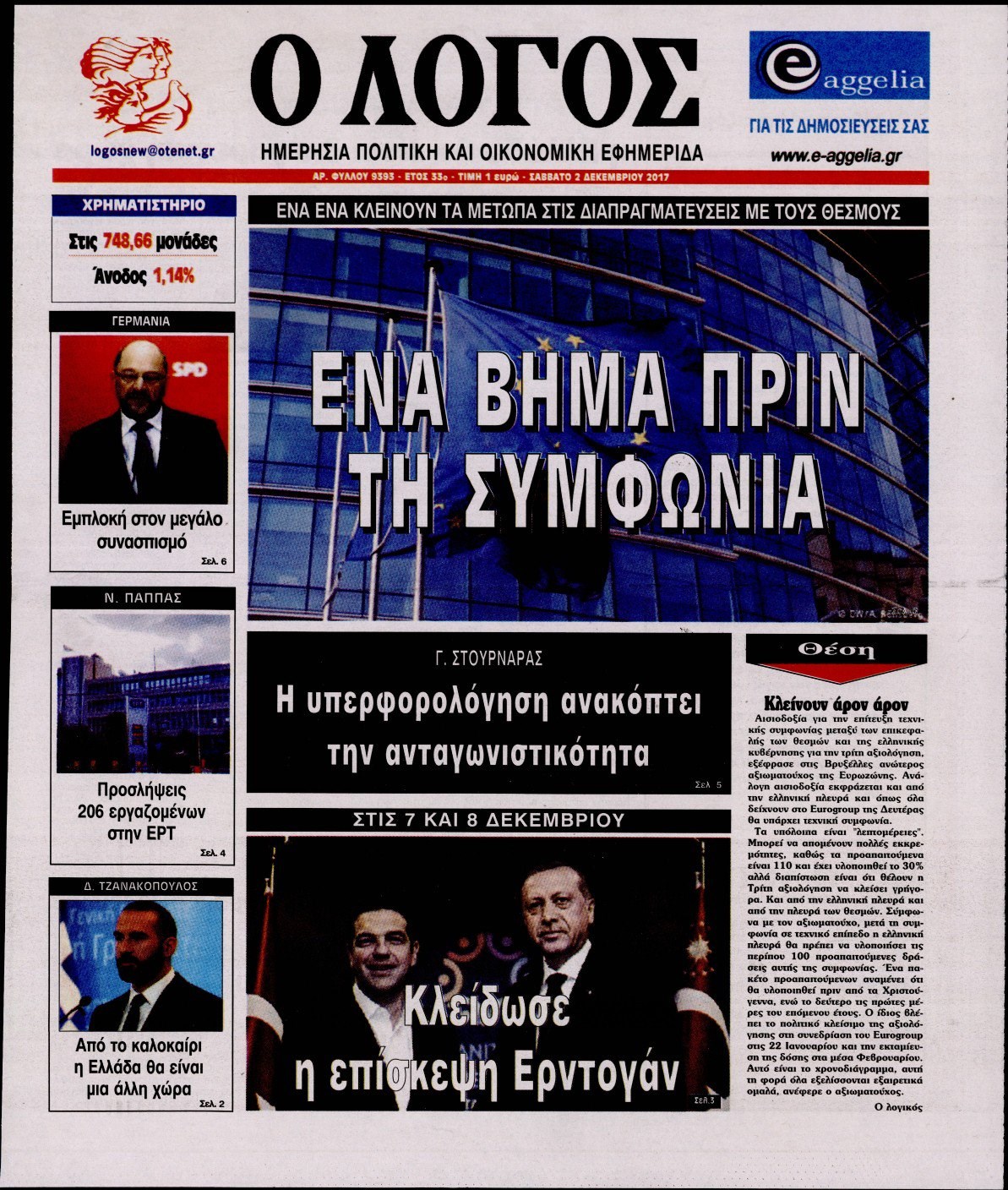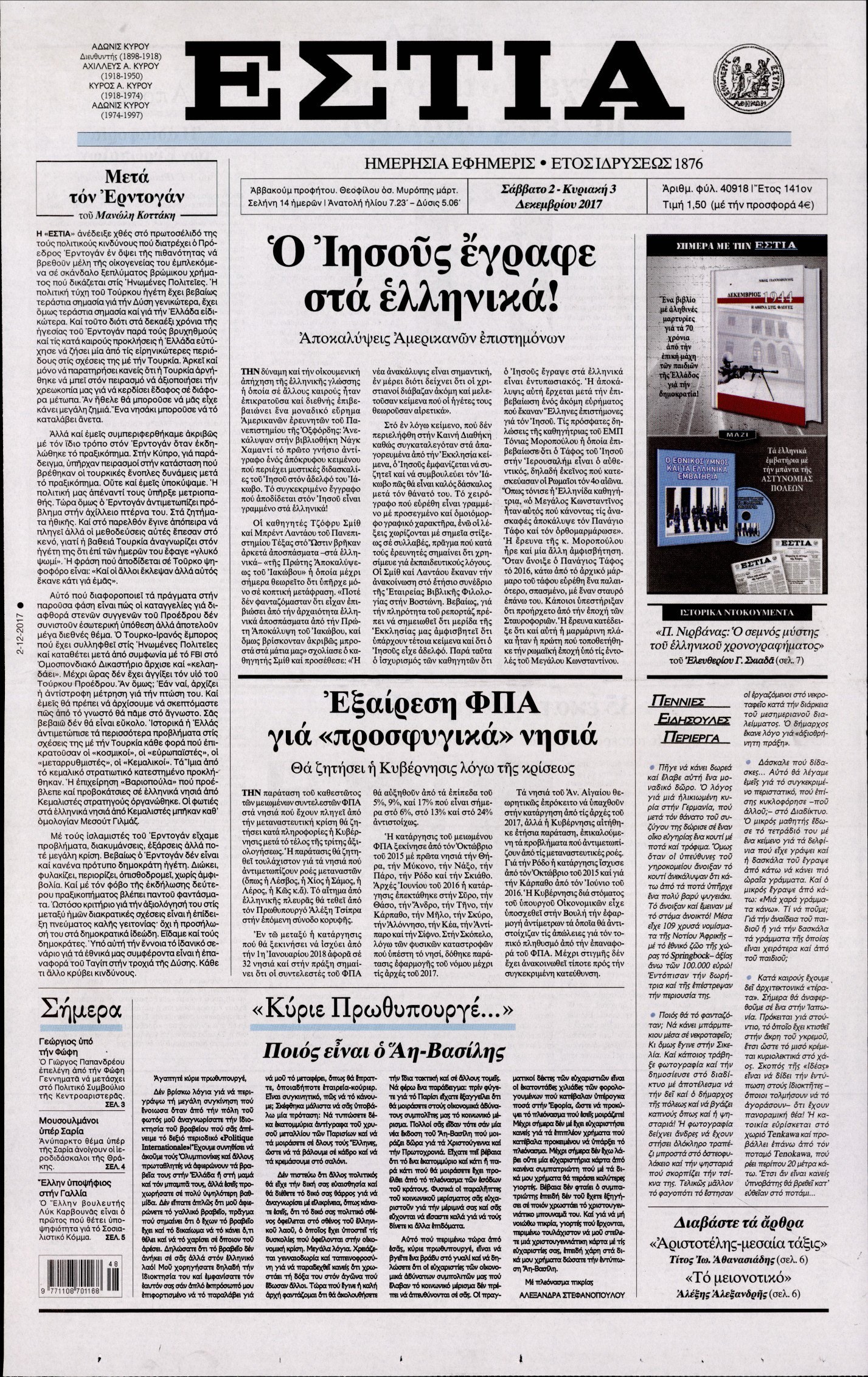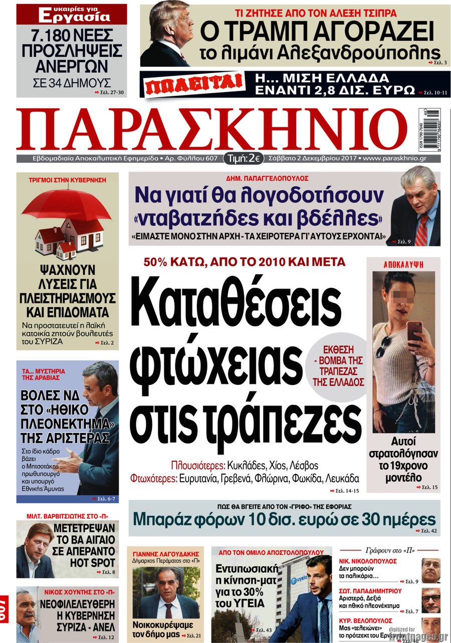 Οι πολιτικές εφημερίδες 2/12/2017 Enikos Newsroom 07:59, Σάββατο 02 Δεκεμβρίου 2017 Media Διαβάστε τα σημερινά πρωτοσέλιδα των πολιτικών εφημερίδων: ΠΟΛΙΤΙΚΕΣ ΕΦΗΜΕΡΙΔΕΣ ΠΡΩΤΟΣΕΛΙΔΑ Μοιράσου το: σχολίασε κι εσύ (0 σχόλια) Ακολουθήστε το enikos.gr στο Google News και μάθετε πρώτοι όλες τις ειδήσεις Δείτε όλες τις τελευταίες ειδήσεις από την Ελλάδα και τον Κόσμο στο enikos.gr Ειδήσεις Ροή Ειδήσεων 5 ώρες πριν Χριστούγεννα στα μπλόκα: Επιμένουν στις κινητοποιήσεις τους οι αγρότες – Ανοίγουν τα διόδια το Σαββατοκύριακο 6 ώρες πριν Ουκρανία: Η άνευ προηγουμένου επίθεση σε ρωσικό τάνκερ στη Μεσόγειο και το μήνυμα προς στον Πούτιν – Το «μακρύ χέρι» του Κιέβου 5 ώρες πριν Πούτιν: Τα μηνύματα σε Ευρώπη και ΝΑΤΟ από το μαραθώνιο «σόου» του – Η απαίτηση για «σεβασμό» και η ειρήνη «με τους όρους» της Μόσχας 6 ώρες πριν Τραμπ: Δεν αποκλείει την πιθανότητα ενός πολέμου στη Βενεζουέλα – «Ο Μαδούρο ξέρει καλύτερα από τον καθένα τι ακριβώς θέλω» 6 ώρες πριν Συνεχίζει να προκαλεί ο Μίτσκοσκι: «Για μένα το όνομα Μακεδονία είναι ιερό» 5 ώρες πριν Ανακαλύφθηκαν αρχαία χρυσά νομίσματα 2.200 ετών που απεικονίζουν τον θεό Απόλλωνα – Η άγνωστη σύνδεση με τον Φίλιππο Β΄ της Μακεδονίας 6 ώρες πριν Ύπνος: Μια κρυφή κατάσταση του εγκεφάλου πριν από τον ύπνο μπορεί να είναι το “κλειδί” για υψηλή ευφυΐα και δημιουργικότητα 7 ώρες πριν Αριθμολογία: Οι άνθρωποι που έχουν γεννηθεί αυτές τις 4 ημερομηνίες, συχνά παρεξηγούνται – «Η καλοσύνη τους κρύβει τεράστια δύναμη» 8 ώρες πριν Ξεχάστε το καθάρισμα το Σαββατοκύριακο: Ο «κανόνας των 20 λεπτών» που θα σας λύσει τα χέρια 4 λεπτά πριν Φως στο Τούνελ: Έφτασε η ώρα της αλήθειας για την δολοφονία της χήρας του πρώην υπουργού στο Κολωνάκι 19 λεπτά πριν Ντόναλντ Τραμπ: Προστέθηκε το όνομά του στην πρόσοψη του Κέντρου Κένεντι – Οργισμένη αντίδραση των συγγενών του JFK 34 λεπτά πριν Ταμίλα Κουλίεβα: «Δεν θέλω να είμαι κάποια που πορεύεται συνεχώς με τις ίδιες αναφορές» 49 λεπτά πριν Η Ελλάδα προσχωρεί στη Διεθνή Επιτροπή Αποζημιώσεων για την Ουκρανία 1 ώρα πριν GNTM: Η Ξένια Τσίρκοβα αναδείχθηκε μεγάλη νικήτρια και πήρε τις 50.000 ευρώ – Ποιος βρέθηκε σε απόσταση αναπνοής; ENIKOS NETWORK Το ΕΚΑΒ τιμήθηκε από την Ακαδημία Αθηνών για τα 40 χρόνια προσφοράς του Έχετε πραγματικά μεγάλη καρδιά; 10 χαρακτηριστικά όσων έχουν καλοσύνη Αναστολή μέτρων αναγκαστικής εκτέλεσης για κτηνοτρόφους που πλήττονται από την ευλογιά των αιγοπροβάτων Πλήρης επάρκεια προϊόντων στις λαϊκές της Αττικής, παρά τις αγροτικές κινητοποιήσεις – Τι απαντούν οι πωλητές Χαρτογραφώντας το «σημείο χωρίς επιστροφή»: Για πρώτη φορά αποκαλύπτεται με λεπτομέρεια το ακανθώδες όριο της ατμόσφαιρας τ... Η Google καταργεί τη λειτουργία «dark web report» – Πώς θα μπορούν οι χρήστες να διαγράφουν τα δεδομένα τους περισσότερα 02:50 , Σάββατο 20 Δεκεμβρίου 2025 GNTM: Η Ξένια Τσίρκοβα αναδείχθηκε μεγάλη νικήτρια και πήρε τις 50.000 ευρώ – Ποιος βρέθηκε σε απόσταση αναπνοής; Με φαντασμαγορικό τρόπο ολοκληρώθηκε το βράδυ της Παρασκευής ο μεγάλος τελικός του GNTM, μέσα ... 22:42 , Παρασκευή 19 Δεκεμβρίου 2025 Γιώργος Γιαννόπουλος για “Το σόι σου”: “Είναι ευτυχία και ευλογία αυτή η σειρά” «Είναι ευτυχία και ευλογία η συγκυρία αυτής της σειράς», θα πει ο Γιώργος Γιαννόπουλος -ο αγαπ... 20:37 , Παρασκευή 19 Δεκεμβρίου 2025 Don’t Forget The Lyrics: Η Έλλη Κοκκίνου υποδέχεται 4 παίκτες που θα κάνουν τα πάντα για να μη χάσουν ούτε… μισή λέξη από τους στίχους Το «Don’t Forget The Lyrics