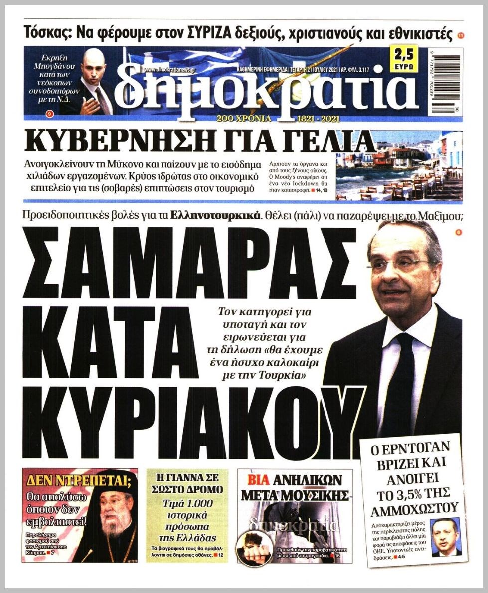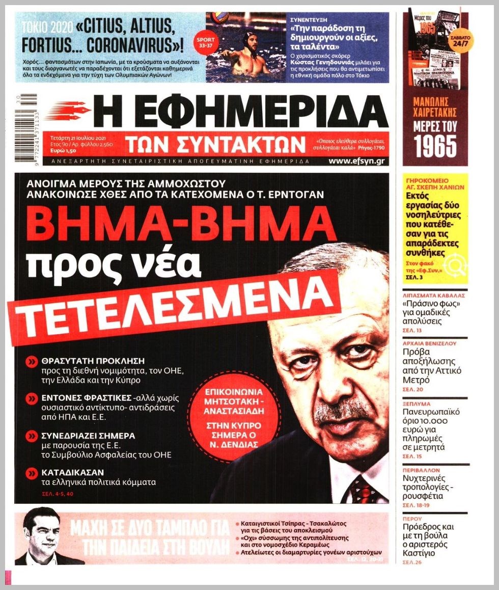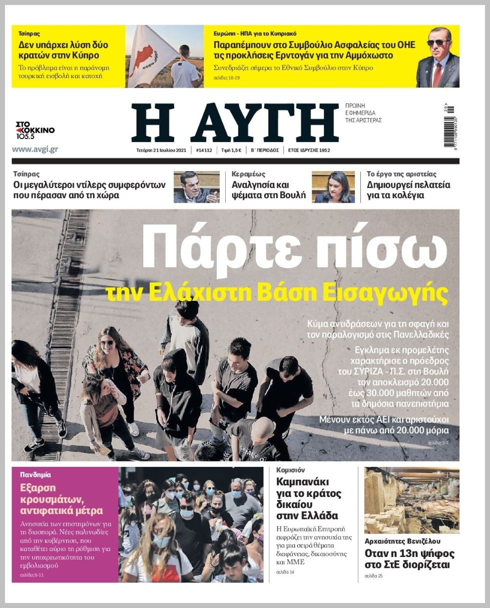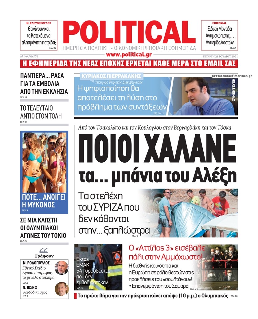 Οι πολιτικές εφημερίδες 21/7/2021 Διονύσης Νίκκας 06:11, Τετάρτη 21 Ιουλίου 2021 Media Διαβάστε τα πρωτοσέλιδα των πολιτικών εφημερίδων… ΕΦΗΜΕΡΙΔΕΣ ΠΡΩΤΟΣΕΛΙΔΑ Μοιράσου το: σχολίασε κι εσύ (0 σχόλια) Ακολουθήστε το enikos.gr στο Google News και μάθετε πρώτοι όλες τις ειδήσεις Δείτε όλες τις τελευταίες ειδήσεις από την Ελλάδα και τον Κόσμο στο enikos.gr Ειδήσεις Ροή Ειδήσεων 5 ώρες πριν Χριστούγεννα στα μπλόκα οι αγρότες: Άνοιξαν στα διόδια και μοίρασαν προϊόντα στους πολίτες – Νέα σύσκεψη την Κυριακή στη Νίκαια 5 ώρες πριν Κύκλωμα διακίνησης ναρκωτικών σε σχολεία: Τηλεφωνούσαν στους ανηλίκους την ώρα του μαθήματος – Οι διάλογοι-σοκ, τα «ψευδώνυμα» και τα βασανιστήρια 4 ώρες πριν Αρχεία Επστάιν: Οι 500 σελίδες που λείπουν, τα αναπάντητα ερωτήματα και οι επώνυμοι – Τι έπεται 6 ώρες πριν Ζελένσκι: Μόνο οι ΗΠΑ και ο Τραμπ μπορούν να πιέσουν τη Ρωσία να βάλει τέλος στον πόλεμο 6 ώρες πριν Φοινικούντα: Προφυλακιστέος ο 30χρονος για συνέργεια στη διπλή δολοφονία – Και άλλα πρόσωπα στο «μικροσκόπιο» 4 ώρες πριν Αποκαλύφθηκε το άγνωστο «GPS» της αρχαιότητας – Πώς οι ναοί «φώτιζαν» τον δρόμο των ναυτικών πριν από την εφεύρεση των φάρων 5 ώρες πριν Ύπνος: Η διατροφή που μπορεί να σας βοηθήσει να κοιμάστε καλύτερα και να ζήσετε περισσότερο 6 ώρες πριν Αριθμολογία: Ο αριθμός του φύλακα αγγέλου σας, με βάση τον μήνα γέννησής σας – «Έτσι σας στέλνει σημάδια το σύμπαν» 18 ώρες πριν Enerwave: Το νέο «ρεύμα» στη λιανική ενέργειας που αλλάζει την εμπειρία του καταναλωτή 2 ώρες πριν Σήμερα με τη Realnews: Δωροεπιταγή 10€ 11 λεπτά πριν Σήμερα με τη Realnews: Instyle, μαζί Drive και Realnews Geopolitics 20 λεπτά πριν Κηφισιά: Το συγκινητικό «Last dance» του Ανδρέα Τεττέη – «Λύγισε» στην τελευταία του συνέντευξη ως παίκτης της ομάδας των βορείων προαστίων 34 λεπτά πριν Οι «εποικοδομητικές» συνομιλίες Ρωσίας – ΗΠΑ στο Μαϊάμι θα συνεχιστούν σήμερα, λέει με τον Ρώσο απεσταλμένος Ντμίτριεφ 50 λεπτά πριν La Liga: Η Ρεάλ νίκησε την Σεβίλλη στην ιστορική βραδιά του Κίλιαν Εμπαπέ – Αποβλήθηκε ο Ματίας Αλμέιδα ENIKOS NETWORK Οι γυναίκες αποκαλύπτουν το πιο ελκυστικό πράγμα που μπορεί να κάνει ένας άνδρας Ομορφιά και αντιγήρανση: Ειδικοί μιλούν για συσκευές περιποίησης του δέρματος «Πολεμική» προετοιμασία από την ευρωπαϊκή βιομηχανία ενέργειας – Η Eurelectric ζητεί «ομπρέλα» προστασίας για τις υποδομές Ακύρωση ΑΦΜ για απάτες – Ποιους βάζει στο στόχαστρο η ΑΑΔΕ Χαρτογραφώντας το «σημείο χωρίς επιστροφή»: Για πρώτη φορά αποκαλύπτεται με λεπτομέρεια το ακανθώδες όριο της ατμόσφαιρας τ... Η Google καταργεί τη λειτουργία «dark web report» – Πώς θα μπορούν οι χρήστες να διαγράφουν τα δεδομένα τους περισσότερα 03:08 , Κυριακή 21 Δεκεμβρίου 2025 Σήμερα με τη Realnews: Instyle, μαζί Drive και Realnews Geopolitics Σήμερα με τη Realnews: Instyle, μαζί Drive και Realnews Geopolitics Instyle Η Άννα Ρεζάν, η Ch... 01:30 , Κυριακή 21 Δεκεμβρίου 2025 Άννα Βίσση: Τα… Social Media «προσκύνησαν» την «απόλυτη» για την συναυλία της στο Καλλιμάρμαρο που προβλήθηκε από το Mega Την ημέρα των γενεθλίων της Άννας Βίσση, το MEGA τίμησε τη διαχρονική παρουσία της «απόλυτης Ε... 00:00 , Κυριακή 21 Δεκεμβρίου 2025 The Voice: Η επιστροφή της Έλενας Παπαρίζου και η ατάκα του Γιώργου Μαζωνάκη μετά τις καταγγελίες Στη φάση των Cross Battles Live μπήκε το The Voice, με την Έλενα Παπαρίζου να επιστρέφει στο π... 20:28 , Σάββατο 20 Δεκεμβρίου 2025 Ο ΑΝΤ1 γεμίζει τις γιορτές με μουσική – Ποιους καλλιτέχνες θα απολαύσουμε Φέτος στον ΑΝΤ1 γιορτάζουμε τις νύχτες μας παρέα με αγαπημένους καλλιτ