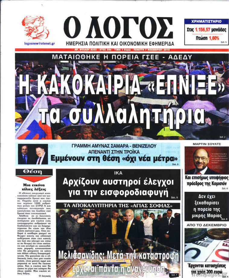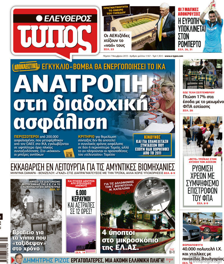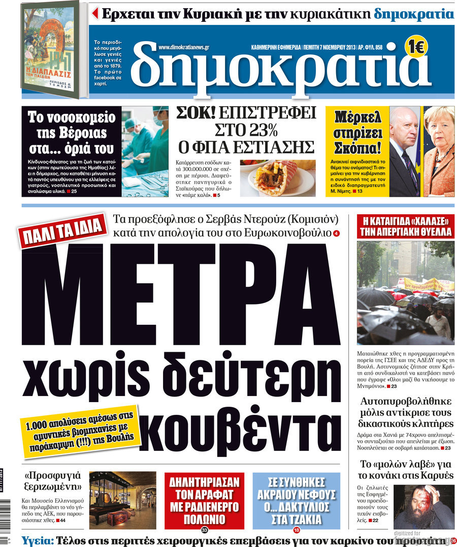 Οι πολιτικές εφημερίδες Enikos Newsroom 08:52, Πέμπτη 07 Νοεμβρίου 2013 Media Οι πολιτικές εφημερίδες Διαβάστε τα πρωτοσέλιδα των πολιτικών εφημερίδων: ΕΦΗΜΕΡΙΔΕΣ ΠΟΛΙΤΙΚΕΣ ΕΦΗΜΕΡΙΔΕΣ ΠΡΩΤΟΣΕΛΙΔΑ Μοιράσου το: σχολίασε κι εσύ (0 σχόλια) Ακολουθήστε το enikos.gr στο Google News και μάθετε πρώτοι όλες τις ειδήσεις Δείτε όλες τις τελευταίες ειδήσεις από την Ελλάδα και τον Κόσμο στο enikos.gr Ειδήσεις Ροή Ειδήσεων 6 ώρες πριν Εκτός ευρωομάδας ΣΥΡΙΖΑ ο Νίκος Παππάς μετά την επίθεση στον δημοσιογράφο Νίκο Γιαννόπουλο – Η μήνυση και οι νέες δηλώσεις 7 ώρες πριν «Αγριεύουν» οι αγρότες: «Δεν συντρέχει λόγος συνάντησης με τον πρωθυπουργό» – Ώρα αποφάσεων στη σύσκεψη της Πέμπτης 7 ώρες πριν Κυψέλη: Χωρίς την οικογένειά της δίπλα της απολογήθηκε η 16χρονη – «Της είχε επιτεθεί κάποιος για να την βιάσει, φοβήθηκε και κυκλοφορούσε με μαχαίρι» 6 ώρες πριν Politico: Το πρόβλημα της Ευρώπης δεν είναι το Βέλγιο αλλά ο Ντόναλντ Τραμπ 8 ώρες πριν Αλεξανδρούπολη: Πολυοργανική ανεπάρκεια λόγω υποσιτισμού η αιτία θανάτου του 3χρονου αγοριού 7 ώρες πριν Μυστήριο με τεράστιες κυκλικές πέτρες 200 κιλών – Ανακαλύφθηκαν τυχαία κατά τη διάρκεια οδικών έργων και κανείς δεν ξέρει από πού προέρχονται 8 ώρες πριν Ύπνος: Ειδικός εξηγεί τον πραγματικό λόγο που ξυπνάτε στις 4 τα ξημερώματα – Ο ρόλος των ορμονών και του κιρκάδιου ρυθμού 9 ώρες πριν Αριθμολογία: Οι άνθρωποι που έχουν γεννηθεί αυτές τις 4 ημερομηνίες, είναι τρυφεροί και αγαπούν ανιδιοτελώς 20 ώρες πριν 20 χρόνια τα Χριστούγεννα ξεκινούν στα Public με μεγάλη ποικιλία σε δώρα! 3 λεπτά πριν Τα ζώδια σήμερα, Πέμπτη 18 Δεκεμβρίου: Λέοντες, η καρδιά σας θέλει να εκφραστεί 11 λεπτά πριν Το Ποντίκι σήμερα Πέμπτη 18/12/2025 15 λεπτά πριν Εφημερεύοντα φαρμακεία σε Αθήνα και Θεσσαλονίκη (18/12) 18 λεπτά πριν Αλεξάνδρα Ούστα: «Αυτό που με τρέλανε στον σύζυγό μου ήταν η ορθολογική του σκέψη» 25 λεπτά πριν Μιχάλης Αεράκης: «Της είπα “θέλω να κάνουμε σπιτικό, αλλά υπάρχουν τρεις προϋποθέσεις…”» ENIKOS NETWORK Αϋπνία: Το κόλπο που θα σας βοηθήσει να κοιμηθείτε απόψε – Είναι απλό και έχει αποτέλεσμα 2,6 εκατομμύρια πολίτες έχουν ήδη εμβολιαστεί κατά της γρίπης ΕΛΣΤΑΤ: Τι δείχνουν τα νέα στοιχεία για τις ηλεκτρονικές παραγγελίες των επιχειρήσεων ΚΕΠΕ: Οι 3 διακριτές συμβολές των ΜμΕ και της μεταποίησης στην ελληνική οικονομία Χαρτογραφώντας το «σημείο χωρίς επιστροφή»: Για πρώτη φορά αποκαλύπτεται με λεπτομέρεια το ακανθώδες όριο της ατμόσφαιρας τ... Η Google καταργεί τη λειτουργία «dark web report» – Πώς θα μπορούν οι χρήστες να διαγράφουν τα δεδομένα τους περισσότερα 05:22 , Πέμπτη 18 Δεκεμβρίου 2025 Το Ποντίκι σήμερα Πέμπτη 18/12/2025 Διαβάστε το πρωτοσέλιδο της εφημερίδας «Το Ποντίκι» σήμερα 18/12/2025. 02:30 , Πέμπτη 18 Δεκεμβρίου 2025 Αλ Τσαντίρι Νιουζ: Η κόρη της Πάολα στο κοινό – Η ατάκα Λαζόπουλου που την έκανε να «κοκκινήσει» Γιορτινή διάθεση και ευχάριστες στιγμές γέμισε η αποψινή, τελευταία για το 2025, εκπομπή του «... 22:24 , Τετάρτη 17 Δεκεμβρίου 2025 Το Σπίτι Δίπλα Στο Ποτάμι: Σε κίνδυνο η υγεία του Απόστολου – Τι θα δούμε απόψε “Το Σπίτι Δίπλα στο Ποτάμι” ξετυλίγει το νήμα της ζωής των πέντε αδελφών με καταισ... 21:14 , Τετάρτη 17 Δεκεμβρίου 2025 Παιχνίδια Εκδίκησης: Θα καταφέρει ο Χρήστος να κλονίσει την εμπιστοσύνη της Μάγιας απέναντι στον Άγη; Τα «Παιχνίδια Εκδίκησης» έρχονται απόψε στις 22:30, στον Αντ1, με το τελευταίο επεισόδιο της χ... ΤΕΛΕΥΤΑΙΕΣ ΕΙΔΗΣΕΙΣ 3 λεπτά πριν Τα ζώδια σήμερα, Πέμπτη 18 Δεκεμβρίου: Λέον