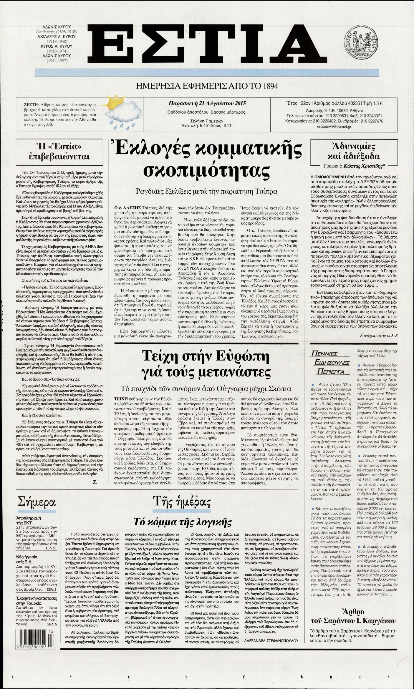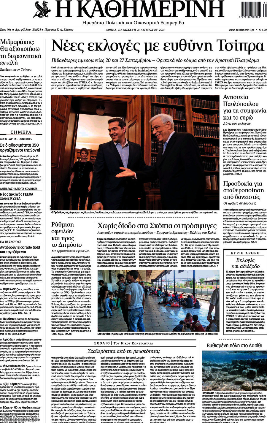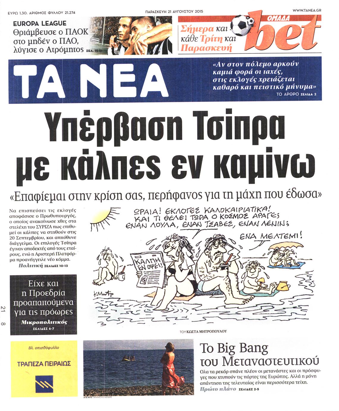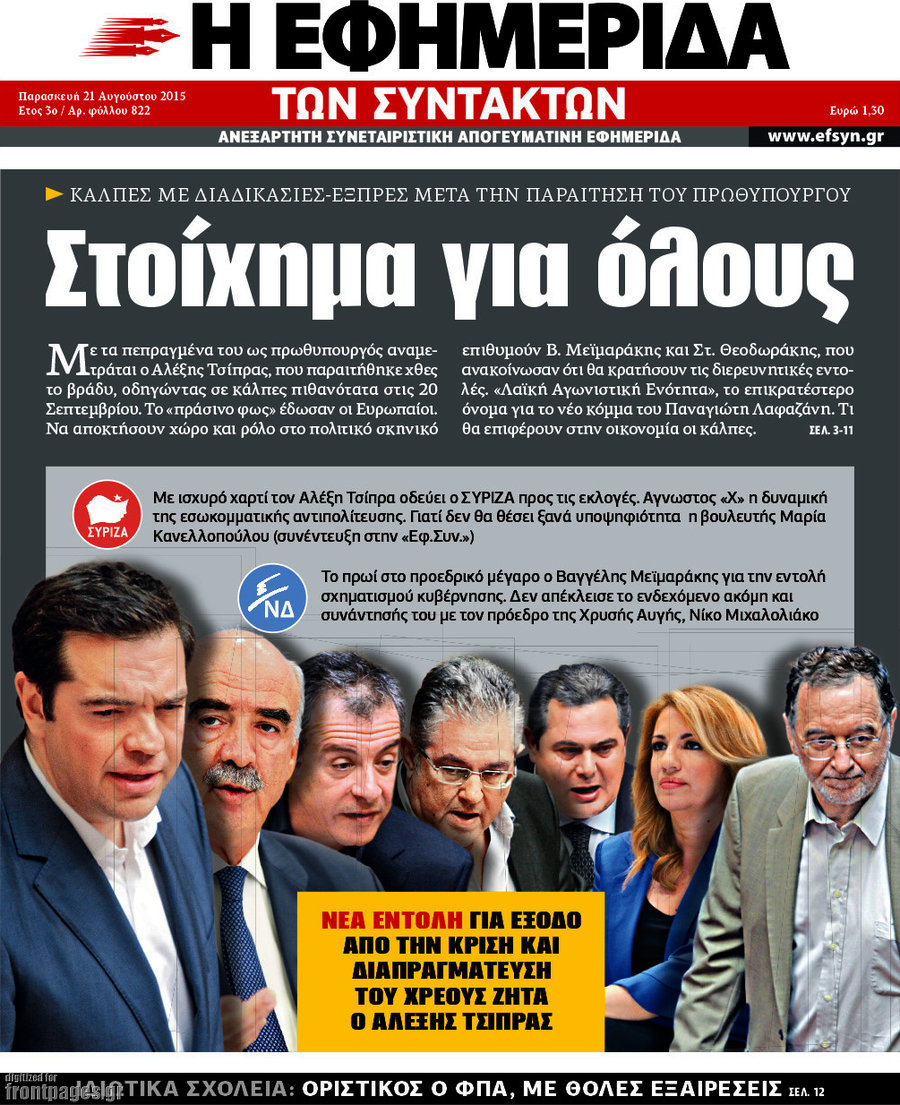 Οι πολιτικές εφημερίδες 21/8/2015 Enikos Newsroom 07:52, Παρασκευή 21 Αυγούστου 2015 Media Διαβάστε τα σημερινά πρωτοσέλιδα των πολιτικών εφημερίδων: ΠΟΛΙΤΙΚΕΣ ΕΦΗΜΕΡΙΔΕΣ ΠΡΩΤΟΣΕΛΙΔΑ Μοιράσου το: σχολίασε κι εσύ (0 σχόλια) Ακολουθήστε το enikos.gr στο Google News και μάθετε πρώτοι όλες τις ειδήσεις Δείτε όλες τις τελευταίες ειδήσεις από την Ελλάδα και τον Κόσμο στο enikos.gr Ειδήσεις Ροή Ειδήσεων 42 λεπτά πριν Χριστούγεννα στα μπλόκα: Επιμένουν στις κινητοποιήσεις τους οι αγρότες – Ανοίγουν τα διόδια το Σαββατοκύριακο 1 ώρα πριν Ουκρανία: Η άνευ προηγουμένου επίθεση σε ρωσικό τάνκερ στη Μεσόγειο και το μήνυμα προς στον Πούτιν – Το «μακρύ χέρι» του Κιέβου 20 λεπτά πριν Πούτιν: Τα μηνύματα σε Ευρώπη και ΝΑΤΟ από το μαραθώνιο «σόου» του – Η απαίτηση για «σεβασμό» και η ειρήνη «με τους όρους» της Μόσχας 1 ώρα πριν Τραμπ: Δεν αποκλείει την πιθανότητα ενός πολέμου στη Βενεζουέλα – «Ο Μαδούρο ξέρει καλύτερα από τον καθένα τι ακριβώς θέλω» 2 ώρες πριν Συνεχίζει να προκαλεί ο Μίτσκοσκι: «Για μένα το όνομα Μακεδονία είναι ιερό» 4 ώρες πριν Πούτιν: «Ναι, είμαι ερωτευμένος» – Βίντεο από τη σπάνια προσωπική παραδοχή του 2 ώρες πριν Αριθμολογία: Οι άνθρωποι που έχουν γεννηθεί αυτές τις 4 ημερομηνίες, συχνά παρεξηγούνται – «Η καλοσύνη τους κρύβει τεράστια δύναμη» 1 ώρα πριν Ύπνος: Μια κρυφή κατάσταση του εγκεφάλου πριν από τον ύπνο μπορεί να είναι το “κλειδί” για υψηλή ευφυΐα και δημιουργικότητα 3 ώρες πριν Ξεχάστε το καθάρισμα το Σαββατοκύριακο: Ο «κανόνας των 20 λεπτών» που θα σας λύσει τα χέρια 21 λεπτά πριν Ανακαλύφθηκαν αρχαία χρυσά νομίσματα 2.200 ετών που απεικονίζουν τον θεό Απόλλωνα – Η άγνωστη σύνδεση με τον Φίλιππο Β΄ της Μακεδονίας 5 λεπτά πριν Ολυμπιακός – Βιλερμπάν 107-84: Επιστροφή στις νίκες με… προπόνηση 11 λεπτά πριν Νέος Κόσμος: Συνελήφθη 41χρονος με ένταλμα από την Τουρκία για εμπόριο ναρκωτικών και ληστεία 20 λεπτά πριν Πούτιν: Τα μηνύματα σε Ευρώπη και ΝΑΤΟ από το μαραθώνιο «σόου» του – Η απαίτηση για «σεβασμό» και η ειρήνη «με τους όρους» της Μόσχας 21 λεπτά πριν Ανακαλύφθηκαν αρχαία χρυσά νομίσματα 2.200 ετών που απεικονίζουν τον θεό Απόλλωνα – Η άγνωστη σύνδεση με τον Φίλιππο Β΄ της Μακεδονίας 26 λεπτά πριν Νίκος Ξυλούρης: Συγκινεί η χήρα του σπουδαίου καλλιτέχνη – «Ευχαριστώ όλο τον κόσμο που τον κρατάει ζωντανό 45 χρόνια» ENIKOS NETWORK Το ΕΚΑΒ τιμήθηκε από την Ακαδημία Αθηνών για τα 40 χρόνια προσφοράς του Έχετε πραγματικά μεγάλη καρδιά; 10 χαρακτηριστικά όσων έχουν καλοσύνη Αναστολή μέτρων αναγκαστικής εκτέλεσης για κτηνοτρόφους που πλήττονται από την ευλογιά των αιγοπροβάτων Πλήρης επάρκεια προϊόντων στις λαϊκές της Αττικής, παρά τις αγροτικές κινητοποιήσεις – Τι απαντούν οι πωλητές Χαρτογραφώντας το «σημείο χωρίς επιστροφή»: Για πρώτη φορά αποκαλύπτεται με λεπτομέρεια το ακανθώδες όριο της ατμόσφαιρας τ... Η Google καταργεί τη λειτουργία «dark web report» – Πώς θα μπορούν οι χρήστες να διαγράφουν τα δεδομένα τους περισσότερα 22:42 , Παρασκευή 19 Δεκεμβρίου 2025 Γιώργος Γιαννόπουλος για “Το σόι σου”: “Είναι ευτυχία και ευλογία αυτή η σειρά” «Είναι ευτυχία και ευλογία η συγκυρία αυτής της σειράς», θα πει ο Γιώργος Γιαννόπουλος -ο αγαπ... 20:37 , Παρασκευή 19 Δεκεμβρίου 2025 Don’t Forget The Lyrics: Η Έλλη Κοκκίνου υποδέχεται 4 παίκτες που θα κάνουν τα πάντα για να μη χάσουν ούτε… μισή λέξη από τους στίχους Το «Don’t Forget The Lyrics» επιστρέφει απόψε, Παρασκευή 19 Δεκεμβρίου, στις 21:00 με νέο επει... 19:31 , Παρασκ