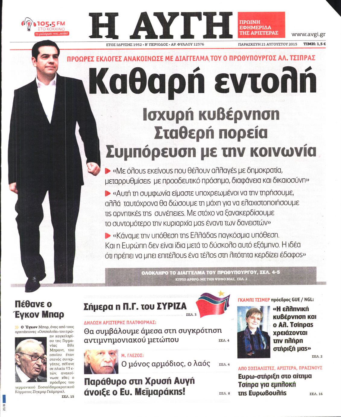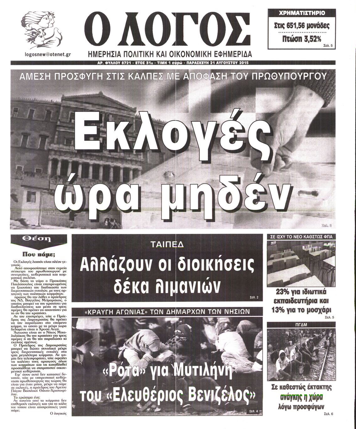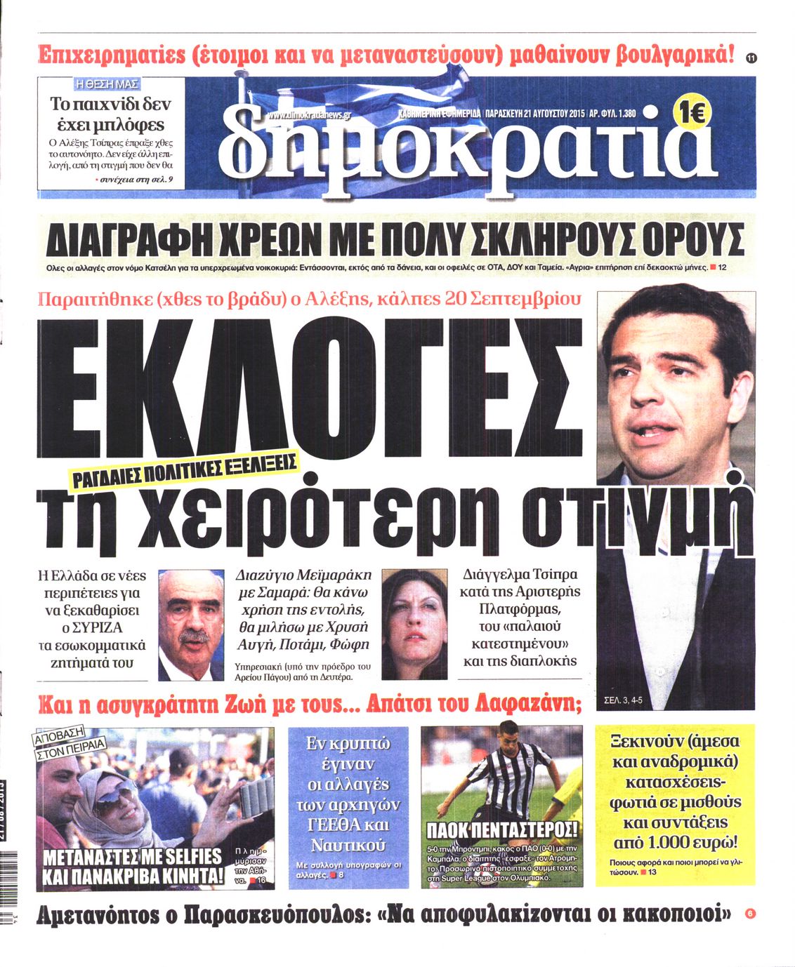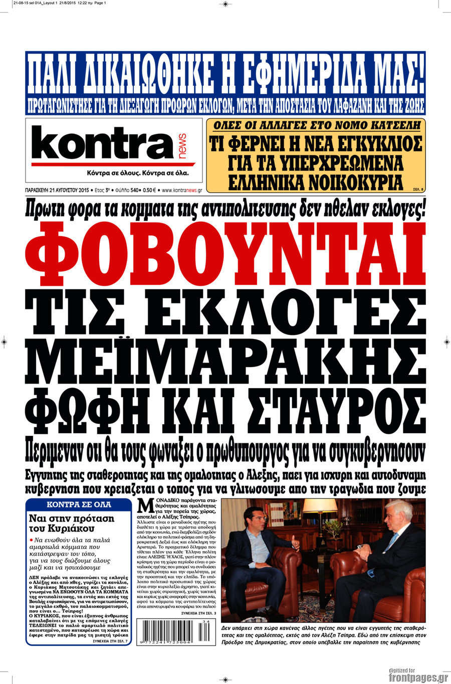 Οι πολιτικές εφημερίδες 21/8/2015 Enikos Newsroom 07:52, Παρασκευή 21 Αυγούστου 2015 Media Διαβάστε τα σημερινά πρωτοσέλιδα των πολιτικών εφημερίδων: ΠΟΛΙΤΙΚΕΣ ΕΦΗΜΕΡΙΔΕΣ ΠΡΩΤΟΣΕΛΙΔΑ Μοιράσου το: σχολίασε κι εσύ (0 σχόλια) Ακολουθήστε το enikos.gr στο Google News και μάθετε πρώτοι όλες τις ειδήσεις Δείτε όλες τις τελευταίες ειδήσεις από την Ελλάδα και τον Κόσμο στο enikos.gr Ειδήσεις Ροή Ειδήσεων 42 λεπτά πριν Χριστούγεννα στα μπλόκα: Επιμένουν στις κινητοποιήσεις τους οι αγρότες – Ανοίγουν τα διόδια το Σαββατοκύριακο 1 ώρα πριν Ουκρανία: Η άνευ προηγουμένου επίθεση σε ρωσικό τάνκερ στη Μεσόγειο και το μήνυμα προς στον Πούτιν – Το «μακρύ χέρι» του Κιέβου 20 λεπτά πριν Πούτιν: Τα μηνύματα σε Ευρώπη και ΝΑΤΟ από το μαραθώνιο «σόου» του – Η απαίτηση για «σεβασμό» και η ειρήνη «με τους όρους» της Μόσχας 1 ώρα πριν Τραμπ: Δεν αποκλείει την πιθανότητα ενός πολέμου στη Βενεζουέλα – «Ο Μαδούρο ξέρει καλύτερα από τον καθένα τι ακριβώς θέλω» 2 ώρες πριν Συνεχίζει να προκαλεί ο Μίτσκοσκι: «Για μένα το όνομα Μακεδονία είναι ιερό» 4 ώρες πριν Πούτιν: «Ναι, είμαι ερωτευμένος» – Βίντεο από τη σπάνια προσωπική παραδοχή του 2 ώρες πριν Αριθμολογία: Οι άνθρωποι που έχουν γεννηθεί αυτές τις 4 ημερομηνίες, συχνά παρεξηγούνται – «Η καλοσύνη τους κρύβει τεράστια δύναμη» 1 ώρα πριν Ύπνος: Μια κρυφή κατάσταση του εγκεφάλου πριν από τον ύπνο μπορεί να είναι το “κλειδί” για υψηλή ευφυΐα και δημιουργικότητα 3 ώρες πριν Ξεχάστε το καθάρισμα το Σαββατοκύριακο: Ο «κανόνας των 20 λεπτών» που θα σας λύσει τα χέρια 21 λεπτά πριν Ανακαλύφθηκαν αρχαία χρυσά νομίσματα 2.200 ετών που απεικονίζουν τον θεό Απόλλωνα – Η άγνωστη σύνδεση με τον Φίλιππο Β΄ της Μακεδονίας 5 λεπτά πριν Ολυμπιακός – Βιλερμπάν 107-84: Επιστροφή στις νίκες με… προπόνηση 11 λεπτά πριν Νέος Κόσμος: Συνελήφθη 41χρονος με ένταλμα από την Τουρκία για εμπόριο ναρκωτικών και ληστεία 20 λεπτά πριν Πούτιν: Τα μηνύματα σε Ευρώπη και ΝΑΤΟ από το μαραθώνιο «σόου» του – Η απαίτηση για «σεβασμό» και η ειρήνη «με τους όρους» της Μόσχας 21 λεπτά πριν Ανακαλύφθηκαν αρχαία χρυσά νομίσματα 2.200 ετών που απεικονίζουν τον θεό Απόλλωνα – Η άγνωστη σύνδεση με τον Φίλιππο Β΄ της Μακεδονίας 26 λεπτά πριν Νίκος Ξυλούρης: Συγκινεί η χήρα του σπουδαίου καλλιτέχνη – «Ευχαριστώ όλο τον κόσμο που τον κρατάει ζωντανό 45 χρόνια» ENIKOS NETWORK Το ΕΚΑΒ τιμήθηκε από την Ακαδημία Αθηνών για τα 40 χρόνια προσφοράς του Έχετε πραγματικά μεγάλη καρδιά; 10 χαρακτηριστικά όσων έχουν καλοσύνη Αναστολή μέτρων αναγκαστικής εκτέλεσης για κτηνοτρόφους που πλήττονται από την ευλογιά των αιγοπροβάτων Πλήρης επάρκεια προϊόντων στις λαϊκές της Αττικής, παρά τις αγροτικές κινητοποιήσεις – Τι απαντούν οι πωλητές Χαρτογραφώντας το «σημείο χωρίς επιστροφή»: Για πρώτη φορά αποκαλύπτεται με λεπτομέρεια το ακανθώδες όριο της ατμόσφαιρας τ... Η Google καταργεί τη λειτουργία «dark web report» – Πώς θα μπορούν οι χρήστες να διαγράφουν τα δεδομένα τους περισσότερα 22:42 , Παρασκευή 19 Δεκεμβρίου 2025 Γιώργος Γιαννόπουλος για “Το σόι σου”: “Είναι ευτυχία και ευλογία αυτή η σειρά” «Είναι ευτυχία και ευλογία η συγκυρία αυτής της σειράς», θα πει ο Γιώργος Γιαννόπουλος -ο αγαπ... 20:37 , Παρασκευή 19 Δεκεμβρίου 2025 Don’t Forget The Lyrics: Η Έλλη Κοκκίνου υποδέχεται 4 παίκτες που θα κάνουν τα πάντα για να μη χάσουν ούτε… μισή λέξη από τους στίχους Το «Don’t Forget The Lyrics» επιστρέφει απόψε, Παρασκευή 19 Δεκεμβρίου, στις 21:00 με νέο επει... 19:31 , Παρασκ