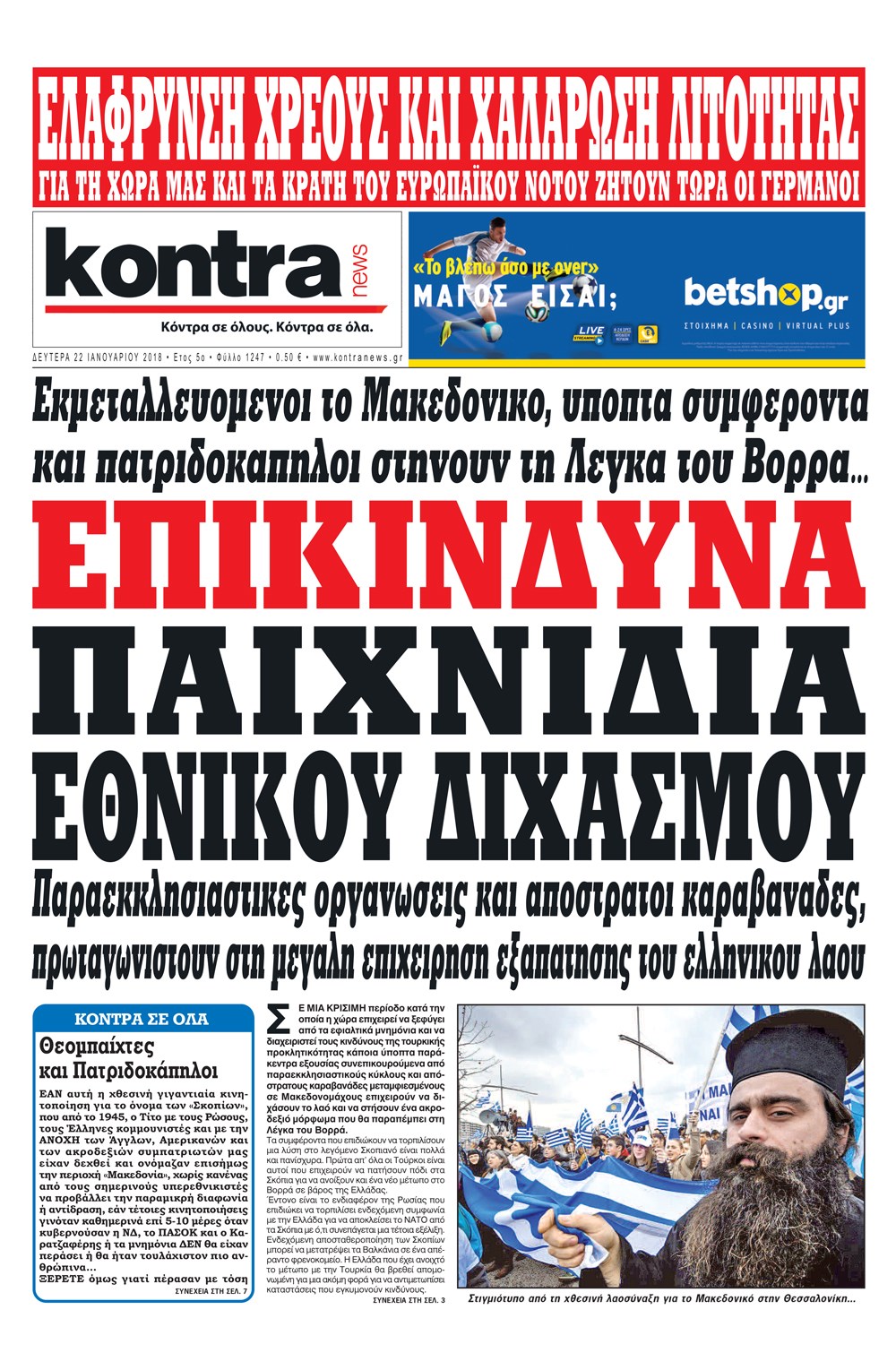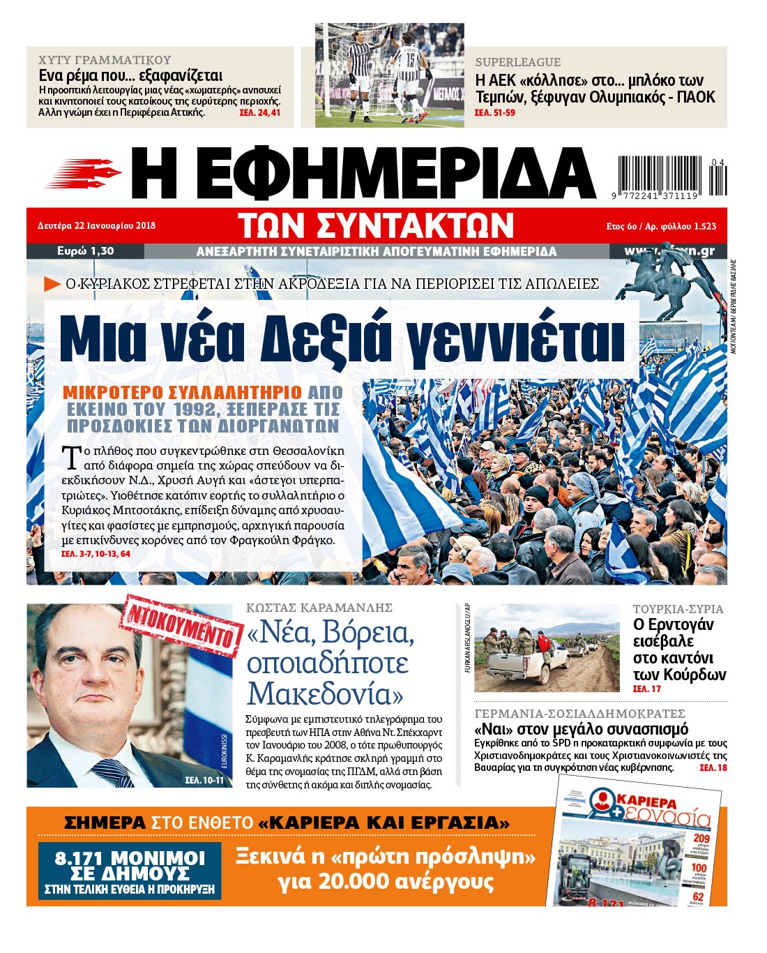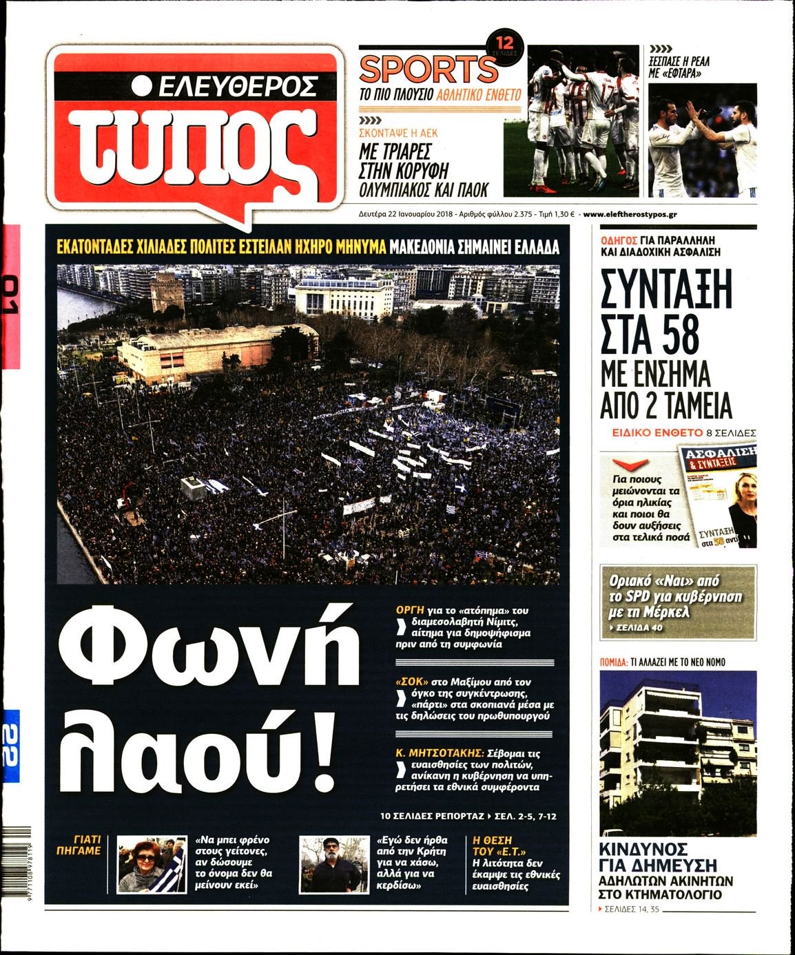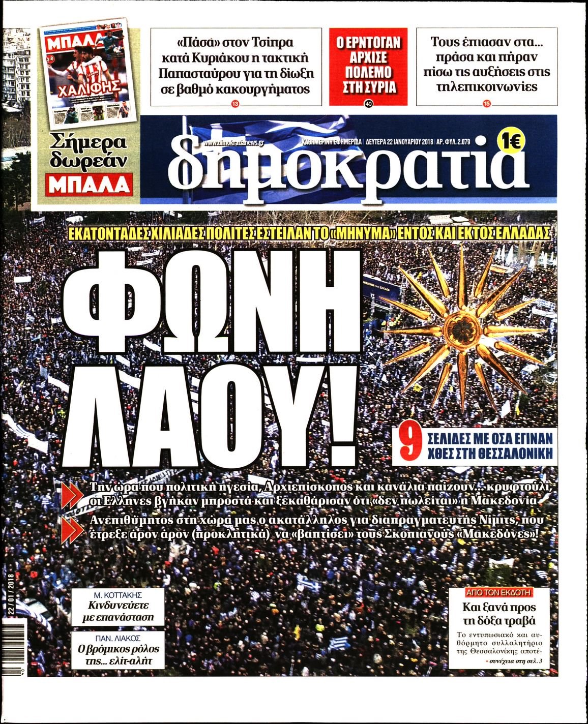 Οι πολιτικές εφημερίδες 22/1/2018 Κώστας Τεό 06:14, Δευτέρα 22 Ιανουαρίου 2018 Media Διαβάστε τα σημερινά πρωτοσέλιδα των πολιτικών εφημερίδων: ΠΟΛΙΤΙΚΕΣ ΕΦΗΜΕΡΙΔΕΣ ΠΡΩΤΟΣΕΛΙΔΑ Μοιράσου το: σχολίασε κι εσύ (0 σχόλια) Ακολουθήστε το enikos.gr στο Google News και μάθετε πρώτοι όλες τις ειδήσεις Δείτε όλες τις τελευταίες ειδήσεις από την Ελλάδα και τον Κόσμο στο enikos.gr Ειδήσεις Ροή Ειδήσεων 3 ώρες πριν Χριστούγεννα στα μπλόκα: Επιμένουν στις κινητοποιήσεις τους οι αγρότες – Ανοίγουν τα διόδια το Σαββατοκύριακο 3 ώρες πριν Ουκρανία: Η άνευ προηγουμένου επίθεση σε ρωσικό τάνκερ στη Μεσόγειο και το μήνυμα προς στον Πούτιν – Το «μακρύ χέρι» του Κιέβου 2 ώρες πριν Πούτιν: Τα μηνύματα σε Ευρώπη και ΝΑΤΟ από το μαραθώνιο «σόου» του – Η απαίτηση για «σεβασμό» και η ειρήνη «με τους όρους» της Μόσχας 3 ώρες πριν Τραμπ: Δεν αποκλείει την πιθανότητα ενός πολέμου στη Βενεζουέλα – «Ο Μαδούρο ξέρει καλύτερα από τον καθένα τι ακριβώς θέλω» 4 ώρες πριν Συνεχίζει να προκαλεί ο Μίτσκοσκι: «Για μένα το όνομα Μακεδονία είναι ιερό» 2 ώρες πριν Ανακαλύφθηκαν αρχαία χρυσά νομίσματα 2.200 ετών που απεικονίζουν τον θεό Απόλλωνα – Η άγνωστη σύνδεση με τον Φίλιππο Β΄ της Μακεδονίας 3 ώρες πριν Ύπνος: Μια κρυφή κατάσταση του εγκεφάλου πριν από τον ύπνο μπορεί να είναι το “κλειδί” για υψηλή ευφυΐα και δημιουργικότητα 4 ώρες πριν Αριθμολογία: Οι άνθρωποι που έχουν γεννηθεί αυτές τις 4 ημερομηνίες, συχνά παρεξηγούνται – «Η καλοσύνη τους κρύβει τεράστια δύναμη» 5 ώρες πριν Ξεχάστε το καθάρισμα το Σαββατοκύριακο: Ο «κανόνας των 20 λεπτών» που θα σας λύσει τα χέρια 4 λεπτά πριν Συρία: Μαζικά πλήγματα των ΗΠΑ σε θέσεις του Ισλαμικού Κράτους – Χέγκσεθ: «Δεν είναι αρχή πολέμου, είναι μια δήλωση εκδίκησης» για το θάνατο των στρατιωτών μας 17 λεπτά πριν Ουκρανία: Ολοκληρώθηκαν οι συνομιλίες με τους Αμερικανούς κι Ευρωπαίους διαπραγματευτές 32 λεπτά πριν Μπαρτσελόνα – Μπασκόνια 134-124: Οι «μπλαουγκράνα» πήραν το ματς της χρονιάς ύστερα από τρεις παρατάσεις 47 λεπτά πριν Φαίη Σκορδά: «Παλιότερα τα κομπλιμέντα τα προσπερνούσα, τώρα τα έχω ανάγκη» 1 ώρα πριν Βασίλης Σπανούλης: Δεν εμφανίστηκε ούτε ένας δημοσιογράφος στην συνέντευξη Τύπου – «Καλησπέρα στον… κανέναν», δείτε βίντεο ENIKOS NETWORK Το ΕΚΑΒ τιμήθηκε από την Ακαδημία Αθηνών για τα 40 χρόνια προσφοράς του Έχετε πραγματικά μεγάλη καρδιά; 10 χαρακτηριστικά όσων έχουν καλοσύνη Αναστολή μέτρων αναγκαστικής εκτέλεσης για κτηνοτρόφους που πλήττονται από την ευλογιά των αιγοπροβάτων Πλήρης επάρκεια προϊόντων στις λαϊκές της Αττικής, παρά τις αγροτικές κινητοποιήσεις – Τι απαντούν οι πωλητές Χαρτογραφώντας το «σημείο χωρίς επιστροφή»: Για πρώτη φορά αποκαλύπτεται με λεπτομέρεια το ακανθώδες όριο της ατμόσφαιρας τ... Η Google καταργεί τη λειτουργία «dark web report» – Πώς θα μπορούν οι χρήστες να διαγράφουν τα δεδομένα τους περισσότερα 22:42 , Παρασκευή 19 Δεκεμβρίου 2025 Γιώργος Γιαννόπουλος για “Το σόι σου”: “Είναι ευτυχία και ευλογία αυτή η σειρά” «Είναι ευτυχία και ευλογία η συγκυρία αυτής της σειράς», θα πει ο Γιώργος Γιαννόπουλος -ο αγαπ... 20:37 , Παρασκευή 19 Δεκεμβρίου 2025 Don’t Forget The Lyrics: Η Έλλη Κοκκίνου υποδέχεται 4 παίκτες που θα κάνουν τα πάντα για να μη χάσουν ούτε… μισή λέξη από τους στίχους Το «Don’t Forget The Lyrics» επιστρέφει απόψε, Παρασκευή 19 Δεκεμβρίου, στις 21:00 με νέο επει... 19:31 , Παρασκευή 19 Δεκεμβρίου 2025 GNTM: Απόψε ο μεγάλος τελικός για τους 4 φιναλίστ Έπειτα από μήνες 