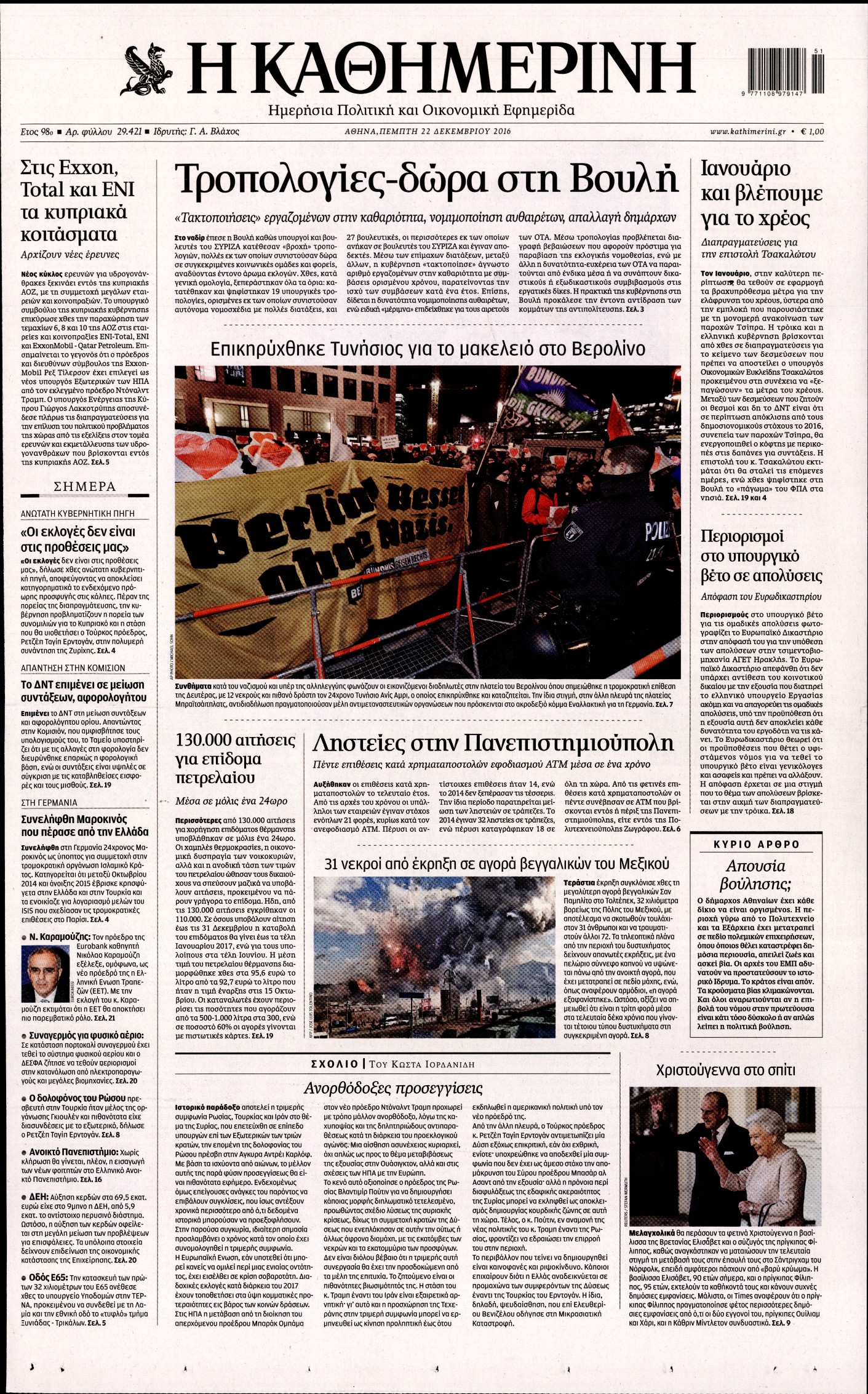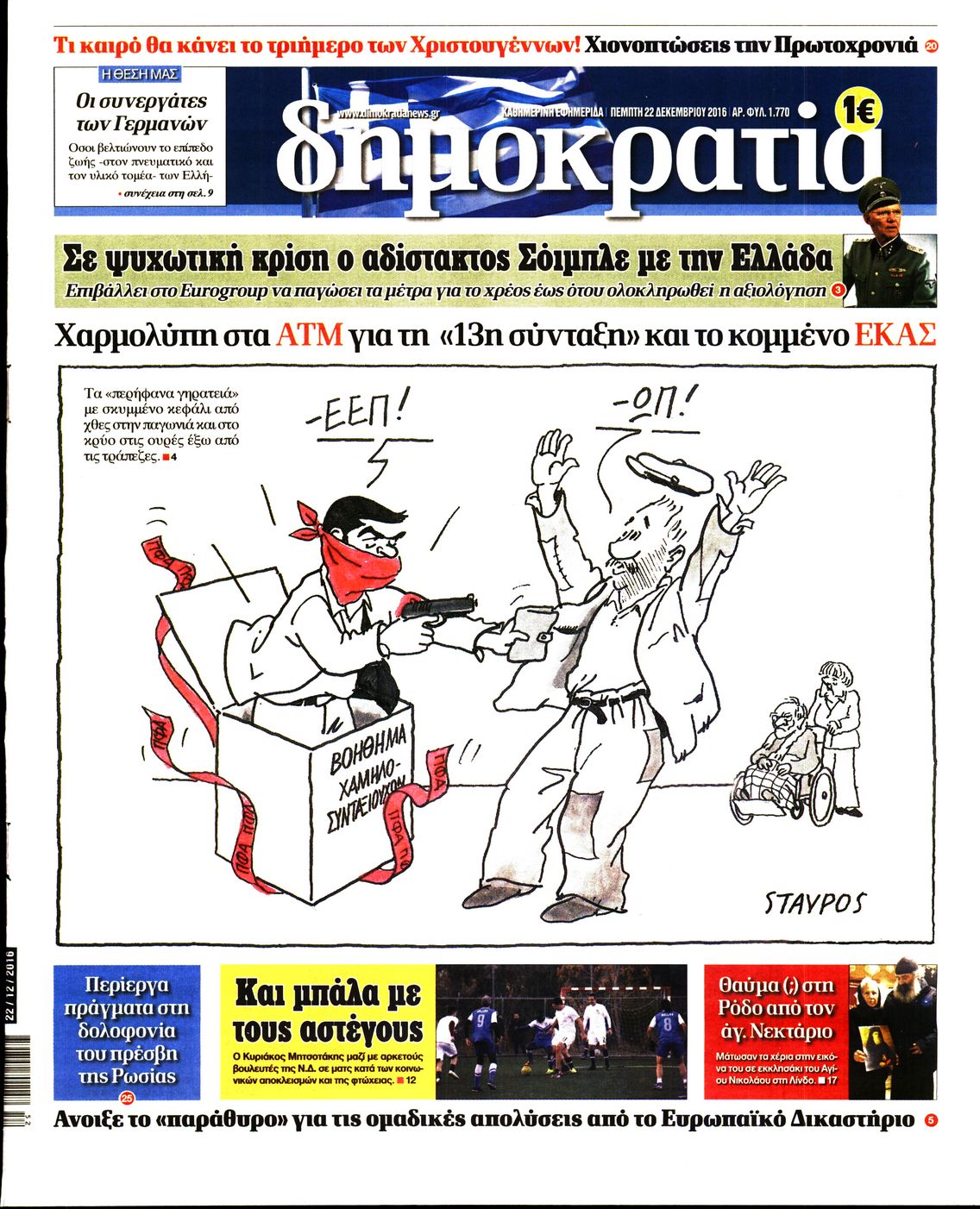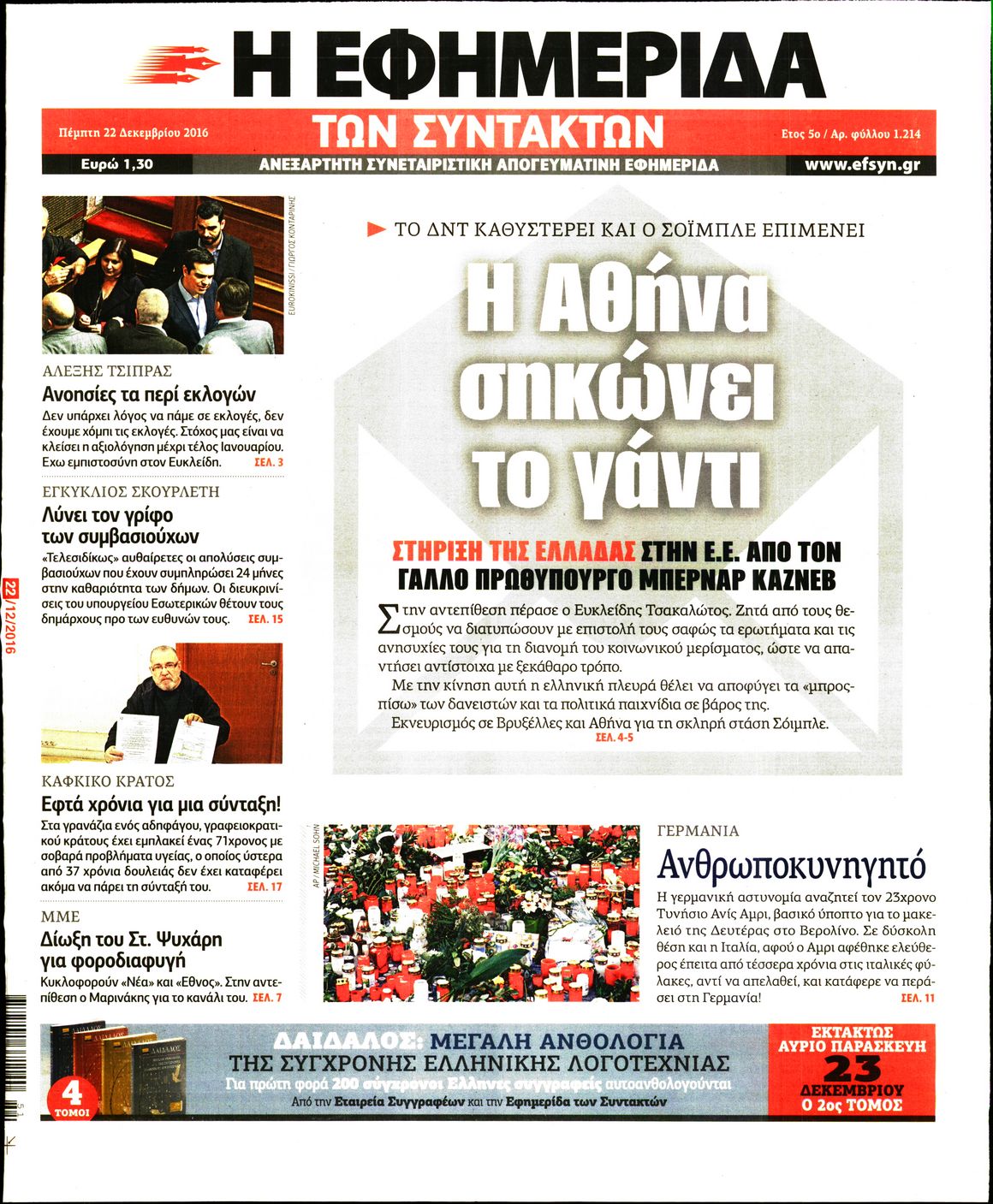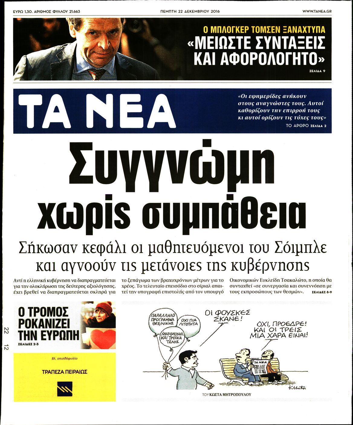 Οι πολιτικές εφημερίδες 22/12/2016 Enikos Newsroom 01:54, Πέμπτη 22 Δεκεμβρίου 2016 Media Διαβάστε τα σημερινά πρωτοσέλιδα των πολιτικών εφημερίδων: ΠΟΛΙΤΙΚΕΣ ΕΦΗΜΕΡΙΔΕΣ ΠΡΩΤΟΣΕΛΙΔΑ Μοιράσου το: σχολίασε κι εσύ (0 σχόλια) Ακολουθήστε το enikos.gr στο Google News και μάθετε πρώτοι όλες τις ειδήσεις Δείτε όλες τις τελευταίες ειδήσεις από την Ελλάδα και τον Κόσμο στο enikos.gr Ειδήσεις Ροή Ειδήσεων 6 ώρες πριν Εκτός ευρωομάδας ΣΥΡΙΖΑ ο Νίκος Παππάς μετά την επίθεση στον δημοσιογράφο Νίκο Γιαννόπουλο – Η μήνυση και οι νέες δηλώσεις 7 ώρες πριν «Αγριεύουν» οι αγρότες: «Δεν συντρέχει λόγος συνάντησης με τον πρωθυπουργό» – Ώρα αποφάσεων στη σύσκεψη της Πέμπτης 7 ώρες πριν Κυψέλη: Χωρίς την οικογένειά της δίπλα της απολογήθηκε η 16χρονη – «Της είχε επιτεθεί κάποιος για να την βιάσει, φοβήθηκε και κυκλοφορούσε με μαχαίρι» 6 ώρες πριν Politico: Το πρόβλημα της Ευρώπης δεν είναι το Βέλγιο αλλά ο Ντόναλντ Τραμπ 8 ώρες πριν Αλεξανδρούπολη: Πολυοργανική ανεπάρκεια λόγω υποσιτισμού η αιτία θανάτου του 3χρονου αγοριού 6 ώρες πριν Μυστήριο με τεράστιες κυκλικές πέτρες 200 κιλών – Ανακαλύφθηκαν τυχαία κατά τη διάρκεια οδικών έργων και κανείς δεν ξέρει από πού προέρχονται 7 ώρες πριν Ύπνος: Ειδικός εξηγεί τον πραγματικό λόγο που ξυπνάτε στις 4 τα ξημερώματα – Ο ρόλος των ορμονών και του κιρκάδιου ρυθμού 8 ώρες πριν Αριθμολογία: Οι άνθρωποι που έχουν γεννηθεί αυτές τις 4 ημερομηνίες, είναι τρυφεροί και αγαπούν ανιδιοτελώς 20 ώρες πριν 20 χρόνια τα Χριστούγεννα ξεκινούν στα Public με μεγάλη ποικιλία σε δώρα! 44 δευτερόλεπτα πριν Το Ποντίκι σήμερα Πέμπτη 18/12/2025 5 λεπτά πριν Εφημερεύοντα φαρμακεία σε Αθήνα και Θεσσαλονίκη (18/12) 8 λεπτά πριν Αλεξάνδρα Ούστα: «Αυτό που με τρέλανε στον σύζυγό μου ήταν η ορθολογική του σκέψη» 15 λεπτά πριν Μιχάλης Αεράκης: «Της είπα “θέλω να κάνουμε σπιτικό, αλλά υπάρχουν τρεις προϋποθέσεις…”» 22 λεπτά πριν Αυστραλία: Κυβερνητική δέσμευση για αυστηρότερα μέτρα κατά της υποκίνησης μίσους ENIKOS NETWORK Αϋπνία: Το κόλπο που θα σας βοηθήσει να κοιμηθείτε απόψε – Είναι απλό και έχει αποτέλεσμα 2,6 εκατομμύρια πολίτες έχουν ήδη εμβολιαστεί κατά της γρίπης ΕΛΣΤΑΤ: Τι δείχνουν τα νέα στοιχεία για τις ηλεκτρονικές παραγγελίες των επιχειρήσεων ΚΕΠΕ: Οι 3 διακριτές συμβολές των ΜμΕ και της μεταποίησης στην ελληνική οικονομία Χαρτογραφώντας το «σημείο χωρίς επιστροφή»: Για πρώτη φορά αποκαλύπτεται με λεπτομέρεια το ακανθώδες όριο της ατμόσφαιρας τ... Η Google καταργεί τη λειτουργία «dark web report» – Πώς θα μπορούν οι χρήστες να διαγράφουν τα δεδομένα τους περισσότερα 05:22 , Πέμπτη 18 Δεκεμβρίου 2025 Το Ποντίκι σήμερα Πέμπτη 18/12/2025 Διαβάστε το πρωτοσέλιδο της εφημερίδας «Το Ποντίκι» σήμερα 18/12/2025. 02:30 , Πέμπτη 18 Δεκεμβρίου 2025 Αλ Τσαντίρι Νιουζ: Η κόρη της Πάολα στο κοινό – Η ατάκα Λαζόπουλου που την έκανε να «κοκκινήσει» Γιορτινή διάθεση και ευχάριστες στιγμές γέμισε η αποψινή, τελευταία για το 2025, εκπομπή του «... 22:24 , Τετάρτη 17 Δεκεμβρίου 2025 Το Σπίτι Δίπλα Στο Ποτάμι: Σε κίνδυνο η υγεία του Απόστολου – Τι θα δούμε απόψε “Το Σπίτι Δίπλα στο Ποτάμι” ξετυλίγει το νήμα της ζωής των πέντε αδελφών με καταισ... 21:14 , Τετάρτη 17 Δεκεμβρίου 2025 Παιχνίδια Εκδίκησης: Θα καταφέρει ο Χρήστος να κλονίσει την εμπιστοσύνη της Μάγιας απέναντι στον Άγη; Τα «Παιχνίδια Εκδίκησης» έρχονται απόψε στις 22:30, στον Αντ1, με το τελευταίο επεισόδιο της χ... ΤΕΛΕΥΤΑΙΕΣ ΕΙΔΗΣΕΙΣ 5 λεπτά πριν Εφημερεύοντα φαρμακεία σε Αθήνα και Θεσσαλονίκη 