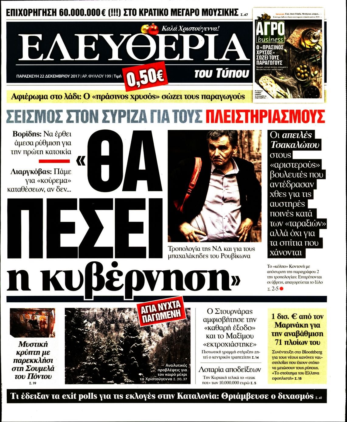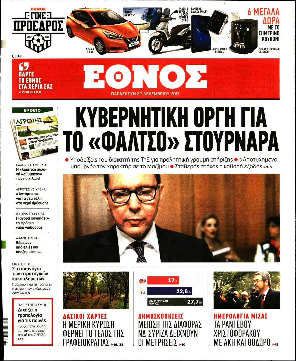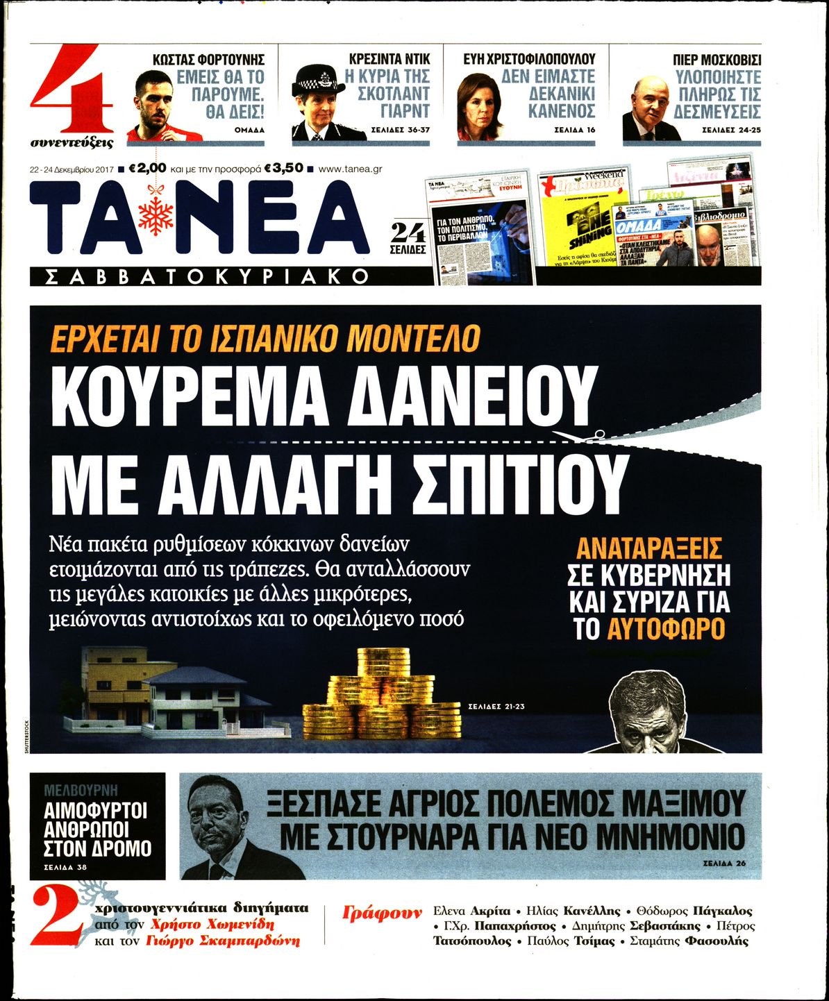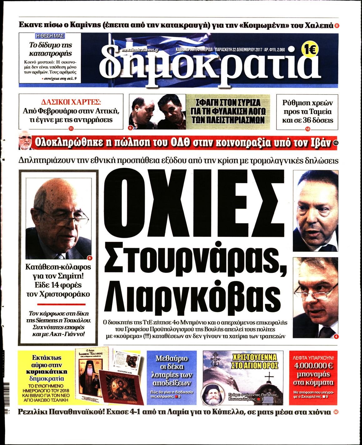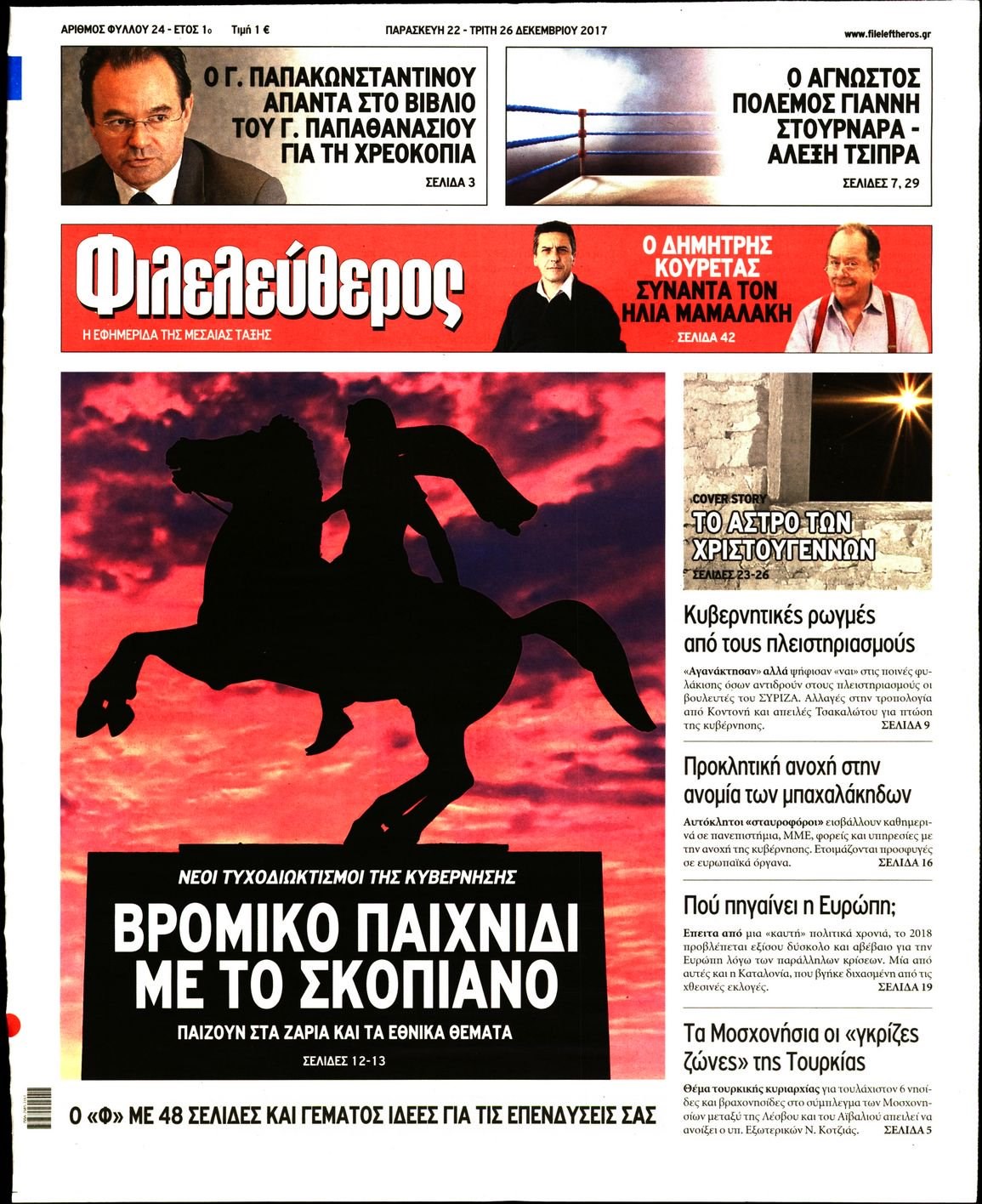 Οι πολιτικές εφημερίδες 22/12/2017 Enikos Newsroom 07:39, Παρασκευή 22 Δεκεμβρίου 2017 Media Διαβάστε τα σημερινά πρωτοσέλιδα των πολιτικών εφημερίδων: ΠΟΛΙΤΙΚΕΣ ΕΦΗΜΕΡΙΔΕΣ ΠΡΩΤΟΣΕΛΙΔΑ Μοιράσου το: σχολίασε κι εσύ (0 σχόλια) Ακολουθήστε το enikos.gr στο Google News και μάθετε πρώτοι όλες τις ειδήσεις Δείτε όλες τις τελευταίες ειδήσεις από την Ελλάδα και τον Κόσμο στο enikos.gr Ειδήσεις Ροή Ειδήσεων 1 ώρα πριν Πώς δρούσε το κύκλωμα που διακινούσε ναρκωτικά σε σχολεία – Υπέβαλαν σε βασανιστήρια όσους δεν τηρούσαν τους «κανόνες πειθαρχίας» 1 ώρα πριν Αγρότες: Γιορτές στα μπλόκα με ανοιχτά διόδια – Δικογραφία στα Ιωάννινα για το σήκωμα των μπαρών 5 ώρες πριν Αρχεία Έπσταϊν: Οι συγκλονιστικές φωτογραφίες – Ο Μάικλ Τζάκσον, ο Μικ Τζάγκερ και ο Κέβιν Σπέισι ανάμεσα στους διάσημους που απεικονίζονται 3 ώρες πριν Βέλγιο: Άγνωστοι έριξαν κόκκινη μπογιά στο προξενείο της Πολωνίας στις Βρυξέλλες 2 ώρες πριν ΕΛΑΣ: Συνελήφθησαν Υπαρχιπυροσβέστης και δύο ακόμη άτομα για κατοχή και διακίνηση ναρκωτικών ουσιών – Η καταγγελία και ο τιμοκατάλογος 2 ώρες πριν Η τύχη χαμογελά σε 3 ζώδια έως τις 28 Δεκεμβρίου – «Προσέξτε τις επιλογές σας και η επιμονή σας θα ανταμειφθεί» 6 ώρες πριν Διαιτολόγος αποκαλύπτει 9 πρωινές συνήθειες που «λιώνουν» το κοιλιακό λίπος – «Υποστηρίζουν την υγιεινή απώλεια βάρους» 7 ώρες πριν Οι 7 φράσεις που δεν λένε ποτέ οι συναισθηματικά έξυπνοι άνθρωποι κατά τη διάρκεια ενός καβγά 9 ώρες πριν Enerwave: Το νέο «ρεύμα» στη λιανική ενέργειας που αλλάζει την εμπειρία του καταναλωτή 3 λεπτά πριν Μικαέλα Μπέντχαους: Ο πρώτος άνθρωπος σε αναπηρικό αμαξίδιο που ταξίδεψε στο διάστημα – ΒΙΝΤΕΟ 12 λεπτά πριν NBC: Ο Νετανιάχου σχεδιάζει να ενημερώσει τον Τραμπ για πιθανά νέα πλήγματα εναντίον του Ιράν 21 λεπτά πριν Αττική: Εξαρθρώθηκε εγκληματική οργάνωση που έκλεβε οχήματα, τα παραποιούσε και τα μεταπωλούσε σε πολίτες – Πώς δρούσε το κύκλωμα 30 λεπτά πριν Κωνσταντίνος Αργυρός: «Δεν θέλω να ασχοληθώ με την πολιτική σε αυτή τη φάση – Μου έχουν γίνει προτάσεις» 38 λεπτά πριν Σέρρες: Διέρρηξαν διαμέρισμα και «βούτηξαν» ρολόγια συνολικής αξίας 15.000 ευρώ – 3 συλλήψεις ENIKOS NETWORK Η αποχή από την αναπαραγωγή παρατείνει τη ζωή στα ζώα, σύμφωνα με μελέτη – Τι ισχύει για τους ανθρώπους; Σημαντικές επαφές στις ΗΠΑ είχε ο υπουργός Υγείας Άδωνις Γεωργιάδης Στα ύψη ο χρυσός – Νέο ρεκόρ στην τιμή της λίρας, πόσο πωλείται Τέλη κυκλοφορίας 2026: Προσοχή στην προθεσμία εξόφλησής τους – Πώς διαμορφώνονται τα πρόστιμα σε περίπτωση καθυστέρησης Χαρτογραφώντας το «σημείο χωρίς επιστροφή»: Για πρώτη φορά αποκαλύπτεται με λεπτομέρεια το ακανθώδες όριο της ατμόσφαιρας τ... Η Google καταργεί τη λειτουργία «dark web report» – Πώς θα μπορούν οι χρήστες να διαγράφουν τα δεδομένα τους περισσότερα 14:04 , Σάββατο 20 Δεκεμβρίου 2025 Η Realnews αυτής της Κυριακής (21/12/2025) Με τίτλο: «Ασπίδα προστασίας για την Ελλάδα» κυκλοφορεί, αυτήν την Κυριακή, η Realnews. Σημαντ... 12:53 , Σάββατο 20 Δεκεμβρίου 2025 Να μ’ αγαπάς: Το παρελθόν έρχεται στο φως – Καταιγιστικές εξελίξεις στα τελευταία επεισόδια του 2025 Ο Άγγελος αποκαλύπτεται, η Φωτεινή ανησυχεί για τον Λευτέρη και η Ζωή έρχεται αντιμέτωπη με το... 11:41 , Σάββατο 20 Δεκεμβρίου 2025 «Η αγάπη δεν χάνεται ποτέ»: Η μικρού μήκους ταινία κινουμένων σχεδίων που θέτει ερωτήματα για τη ζωή και τον θάνατο Ο θάνατος είναι ένα από τα πιο σκληρά θέματα που καλείται να διαχειριστεί κάποιος στη διάρκεια... 09:30 , Σάββατο 20 Δε