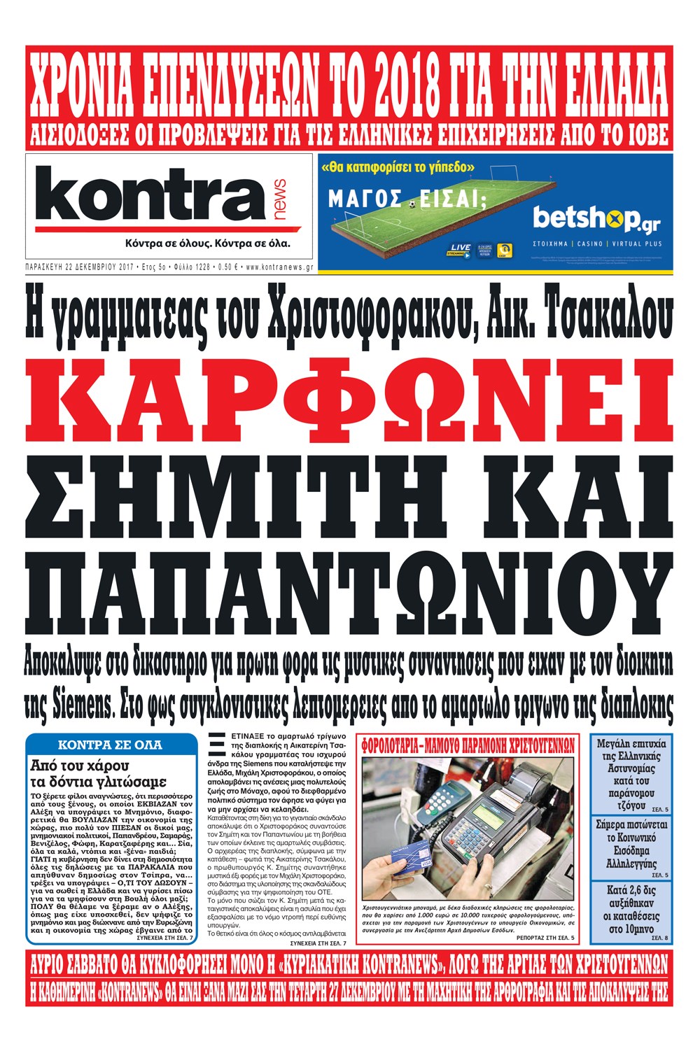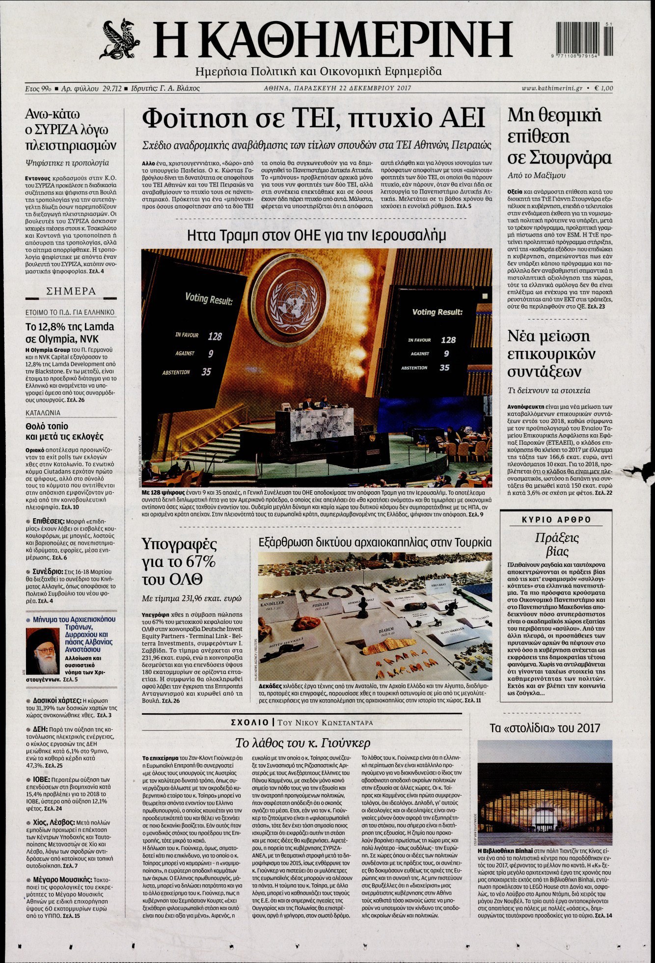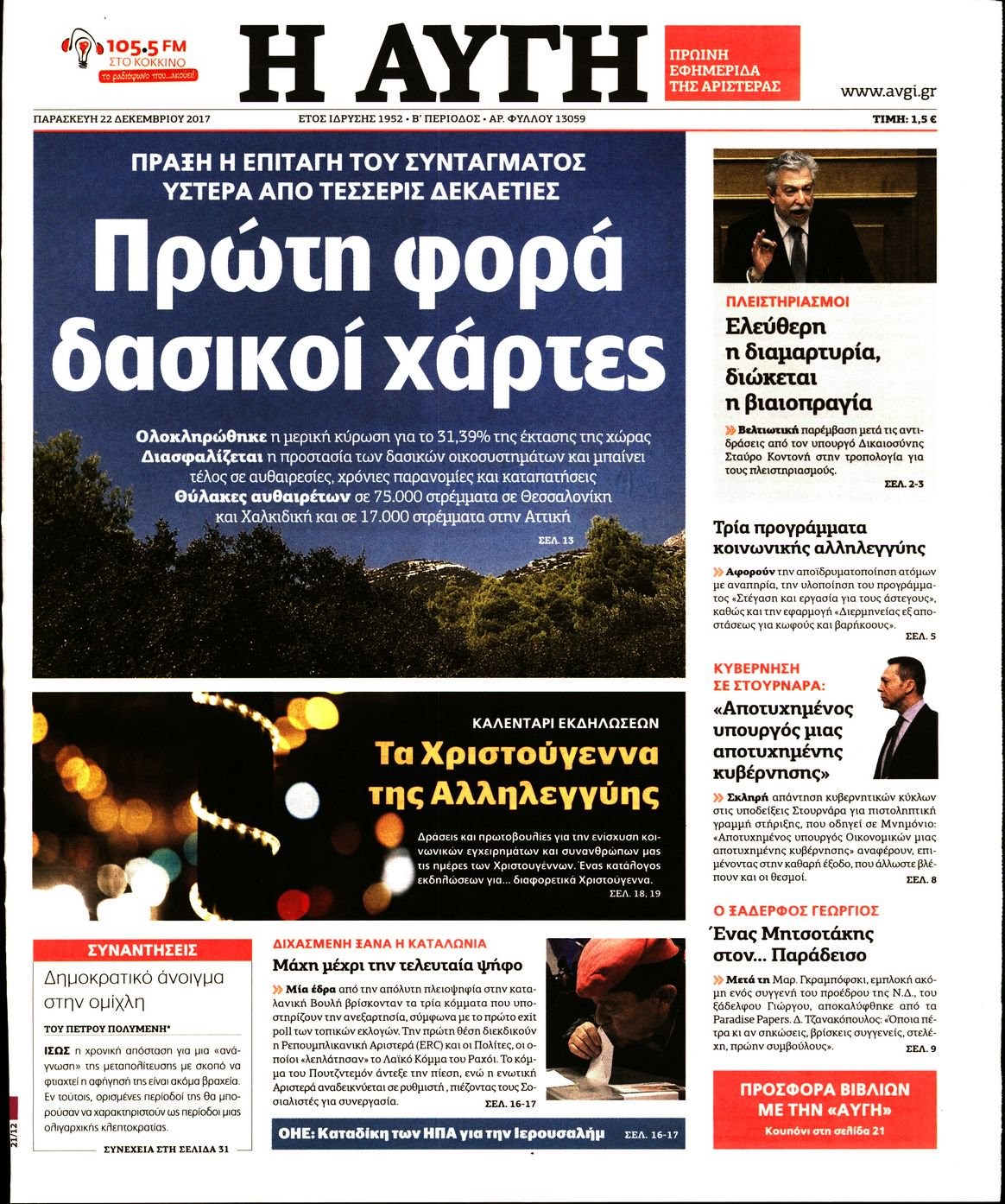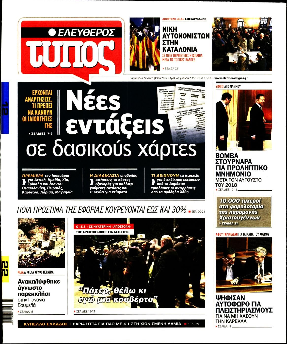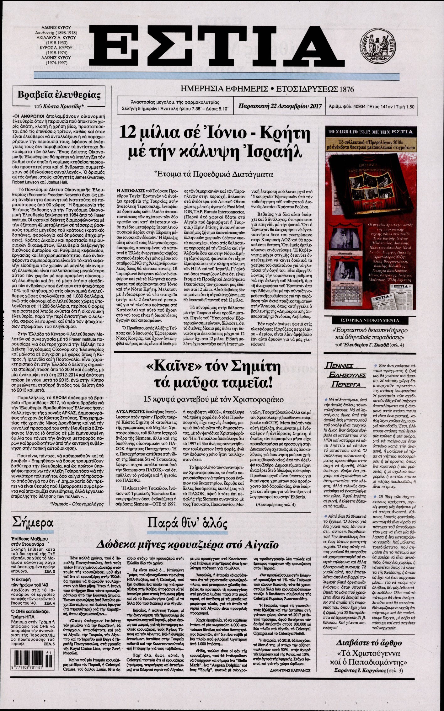 Οι πολιτικές εφημερίδες 22/12/2017 Enikos Newsroom 07:39, Παρασκευή 22 Δεκεμβρίου 2017 Media Διαβάστε τα σημερινά πρωτοσέλιδα των πολιτικών εφημερίδων: ΠΟΛΙΤΙΚΕΣ ΕΦΗΜΕΡΙΔΕΣ ΠΡΩΤΟΣΕΛΙΔΑ Μοιράσου το: σχολίασε κι εσύ (0 σχόλια) Ακολουθήστε το enikos.gr στο Google News και μάθετε πρώτοι όλες τις ειδήσεις Δείτε όλες τις τελευταίες ειδήσεις από την Ελλάδα και τον Κόσμο στο enikos.gr Ειδήσεις Ροή Ειδήσεων 1 ώρα πριν Πώς δρούσε το κύκλωμα που διακινούσε ναρκωτικά σε σχολεία – Υπέβαλαν σε βασανιστήρια όσους δεν τηρούσαν τους «κανόνες πειθαρχίας» 1 ώρα πριν Αγρότες: Γιορτές στα μπλόκα με ανοιχτά διόδια – Δικογραφία στα Ιωάννινα για το σήκωμα των μπαρών 5 ώρες πριν Αρχεία Έπσταϊν: Οι συγκλονιστικές φωτογραφίες – Ο Μάικλ Τζάκσον, ο Μικ Τζάγκερ και ο Κέβιν Σπέισι ανάμεσα στους διάσημους που απεικονίζονται 3 ώρες πριν Βέλγιο: Άγνωστοι έριξαν κόκκινη μπογιά στο προξενείο της Πολωνίας στις Βρυξέλλες 2 ώρες πριν ΕΛΑΣ: Συνελήφθησαν Υπαρχιπυροσβέστης και δύο ακόμη άτομα για κατοχή και διακίνηση ναρκωτικών ουσιών – Η καταγγελία και ο τιμοκατάλογος 2 ώρες πριν Η τύχη χαμογελά σε 3 ζώδια έως τις 28 Δεκεμβρίου – «Προσέξτε τις επιλογές σας και η επιμονή σας θα ανταμειφθεί» 6 ώρες πριν Διαιτολόγος αποκαλύπτει 9 πρωινές συνήθειες που «λιώνουν» το κοιλιακό λίπος – «Υποστηρίζουν την υγιεινή απώλεια βάρους» 7 ώρες πριν Οι 7 φράσεις που δεν λένε ποτέ οι συναισθηματικά έξυπνοι άνθρωποι κατά τη διάρκεια ενός καβγά 9 ώρες πριν Enerwave: Το νέο «ρεύμα» στη λιανική ενέργειας που αλλάζει την εμπειρία του καταναλωτή 3 λεπτά πριν Μικαέλα Μπέντχαους: Ο πρώτος άνθρωπος σε αναπηρικό αμαξίδιο που ταξίδεψε στο διάστημα – ΒΙΝΤΕΟ 12 λεπτά πριν NBC: Ο Νετανιάχου σχεδιάζει να ενημερώσει τον Τραμπ για πιθανά νέα πλήγματα εναντίον του Ιράν 21 λεπτά πριν Αττική: Εξαρθρώθηκε εγκληματική οργάνωση που έκλεβε οχήματα, τα παραποιούσε και τα μεταπωλούσε σε πολίτες – Πώς δρούσε το κύκλωμα 30 λεπτά πριν Κωνσταντίνος Αργυρός: «Δεν θέλω να ασχοληθώ με την πολιτική σε αυτή τη φάση – Μου έχουν γίνει προτάσεις» 38 λεπτά πριν Σέρρες: Διέρρηξαν διαμέρισμα και «βούτηξαν» ρολόγια συνολικής αξίας 15.000 ευρώ – 3 συλλήψεις ENIKOS NETWORK Η αποχή από την αναπαραγωγή παρατείνει τη ζωή στα ζώα, σύμφωνα με μελέτη – Τι ισχύει για τους ανθρώπους; Σημαντικές επαφές στις ΗΠΑ είχε ο υπουργός Υγείας Άδωνις Γεωργιάδης Στα ύψη ο χρυσός – Νέο ρεκόρ στην τιμή της λίρας, πόσο πωλείται Τέλη κυκλοφορίας 2026: Προσοχή στην προθεσμία εξόφλησής τους – Πώς διαμορφώνονται τα πρόστιμα σε περίπτωση καθυστέρησης Χαρτογραφώντας το «σημείο χωρίς επιστροφή»: Για πρώτη φορά αποκαλύπτεται με λεπτομέρεια το ακανθώδες όριο της ατμόσφαιρας τ... Η Google καταργεί τη λειτουργία «dark web report» – Πώς θα μπορούν οι χρήστες να διαγράφουν τα δεδομένα τους περισσότερα 14:04 , Σάββατο 20 Δεκεμβρίου 2025 Η Realnews αυτής της Κυριακής (21/12/2025) Με τίτλο: «Ασπίδα προστασίας για την Ελλάδα» κυκλοφορεί, αυτήν την Κυριακή, η Realnews. Σημαντ... 12:53 , Σάββατο 20 Δεκεμβρίου 2025 Να μ’ αγαπάς: Το παρελθόν έρχεται στο φως – Καταιγιστικές εξελίξεις στα τελευταία επεισόδια του 2025 Ο Άγγελος αποκαλύπτεται, η Φωτεινή ανησυχεί για τον Λευτέρη και η Ζωή έρχεται αντιμέτωπη με το... 11:41 , Σάββατο 20 Δεκεμβρίου 2025 «Η αγάπη δεν χάνεται ποτέ»: Η μικρού μήκους ταινία κινουμένων σχεδίων που θέτει ερωτήματα για τη ζωή και τον θάνατο Ο θάνατος είναι ένα από τα πιο σκληρά θέματα που καλείται να διαχειριστεί κάποιος στη διάρκεια... 09:30 , Σάββατο 20 Δε