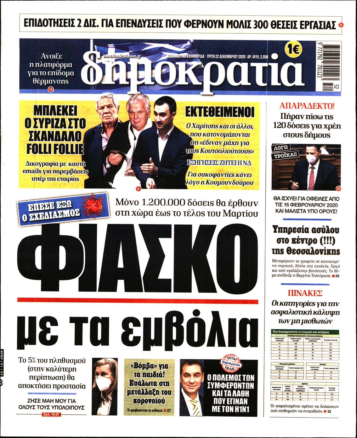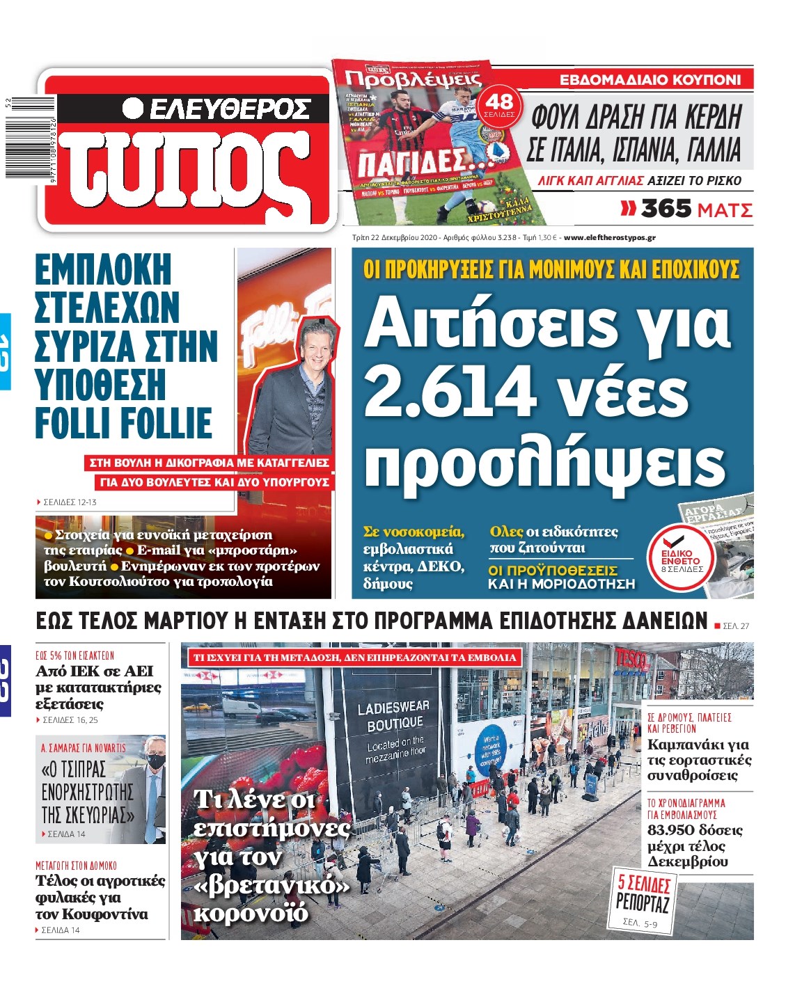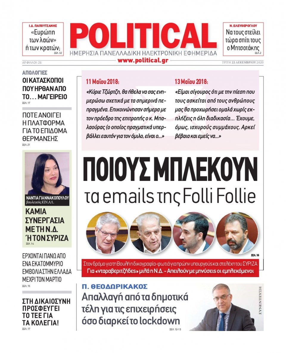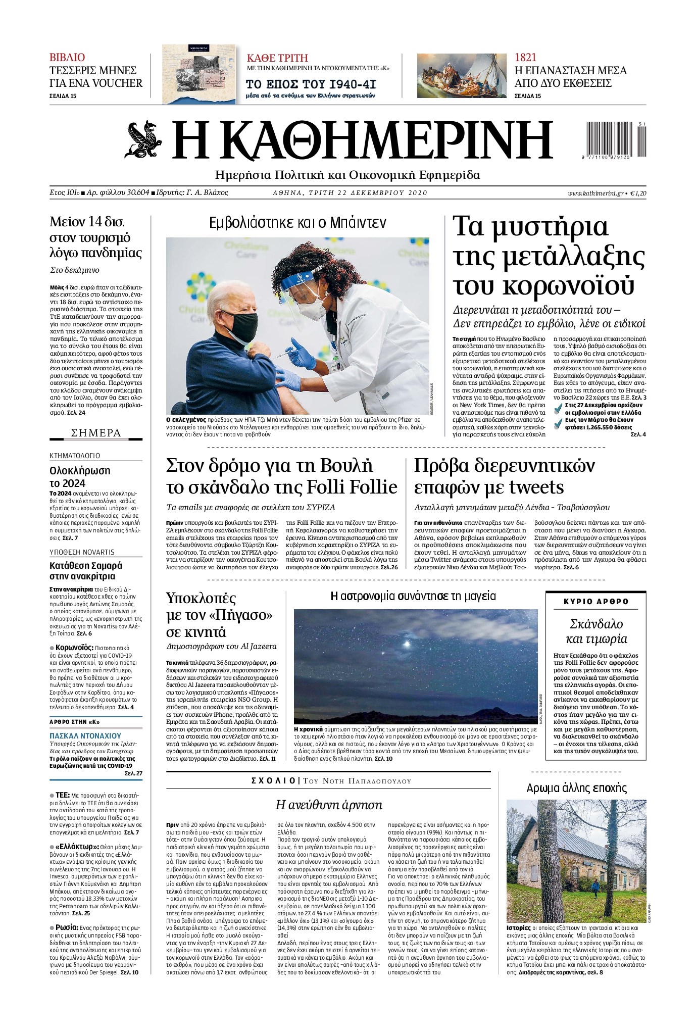 Οι πολιτικές εφημερίδες 22/12/2020 Διονύσης Νίκκας 06:14, Τρίτη 22 Δεκεμβρίου 2020 Media Διαβάστε τα πρωτοσέλιδα των πολιτικών εφημερίδων… ΕΦΗΜΕΡΙΔΕΣ ΠΟΛΙΤΙΚΕΣ ΕΦΗΜΕΡΙΔΕΣ ΠΡΩΤΟΣΕΛΙΔΑ Μοιράσου το: σχολίασε κι εσύ (0 σχόλια) Ακολουθήστε το enikos.gr στο Google News και μάθετε πρώτοι όλες τις ειδήσεις Δείτε όλες τις τελευταίες ειδήσεις από την Ελλάδα και τον Κόσμο στο enikos.gr Ειδήσεις Ροή Ειδήσεων 4 ώρες πριν Μεσόγειος: Η διαδρομή του ρωσικού τάνκερ «Qendil» και η στοχευμένη επίθεση της Ουκρανίας με drone – Ο Πούτιν προειδοποίησε για αντίποινα 59 λεπτά πριν Αγρότες: Έκλεισαν για μία ώρα την παρακαμπτήρια της Ιόνιας Οδού στη θέση Χαλίκι 3 ώρες πριν Εμπλοκή και αερομαχίες με οπλισμένα τουρκικά F-16 στο Αιγαίο 2 ώρες πριν Πούτιν: «Ναι, είμαι ερωτευμένος» – Βίντεο από τη σπάνια προσωπική παραδοχή του 1 ώρα πριν Ανδρέας Λυκουρέντζος: Υπέβαλε την παραίτησή του ο πρόεδρος του ΕΛΓΑ, αλλά δεν έγινε δεκτή – Όλο το παρασκήνιο 1 ώρα πριν Αριθμολογία: Οι άνθρωποι που έχουν γεννηθεί αυτές τις 4 ημερομηνίες, συχνά παρεξηγούνται – «Η καλοσύνη τους κρύβει τεράστια δύναμη» 3 ώρες πριν Μήπως έχετε χάσει τον εαυτό σας στη σχέση σας; 7 «αθόρυβες» υποχωρήσεις που μάλλον κάνατε, χωρίς να το συνειδητοποιήσετε 2 ώρες πριν Ξεχάστε το καθάρισμα το Σαββατοκύριακο: Ο «κανόνας των 20 λεπτών» που θα σας λύσει τα χέρια 5 ώρες πριν Κουίζ για την παλιά Αθήνα: Αναγνωρίζετε την περιοχή; Έχετε περάσει 100% από εκεί 4 λεπτά πριν Τραμπ: Δεν αποκλείει την πιθανότητα ενός πολέμου στη Βενεζουέλα – «Ο Μαδούρο ξέρει καλύτερα από τον καθένα τι ακριβώς θέλω» 6 λεπτά πριν Κηφισιά: Με πολλές απουσίες κόντρα στον Ολυμπιακό – «Last dance» για τον Τεττέη 14 λεπτά πριν Ύπνος: Μια κρυφή κατάσταση του εγκεφάλου πριν από τον ύπνο μπορεί να είναι το “κλειδί” για υψηλή ευφυΐα και δημιουργικότητα 19 λεπτά πριν ΕΕ: «Κάποια στιγμή θα χρησιμοποιήσουμε τα ρωσικά περιουσιακά στοιχεία» δήλωσε ο πρόεδρος του ΕΛΚ 23 λεπτά πριν Conference League: Καλύτερη επίθεση η ΑΕΚ στη διοργάνωση και 2η σε προσπάθειες στην εστία – Ξεχωρίζουν Πινέδα, Ελίασον και Ρότα ENIKOS NETWORK Το ΕΚΑΒ τιμήθηκε από την Ακαδημία Αθηνών για τα 40 χρόνια προσφοράς του Έχετε πραγματικά μεγάλη καρδιά; 10 χαρακτηριστικά όσων έχουν καλοσύνη Όμιλος ΔΕΗ: Νέα ορόσημα και ενισχυμένη διαφάνεια στην ετήσια Έκθεση Βιώσιμης Ανάπτυξης Έρχονται νέες προσλήψεις σε Δήμο – Όλες οι λεπτομέρειες Χαρτογραφώντας το «σημείο χωρίς επιστροφή»: Για πρώτη φορά αποκαλύπτεται με λεπτομέρεια το ακανθώδες όριο της ατμόσφαιρας τ... Η Google καταργεί τη λειτουργία «dark web report» – Πώς θα μπορούν οι χρήστες να διαγράφουν τα δεδομένα τους περισσότερα 20:37 , Παρασκευή 19 Δεκεμβρίου 2025 Don’t Forget The Lyrics: Η Έλλη Κοκκίνου υποδέχεται 4 παίκτες που θα κάνουν τα πάντα για να μη χάσουν ούτε… μισή λέξη από τους στίχους Το «Don’t Forget The Lyrics» επιστρέφει απόψε, Παρασκευή 19 Δεκεμβρίου, στις 21:00 με νέο επει... 19:31 , Παρασκευή 19 Δεκεμβρίου 2025 GNTM: Απόψε ο μεγάλος τελικός για τους 4 φιναλίστ Έπειτα από μήνες γεμάτους μόδα, δημιουργία και έντονες αναμετρήσεις, το GNTM 2025 κορυφώνεται,... 18:11 , Παρασκευή 19 Δεκεμβρίου 2025 Το σόι σου: Ο Άρης έρχεται στην Ελλάδα για τις γιορτές των Χριστουγέννων – Τι θα δούμε στο αποψινό εορταστικό επεισόδιο Ένα απολαυστικό, εορταστικό επεισόδιο της σειράς “Το σόι σου”, γεμάτο ευτράπελα αλ... 15:15 , Παρασκευή 19 Δεκεμβρίου 2025 Την Κυριακή με τη Realnews: Ό,τι και αν αγοράσεις, σκανάρεις και κερδίζεις! Την Κυριακή με τη Realnews: Ό,τι και αν αγοράσεις, σ