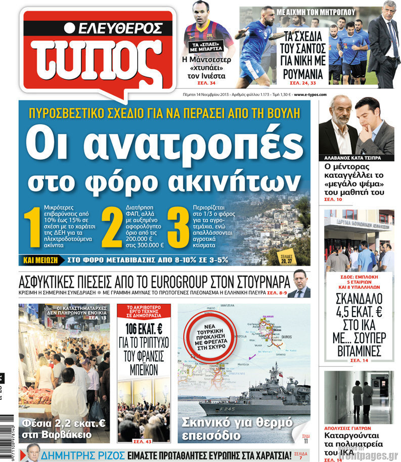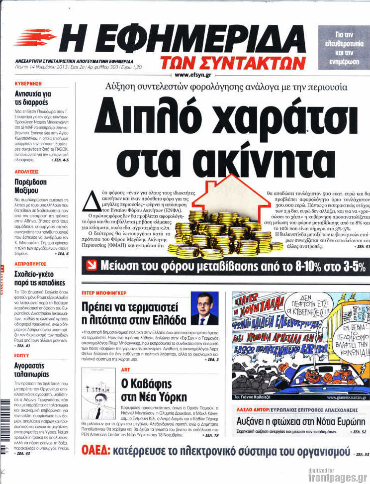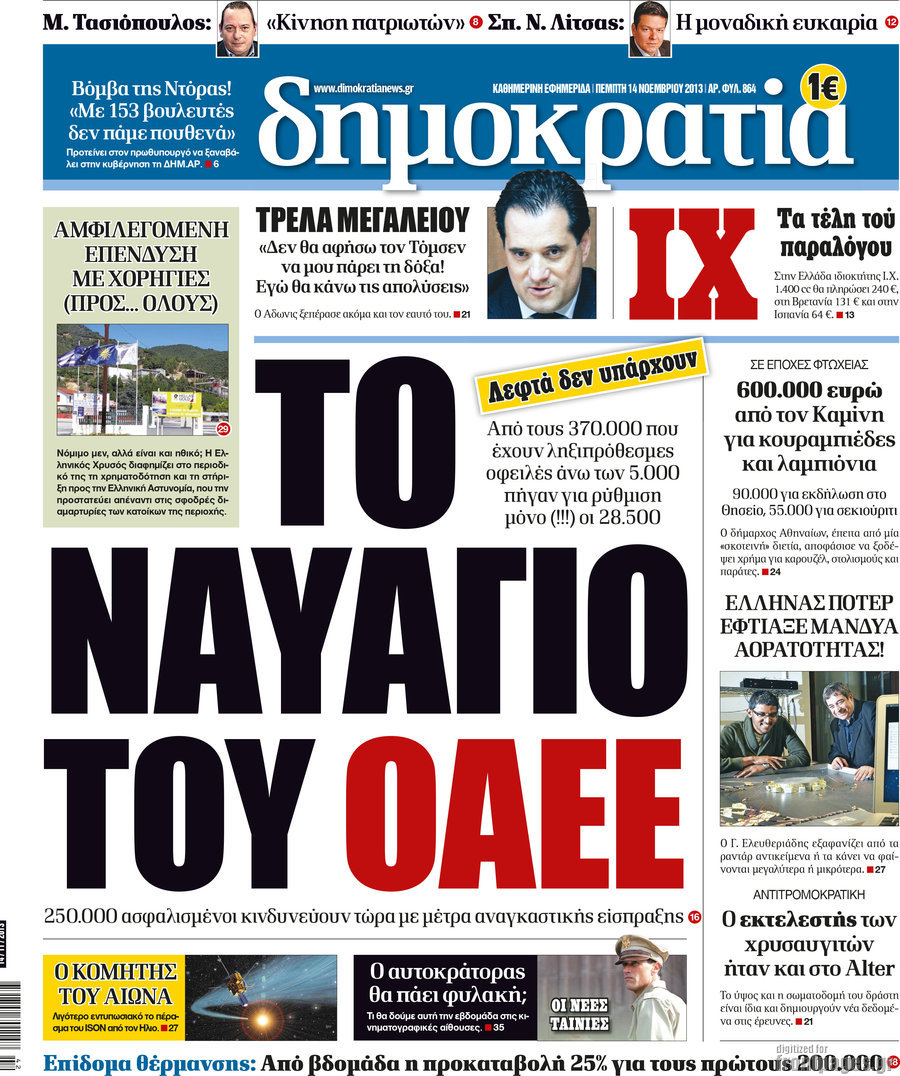 Οι πολιτικές εφημερίδες Enikos Newsroom 08:13, Πέμπτη 14 Νοεμβρίου 2013 Media Οι πολιτικές εφημερίδες Διαβάστε τα πρωτοσέλιδα των πολιτικών εφημερίδων: ΕΦΗΜΕΡΙΔΕΣ ΠΟΛΙΤΙΚΕΣ ΕΦΗΜΕΡΙΔΕΣ ΠΡΩΤΟΣΕΛΙΔΑ Μοιράσου το: σχολίασε κι εσύ (0 σχόλια) Ακολουθήστε το enikos.gr στο Google News και μάθετε πρώτοι όλες τις ειδήσεις Δείτε όλες τις τελευταίες ειδήσεις από την Ελλάδα και τον Κόσμο στο enikos.gr Ειδήσεις Ροή Ειδήσεων 8 ώρες πριν Χριστούγεννα στα μπλόκα: Επιμένουν στις κινητοποιήσεις τους οι αγρότες – Ανοίγουν τα διόδια το Σαββατοκύριακο 9 ώρες πριν Ουκρανία: Η άνευ προηγουμένου επίθεση σε ρωσικό τάνκερ στη Μεσόγειο και το μήνυμα προς στον Πούτιν – Το «μακρύ χέρι» του Κιέβου 8 ώρες πριν Πούτιν: Τα μηνύματα σε Ευρώπη και ΝΑΤΟ από το μαραθώνιο «σόου» του – Η απαίτηση για «σεβασμό» και η ειρήνη «με τους όρους» της Μόσχας 7 ώρες πριν ΗΠΑ: Η κυβέρνηση του Ντόναλντ Τραμπ άρχισε να δημοσιοποιεί τα αρχεία Έπσταϊν 7 ώρες πριν Άνω Λιόσια: Πυροβολισμοί σε επιχείρηση με χαλιά – Εντοπίστηκαν 10 κάλυκες 51 λεπτά πριν Αυγά: Πόσα μπορείτε να τρώτε την ημέρα με ασφάλεια για μέγιστη πρόσληψη πρωτεΐνης 1 ώρα πριν Τα ζώδια σήμερα, Σάββατο 20 Δεκεμβρίου: Παρθένοι, το σύμπαν σας δίνει το κλειδί 8 ώρες πριν Ανακαλύφθηκαν αρχαία χρυσά νομίσματα 2.200 ετών που απεικονίζουν τον θεό Απόλλωνα – Η άγνωστη σύνδεση με τον Φίλιππο Β΄ της Μακεδονίας 9 ώρες πριν Ύπνος: Μια κρυφή κατάσταση του εγκεφάλου πριν από τον ύπνο μπορεί να είναι το “κλειδί” για υψηλή ευφυΐα και δημιουργικότητα 12 λεπτά πριν Κίριλ Ντμίτριεφ: Στις ΗΠΑ ο απεσταλμένος της Ρωσίας για συνομιλίες με τους ομολόγους του, Γουίτκοφ και Κούσνερ 19 λεπτά πριν ΔΕΔΔΗΕ: Διακοπές ρεύματος σήμερα (20/12) στην Αθήνα και σε άλλες 7 περιοχές της Αττικής 28 λεπτά πριν Κολομβία: Είκοσι χρόνια κάθειρξη σε πρώην ανώτερο αξιωματικό για 72 εκτελέσεις αμάχων 35 λεπτά πριν Οπτική ψευδαίσθηση: Μόνο αν είσαι ο Σέρλοκ Χολμς θα βρεις τον αριθμό «87» σε 7 δευτερόλεπτα 43 λεπτά πριν Σαρωτικοί οι έλεγχοι στους δρόμους ενόψει εορτών – Μπλόκα της τροχαίας σε κεντρικές αρτηρίες της Αττικής ENIKOS NETWORK Το ΕΚΑΒ τιμήθηκε από την Ακαδημία Αθηνών για τα 40 χρόνια προσφοράς του Έχετε πραγματικά μεγάλη καρδιά; 10 χαρακτηριστικά όσων έχουν καλοσύνη Αναστολή μέτρων αναγκαστικής εκτέλεσης για κτηνοτρόφους που πλήττονται από την ευλογιά των αιγοπροβάτων Πλήρης επάρκεια προϊόντων στις λαϊκές της Αττικής, παρά τις αγροτικές κινητοποιήσεις – Τι απαντούν οι πωλητές Χαρτογραφώντας το «σημείο χωρίς επιστροφή»: Για πρώτη φορά αποκαλύπτεται με λεπτομέρεια το ακανθώδες όριο της ατμόσφαιρας τ... Η Google καταργεί τη λειτουργία «dark web report» – Πώς θα μπορούν οι χρήστες να διαγράφουν τα δεδομένα τους περισσότερα 05:48 , Σάββατο 20 Δεκεμβρίου 2025 Οι οικονομικές εφημερίδες 20/12/2025 Διαβάστε τα πρωτοσέλιδα από τις οικονομικές εφημερίδες, σήμερα 20/12/2025. 05:43 , Σάββατο 20 Δεκεμβρίου 2025 Οι αθλητικές εφημερίδες 20/12/2025 Διαβάστε τα πρωτοσέλιδα από τις αθλητικές εφημερίδες, σήμερα 20/12/2025. 05:38 , Σάββατο 20 Δεκεμβρίου 2025 Οι πολιτικές εφημερίδες 20/12/2025 Διαβάστε τα πρωτοσέλιδα από τις πολιτικές εφημερίδες, σήμερα 20/12/2025. 04:20 , Σάββατο 20 Δεκεμβρίου 2025 Αγγελική Νικολούλη: Τα συλλυπητήρια για την απώλεια της Ειρήνης Μαρινάκη Τα συλληπητήρια στον πρόεδρο του Mega, τον Βαγγέλη Μαρινάκη, για την απώλεια της μητέρας του Ε... ΤΕΛΕΥΤΑΙΕΣ ΕΙΔΗΣΕΙΣ 12 λεπτά πριν Κίριλ Ντμίτριεφ: Στις ΗΠΑ ο απεσταλμένος της Ρωσίας... 19 λεπτά πριν ΔΕΔΔΗΕ: Διακοπές ρεύματος σ