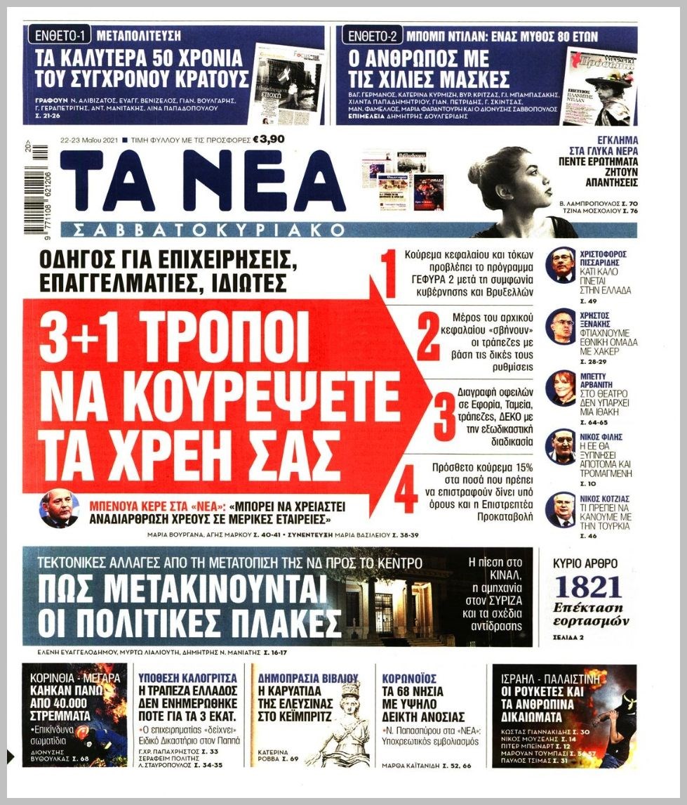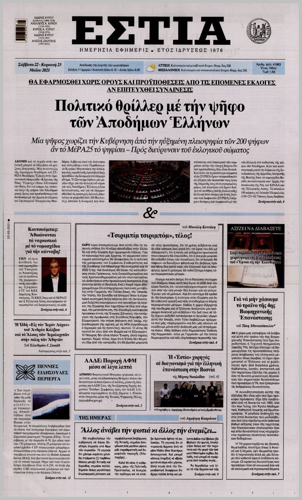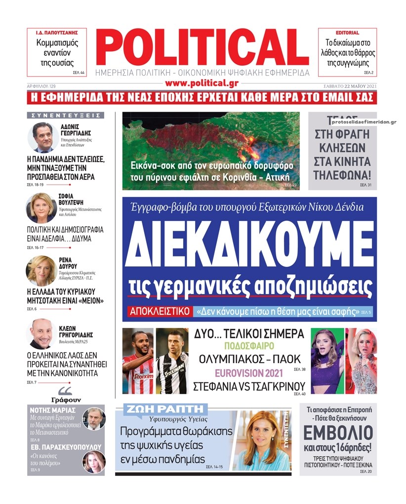 Οι πολιτικές εφημερίδες 22/5/2021 Διονύσης Νίκκας 07:13, Σάββατο 22 Μαΐου 2021 Media Διαβάστε τα πρωτοσέλιδα των πολιτικών εφημερίδων… ΕΦΗΜΕΡΙΔΕΣ ΠΡΩΤΟΣΕΛΙΔΑ Μοιράσου το: σχολίασε κι εσύ (0 σχόλια) Ακολουθήστε το enikos.gr στο Google News και μάθετε πρώτοι όλες τις ειδήσεις Δείτε όλες τις τελευταίες ειδήσεις από την Ελλάδα και τον Κόσμο στο enikos.gr Ειδήσεις Ροή Ειδήσεων 1 ώρα πριν Γιορτές με μπλόκα για τους αγρότες: Ανοίγουν διόδια και μοιράζουν προϊόντα στους ταξιδιώτες 2 ώρες πριν Τα αρχεία του Έπσταϊν αποκαλύπτουν φωτογραφία του έκπτωτου πρίγκιπα Άντριου – Είναι ξαπλωμένος στην αγκαλιά 5 γυναικών 43 λεπτά πριν Νέες ταυτότητες: Μεγάλη αναμονή για ραντεβού στην Αττική – Τέλος τα ταξίδια εκτός Ελλάδος από τον Αύγουστο για όσους δεν έχουν αλλάξει 2 ώρες πριν Εξαφάνιση 33χρονου γιατρού στην Κρήτη: «Άναψα τα φώτα, τρόμαξε και άρχισε να τρέχει στα χωράφια» – Η τελευταία διαδρομή και η μαρτυρία «κλειδί» 3 ώρες πριν Ο «χάρτης» με τις αυξήσεις και τις φοροελαφρύνσεις του 2026 – Ποιοι και πόσα κερδίζουν 2 ώρες πριν Μία νέα «χρυσή» περίοδος αρχίζει για 3 ζώδια από σήμερα – «Μία αναπάντεχη ευκαιρία οδηγεί στην επιτυχία» 6 ώρες πριν Αυγά: Πόσα μπορείτε να τρώτε την ημέρα με ασφάλεια για μέγιστη πρόσληψη πρωτεΐνης 4 ώρες πριν Αρχαιολόγοι ανακάλυψαν σε χωράφι απεικόνιση 600 ετών ενός Αγίου – Τα στοιχεία που δείχνουν ότι μαρτύρησε 3 ώρες πριν Αγχώνεται για το χριστουγεννιάτικο δώρο που πήρε στην πλούσια σύντροφό του – «Φοβάμαι πως θα το βρει φθηνιάρικο, φοράει βραχιόλια Cartier» 4 λεπτά πριν Βούλα: Συνελήφθη 24χρονος με 69 κιλά ακατέργαστης κάνναβης – Κυκλοφορούσε με κλεμμένο αυτοκίνητο 12 λεπτά πριν «Η αγάπη δεν χάνεται ποτέ»: Η μικρού μήκους ταινία κινουμένων σχεδίων που θέτει ερωτήματα για τη ζωή και τον θάνατο 20 λεπτά πριν Στέφανος Παπαδόπουλος: Η συνέντευξη μετά τη μήνυση στον Γιώργο Μαζωνάκη – «Δεν θέλω να τα βρούμε εξωδικαστικά» 27 λεπτά πριν Τραγωδία στην άσφαλτο στα Χανιά: Νεκρός 37χρονος οδηγός ΙΧ – Τον βρήκαν ώρες μετά το τροχαίο 36 λεπτά πριν Τα Labubu «μετακομίζουν» στο Χόλιγουντ: Η Sony Pictures ετοιμάζει live-action ταινία με τον σκηνοθέτη του «Wonka» ENIKOS NETWORK Είστε μόνιμα απρόσεκτοι; 3 σημάδια που δείχνουν ότι μπορεί να είναι σύμπτωμα πάθησης Πόσα κιλά παίρνουμε πραγματικά τα Χριστούγεννα, σύμφωνα με την επιστήμη – Πώς να το αποτρέψουμε; e-ΕΦΚΑ και ΔΥΠΑ: Έρχονται νέες πληρωμές έως τις 24 Δεκεμβρίου – Ποιοι πάνε ταμείο Επίδομα παιδιού: Τι αλλάζει από το 2026 – Το όφελος από τις φορολογικές ελαφρύνσεις Χαρτογραφώντας το «σημείο χωρίς επιστροφή»: Για πρώτη φορά αποκαλύπτεται με λεπτομέρεια το ακανθώδες όριο της ατμόσφαιρας τ... Η Google καταργεί τη λειτουργία «dark web report» – Πώς θα μπορούν οι χρήστες να διαγράφουν τα δεδομένα τους περισσότερα 11:41 , Σάββατο 20 Δεκεμβρίου 2025 «Η αγάπη δεν χάνεται ποτέ»: Η μικρού μήκους ταινία κινουμένων σχεδίων που θέτει ερωτήματα για τη ζωή και τον θάνατο Ο θάνατος είναι ένα από τα πιο σκληρά θέματα που καλείται να διαχειριστεί κάποιος στη διάρκεια... 09:30 , Σάββατο 20 Δεκεμβρίου 2025 «Porto Leone: Στη γειτονιά με τα κόκκινα φανάρια» – Ο Χρόνης αποκαλύπτει στην Αλεξάνδρα το μυστικό για το παιδί της Λένας Η μεγάλη δραματική σειρά του Apha «Porto Leone: Στη γειτονιά με τα κόκκινα φανάρια» μας μεταφέ... 08:14 , Σάββατο 20 Δεκεμβρίου 2025 Τρομεροί γονείς: Η Μαρία Καβογιάννη εισβάλλει στο σπίτι της οικογένειας Στεφανίδη Όσα θα δούμε στο νέο διπλό επεισόδιο της σειράς «Τρομεροί γονείς», σήμερα 