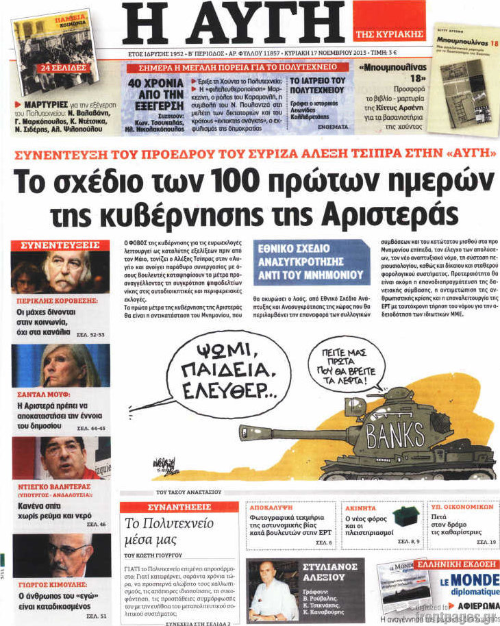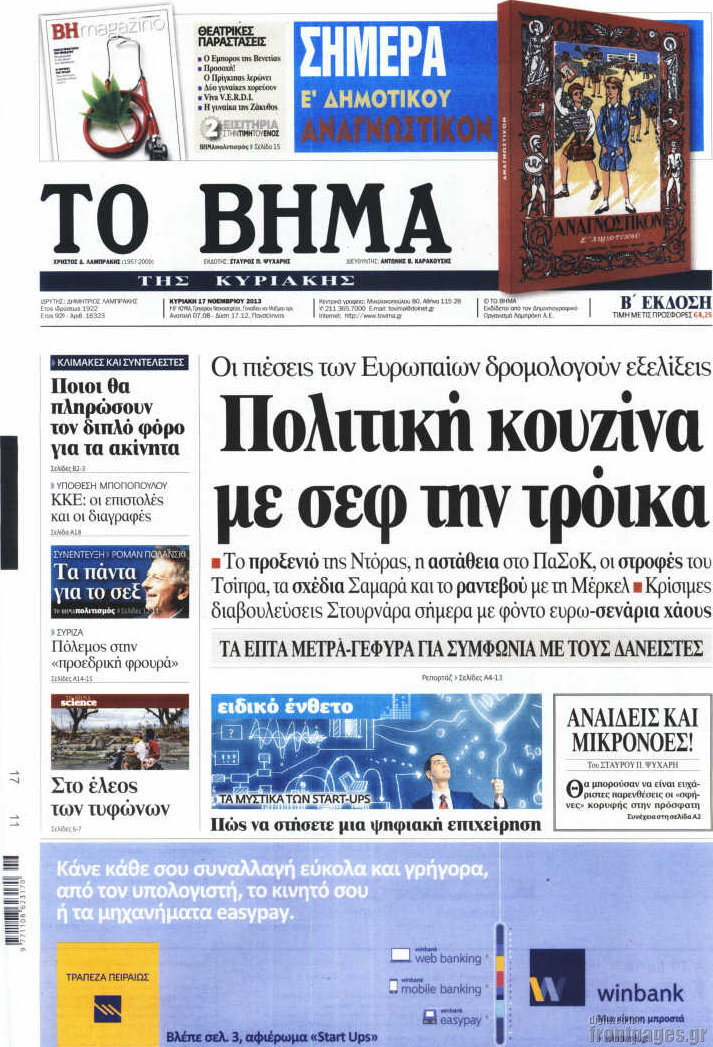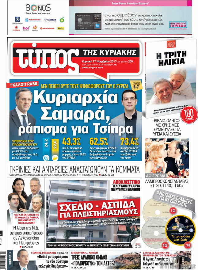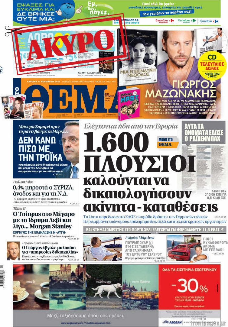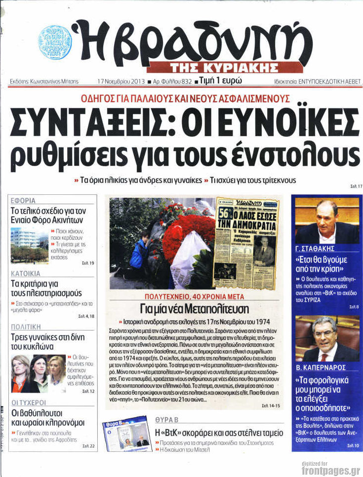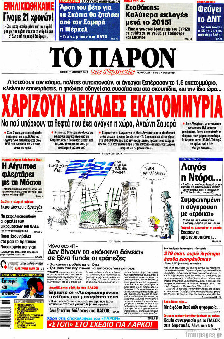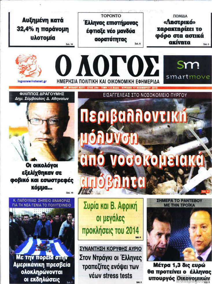 Οι πολιτικές εφημερίδες Enikos Newsroom 08:25, Κυριακή 17 Νοεμβρίου 2013 Media Οι πολιτικές εφημερίδες Διαβάστε τα πρωτοσέλιδα των πολιτικών εφημερίδων: 17 ΝΟΕΜΒΡΙΟΥ ΕΦΗΜΕΡΙΔΕΣ ΠΟΛΙΤΙΚΕΣ ΕΦΗΜΕΡΙΔΕΣ Μοιράσου το: σχολίασε κι εσύ (0 σχόλια) Ακολουθήστε το enikos.gr στο Google News και μάθετε πρώτοι όλες τις ειδήσεις Δείτε όλες τις τελευταίες ειδήσεις από την Ελλάδα και τον Κόσμο στο enikos.gr Ειδήσεις Ροή Ειδήσεων 2 ώρες πριν Αγρότες: Την Τρίτη η απόφαση για διάλογο ή κλιμάκωση των κινητοποιήσεών τους – Πώς χαρακτηρίζουν τις ανακοινώσεις Τσιάρα και οι επόμενες κινήσεις 2 ώρες πριν Τραμπ για Ουκρανία: «Είμαστε πιο κοντά σε συμφωνία από ποτέ» – «Πολυεθνική δύναμη» προτείνουν οι Ευρωπαίοι 2 ώρες πριν Κυψέλη: Η 16χρονη που μαχαίρωσε την 14χρονη είχε συλληφθεί 3 φορές στο παρελθόν – Έβριζε καθηγητές, έβαζε φωτιές σε κάδους και εκβίαζε συμμαθητές της 2 ώρες πριν Χαλκιδική: Πώς δρούσαν οι αστυνομικοί που συνελήφθησαν για κλήσεις που δεν έκοβαν – Η «ετήσια συνδρομή» για τα μπλόκα της Τροχαίας και οι «δωρεές» 1 ώρα πριν Τρομοκρατική επίθεση στο Σίδνεϊ: Θλίψη για τα 15 θύματα – Οργή στην εβραϊκή κοινότητα που προειδοποιούσε επί δύο χρόνια 3 ώρες πριν Ύπνος: Η αρχαία μορφή άσκησης που αποδεικνύεται αποτελεσματική στην αντιμετώπιση της αϋπνίας, σύμφωνα με μελέτη 4 ώρες πριν Αριθμολογία: Ο τυχερός σας αριθμός, ανάλογα με τον μήνα γέννησής σας 5 ώρες πριν Πώς να μην μαραίνονται γρήγορα τα κομμένα λουλούδια: Το λάθος στην τοποθέτηση του βάζου που πρέπει να αποφεύγετε 2 ώρες πριν Επιστήμονες ίσως έλυσαν το μυστήριο γύρω από τα Χόμπιτ – Νέα έρευνα αποκαλύπτει πώς εξαφανίστηκαν 26 λεπτά πριν Παύλος Μαρινάκης: Ο διάλογος με τους αγρότες δεν σταμάτησε ποτέ – Κομματική πειθαρχία στην ψηφοφορία για τη μεταρρύθμιση του ΟΠΕΚΕΠΕ 40 λεπτά πριν Διπλή δολοφονία στη Φοινικούντα: Προσωρινά κρατούμενοι οι δύο κατηγορούμενοι ως ηθικοί αυτουργοί 59 λεπτά πριν Γερμανία: Συνελήφθη 21χρονος ως ύποπτος για τον σχεδιασμό επίθεσης σε χριστουγεννιάτικη αγορά 1 ώρα πριν ΚΚΕ: Το νομοσχέδιο – «λαιμητόμος» του υπουργείου Άμυνας δεν πρέπει να περάσει 1 ώρα πριν Τρομοκρατική επίθεση στο Σίδνεϊ: Θλίψη για τα 15 θύματα – Οργή στην εβραϊκή κοινότητα που προειδοποιούσε επί δύο χρόνια ENIKOS NETWORK Πότε το χρόνιο ροχαλητό να αποτελέσει ένδειξη κινδύνου για την καρδιά; Τι λένε οι ειδικοί Μάριος Θεμιστοκλέους: Το ΕΣΥ ενισχύεται, εκσυγχρονίζεται, αλλάζει ΕΒΕΠ για αγροτικές κινητοποιήσεις: Κάθε επιπλέον εβδομάδα προσθέτει περίπου 200 εκατ. ευρώ ζημιά Τι προβλέπει το νομοσχέδιο του υπουργείου Εθνικής Άμυνας – Oι αλλαγές στους μισθούς Σύγχρονος Νοστράδαμος: Προειδοποιεί για «μεγάλο γεγονός» τους επόμενους μήνες που θα συγκλονίσει τη Βρετανία και τον κόσμο Τεστ παρατηρητικότητας: Μπορείτε να βρείτε τις 3 διαφορές στις εικόνες με έναν πιγκουίνο σε 14 δευτερόλεπτα περισσότερα 21:35 , Δευτέρα 15 Δεκεμβρίου 2025 Το Σπίτι Δίπλα Στο Ποτάμι: Η Ιουλία και ο Φωκάς μετακομίζουν στη Ρόδο – Δύο νέοι χαρακτήρες μπαίνουν στη σειρά Δύο νέοι, κομβικοί χαρακτήρες κάνουν την εμφάνισή τους αυτή την εβδομάδα στην αγαπημένη σειρά ... 19:46 , Δευτέρα 15 Δεκεμβρίου 2025 Άγιος έρωτας: Η Χριστίνα λέει την αλήθεια στον Αντρέα Ο Βασίλης δέχεται επίθεση από τους συμμαθητές του, η Αναστασία είναι συντετριμμένη με την απώλ... 18:45 , Δευτέρα 15 Δεκεμβρίου 2025 Συνέδριο «Ελληνικός Τουρισμός 2025, Μια εθνική υπόθεση!» – «Ο Θαλάσσιος Πυλώνας ως Ενιαία Στρατηγική: Συνέργειες σε Λ