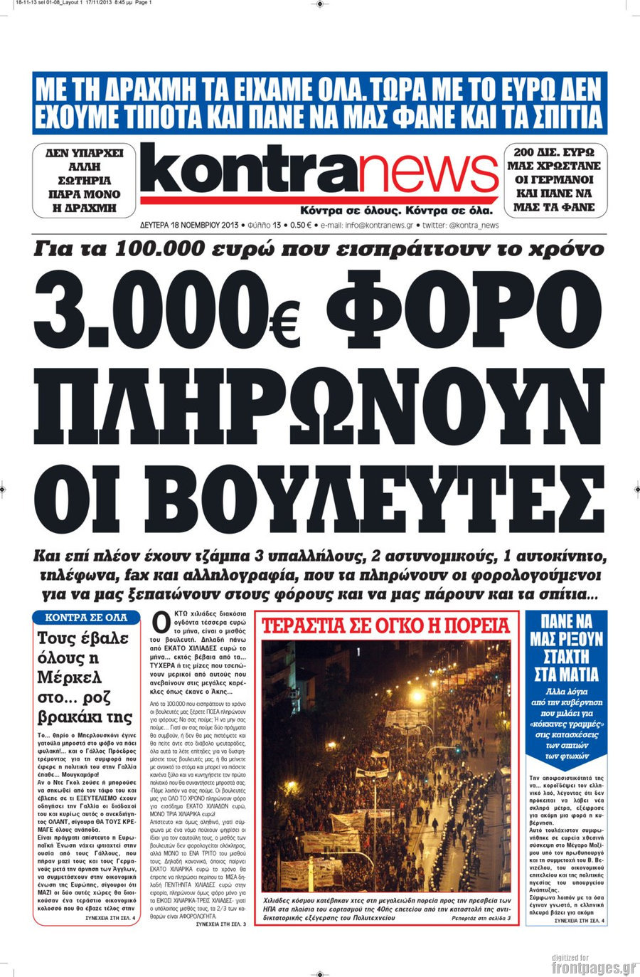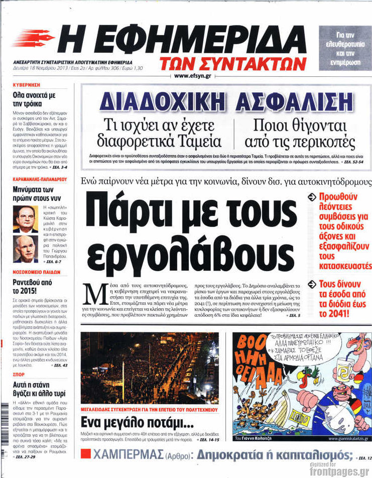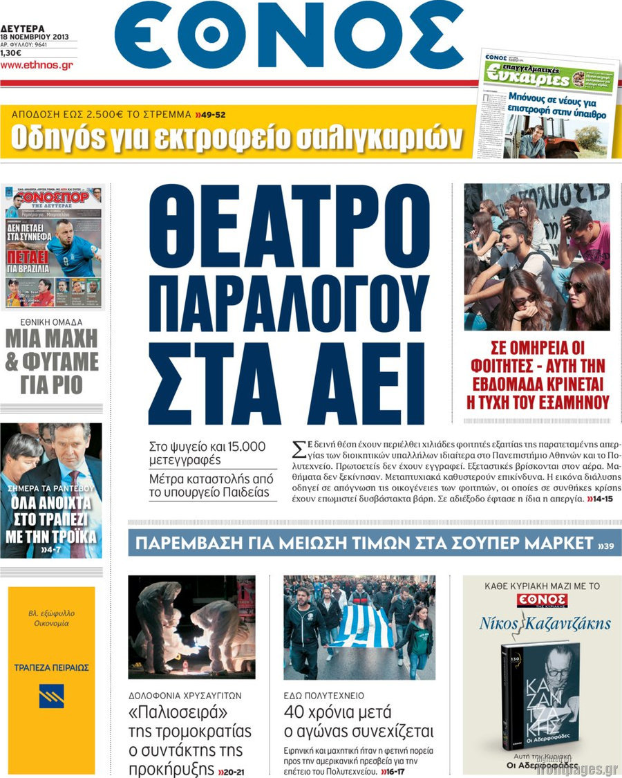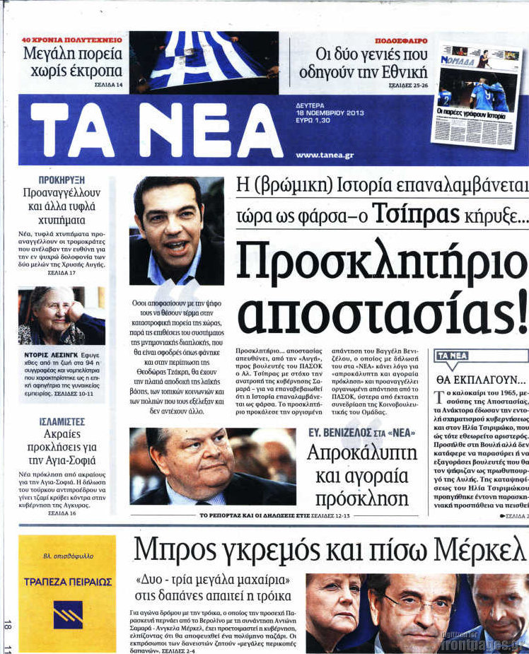Οι πολιτικές εφημερίδες Enikos Newsroom 08:26, Δευτέρα 18 Νοεμβρίου 2013 Media Οι πολιτικές εφημερίδες Διαβάστε τα πρωτοσέλιδα των πολιτικών εφημερίδων: ΕΦΗΜΕΡΙΔΕΣ ΠΡΩΤΟΣΕΛΙΔΑ Μοιράσου το: σχολίασε κι εσύ (0 σχόλια) Ακολουθήστε το enikos.gr στο Google News και μάθετε πρώτοι όλες τις ειδήσεις Δείτε όλες τις τελευταίες ειδήσεις από την Ελλάδα και τον Κόσμο στο enikos.gr Ειδήσεις Ροή Ειδήσεων 2 ώρες πριν Συνεχίζουν τις κινητοποιήσεις οι αγρότες: Κλείνουν τις σήραγγες των Τεμπών για τα φορτηγά – Τι θα γίνει τα Χριστούγεννα 3 ώρες πριν Νέες εστίες ακρίβειας «ροκανίζουν» τα εισοδήματα – Πού καταγράφονται οι μεγαλύτερες αυξήσεις 50 λεπτά πριν Νέες δηλώσεις του αγροτοσυνδικαλιστή Ανεστίδη: Όσα λέγονται είναι λάσπη στον ανεμιστήρα για να σπάσουν τα μπλόκα 2 ώρες πριν «Έπιασαν δουλειά» οι 8 κάμερες που λειτουργούν πιλοτικά – Περισσότερες από 1.000 παραβάσεις σε 4 ημέρες 2 ώρες πριν Ουκρανία: Συνομιλίες στη Φλόριντα με υποσημειώσεις και βαθιές διαφωνίες – Το δύσκολο παζλ των διαπραγματεύσεων και το χάσμα Ουάσιγκτον – Μόσχας 4 ώρες πριν Άνοια και εγκεφαλικό: Γιατρός προειδοποιεί για ένα δημοφιλές ρόφημα που αυξάνει τον κίνδυνο κατά 290% και 300% αντίστοιχα 1 ώρα πριν Ο άνδρας της απαιτεί να κάνει όλες τις δουλειές του σπιτιού από τότε που παραιτήθηκε – «Εξακολουθώ να συνδράμω οικονομικά στο σπίτι» 2 ώρες πριν Ανακαλύφθηκε βραχογράφημα που παραπέμπει στον Ηρακλή και την Ύδρα από ελληνικά νομίσματα του 325 π.Χ. 2 ημέρες πριν Enerwave: Το νέο «ρεύμα» στη λιανική ενέργειας που αλλάζει την εμπειρία του καταναλωτή 1 λεπτό πριν Επίδομα παιδιού: Άνοιξε η πλατφόρμα για τις αιτήσεις – Ερωτήσεις και απαντήσεις 6 λεπτά πριν Οχάιο: Ύποπτος για κλοπή τράβηξε όπλο κατά αστυνομικού και προσπάθησε να τον πυροβολήσει – Δείτε το βίντεο 12 λεπτά πριν Τα 4 ζώδια που παίρνουν επιτέλους την αναγνώριση που τους αξίζει – «Απρόσμενες ευκαιρίες, που μοιάζουν με δώρα από το σύμπαν» 16 λεπτά πριν Αγρότες: Παραμένουν στα τελωνεία Εξοχής, Προμαχώνα, Νίκης και Ευζώνων – Ποιες ώρες θα είναι ανοιχτά για αυτοκίνητα και τουριστικά λεωφορεία 22 λεπτά πριν Καιρός: Δύο κύματα με καταιγίδες και χιόνια στα βουνά τα Χριστούγεννα – Η πρόγνωση για την Πρωτοχρονιά ENIKOS NETWORK Χοληστερίνη: Το σημάδι στο δέρμα που μπορεί να δείχνει ότι είναι υπερβολικά υψηλή Ποιο γλυκό φρούτο ρυθμίζει το σάκχαρο και μπορούν να φάνε οι διαβητικοί, σύμφωνα με μελέτη Νέες εστίες ακρίβειας «ροκανίζουν» τα εισοδήματα – Πού καταγράφονται οι μεγαλύτερες αυξήσεις Νέο έτος ρεκόρ για τον ελληνικό τουρισμό το 2025: «Είμαστε μέσα στους 10 πλέον επισκέψιμους προορισμούς παγκοσμίως» λέει η ... Χαρτογραφώντας το «σημείο χωρίς επιστροφή»: Για πρώτη φορά αποκαλύπτεται με λεπτομέρεια το ακανθώδες όριο της ατμόσφαιρας τ... Η Google καταργεί τη λειτουργία «dark web report» – Πώς θα μπορούν οι χρήστες να διαγράφουν τα δεδομένα τους περισσότερα 09:45 , Δευτέρα 22 Δεκεμβρίου 2025 Ο χριστουγεννιάτικος τηλεμαραθώνιος αλληλεγγύης του ANT1 για τα παιδιά Ο ANT1 διοργανώνει Χριστουγεννιάτικο Τηλεμαραθώνιο για τα Παιδιά την 22η Δεκεμβρίου 2025, με σ... 09:30 , Δευτέρα 22 Δεκεμβρίου 2025 Eurovision 2026: Φαβορί η Μπέττυ Μαγγίρα Στην τελική ευθεία μπαίνει ο σχεδιασμός της ΕΡΤ για τους δύο ημιτελικούς και τον εθνικό τελικό... 07:02 , Δευτέρα 22 Δεκεμβρίου 2025 Αυτή την Κυριακή με τη Realnews: Το μυστήριο των Χριστουγέννων της Vicki Delany – Μαζί αστυνομικά μυθιστορήματα Αυτή την Κυριακή με τη Realnews: Το μυστήριο των Χριστουγέννων τη