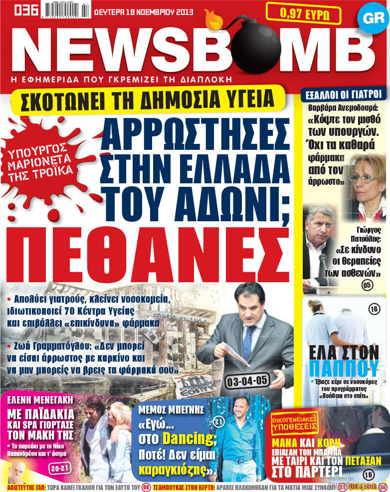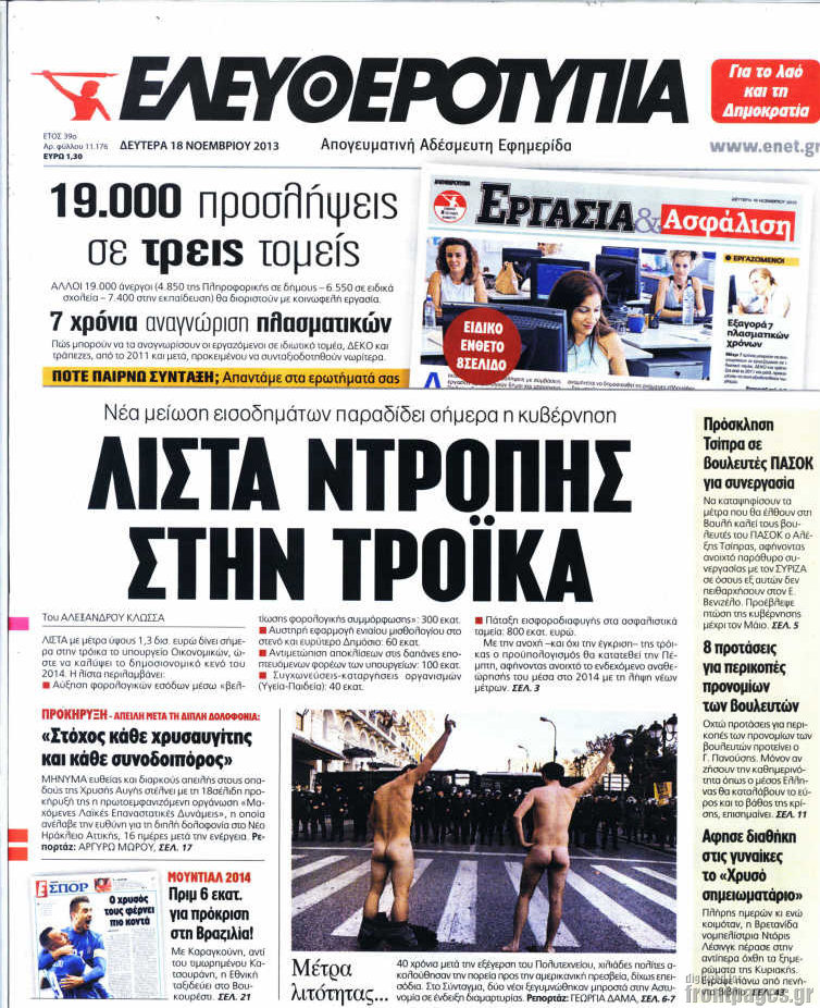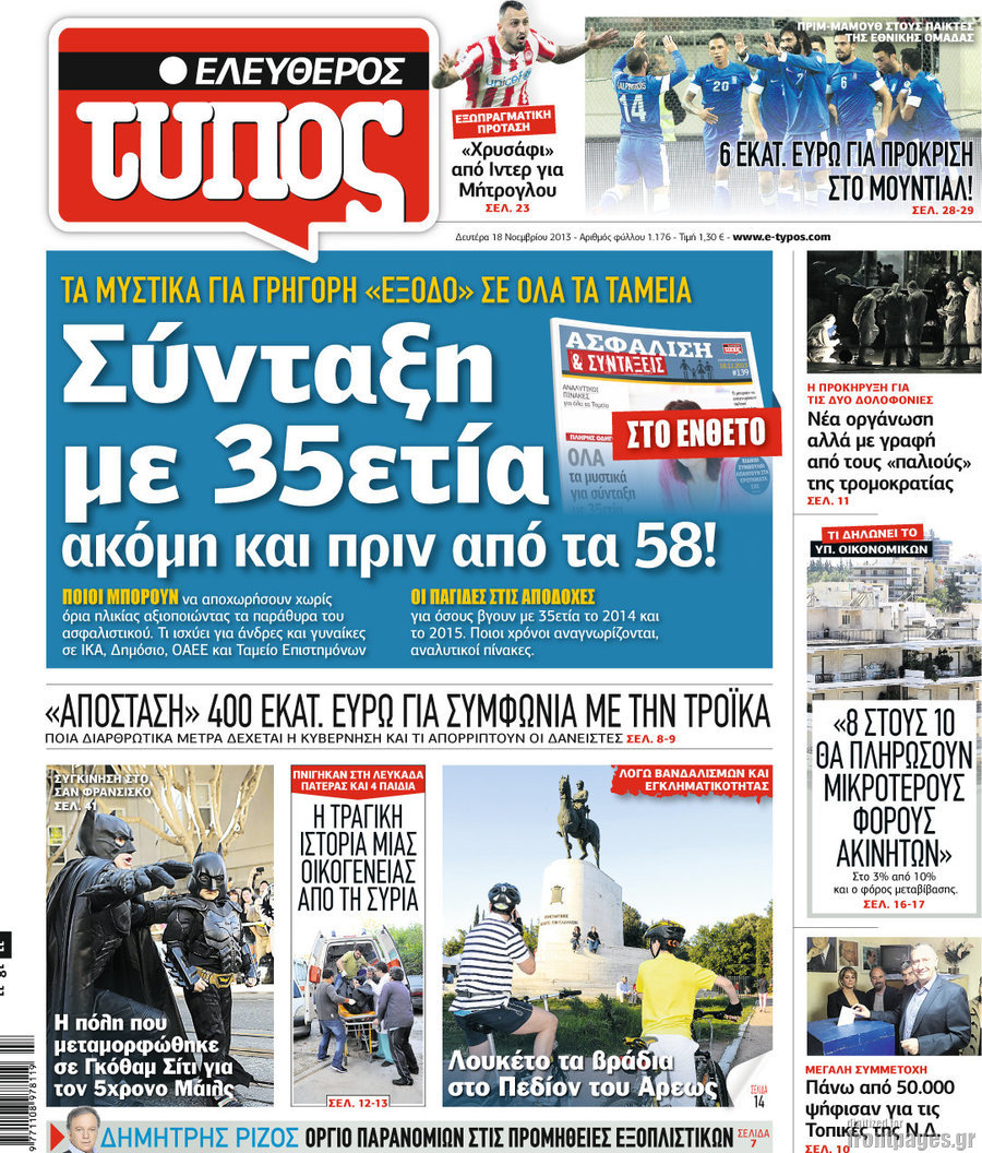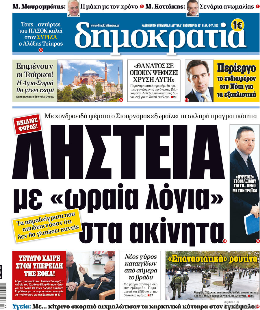 Οι πολιτικές εφημερίδες Enikos Newsroom 08:26, Δευτέρα 18 Νοεμβρίου 2013 Media Οι πολιτικές εφημερίδες Διαβάστε τα πρωτοσέλιδα των πολιτικών εφημερίδων: ΕΦΗΜΕΡΙΔΕΣ ΠΡΩΤΟΣΕΛΙΔΑ Μοιράσου το: σχολίασε κι εσύ (0 σχόλια) Ακολουθήστε το enikos.gr στο Google News και μάθετε πρώτοι όλες τις ειδήσεις Δείτε όλες τις τελευταίες ειδήσεις από την Ελλάδα και τον Κόσμο στο enikos.gr Ειδήσεις Ροή Ειδήσεων 2 ώρες πριν Συνεχίζουν τις κινητοποιήσεις οι αγρότες: Κλείνουν τις σήραγγες των Τεμπών για τα φορτηγά – Τι θα γίνει τα Χριστούγεννα 3 ώρες πριν Νέες εστίες ακρίβειας «ροκανίζουν» τα εισοδήματα – Πού καταγράφονται οι μεγαλύτερες αυξήσεις 50 λεπτά πριν Νέες δηλώσεις του αγροτοσυνδικαλιστή Ανεστίδη: Όσα λέγονται είναι λάσπη στον ανεμιστήρα για να σπάσουν τα μπλόκα 2 ώρες πριν «Έπιασαν δουλειά» οι 8 κάμερες που λειτουργούν πιλοτικά – Περισσότερες από 1.000 παραβάσεις σε 4 ημέρες 2 ώρες πριν Ουκρανία: Συνομιλίες στη Φλόριντα με υποσημειώσεις και βαθιές διαφωνίες – Το δύσκολο παζλ των διαπραγματεύσεων και το χάσμα Ουάσιγκτον – Μόσχας 4 ώρες πριν Άνοια και εγκεφαλικό: Γιατρός προειδοποιεί για ένα δημοφιλές ρόφημα που αυξάνει τον κίνδυνο κατά 290% και 300% αντίστοιχα 1 ώρα πριν Ο άνδρας της απαιτεί να κάνει όλες τις δουλειές του σπιτιού από τότε που παραιτήθηκε – «Εξακολουθώ να συνδράμω οικονομικά στο σπίτι» 2 ώρες πριν Ανακαλύφθηκε βραχογράφημα που παραπέμπει στον Ηρακλή και την Ύδρα από ελληνικά νομίσματα του 325 π.Χ. 2 ημέρες πριν Enerwave: Το νέο «ρεύμα» στη λιανική ενέργειας που αλλάζει την εμπειρία του καταναλωτή 1 λεπτό πριν Επίδομα παιδιού: Άνοιξε η πλατφόρμα για τις αιτήσεις – Ερωτήσεις και απαντήσεις 6 λεπτά πριν Οχάιο: Ύποπτος για κλοπή τράβηξε όπλο κατά αστυνομικού και προσπάθησε να τον πυροβολήσει – Δείτε το βίντεο 12 λεπτά πριν Τα 4 ζώδια που παίρνουν επιτέλους την αναγνώριση που τους αξίζει – «Απρόσμενες ευκαιρίες, που μοιάζουν με δώρα από το σύμπαν» 16 λεπτά πριν Αγρότες: Παραμένουν στα τελωνεία Εξοχής, Προμαχώνα, Νίκης και Ευζώνων – Ποιες ώρες θα είναι ανοιχτά για αυτοκίνητα και τουριστικά λεωφορεία 22 λεπτά πριν Καιρός: Δύο κύματα με καταιγίδες και χιόνια στα βουνά τα Χριστούγεννα – Η πρόγνωση για την Πρωτοχρονιά ENIKOS NETWORK Χοληστερίνη: Το σημάδι στο δέρμα που μπορεί να δείχνει ότι είναι υπερβολικά υψηλή Ποιο γλυκό φρούτο ρυθμίζει το σάκχαρο και μπορούν να φάνε οι διαβητικοί, σύμφωνα με μελέτη Νέες εστίες ακρίβειας «ροκανίζουν» τα εισοδήματα – Πού καταγράφονται οι μεγαλύτερες αυξήσεις Νέο έτος ρεκόρ για τον ελληνικό τουρισμό το 2025: «Είμαστε μέσα στους 10 πλέον επισκέψιμους προορισμούς παγκοσμίως» λέει η ... Χαρτογραφώντας το «σημείο χωρίς επιστροφή»: Για πρώτη φορά αποκαλύπτεται με λεπτομέρεια το ακανθώδες όριο της ατμόσφαιρας τ... Η Google καταργεί τη λειτουργία «dark web report» – Πώς θα μπορούν οι χρήστες να διαγράφουν τα δεδομένα τους περισσότερα 09:45 , Δευτέρα 22 Δεκεμβρίου 2025 Ο χριστουγεννιάτικος τηλεμαραθώνιος αλληλεγγύης του ANT1 για τα παιδιά Ο ANT1 διοργανώνει Χριστουγεννιάτικο Τηλεμαραθώνιο για τα Παιδιά την 22η Δεκεμβρίου 2025, με σ... 09:30 , Δευτέρα 22 Δεκεμβρίου 2025 Eurovision 2026: Φαβορί η Μπέττυ Μαγγίρα Στην τελική ευθεία μπαίνει ο σχεδιασμός της ΕΡΤ για τους δύο ημιτελικούς και τον εθνικό τελικό... 07:02 , Δευτέρα 22 Δεκεμβρίου 2025 Αυτή την Κυριακή με τη Realnews: Το μυστήριο των Χριστουγέννων της Vicki Delany – Μαζί αστυνομικά μυθιστορήματα Αυτή την Κυριακή με τη Realnews: Το μυστήριο των Χριστουγέννων τη