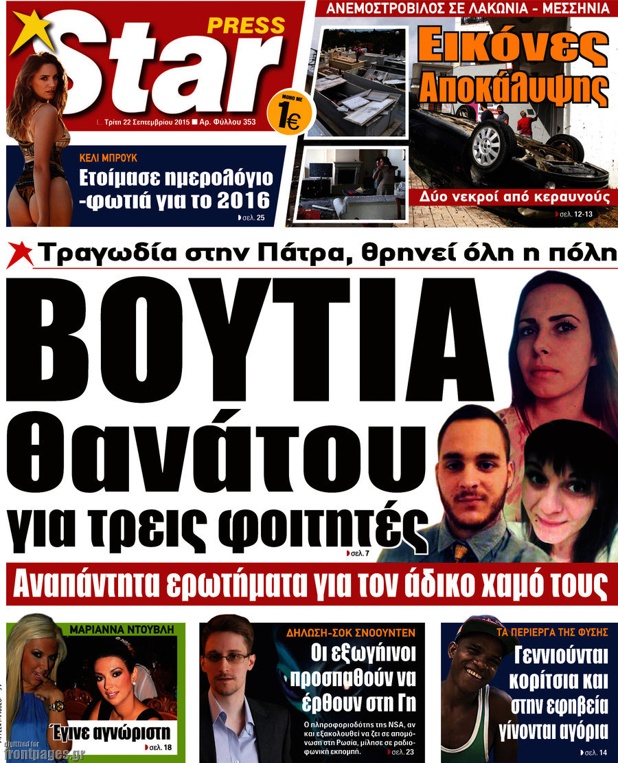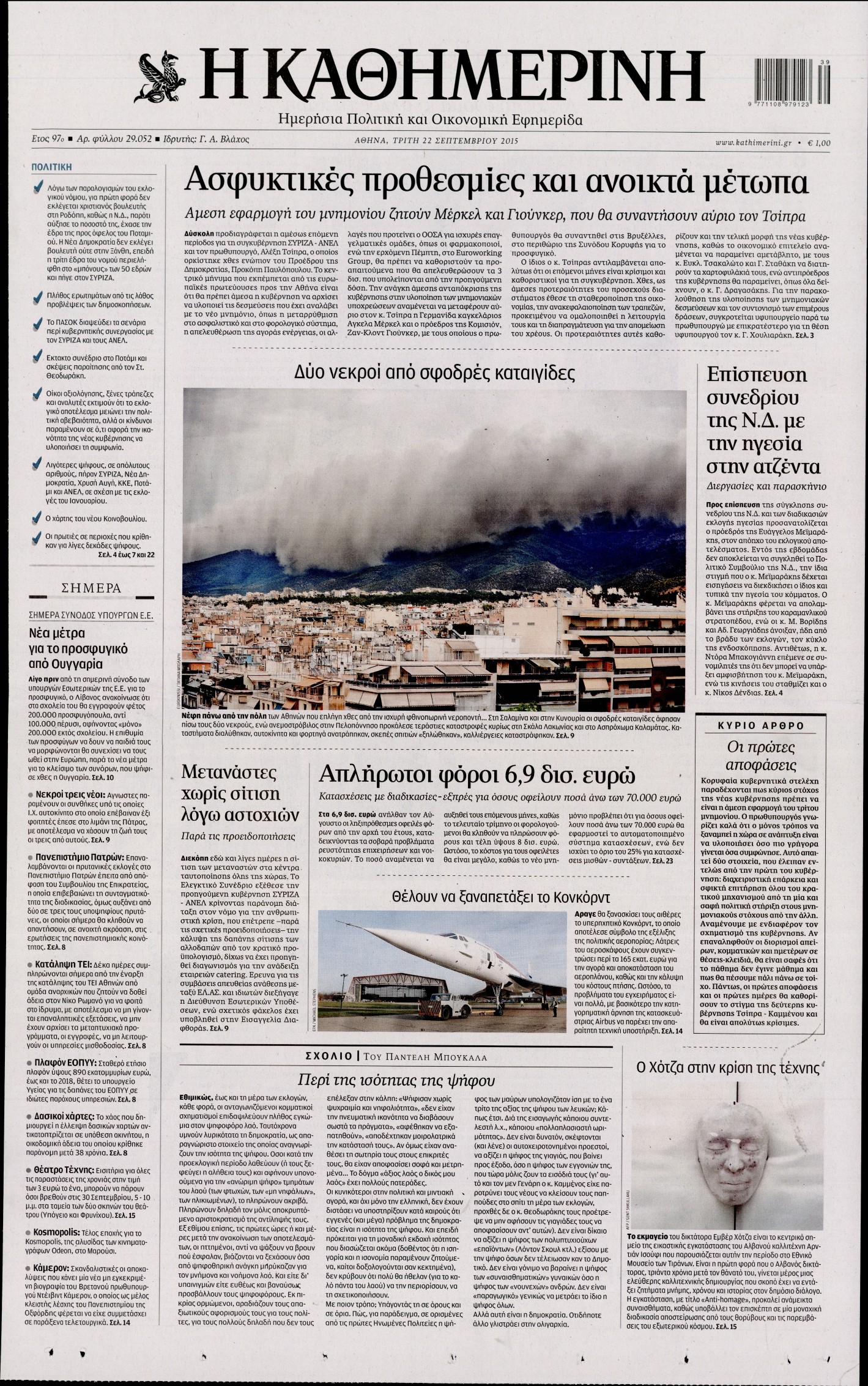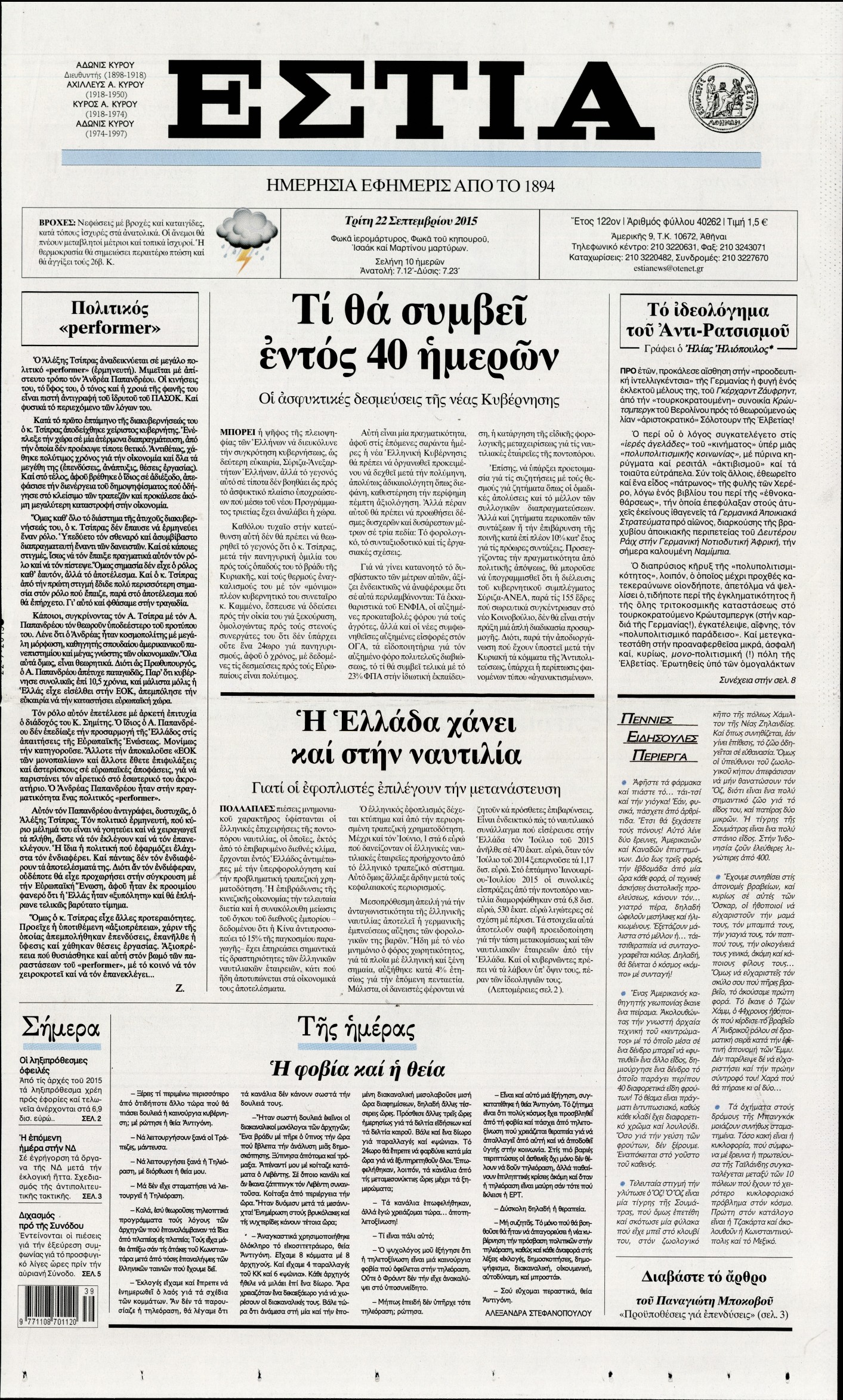 Οι πολιτικές εφημερίδες 22/9/2015 Enikos Newsroom 06:32, Τρίτη 22 Σεπτεμβρίου 2015 Media Διαβάστε τα σημερινά πρωτοσέλιδα των πολιτικών εφημερίδων: ΠΟΛΙΤΙΚΕΣ ΕΦΗΜΕΡΙΔΕΣ ΠΡΩΤΟΣΕΛΙΔΑ Μοιράσου το: σχολίασε κι εσύ (0 σχόλια) Ακολουθήστε το enikos.gr στο Google News και μάθετε πρώτοι όλες τις ειδήσεις Δείτε όλες τις τελευταίες ειδήσεις από την Ελλάδα και τον Κόσμο στο enikos.gr Ειδήσεις Ροή Ειδήσεων 2 ώρες πριν Μεσόγειος: Η διαδρομή του ρωσικού τάνκερ «Qendil» και η στοχευμένη επίθεση της Ουκρανίας με drone – Ο Πούτιν προειδοποίησε για αντίποινα 2 ώρες πριν Αττική: Θρίλερ με νεκρό βρέφος 5 μηνών – Κοιμόταν στο ίδιο κρεβάτι με τους γονείς του 3 ώρες πριν Από το Ορμένιο ως τα Μάλγαρα κι από τη Σιάτιστα μέχρι τη Νίκαια: Μπλόκα σε όλη την Ελλάδα – Το Σάββατο ανοίγουν τα διόδια οι αγρότες 3 ώρες πριν «Έλληνας Εσκομπάρ»: Φωτογραφίες με τους 4 τόνους κοκαΐνης που κατασχέθηκαν από το σκάφος «Ουρανία» 4 ώρες πριν Πούτιν: Σαρκαστικά μηνύματα, παράπονα και απρόοπτα στη συνέντευξη Τύπου – Η πρόταση γάμου on air και οι ερωτήσεις για τα αγγούρια και τους… εξωγήινους 4 ώρες πριν Τα 5 ζώδια που ευνοούνται στην ερωτική ζωή τους την επόμενη εβδομάδα – «Η ενέργεια του Αιγόκερου φέρνει αγάπη και σταθερότητα» 8 ώρες πριν Ειδικός μοιράζεται 6 κόλπα για να διατηρείστε σε φόρμα με πάνω από 40 ώρες εργασίας την εβδομάδα: «Προπονηθείτε πριν από τη δουλειά, όχι μετά» 5 ώρες πριν Αυτό το έξυπνο μαθηματικό κόλπο θα μπορούσε να αλλάξει τον τρόπο με τον οποίο οι επιστήμονες μελετούν τους σεισμούς 3 ώρες πριν Κουίζ για την παλιά Αθήνα: Αναγνωρίζετε την περιοχή; Έχετε περάσει 100% από εκεί 35 δευτερόλεπτα πριν Πούτιν: «Ναι, είμαι ερωτευμένος» – Βίντεο από τη σπάνια προσωπική παραδοχή του 5 λεπτά πριν Γαλλία – Shein: Υποχρεωτικός έλεγχος ηλικίας των πελατών μετά τον σάλο με τις ερωτικές κούκλες 11 λεπτά πριν Εμπλοκή και αερομαχίες με οπλισμένα τουρκικά F-16 στο Αιγαίο 19 λεπτά πριν GNTM: Απόψε ο μεγάλος τελικός για τους 4 φιναλίστ 25 λεπτά πριν Ολυμπιακός: Χωρίς Ποντένσε η αποστολή των Ερυθρόλευκων ενόψει Κηφισιάς ENIKOS NETWORK «Η σούπερ» γρίπη εξαπλώνεται στην Ευρώπη-Στοιχεία από το ECDC για την αποτελεσματικότητα του εμβολίου ΕΛΣΤΑΤ: Αύξηση κατά 1,7% των επαγγελματιών υγείας το 2024 Προκήρυξη ΑΣΕΠ για 397 μόνιμες προσλήψεις στο Δημόσιο: Βγήκαν τα προσωρινά αποτελέσματα – Πότε αρχίζει η υποβολή ενστάσεων Η απάντηση της κυβέρνησης στα αιτήματα των αγροτών: 16 έχουν ικανοποιηθεί, 4 βρίσκονται υπό επεξεργασία και 7 δεν είναι εφι... Χαρτογραφώντας το «σημείο χωρίς επιστροφή»: Για πρώτη φορά αποκαλύπτεται με λεπτομέρεια το ακανθώδες όριο της ατμόσφαιρας τ... Η Google καταργεί τη λειτουργία «dark web report» – Πώς θα μπορούν οι χρήστες να διαγράφουν τα δεδομένα τους περισσότερα 19:31 , Παρασκευή 19 Δεκεμβρίου 2025 GNTM: Απόψε ο μεγάλος τελικός για τους 4 φιναλίστ Έπειτα από μήνες γεμάτους μόδα, δημιουργία και έντονες αναμετρήσεις, το GNTM 2025 κορυφώνεται,... 18:11 , Παρασκευή 19 Δεκεμβρίου 2025 Το σόι σου: Ο Άρης έρχεται στην Ελλάδα για τις γιορτές των Χριστουγέννων – Τι θα δούμε στο αποψινό εορταστικό επεισόδιο Ένα απολαυστικό, εορταστικό επεισόδιο της σειράς “Το σόι σου”, γεμάτο ευτράπελα αλ... 15:15 , Παρασκευή 19 Δεκεμβρίου 2025 Την Κυριακή με τη Realnews: Ό,τι και αν αγοράσεις, σκανάρεις και κερδίζεις! Την Κυριακή με τη Realnews: Ό,τι και αν αγοράσεις, σκανάρεις και κερδίζεις! Με το PADU app, το... 08:00 , Παρασκευή 19 Δεκεμβρίου 2025 Την Κυριακή με τη Realnews: Δωροεπιταγή 10€ Δωροεπιταγή αξίας 10€ για αγο