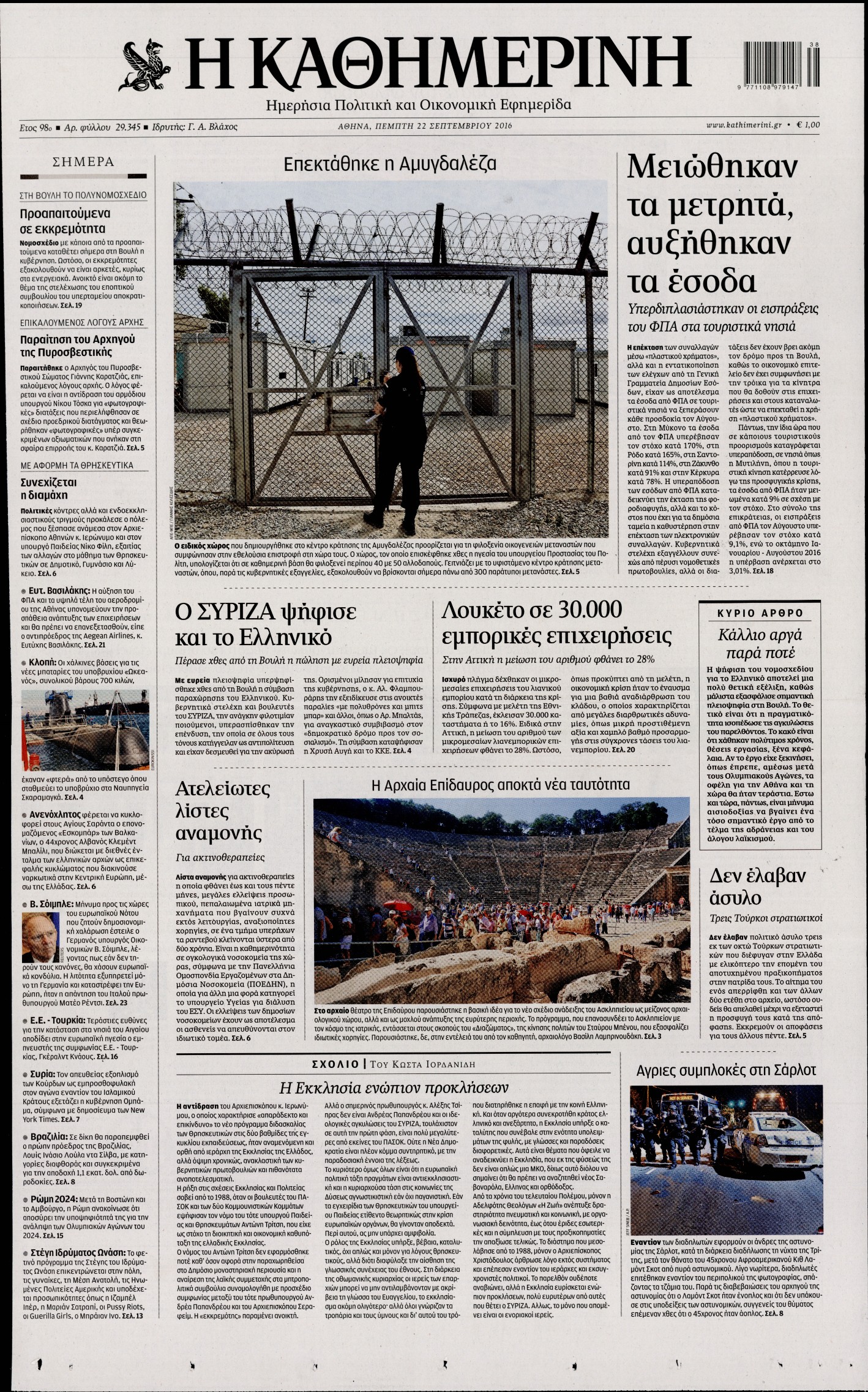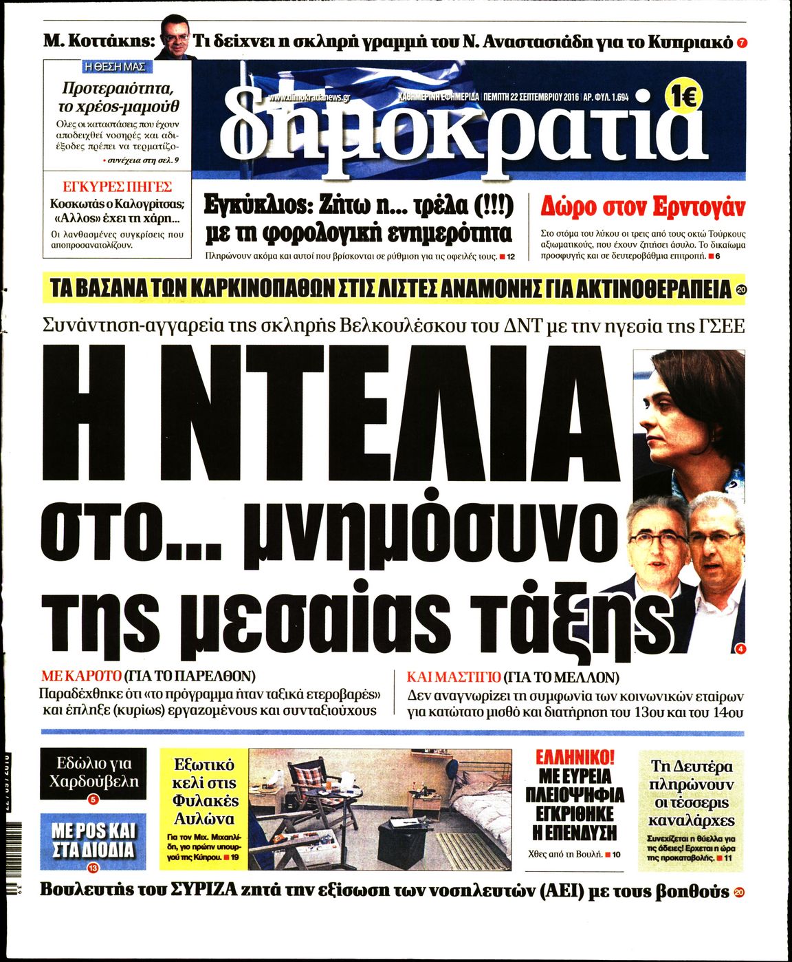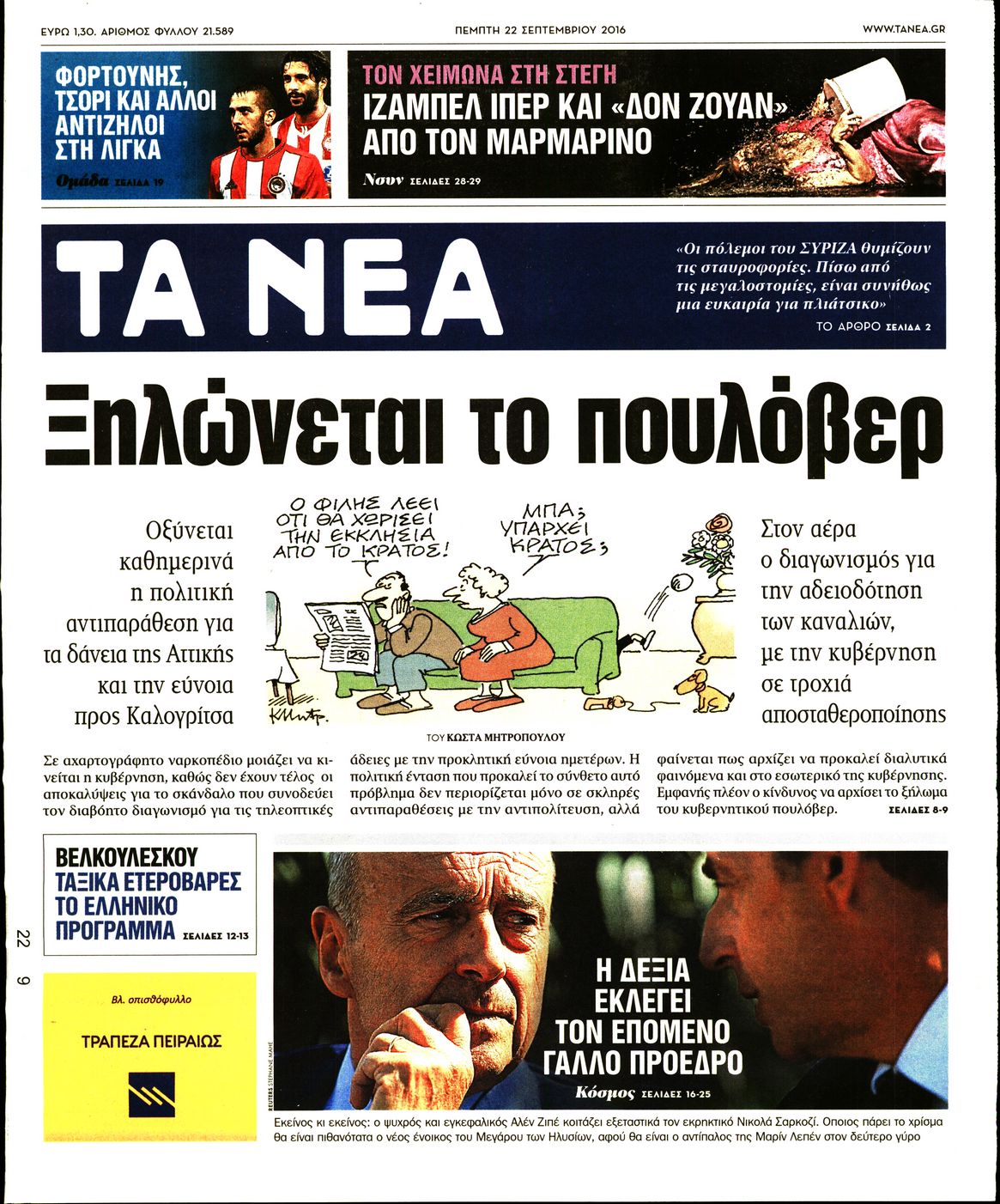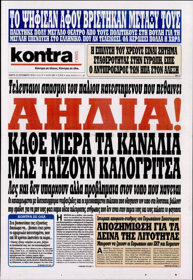 Oι πολιτικές εφημερίδες 22/9/2016 Enikos Newsroom 05:09, Πέμπτη 22 Σεπτεμβρίου 2016 Media Διαβάστε τα σημερινά πρωτοσέλιδα των πολιτικών εφημερίδων: ΠΟΛΙΤΙΚΕΣ ΕΦΗΜΕΡΙΔΕΣ ΠΡΩΤΟΣΕΛΙΔΑ Μοιράσου το: σχολίασε κι εσύ (0 σχόλια) Ακολουθήστε το enikos.gr στο Google News και μάθετε πρώτοι όλες τις ειδήσεις Δείτε όλες τις τελευταίες ειδήσεις από την Ελλάδα και τον Κόσμο στο enikos.gr Ειδήσεις Ροή Ειδήσεων 2 ώρες πριν Δημοσκόπηση Metron Analysis: Στις 10 μονάδες η διαφορά ΝΔ-ΠΑΣΟΚ, στην 3η θέση η Πλεύση Ελευθερίας – 8 στους 10 στηρίζουν τον αγώνα των αγροτών 6 ώρες πριν Αγρότες: «Όχι στον διάλογο, μας εμπαίζει η κυβέρνηση» – Αποφάσισαν κλιμάκωση των κινητοποιήσεων, τι θα γίνει τα Χριστούγεννα 1 ώρα πριν Νίκος Παππάς στον ΑΝΤ1: «Δεν κρύβομαι – Μετά το συμβάν ακολούθησα κανονικά το πρόγραμμά μου» – ΒΙΝΤΕΟ 3 ώρες πριν Αθήνα: Εξαρθρώθηκε εγκληματική οργάνωση που διακινούσε ναρκωτικά σε μορφή σοκολάτας – Δύο τράπερ ανάμεσα στους 4 συλληφθέντες – ΒΙΝΤΕΟ 1 ώρα πριν Διαμαντής Καραναστάσης: Οδηγούσε υπό την επήρεια αλκοόλ – Του αφαιρέθηκε το δίπλωμα και του επιβλήθηκε πρόστιμο 350 ευρώ 2 ώρες πριν Manifesting: Πώς να συναντήσετε τον σύντροφο της ζωής σας, ανάλογα με τον μήνα γέννησής σας 4 ώρες πριν Γάμος: 11 ψυχρές αλλά ευγενικές φράσεις, που λέει ένας άνδρας όταν σκέφτεται τον χωρισμό 3 ώρες πριν Σφουγγάρισμα: Η συνήθεια που θα σας βοηθήσει να διατηρήσετε το σπίτι σας καθαρό και τακτοποιημένο 2 ημέρες πριν 20 χρόνια τα Χριστούγεννα ξεκινούν στα Public με μεγάλη ποικιλία σε δώρα! 7 λεπτά πριν Αυξάνουν την πίεση προς την κυβέρνηση οι αγρότες: Κλείνουν παρακαμπτήριους και ανοίγουν διόδια – Τι θα γίνει τις γιορτές 12 λεπτά πριν Ελισάβετ Κωνσταντινίδου για τον Γεράσιμο Μιχελή και την Πόπη Χριστοδούλου: «Ξέρω ότι έχουν πάει απλώς κάπου αλλού, ότι δεν είναι ο θάνατος έτσι όπως τον έχουμε στο μυαλό μας» 16 λεπτά πριν Κρήτη: Νέες αποκαλύψεις για τον 54χρονο που κατηγορείται ότι εξαπάτησε τους γονείς του 33χρονου – Ζητούσε τρίχες αγνοουμένων 23 λεπτά πριν Τσιάρας: Δεν θα κινδυνέψουν οι πληρωμές των αγροτών – Χρειαζόμαστε μια νέα πολιτική, ένα restart 30 λεπτά πριν Δέσποινα Βανδή: Το βίντεο που δημοσίευσε με τον Γιώργο Νικολαΐδη – «Έχουμε καταστραφεί από τα μελομακάρονά σου» ENIKOS NETWORK Σε περίοδο αυξημένης δραστηριότητας η γρίπη στην Ελλάδα-Μέτρα προστασίας από τον ΕΟΔΥ Σκέφτεστε συνέχεια συζητήσεις που έχετε κάνει; Τι σημαίνει αυτό, σύμφωνα με ειδικό Λαγκάρντ: Αισιόδοξη για την ανάπτυξη της Ευρωζώνης, αβέβαιη για τον πληθωρισμό ΑΣΕΠ 2ΓΒ/2025: Σήμερα αρχίζει η υποβολή ενστάσεων – Πότε θα βγουν τα οριστικά αποτελέσματα Χαρτογραφώντας το «σημείο χωρίς επιστροφή»: Για πρώτη φορά αποκαλύπτεται με λεπτομέρεια το ακανθώδες όριο της ατμόσφαιρας τ... Η Google καταργεί τη λειτουργία «dark web report» – Πώς θα μπορούν οι χρήστες να διαγράφουν τα δεδομένα τους περισσότερα 17:45 , Πέμπτη 18 Δεκεμβρίου 2025 ROUK ZOUK: Εορταστικό επεισόδιο με καλεσμένους τους πρωταγωνιστές του «Γιατί ρε πατέρα» Το Σάββατο 20 Δεκεμβρίου στις 21:00, η Ζέτα Μακρυπούλια υποδέχεται εκλεκτούς ηθοποιούς που όλο... 17:20 , Πέμπτη 18 Δεκεμβρίου 2025 Άγιος έρωτας: Η Χριστίνα εξομολογείται στον πατέρα Νικόλαο, απόψε στις 21:00 στον Alpha Η Νότα αποφασίζει να εκδικηθεί τον Πέτρο και τον Στέφανο, για χάρη του Λούη, όμως τα πράγματα ... 16:50 , Πέμπτη 18 Δεκεμβρίου 2025 Να μ’ αγαπάς: Ζωή και Φωτεινή συμφιλιώνονται ως μάνα με κόρη, απόψε στις 20:00 Η ταυτότητα του Άγγελου αποκαλύπτεται στο νέο επεισόδιο της σειράς “Να