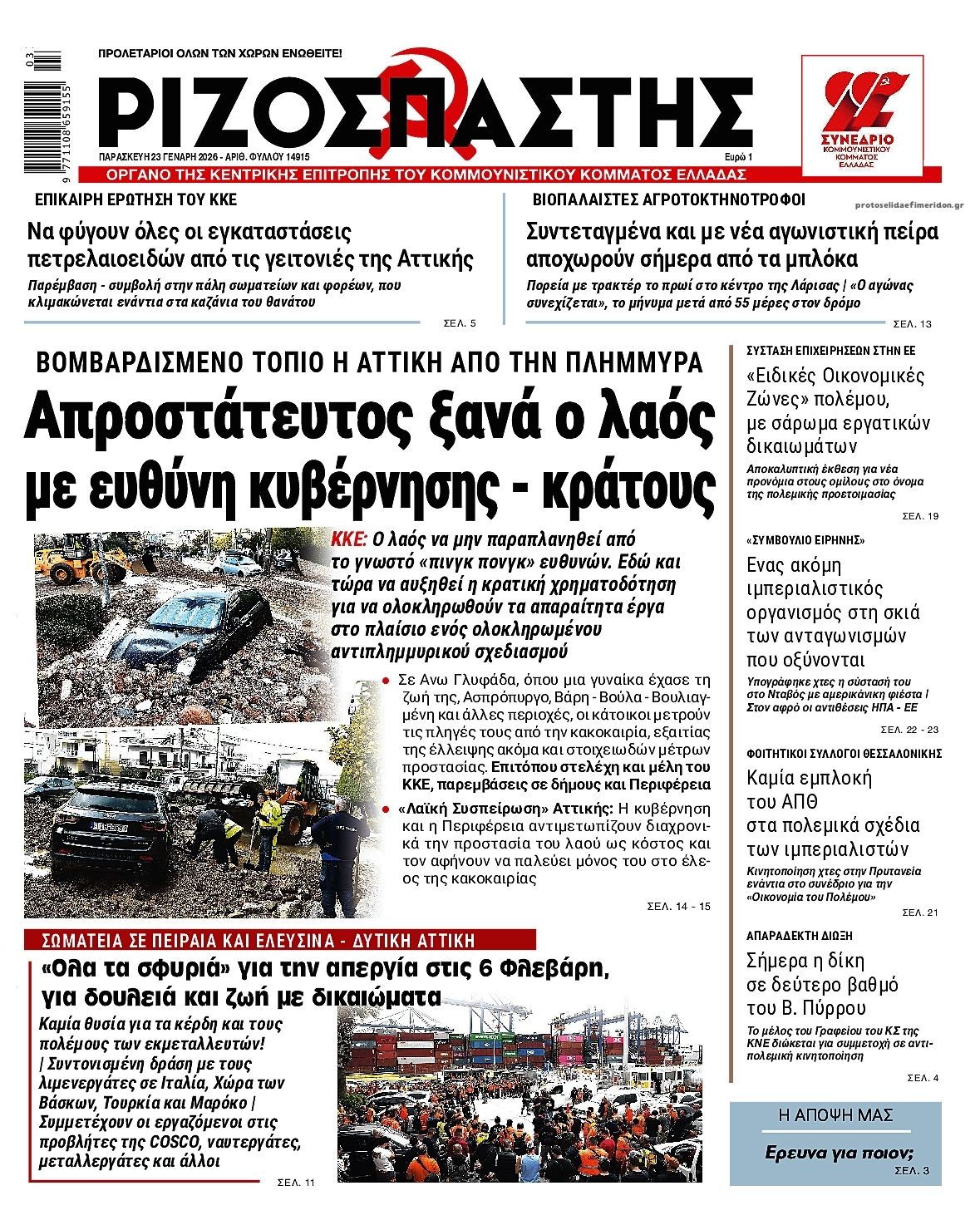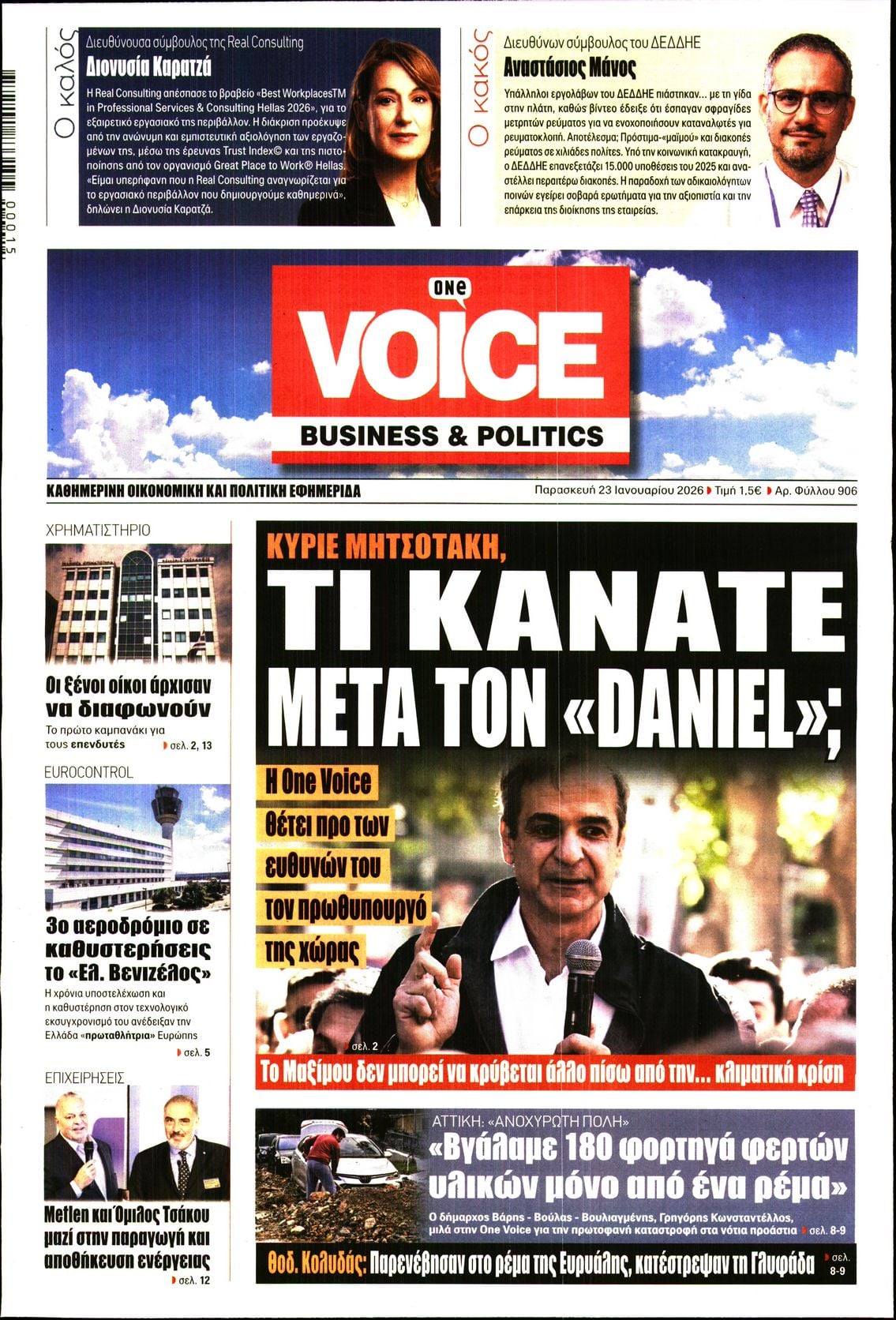 Οι πολιτικές εφημερίδες 23/1/2026 Enikos Newsroom 05:38, Παρασκευή 23 Ιανουαρίου 2026 Media Διαβάστε τα πρωτοσέλιδα από τις πολιτικές εφημερίδες, σήμερα 23/1/2026. ΕΦΗΜΕΡΙΔΕΣ ΠΟΛΙΤΙΚΕΣ ΕΦΗΜΕΡΙΔΕΣ ΠΡΩΤΟΣΕΛΙΔΑ Μοιράσου το: Σύνοδος Κορυφής: Ισχυρό μήνυμα ενότητας από τους 27 – Σαφής στήριξη σε Δανία και Γροιλανδία – Αμφισβητήσιμο το «Συμβούλιο για την Ειρήνη» Πόλεμος στην Ουκρανία: Ολοκληρώθηκε η συνάντηση του προέδρου της Ρωσίας Πούτιν με τον ειδικό απεσταλμένο των ΗΠΑ Γουίτκοφ Ο Ντόναλντ Τραμπ δηλώνει ότι «μεγάλη δύναμη» του αμερικανικού στρατού κινείται προς το Ιράν σχολίασε κι εσύ (0 σχόλια) Ακολουθήστε το enikos.gr στο Google News και μάθετε πρώτοι όλες τις ειδήσεις Δείτε όλες τις τελευταίες ειδήσεις από την Ελλάδα και τον Κόσμο στο enikos.gr Ειδήσεις Ροή Ειδήσεων 4 ώρες πριν Δηλώσεις Κ. Μητσοτάκη μετά το πέρας της Συνόδου Κορυφής: «Επιδιώκουμε οι όποιες αναταράξεις στις ευρωατλαντικές σχέσεις να είναι πρόσκαιρες» – «Η ένταση ζημιώνει και τις δύο πλευρές» 8 ώρες πριν Γλυφάδα: Οι συγκλονιστικές μαρτυρίες και οι δραματικές προσπάθειες των κατοίκων να σώσουν την 56χρονη – Η «φονική» διαδρομή που ακολούθησε 8 ώρες πριν Τι γνωρίζουμε για το «πλαίσιο μελλοντικής συμφωνίας» για τη Γροιλανδία – Θα μείνει ικανοποιημένος ο Τραμπ; 8 ώρες πριν Κακοκαιρία στην Αττική: Γιατί «πνίγηκε» η Άνω Γλυφάδα – Οι 3 παράγοντες που οδήγησαν στη φονική καταστροφή 10 ώρες πριν Δημοσκόπηση Metron Analysis: Στις 12,5 μονάδες η διαφορά ΝΔ-ΠΑΣΟΚ – H απήχηση των κομμάτων που δεν έχουν ακόμη ανακοινωθεί 37 λεπτά πριν Οπτική ψευδαίσθηση: Μόνο αν είσαι ο Σέρλοκ Χολμς θα βρεις το λαγουδάκι σε 10 δευτερόλεπτα 53 λεπτά πριν Χοληστερίνη: Τα σνακ που νομίζετε ότι είναι υγιεινά αλλά μπορεί να εκτοξεύσουν τα επίπεδα της στα ύψη, σύμφωνα με ειδικό 4 ώρες πριν Τα ζώδια σήμερα, Παρασκευή 23 Ιανουαρίου 2026: Δίδυμοι, ακολουθήστε την περιέργειά σας 9 ώρες πριν Ύπνος: Η πρωινή ρουτίνα που πρέπει να ακολουθήσετε για να «παραμείνετε νέοι», σύμφωνα με γιατρό 23 λεπτά πριν ΔΕΔΔΗΕ: Διακοπές ρεύματος σήμερα (23/1) στην Αθήνα και σε άλλες 6 περιοχές της Αττικής 31 λεπτά πριν Σύνοδος Κορυφής: «Θετική η απόφαση Τραμπ να μην επιβληθούν νέοι δασμοί στην ΕΕ» δήλωσε ο Αντόνιο Κόστα – Φον ντερ Λάιεν: «Ενίσχυση της ασφάλειας της Αρκτικής μέσα από ευρωπαϊκό πακέτο επενδύσεων» 37 λεπτά πριν Οπτική ψευδαίσθηση: Μόνο αν είσαι ο Σέρλοκ Χολμς θα βρεις το λαγουδάκι σε 10 δευτερόλεπτα 53 λεπτά πριν Χοληστερίνη: Τα σνακ που νομίζετε ότι είναι υγιεινά αλλά μπορεί να εκτοξεύσουν τα επίπεδα της στα ύψη, σύμφωνα με ειδικό 60 λεπτά πριν Σαν σήμερα 23 Ιανουαρίου: Τα σημαντικότερα γεγονότα της ημέρας ENIKOS NETWORK 2 «ενοχλητικές» συνήθειες που αποκαλύπτουν ότι κάποιος είναι υπερβολικά ευφυής Γρίπη: 613 νέες εισαγωγές, 23 νέα σοβαρά κρούσματα σε ΜΕΘ και 7 θάνατοι την τελευταία εβδομάδα Νέα έρευνα EY αποκαλύπτει πόσοι treasurers χρησιμοποιούν ήδη Τεχνητή Νοημοσύνη στις διαδικασίες τους Έρχεται νομοσχέδιο για τις «ιστορίες καθημερινής τρέλας» στο Δημόσιο – Ο Χατζηδάκης αποκάλυψε τι θα περιλαμβάνει Ο Google Assistant θα παραμείνει λίγο περισσότερο για ορισμένους χρήστες Android Τεστ προσωπικότητας: Το βάζο που θα επιλέξετε αποκαλύπτει πώς λύνετε προβλήματα στη ζωή σας περισσότερα 05:43 , Παρασκευή 23 Ιανουαρίου 2026 Οι αθλητικές εφημερίδες 23/1/2026 Διαβάστε τα πρωτοσέλιδα από τις αθλητικές εφημερίδες, σήμερα 23/1/2026. 18:46 , Πέμπτη 22 Ιανουαρίου 2026 «Porto Leone: Στη γειτονιά με τα κόκκινα φανάρια»: Όταν όλα ανατρ