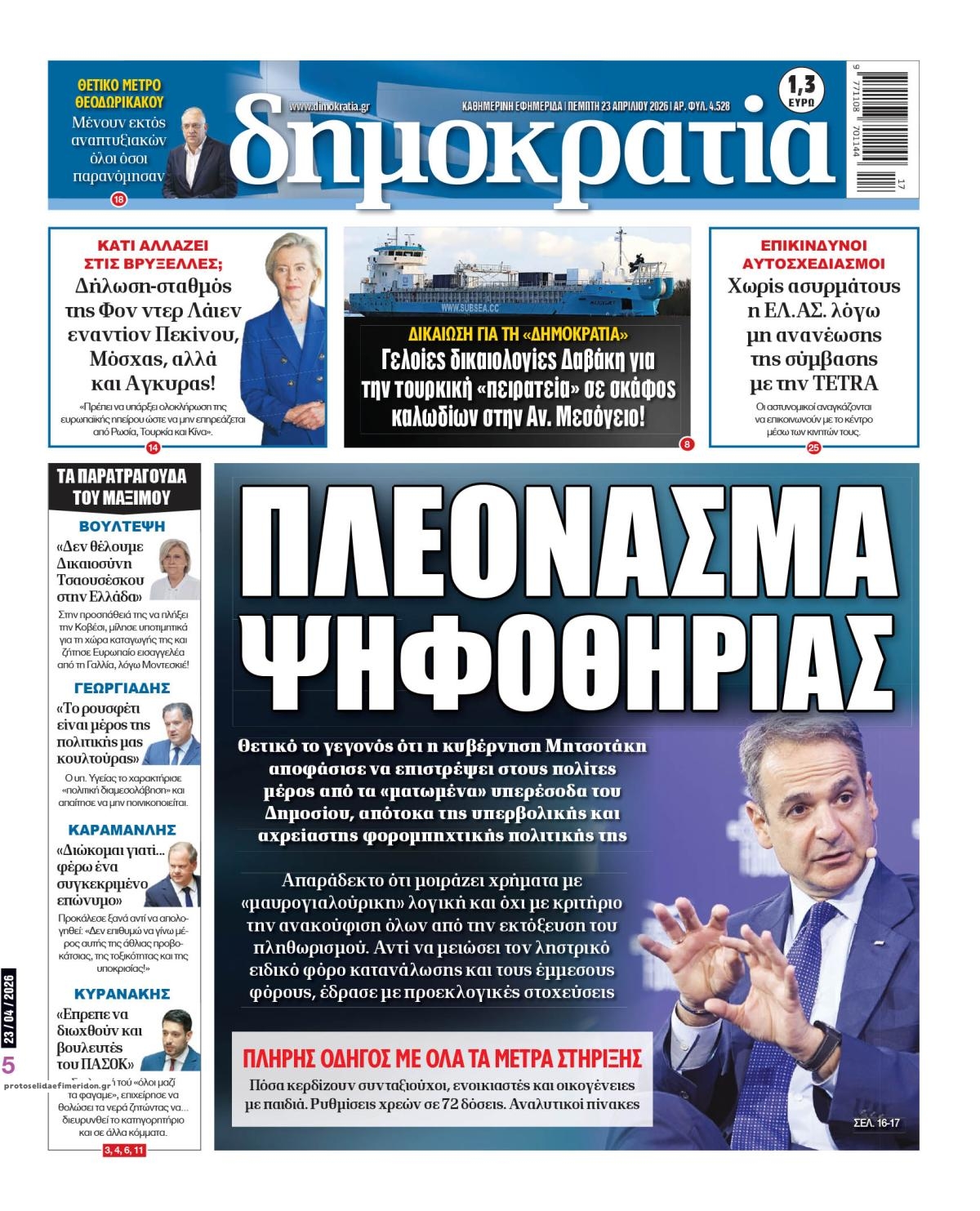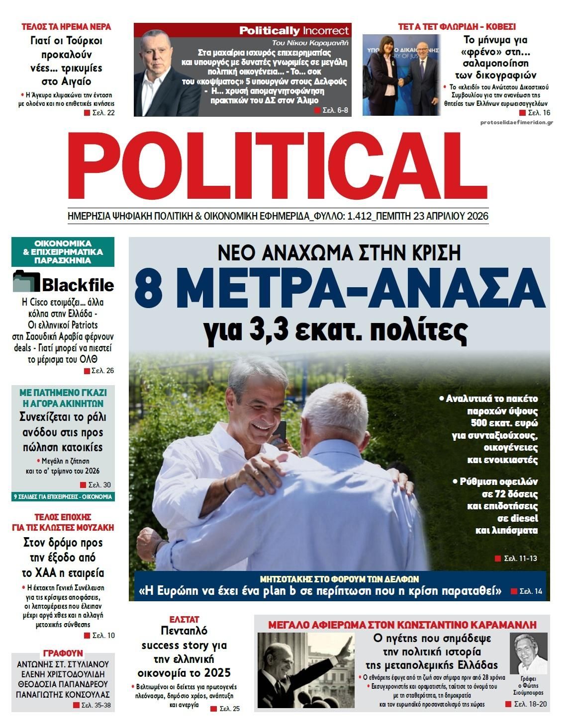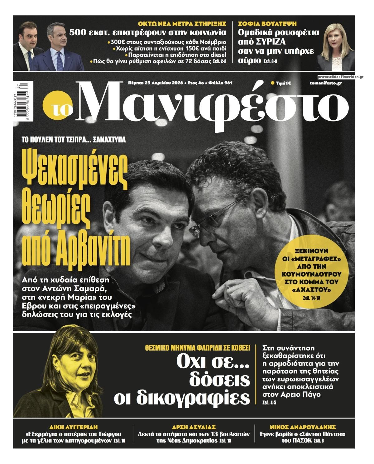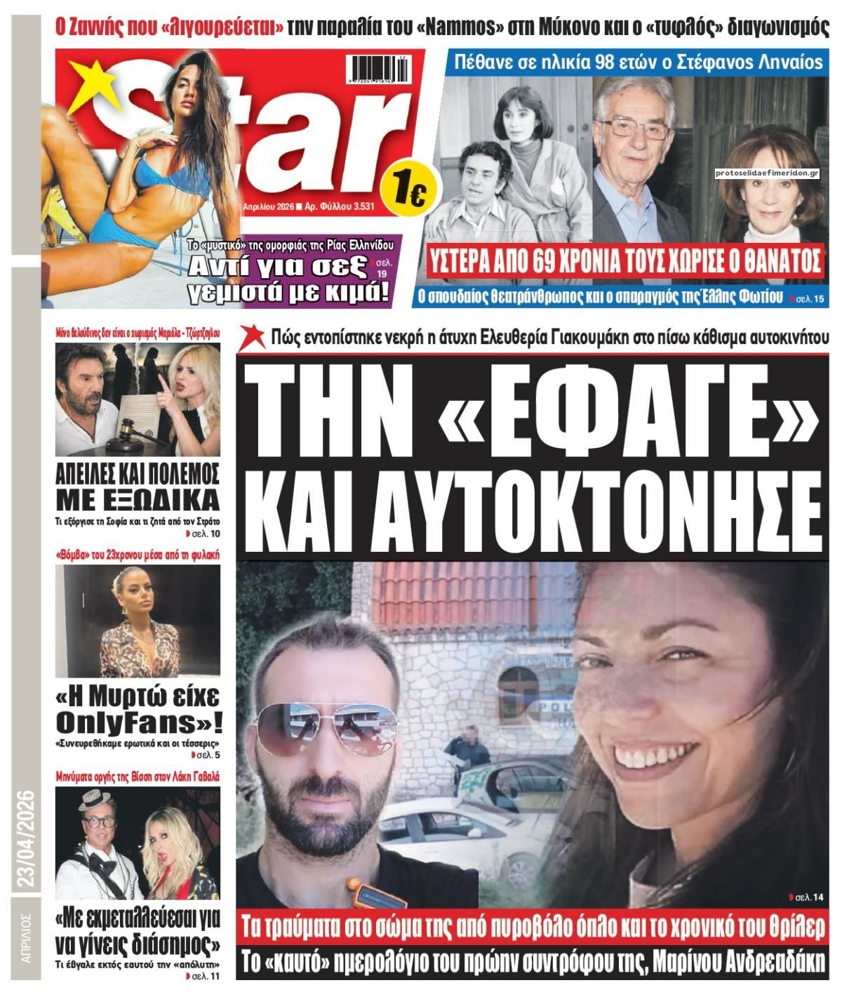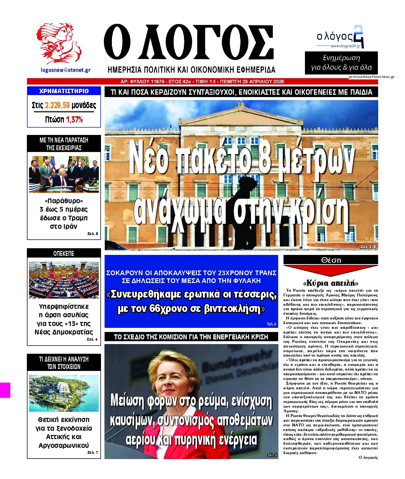 Οι πολιτικές εφημερίδες 23/4/2026 Enikos Newsroom 05:38, Πέμπτη 23 Απριλίου 2026 Media & Τηλεοπτικά Νέα Διαβάστε τα πρωτοσέλιδα από τις πολιτικές εφημερίδες, σήμερα 23/4/2026. ΕΦΗΜΕΡΙΔΕΣ ΠΟΛΙΤΙΚΕΣ ΕΦΗΜΕΡΙΔΕΣ ΠΡΩΤΟΣΕΛΙΔΑ Μοιράσου το: Κυριάκος Πιερρακάκης: «Πήραμε μέτρα που διαχέονται στο σύνολο της κοινωνίας», που δεν προέρχονται από υπερφορολόγηση – ΒΙΝΤΕΟ CNN: Το Πεντάγωνο εκτιμά ότι μπορεί να χρειαστούν άλλοι 6 μήνες για να ανοίξει πλήρως το Στενό του Ορμούζ Λίβανος: Νεκρή η δημοσιογράφος Αμάλ Χαλίλ από ισραηλινό πλήγμα – Νοσηλεύεται η συνάδελφος της που ήταν επίσης εγκλωβισμένη σχολίασε κι εσύ (0 σχόλια) Ακολουθήστε το Enikos στο Google News και μάθετε πρώτοι όλες τις ειδήσεις Δείτε όλες τις τελευταίες ειδήσεις από την Ελλάδα και τον Κόσμο στο enikos.gr Ειδήσεις Ροή Ειδήσεων 8 ώρες πριν Γυναικοκτονία στο Ηράκλειο: Ο 40χρονος εκτέλεσε την Ελευθερία χωρίς καν να της μιλήσει με 9άρι πιστόλι – Το χρονικό της τραγωδίας 8 ώρες πριν Άγιος Δημήτριος: Τραύμα από μαχαίρι κοντά στην καρδιά φέρει ο 25χρονος που εντοπίστηκε νεκρός – Ήταν γιος αξιωματικού της ΕΛΑΣ 8 ώρες πριν Τραμπ: Αντιμέτωπος με την προθεσμία των «60 ημερών» για τον πόλεμο στο Ιράν – Οι 3 επιλογές του και γιατί μπορεί να αγνοήσει το Κογκρέσο 23 ώρες πριν LIVE – 54η ημέρα πολέμου ΗΠΑ – Ισραήλ με Ιράν – Όλες οι εξελίξεις στη Μέση Ανατολή 10 ώρες πριν Κωστής Χατζηδάκης στον ANT1 για τα μέτρα: «Η κυβέρνηση εξαντλεί τα περιθώρια στήριξης για πολίτες και επιχειρήσεις» – ΒΙΝΤΕΟ 39 λεπτά πριν Οπτική ψευδαίσθηση: Μόνο το 1% των ανθρώπων θα βρει το φίδι σε 13 δευτερόλεπτα 54 λεπτά πριν Χρόνιες παθήσεις: Η καθημερινή συνήθεια που μπορεί να μειώσει τον κίνδυνο, σύμφωνα με μελέτη 4 ώρες πριν Ζώδια 23/4: Ημερήσιες προβλέψεις – Υδροχόοι, θα έχετε πολλές νέες ιδέες και το φλερτ θα σας βγαίνει πιο εύκολα 9 ώρες πριν Ύπνος: Ποια είναι η καλύτερη ώρα για τη λήψη μαγνησίου, σύμφωνα με ειδικούς 4 λεπτά πριν ΟΗΕ: Η Λιβύη βρίσκεται σε κρίσιμο σταυροδρόμι – Ξεκάθαρη θέση της Ελλάδας υπέρ του οδικού χάρτη 19 λεπτά πριν ΔΕΔΔΗΕ: Διακοπές ρεύματος σήμερα (23/4) στην Αθήνα και σε άλλες 9 περιοχές της Αττικής 33 λεπτά πριν Το Ιράν είναι έτοιμο να παίξει στο Μουντιάλ, ενώ ο ειδικός απεσταλμένος του Τραμπ προτείνει την αντικατάσταση του με την Ιταλία 39 λεπτά πριν Οπτική ψευδαίσθηση: Μόνο το 1% των ανθρώπων θα βρει το φίδι σε 13 δευτερόλεπτα 54 λεπτά πριν Χρόνιες παθήσεις: Η καθημερινή συνήθεια που μπορεί να μειώσει τον κίνδυνο, σύμφωνα με μελέτη ENIKOS NETWORK 7 σημάδια ότι η φιλία σας δεν θα αντέξει στον χρόνο Νέο κτηριακό συγκρότημα στο «Αττικόν» με δωρεά του Ιδρύματος Σταύρος Νιάρχος Θετικό το α’ τρίμηνο του 2026 για τα ξενοδοχεία της Αθήνας – «Επιβράδυνση» τον Μάρτιο Boυλή: Στην Ολομέλεια το νομοσχέδιο για την απλούστευση του πλαισίου άσκησης οικονομικών δραστηριοτήτων – Όλα όσα προβλέπει Saildrone Spectre: Ο αθόρυβος κυνηγός υποβρυχίων που θα μπορούσε να αλλάξει το μέλλον του ναυτικού πολέμου Κουίζ: Πόσο καλά θυμάσαι την ελληνική μυθολογία; Μπορείς να απαντήσεις σωστά και στις 3 ερωτήσεις; περισσότερα 23:07 , Τετάρτη 22 Απριλίου 2026 Το Σπίτι Δίπλα Στο Ποτάμι: Μια απρόσμενη επίσκεψη ταράζει την Μελισσάνθη Η Πολυξένη αποφεύγει τον Ηλία και η Μαγδαληνή σκέφτεται να συνεργαστεί με τον Οδυσσέα στο νέο ... 16:18 , Τετάρτη 22 Απριλίου 2026 Θοδωρής Κυριακού: Συναντήθηκε με τον Σέρτζιο Ματαρέλα στη Ρώμη – Η Ευρώπη και τα σχέδια ανάπτυξης της GEDI και της La Repubblica στο επίκεντρο της συζήτησης Ο Πρόεδρος του 