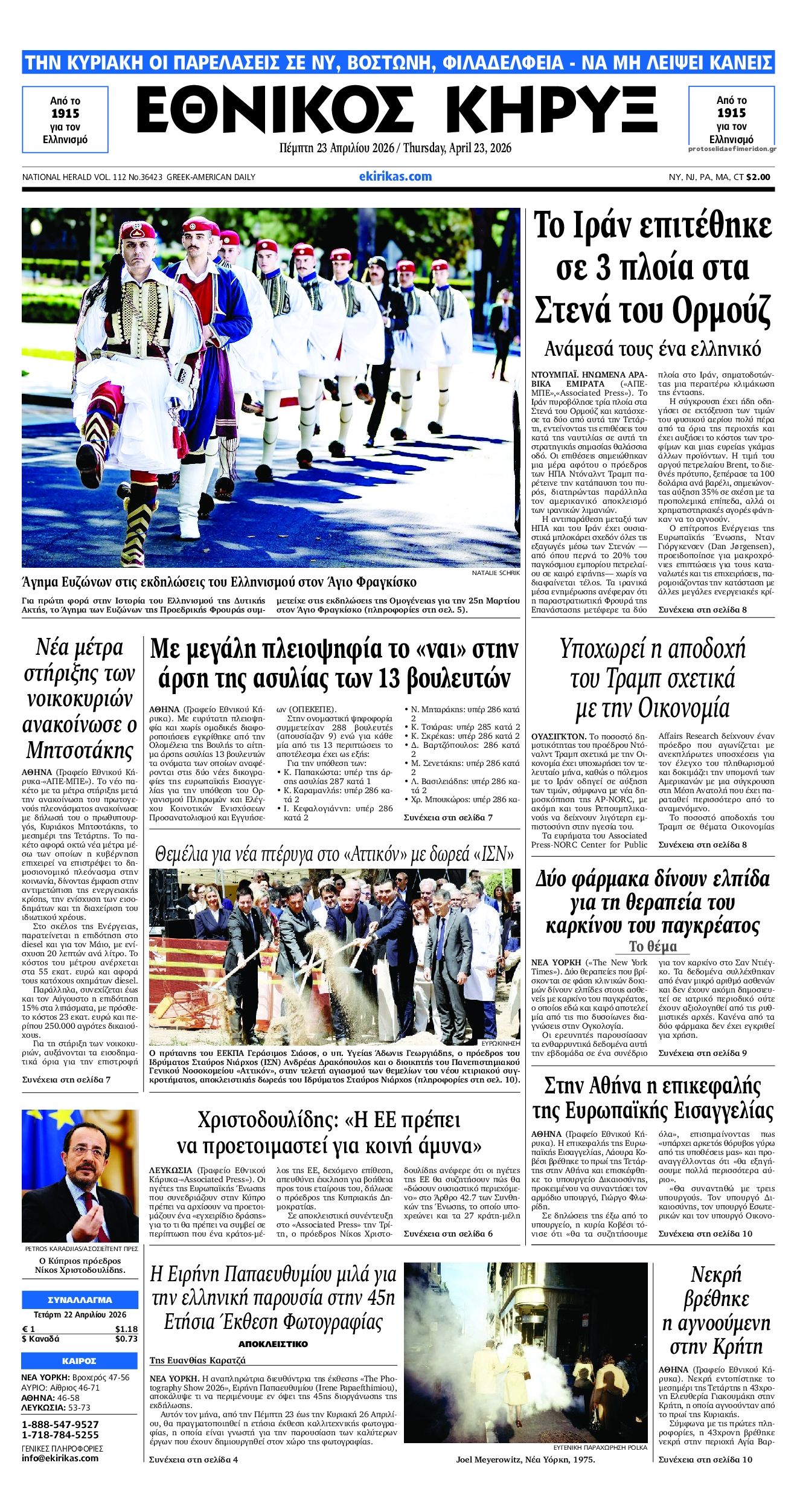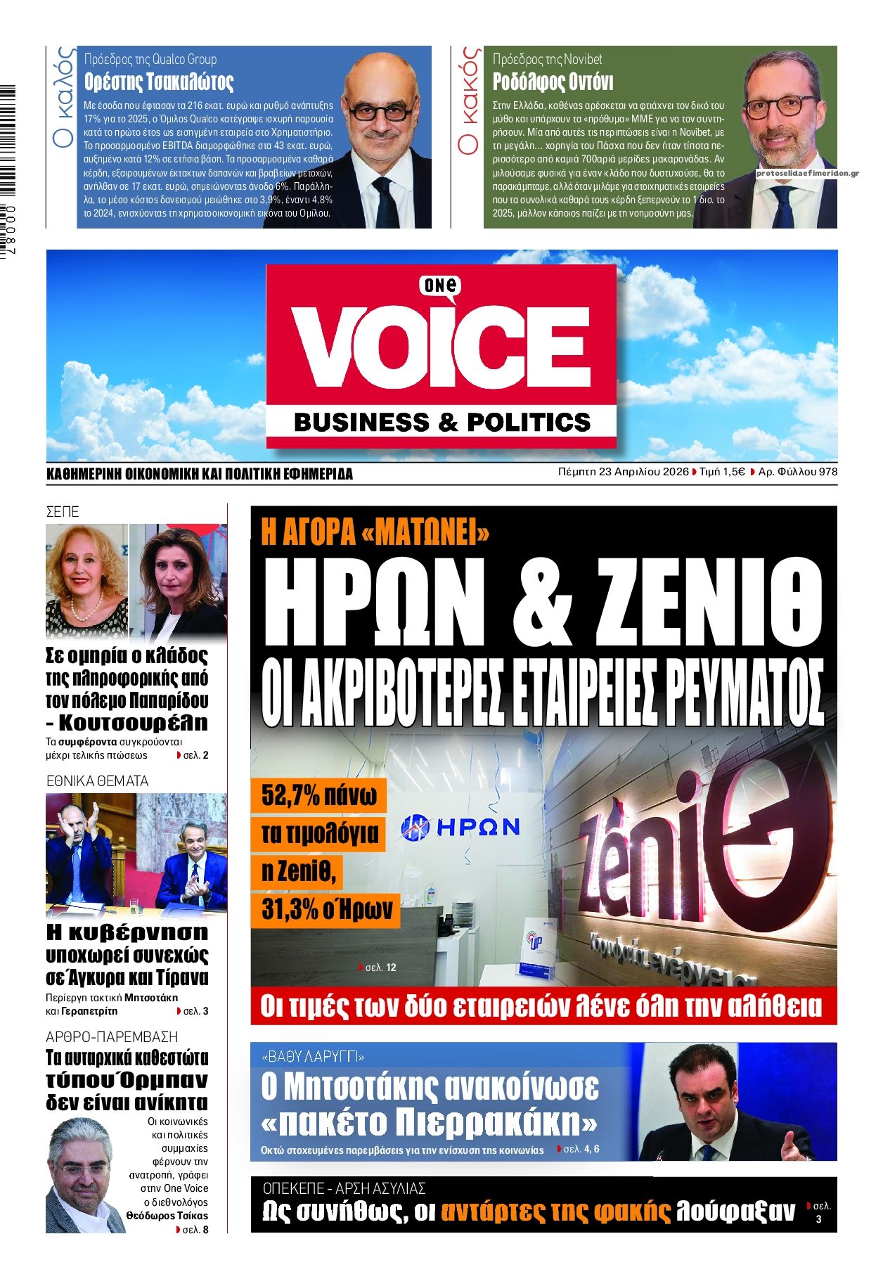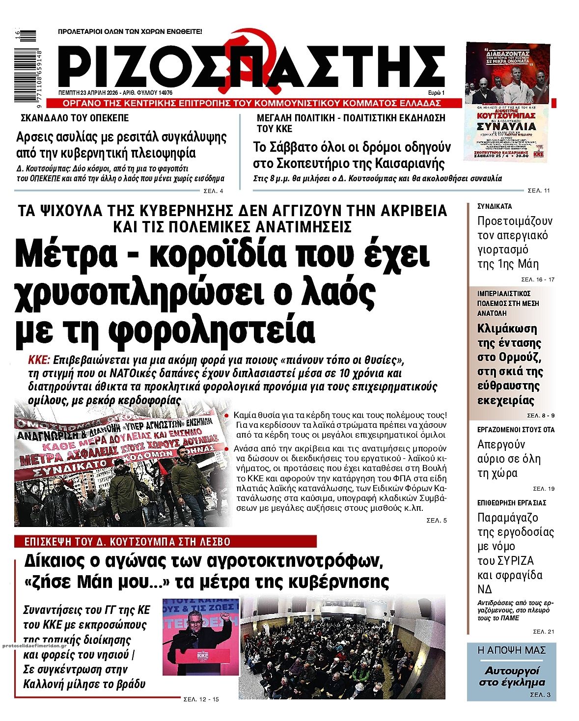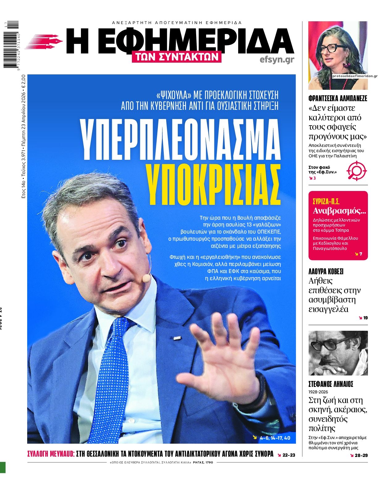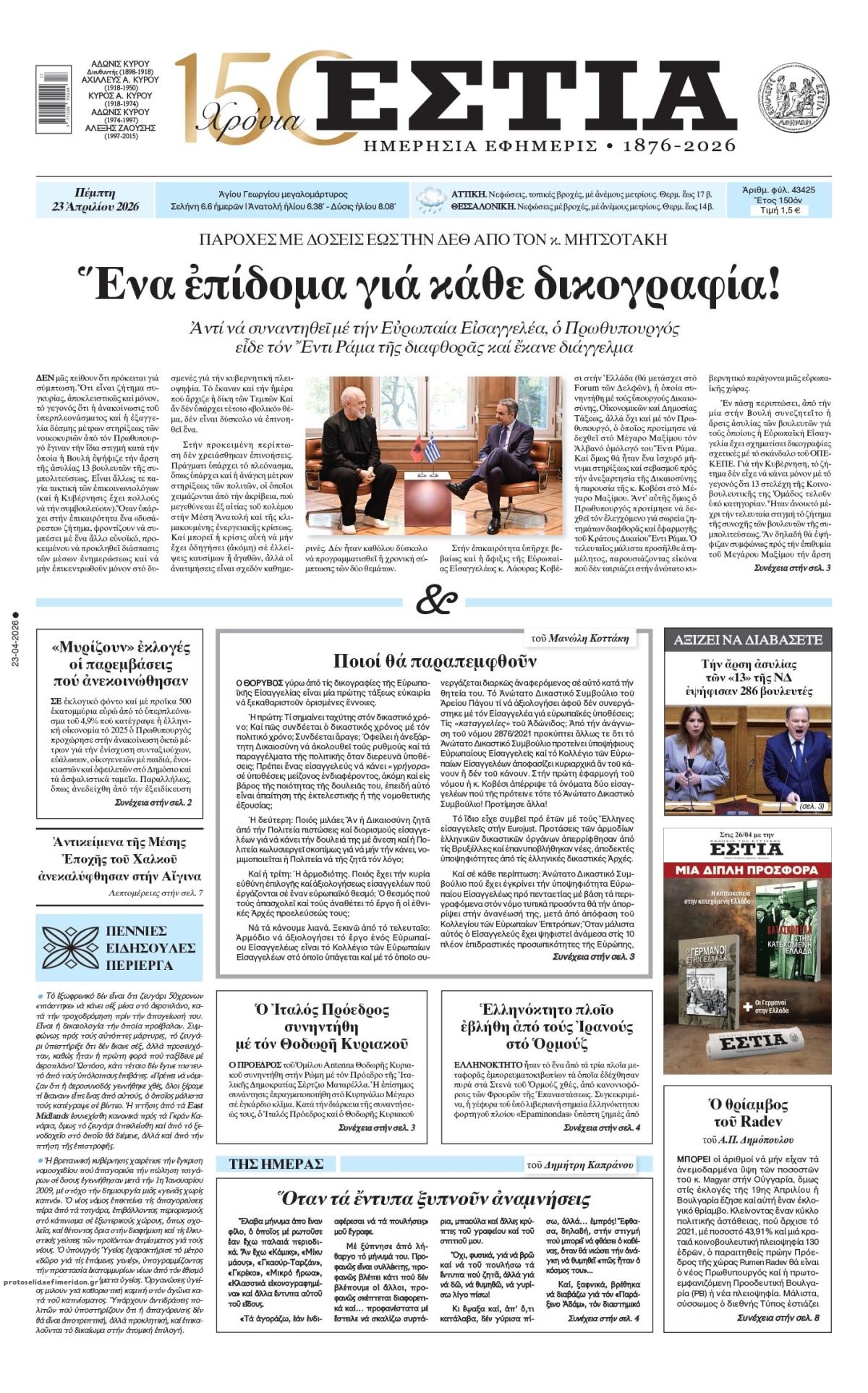 Οι πολιτικές εφημερίδες 23/4/2026 Enikos Newsroom 05:38, Πέμπτη 23 Απριλίου 2026 Media & Τηλεοπτικά Νέα Διαβάστε τα πρωτοσέλιδα από τις πολιτικές εφημερίδες, σήμερα 23/4/2026. ΕΦΗΜΕΡΙΔΕΣ ΠΟΛΙΤΙΚΕΣ ΕΦΗΜΕΡΙΔΕΣ ΠΡΩΤΟΣΕΛΙΔΑ Μοιράσου το: Κυριάκος Πιερρακάκης: «Πήραμε μέτρα που διαχέονται στο σύνολο της κοινωνίας», που δεν προέρχονται από υπερφορολόγηση – ΒΙΝΤΕΟ CNN: Το Πεντάγωνο εκτιμά ότι μπορεί να χρειαστούν άλλοι 6 μήνες για να ανοίξει πλήρως το Στενό του Ορμούζ Λίβανος: Νεκρή η δημοσιογράφος Αμάλ Χαλίλ από ισραηλινό πλήγμα – Νοσηλεύεται η συνάδελφος της που ήταν επίσης εγκλωβισμένη σχολίασε κι εσύ (0 σχόλια) Ακολουθήστε το Enikos στο Google News και μάθετε πρώτοι όλες τις ειδήσεις Δείτε όλες τις τελευταίες ειδήσεις από την Ελλάδα και τον Κόσμο στο enikos.gr Ειδήσεις Ροή Ειδήσεων 8 ώρες πριν Γυναικοκτονία στο Ηράκλειο: Ο 40χρονος εκτέλεσε την Ελευθερία χωρίς καν να της μιλήσει με 9άρι πιστόλι – Το χρονικό της τραγωδίας 8 ώρες πριν Άγιος Δημήτριος: Τραύμα από μαχαίρι κοντά στην καρδιά φέρει ο 25χρονος που εντοπίστηκε νεκρός – Ήταν γιος αξιωματικού της ΕΛΑΣ 8 ώρες πριν Τραμπ: Αντιμέτωπος με την προθεσμία των «60 ημερών» για τον πόλεμο στο Ιράν – Οι 3 επιλογές του και γιατί μπορεί να αγνοήσει το Κογκρέσο 23 ώρες πριν LIVE – 54η ημέρα πολέμου ΗΠΑ – Ισραήλ με Ιράν – Όλες οι εξελίξεις στη Μέση Ανατολή 10 ώρες πριν Κωστής Χατζηδάκης στον ANT1 για τα μέτρα: «Η κυβέρνηση εξαντλεί τα περιθώρια στήριξης για πολίτες και επιχειρήσεις» – ΒΙΝΤΕΟ 39 λεπτά πριν Οπτική ψευδαίσθηση: Μόνο το 1% των ανθρώπων θα βρει το φίδι σε 13 δευτερόλεπτα 54 λεπτά πριν Χρόνιες παθήσεις: Η καθημερινή συνήθεια που μπορεί να μειώσει τον κίνδυνο, σύμφωνα με μελέτη 4 ώρες πριν Ζώδια 23/4: Ημερήσιες προβλέψεις – Υδροχόοι, θα έχετε πολλές νέες ιδέες και το φλερτ θα σας βγαίνει πιο εύκολα 9 ώρες πριν Ύπνος: Ποια είναι η καλύτερη ώρα για τη λήψη μαγνησίου, σύμφωνα με ειδικούς 4 λεπτά πριν ΟΗΕ: Η Λιβύη βρίσκεται σε κρίσιμο σταυροδρόμι – Ξεκάθαρη θέση της Ελλάδας υπέρ του οδικού χάρτη 19 λεπτά πριν ΔΕΔΔΗΕ: Διακοπές ρεύματος σήμερα (23/4) στην Αθήνα και σε άλλες 9 περιοχές της Αττικής 33 λεπτά πριν Το Ιράν είναι έτοιμο να παίξει στο Μουντιάλ, ενώ ο ειδικός απεσταλμένος του Τραμπ προτείνει την αντικατάσταση του με την Ιταλία 39 λεπτά πριν Οπτική ψευδαίσθηση: Μόνο το 1% των ανθρώπων θα βρει το φίδι σε 13 δευτερόλεπτα 54 λεπτά πριν Χρόνιες παθήσεις: Η καθημερινή συνήθεια που μπορεί να μειώσει τον κίνδυνο, σύμφωνα με μελέτη ENIKOS NETWORK 7 σημάδια ότι η φιλία σας δεν θα αντέξει στον χρόνο Νέο κτηριακό συγκρότημα στο «Αττικόν» με δωρεά του Ιδρύματος Σταύρος Νιάρχος Θετικό το α’ τρίμηνο του 2026 για τα ξενοδοχεία της Αθήνας – «Επιβράδυνση» τον Μάρτιο Boυλή: Στην Ολομέλεια το νομοσχέδιο για την απλούστευση του πλαισίου άσκησης οικονομικών δραστηριοτήτων – Όλα όσα προβλέπει Saildrone Spectre: Ο αθόρυβος κυνηγός υποβρυχίων που θα μπορούσε να αλλάξει το μέλλον του ναυτικού πολέμου Κουίζ: Πόσο καλά θυμάσαι την ελληνική μυθολογία; Μπορείς να απαντήσεις σωστά και στις 3 ερωτήσεις; περισσότερα 23:07 , Τετάρτη 22 Απριλίου 2026 Το Σπίτι Δίπλα Στο Ποτάμι: Μια απρόσμενη επίσκεψη ταράζει την Μελισσάνθη Η Πολυξένη αποφεύγει τον Ηλία και η Μαγδαληνή σκέφτεται να συνεργαστεί με τον Οδυσσέα στο νέο ... 16:18 , Τετάρτη 22 Απριλίου 2026 Θοδωρής Κυριακού: Συναντήθηκε με τον Σέρτζιο Ματαρέλα στη Ρώμη – Η Ευρώπη και τα σχέδια ανάπτυξης της GEDI και της La Repubblica στο επίκεντρο της συζήτησης Ο Πρόεδρος του 
