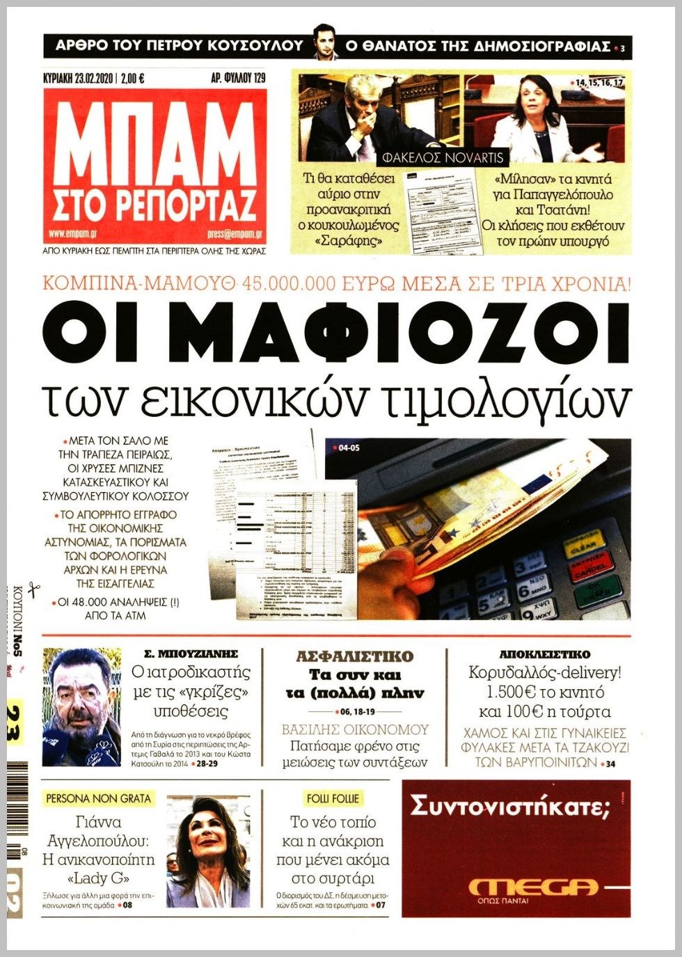 Οι πολιτικές εφημερίδες 23/2/2020 Διονύσης Νίκκας 07:18, Κυριακή 23 Φεβρουαρίου 2020 Media Διαβάστε τα πρωτοσέλιδα των πολιτικών εφημερίδων… ΠΟΛΙΤΙΚΕΣ ΕΦΗΜΕΡΙΔΕΣ ΠΡΩΤΟΣΕΛΙΔΑ Μοιράσου το: σχολίασε κι εσύ (0 σχόλια) Ακολουθήστε το enikos.gr στο Google News και μάθετε πρώτοι όλες τις ειδήσεις Δείτε όλες τις τελευταίες ειδήσεις από την Ελλάδα και τον Κόσμο στο enikos.gr Ειδήσεις Ροή Ειδήσεων 26 λεπτά πριν Τσιάρας προς αγρότες: Τα μπλόκα και τα πείσματα δεν ωφελούν – Οι λύσεις περνούν μέσα από τον διάλογο 1 ώρα πριν Αρχεία Έπσταϊν: Οι συγκλονιστικές φωτογραφίες – Ο Μάικλ Τζάκσον, ο Μικ Τζάγκερ και ο Κέβιν Σπέισι ανάμεσα στους διάσημους που απεικονίζονται 3 ώρες πριν Νέες ταυτότητες: Μεγάλη αναμονή για ραντεβού στην Αττική – Τέλος τα ταξίδια εκτός Ελλάδος από τον Αύγουστο για όσους δεν έχουν αλλάξει 2 ώρες πριν Ινδία: Επτά ελέφαντες σκοτώθηκαν κατά τη σύγκρουση επιβατικού τρένου με κοπάδι 3 ώρες πριν Συνελήφθη οδηγός μηχανής που έτρεχε με 161 χλμ στη Συγγρού – Τον έπιασε το ραντάρ της Τροχαίας 3 ώρες πριν Μία νέα «χρυσή» περίοδος αρχίζει για 3 ζώδια από σήμερα – «Μία αναπάντεχη ευκαιρία οδηγεί στην επιτυχία» 5 ώρες πριν Αγχώνεται για το χριστουγεννιάτικο δώρο που πήρε στην πλούσια σύντροφό του – «Φοβάμαι πως θα το βρει φθηνιάρικο, φοράει βραχιόλια Cartier» 2 ώρες πριν Διαιτολόγος αποκαλύπτει 9 πρωινές συνήθειες που «λιώνουν» το κοιλιακό λίπος – «Υποστηρίζουν την υγιεινή απώλεια βάρους» 3 ώρες πριν Οι 7 φράσεις που δεν λένε ποτέ οι συναισθηματικά έξυπνοι άνθρωποι κατά τη διάρκεια ενός καβγά 9 λεπτά πριν Πάτρα: Πέθανε 46χρονος έπειτα από λιποθυμικό επεισόδιο στο σπίτι του 17 λεπτά πριν «Μεγάλη Χίμαιρα»: Πότε κάνει πρεμιέρα η σειρά 25 λεπτά πριν Καλλιθέα: Έφοδος του «ελληνικού FBI» σε δύο καταστήματα stripshow – 5 συλλήψεις – Βίντεο 26 λεπτά πριν Τσιάρας προς αγρότες: Τα μπλόκα και τα πείσματα δεν ωφελούν – Οι λύσεις περνούν μέσα από τον διάλογο 32 λεπτά πριν Μεσσηνία: Μαχαιριές έπειτα από καβγά για οικονομικές διαφορές στον Πολύλοφο – Συνελήφθη 40χρονος ENIKOS NETWORK Γήρανση του εγκεφάλου: Νευροεπιστήμονες ανακάλυψαν τη 10λεπτη δραστηριότητα που μπορεί να τη σταματήσει Είστε μόνιμα απρόσεκτοι; 3 σημάδια που δείχνουν ότι μπορεί να είναι σύμπτωμα πάθησης Χειμερινές εκπτώσεις 2026: Πρεμιέρα στις 12 Ιανουαρίου – Πόσο θα διαρκέσουν και τι πρέπει να γνωρίζουν οι καταναλωτές Χρήστος Δήμας: Στα 2,5 εκατ. ευρώ την ημέρα το κόστος από το άνοιγμα των διοδίων από τους αγρότες – Θα αξιώσουν αποζημίωση ... Χαρτογραφώντας το «σημείο χωρίς επιστροφή»: Για πρώτη φορά αποκαλύπτεται με λεπτομέρεια το ακανθώδες όριο της ατμόσφαιρας τ... Η Google καταργεί τη λειτουργία «dark web report» – Πώς θα μπορούν οι χρήστες να διαγράφουν τα δεδομένα τους περισσότερα 12:53 , Σάββατο 20 Δεκεμβρίου 2025 Να μ’ αγαπάς: Το παρελθόν έρχεται στο φως – Καταιγιστικές εξελίξεις στα τελευταία επεισόδια του 2025 Ο Άγγελος αποκαλύπτεται, η Φωτεινή ανησυχεί για τον Λευτέρη και η Ζωή έρχεται αντιμέτωπη με το... 11:41 , Σάββατο 20 Δεκεμβρίου 2025 «Η αγάπη δεν χάνεται ποτέ»: Η μικρού μήκους ταινία κινουμένων σχεδίων που θέτει ερωτήματα για τη ζωή και τον θάνατο Ο θάνατος είναι ένα από τα πιο σκληρά θέματα που καλείται να διαχειριστεί κάποιος στη διάρκεια... 09:30 , Σάββατο 20 Δεκεμβρίου 2025 «Porto Leone: Στη γειτονιά με τα κόκκινα φανάρια» – Ο Χρόνης αποκαλύπτει στην Αλεξάνδρα το μυστικό για το παιδί της Λένας Η μεγάλη δραματική σειρά του Apha «Porto Leone: Στη γειτονιά με τα κόκ
