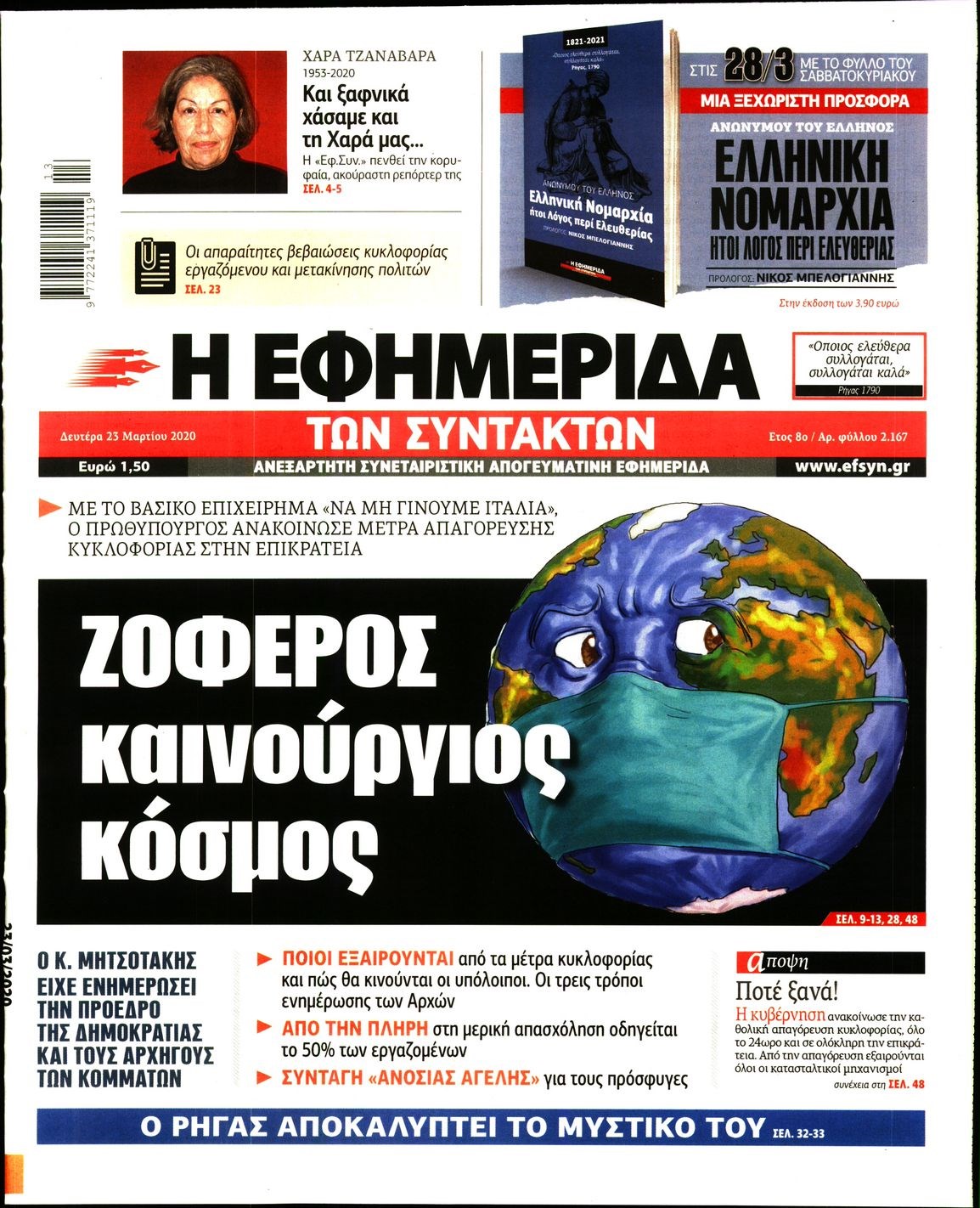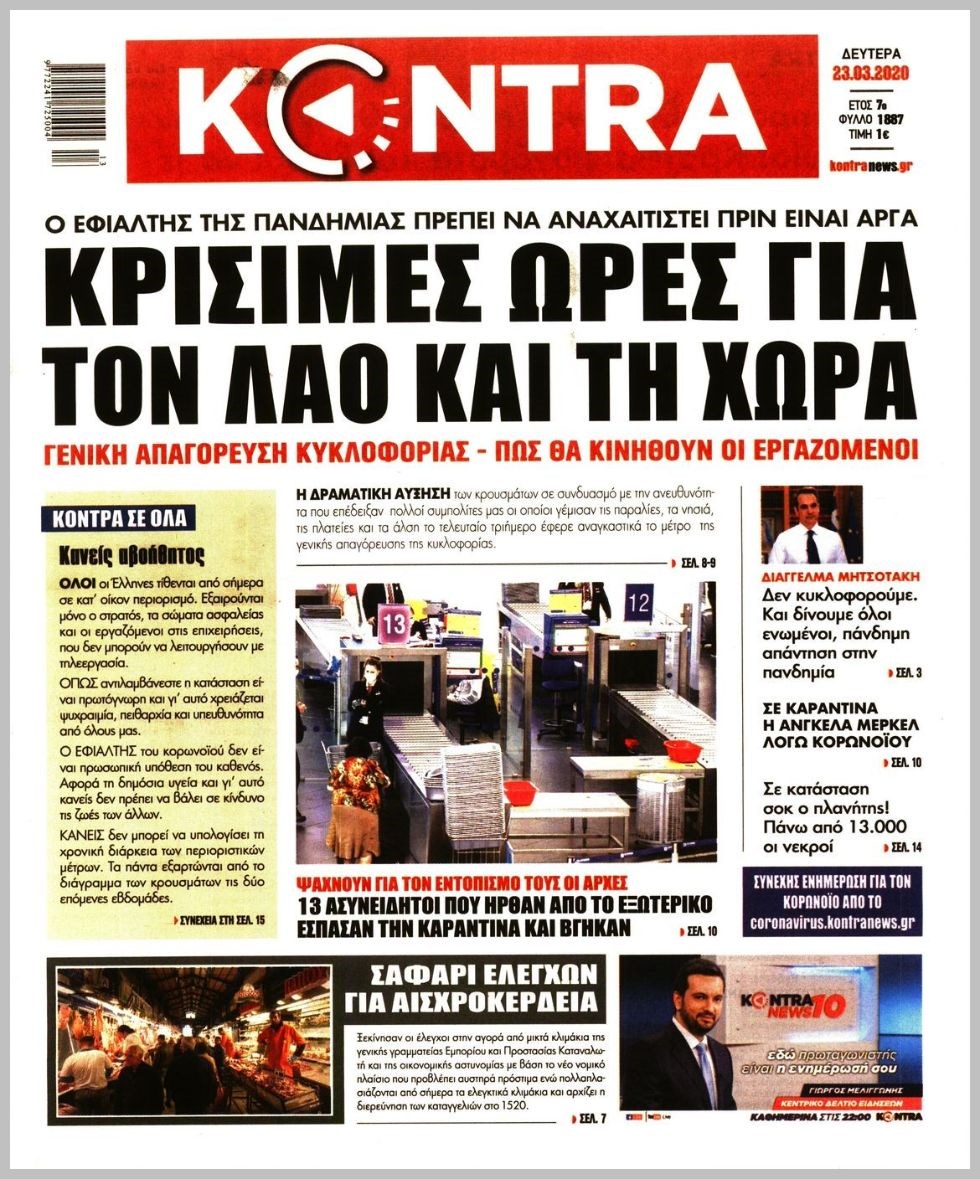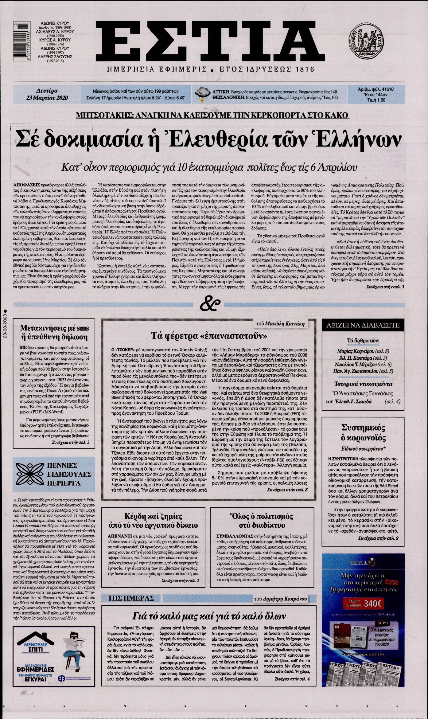 Οι πολιτικές εφημερίδες 23/3/2020 Διονύσης Νίκκας 06:19, Δευτέρα 23 Μαρτίου 2020 Media Διαβάστε τα πρωτοσέλιδα των πολιτικών εφημερίδων… ΠΟΛΙΤΙΚΕΣ ΕΦΗΜΕΡΙΔΕΣ ΠΡΩΤΟΣΕΛΙΔΑ Μοιράσου το: σχολίασε κι εσύ (0 σχόλια) Ακολουθήστε το enikos.gr στο Google News και μάθετε πρώτοι όλες τις ειδήσεις Δείτε όλες τις τελευταίες ειδήσεις από την Ελλάδα και τον Κόσμο στο enikos.gr Ειδήσεις Ροή Ειδήσεων 4 ώρες πριν Υπόθεση Έπσταϊν: Το Υπουργείο Δικαιοσύνης δημοσιοποίησε μια σειρά από εξαιρετικά επεξεργασμένα αρχεία – «Λείπουν τα πιο σημαντικά έγγραφα», λένε οι Δημοκρατικοί 1 ώρα πριν Γιορτές με μπλόκα για τους αγρότες: Ανοίγουν διόδια και μοιράζουν προϊόντα στους ταξιδιώτες 2 ώρες πριν Εξαφάνιση 33χρονου γιατρού στην Κρήτη: «Άναψα τα φώτα, τρόμαξε και άρχισε να τρέχει στα χωράφια» – Η τελευταία διαδρομή και η μαρτυρία «κλειδί» 3 ώρες πριν Ο «χάρτης» με τις αυξήσεις και τις φοροελαφρύνσεις του 2026 – Ποιοι και πόσα κερδίζουν 1 ώρα πριν Τα αρχεία του Έπσταϊν αποκαλύπτουν φωτογραφία του έκπτωτου πρίγκιπα Άντριου – Είναι ξαπλωμένος στην αγκαλιά 5 γυναικών 1 ώρα πριν Μία νέα «χρυσή» περίοδος αρχίζει για 3 ζώδια από σήμερα – «Μία αναπάντεχη ευκαιρία οδηγεί στην επιτυχία» 6 ώρες πριν Αυγά: Πόσα μπορείτε να τρώτε την ημέρα με ασφάλεια για μέγιστη πρόσληψη πρωτεΐνης 3 ώρες πριν Αρχαιολόγοι ανακάλυψαν σε χωράφι απεικόνιση 600 ετών ενός Αγίου – Τα στοιχεία που δείχνουν ότι μαρτύρησε 2 ώρες πριν Αγχώνεται για το χριστουγεννιάτικο δώρο που πήρε στην πλούσια σύντροφό του – «Φοβάμαι πως θα το βρει φθηνιάρικο, φοράει βραχιόλια Cartier» 9 λεπτά πριν Τραγωδία στην άσφαλτο στα Χανιά: Νεκρός 37χρονος οδηγός ΙΧ – Τον βρήκαν ώρες μετά το τροχαίο 17 λεπτά πριν Τα Labubu «μετακομίζουν» στο Χόλιγουντ: Η Sony Pictures ετοιμάζει live-action ταινία με τον σκηνοθέτη του «Wonka» 25 λεπτά πριν Νέες ταυτότητες: Μεγάλη αναμονή για ραντεβού στην Αττική – Τέλος τα ταξίδια εκτός Ελλάδος από τον Αύγουστο για όσους δεν έχουν αλλάξει 33 λεπτά πριν Οι 7 φράσεις που δεν λένε ποτέ οι συναισθηματικά έξυπνοι άνθρωποι κατά τη διάρκεια ενός καβγά 37 λεπτά πριν Τηλεθέαση (19/12): Ανατροπές και πρωτιές στην πρωινή ζώνη ENIKOS NETWORK Είστε μόνιμα απρόσεκτοι; 3 σημάδια που δείχνουν ότι μπορεί να είναι σύμπτωμα πάθησης Πόσα κιλά παίρνουμε πραγματικά τα Χριστούγεννα, σύμφωνα με την επιστήμη – Πώς να το αποτρέψουμε; e-ΕΦΚΑ και ΔΥΠΑ: Έρχονται νέες πληρωμές έως τις 24 Δεκεμβρίου – Ποιοι πάνε ταμείο Επίδομα παιδιού: Τι αλλάζει από το 2026 – Το όφελος από τις φορολογικές ελαφρύνσεις Χαρτογραφώντας το «σημείο χωρίς επιστροφή»: Για πρώτη φορά αποκαλύπτεται με λεπτομέρεια το ακανθώδες όριο της ατμόσφαιρας τ... Η Google καταργεί τη λειτουργία «dark web report» – Πώς θα μπορούν οι χρήστες να διαγράφουν τα δεδομένα τους περισσότερα 09:30 , Σάββατο 20 Δεκεμβρίου 2025 «Porto Leone: Στη γειτονιά με τα κόκκινα φανάρια» – Ο Χρόνης αποκαλύπτει στην Αλεξάνδρα το μυστικό για το παιδί της Λένας Η μεγάλη δραματική σειρά του Apha «Porto Leone: Στη γειτονιά με τα κόκκινα φανάρια» μας μεταφέ... 08:14 , Σάββατο 20 Δεκεμβρίου 2025 Τρομεροί γονείς: Η Μαρία Καβογιάννη εισβάλλει στο σπίτι της οικογένειας Στεφανίδη Όσα θα δούμε στο νέο διπλό επεισόδιο της σειράς «Τρομεροί γονείς», σήμερα Σάββατο 20 Δεκεμβρίο... 05:48 , Σάββατο 20 Δεκεμβρίου 2025 Οι οικονομικές εφημερίδες 20/12/2025 Διαβάστε τα πρωτοσέλιδα από τις οικονομικές εφημερίδες, σήμερα 20/12/2025. 05:43 , Σάββατο 20 Δεκεμβρίου 2025 Οι αθλητικές εφημερίδες 20/12/2025 Διαβάστε τα πρωτοσέλιδα από τι