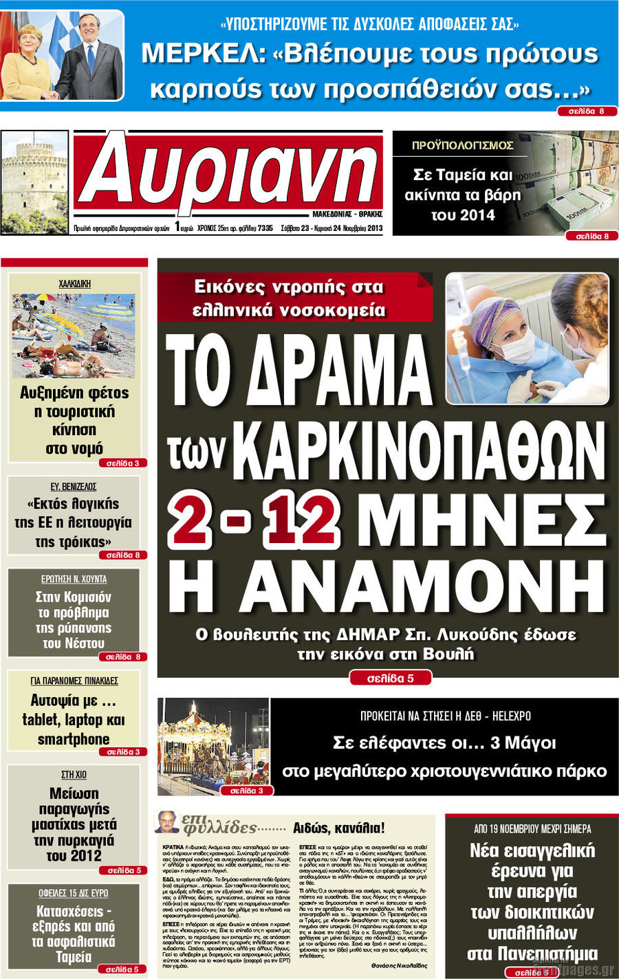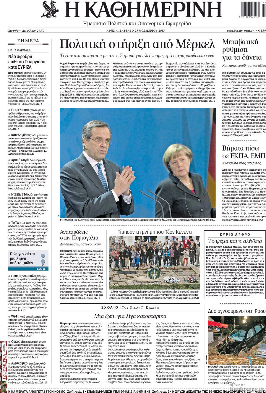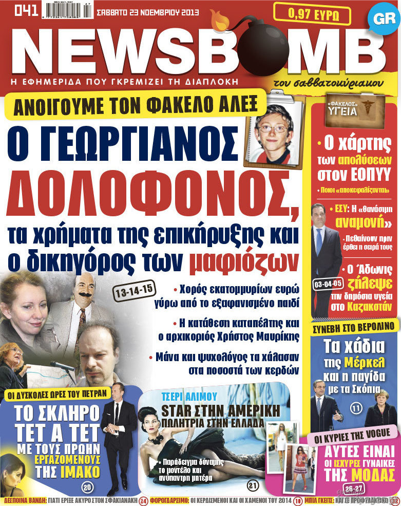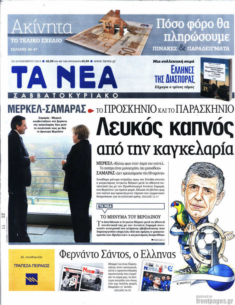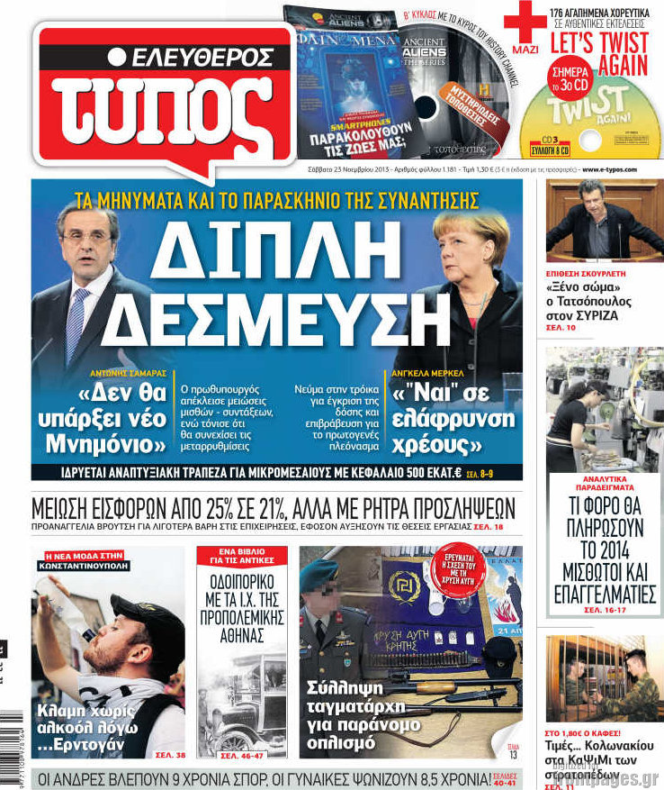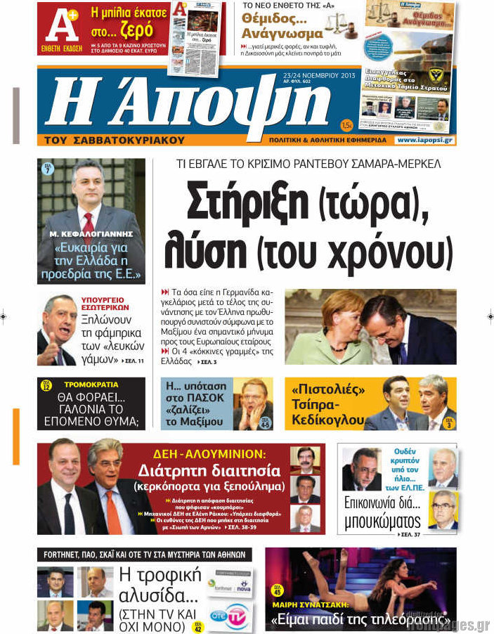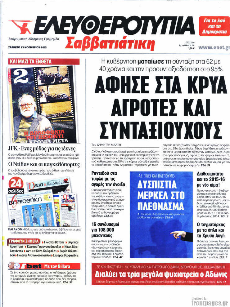 Οι πολιτικές εφημερίδες Enikos Newsroom 08:48, Σάββατο 23 Νοεμβρίου 2013 Media Οι πολιτικές εφημερίδες ΕΦΗΜΕΡΙΔΕΣ ΠΟΛΙΤΙΚΕΣ ΕΦΗΜΕΡΙΔΕΣ Μοιράσου το: σχολίασε κι εσύ (0 σχόλια) Ακολουθήστε το enikos.gr στο Google News και μάθετε πρώτοι όλες τις ειδήσεις Δείτε όλες τις τελευταίες ειδήσεις από την Ελλάδα και τον Κόσμο στο enikos.gr Ειδήσεις Ροή Ειδήσεων 42 λεπτά πριν Πώς δρούσε το κύκλωμα που διακινούσε ναρκωτικά σε σχολεία – Υπέβαλαν σε βασανιστήρια όσους δεν τηρούσαν τους «κανόνες πειθαρχίας» 1 ώρα πριν Αγρότες: Γιορτές στα μπλόκα με ανοιχτά διόδια – Δικογραφία στα Ιωάννινα για το σήκωμα των μπαρών 5 ώρες πριν Αρχεία Έπσταϊν: Οι συγκλονιστικές φωτογραφίες – Ο Μάικλ Τζάκσον, ο Μικ Τζάγκερ και ο Κέβιν Σπέισι ανάμεσα στους διάσημους που απεικονίζονται 3 ώρες πριν Βέλγιο: Άγνωστοι έριξαν κόκκινη μπογιά στο προξενείο της Πολωνίας στις Βρυξέλλες 2 ώρες πριν ΕΛΑΣ: Συνελήφθησαν Υπαρχιπυροσβέστης και δύο ακόμη άτομα για κατοχή και διακίνηση ναρκωτικών ουσιών – Η καταγγελία και ο τιμοκατάλογος 1 ώρα πριν Η τύχη χαμογελά σε 3 ζώδια έως τις 28 Δεκεμβρίου – «Προσέξτε τις επιλογές σας και η επιμονή σας θα ανταμειφθεί» 5 ώρες πριν Διαιτολόγος αποκαλύπτει 9 πρωινές συνήθειες που «λιώνουν» το κοιλιακό λίπος – «Υποστηρίζουν την υγιεινή απώλεια βάρους» 6 ώρες πριν Οι 7 φράσεις που δεν λένε ποτέ οι συναισθηματικά έξυπνοι άνθρωποι κατά τη διάρκεια ενός καβγά 8 ώρες πριν Enerwave: Το νέο «ρεύμα» στη λιανική ενέργειας που αλλάζει την εμπειρία του καταναλωτή 3 λεπτά πριν Αττική: Εξαρθρώθηκε εγκληματική οργάνωση που έκλεβε οχήματα, τα παραποιούσε και τα μεταπωλούσε σε πολίτες – Πώς δρούσε το κύκλωμα 11 λεπτά πριν Κωνσταντίνος Αργυρός: «Δεν θέλω να ασχοληθώ με την πολιτική σε αυτή τη φάση – Μου έχουν γίνει προτάσεις» 20 λεπτά πριν Σέρρες: Διέρρηξαν διαμέρισμα και «βούτηξαν» ρολόγια συνολικής αξίας 15.000 ευρώ – 3 συλλήψεις 28 λεπτά πριν Κουίζ για την παλιά Αθήνα: Αναγνωρίζετε την συνοικία; Είναι από τις πιο γνωστές 36 λεπτά πριν Ζελένσκι: Οι Αμερικανοί πρότειναν συνάντηση Ουκρανίας, ΗΠΑ, Ρωσίας στο Μαϊάμι ENIKOS NETWORK Η αποχή από την αναπαραγωγή παρατείνει τη ζωή στα ζώα, σύμφωνα με μελέτη – Τι ισχύει για τους ανθρώπους; Σημαντικές επαφές στις ΗΠΑ είχε ο υπουργός Υγείας Άδωνις Γεωργιάδης Στα ύψη ο χρυσός – Νέο ρεκόρ στην τιμή της λίρας, πόσο πωλείται Τέλη κυκλοφορίας 2026: Προσοχή στην προθεσμία εξόφλησής τους – Πώς διαμορφώνονται τα πρόστιμα σε περίπτωση καθυστέρησης Χαρτογραφώντας το «σημείο χωρίς επιστροφή»: Για πρώτη φορά αποκαλύπτεται με λεπτομέρεια το ακανθώδες όριο της ατμόσφαιρας τ... Η Google καταργεί τη λειτουργία «dark web report» – Πώς θα μπορούν οι χρήστες να διαγράφουν τα δεδομένα τους περισσότερα 14:04 , Σάββατο 20 Δεκεμβρίου 2025 Η Realnews αυτής της Κυριακής (21/12/2025) Με τίτλο: «Ασπίδα προστασίας για την Ελλάδα» κυκλοφορεί, αυτήν την Κυριακή, η Realnews. Σημαντ... 12:53 , Σάββατο 20 Δεκεμβρίου 2025 Να μ’ αγαπάς: Το παρελθόν έρχεται στο φως – Καταιγιστικές εξελίξεις στα τελευταία επεισόδια του 2025 Ο Άγγελος αποκαλύπτεται, η Φωτεινή ανησυχεί για τον Λευτέρη και η Ζωή έρχεται αντιμέτωπη με το... 11:41 , Σάββατο 20 Δεκεμβρίου 2025 «Η αγάπη δεν χάνεται ποτέ»: Η μικρού μήκους ταινία κινουμένων σχεδίων που θέτει ερωτήματα για τη ζωή και τον θάνατο Ο θάνατος είναι ένα από τα πιο σκληρά θέματα που καλείται να διαχειριστεί κάποιος στη διάρκεια... 09:30 , Σάββατο 20 Δεκεμβρίου 2025 «Porto Leone: Στη γειτονιά με τα κόκκινα φανάρια» – Ο Χρόνης αποκαλύ