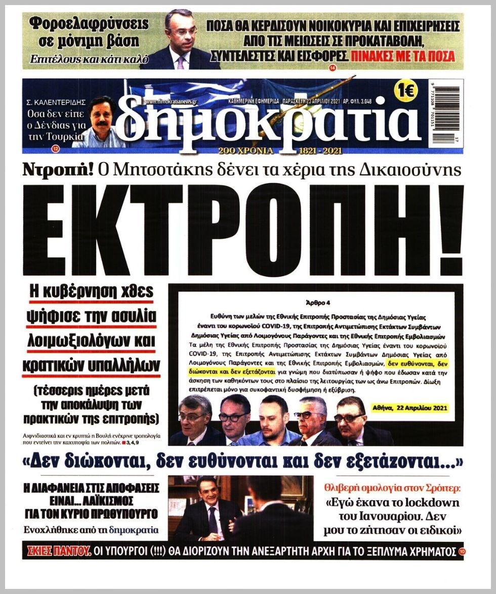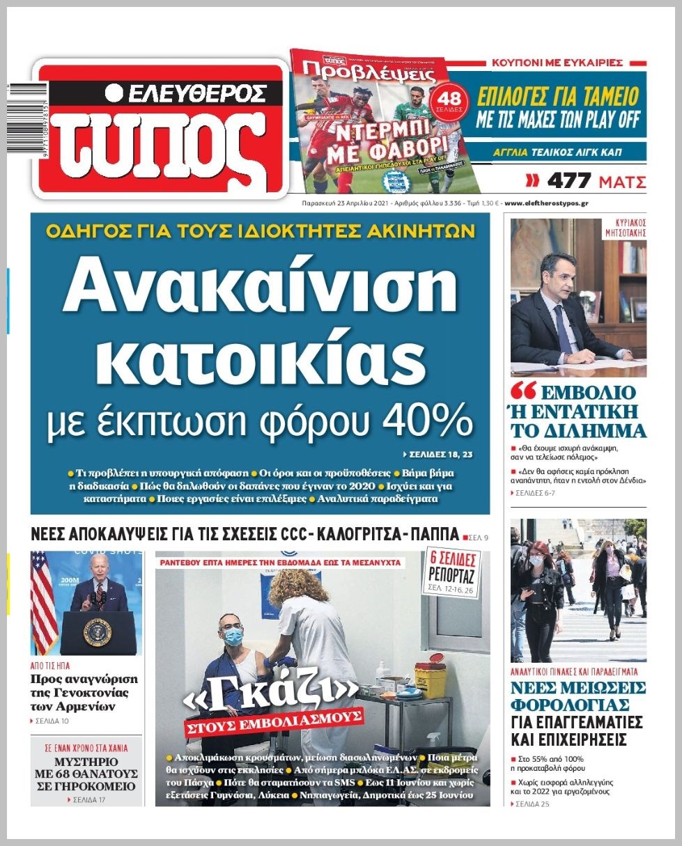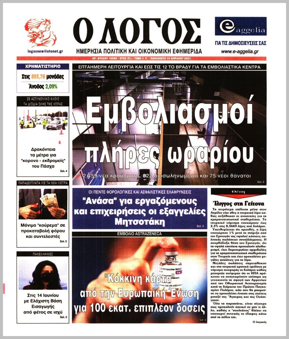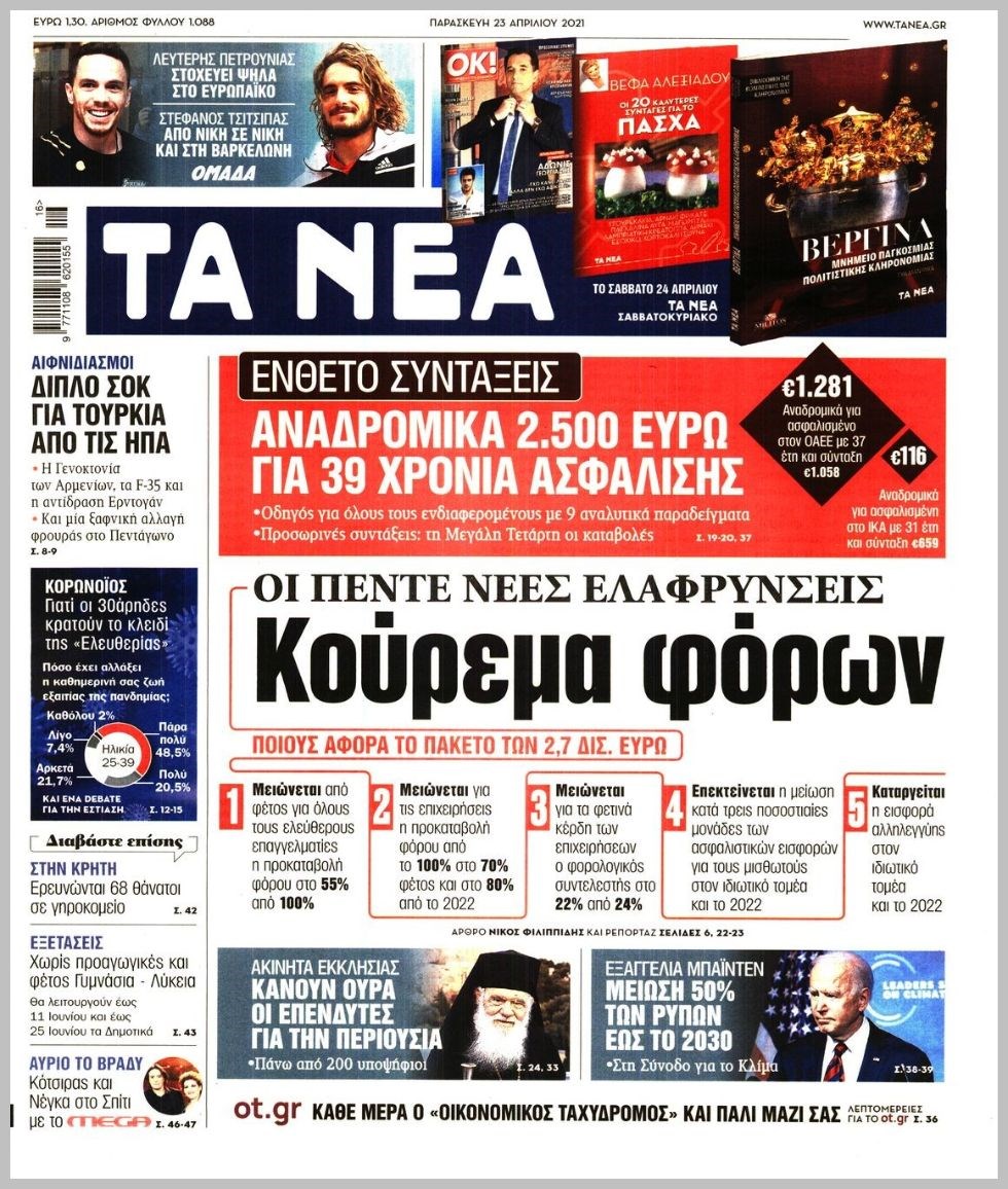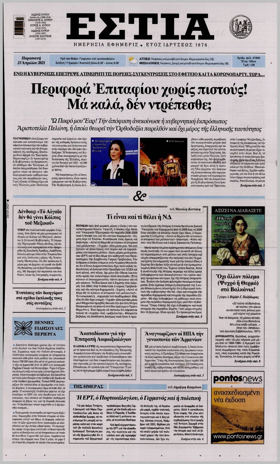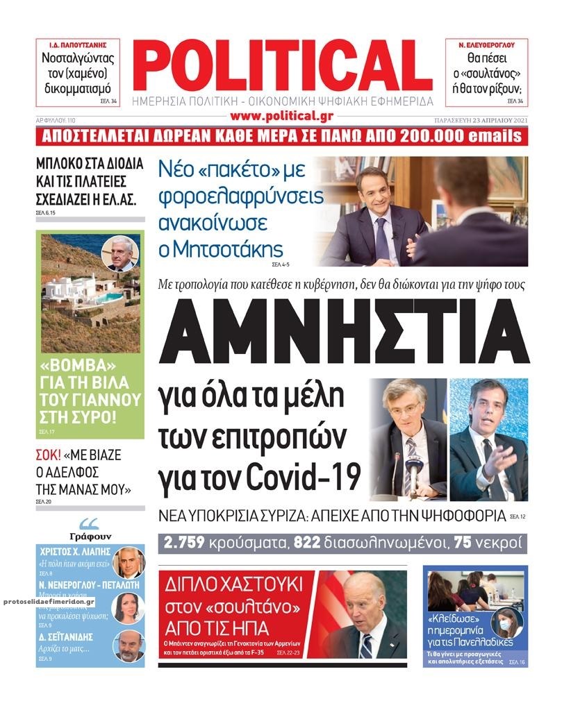 Οι πολιτικές εφημερίδες 23/4/2021 Διονύσης Νίκκας 06:07, Παρασκευή 23 Απριλίου 2021 Media Διαβάστε τα πρωτοσέλιδα των πολιτικών εφημερίδων… ΕΦΗΜΕΡΙΔΕΣ ΠΡΩΤΟΣΕΛΙΔΑ Μοιράσου το: σχολίασε κι εσύ (0 σχόλια) Ακολουθήστε το enikos.gr στο Google News και μάθετε πρώτοι όλες τις ειδήσεις Δείτε όλες τις τελευταίες ειδήσεις από την Ελλάδα και τον Κόσμο στο enikos.gr Ειδήσεις Ροή Ειδήσεων 4 ώρες πριν Υπόθεση Έπσταϊν: Το Υπουργείο Δικαιοσύνης δημοσιοποίησε μια σειρά από εξαιρετικά επεξεργασμένα αρχεία – «Λείπουν τα πιο σημαντικά έγγραφα», λένε οι Δημοκρατικοί 1 ώρα πριν Γιορτές με μπλόκα για τους αγρότες: Ανοίγουν διόδια και μοιράζουν προϊόντα στους ταξιδιώτες 2 ώρες πριν Εξαφάνιση 33χρονου γιατρού στην Κρήτη: «Άναψα τα φώτα, τρόμαξε και άρχισε να τρέχει στα χωράφια» – Η τελευταία διαδρομή και η μαρτυρία «κλειδί» 3 ώρες πριν Ο «χάρτης» με τις αυξήσεις και τις φοροελαφρύνσεις του 2026 – Ποιοι και πόσα κερδίζουν 1 ώρα πριν Τα αρχεία του Έπσταϊν αποκαλύπτουν φωτογραφία του έκπτωτου πρίγκιπα Άντριου – Είναι ξαπλωμένος στην αγκαλιά 5 γυναικών 1 ώρα πριν Μία νέα «χρυσή» περίοδος αρχίζει για 3 ζώδια από σήμερα – «Μία αναπάντεχη ευκαιρία οδηγεί στην επιτυχία» 6 ώρες πριν Αυγά: Πόσα μπορείτε να τρώτε την ημέρα με ασφάλεια για μέγιστη πρόσληψη πρωτεΐνης 4 ώρες πριν Αρχαιολόγοι ανακάλυψαν σε χωράφι απεικόνιση 600 ετών ενός Αγίου – Τα στοιχεία που δείχνουν ότι μαρτύρησε 3 ώρες πριν Αγχώνεται για το χριστουγεννιάτικο δώρο που πήρε στην πλούσια σύντροφό του – «Φοβάμαι πως θα το βρει φθηνιάρικο, φοράει βραχιόλια Cartier» 5 λεπτά πριν Στέφανος Παπαδόπουλος: Η συνέντευξη μετά τη μήνυση στον Γιώργο Μαζωνάκη – «Δεν θέλω να τα βρούμε εξωδικαστικά» 12 λεπτά πριν Τραγωδία στην άσφαλτο στα Χανιά: Νεκρός 37χρονος οδηγός ΙΧ – Τον βρήκαν ώρες μετά το τροχαίο 20 λεπτά πριν Τα Labubu «μετακομίζουν» στο Χόλιγουντ: Η Sony Pictures ετοιμάζει live-action ταινία με τον σκηνοθέτη του «Wonka» 28 λεπτά πριν Νέες ταυτότητες: Μεγάλη αναμονή για ραντεβού στην Αττική – Τέλος τα ταξίδια εκτός Ελλάδος από τον Αύγουστο για όσους δεν έχουν αλλάξει 36 λεπτά πριν Οι 7 φράσεις που δεν λένε ποτέ οι συναισθηματικά έξυπνοι άνθρωποι κατά τη διάρκεια ενός καβγά ENIKOS NETWORK Είστε μόνιμα απρόσεκτοι; 3 σημάδια που δείχνουν ότι μπορεί να είναι σύμπτωμα πάθησης Πόσα κιλά παίρνουμε πραγματικά τα Χριστούγεννα, σύμφωνα με την επιστήμη – Πώς να το αποτρέψουμε; e-ΕΦΚΑ και ΔΥΠΑ: Έρχονται νέες πληρωμές έως τις 24 Δεκεμβρίου – Ποιοι πάνε ταμείο Επίδομα παιδιού: Τι αλλάζει από το 2026 – Το όφελος από τις φορολογικές ελαφρύνσεις Χαρτογραφώντας το «σημείο χωρίς επιστροφή»: Για πρώτη φορά αποκαλύπτεται με λεπτομέρεια το ακανθώδες όριο της ατμόσφαιρας τ... Η Google καταργεί τη λειτουργία «dark web report» – Πώς θα μπορούν οι χρήστες να διαγράφουν τα δεδομένα τους περισσότερα 09:30 , Σάββατο 20 Δεκεμβρίου 2025 «Porto Leone: Στη γειτονιά με τα κόκκινα φανάρια» – Ο Χρόνης αποκαλύπτει στην Αλεξάνδρα το μυστικό για το παιδί της Λένας Η μεγάλη δραματική σειρά του Apha «Porto Leone: Στη γειτονιά με τα κόκκινα φανάρια» μας μεταφέ... 08:14 , Σάββατο 20 Δεκεμβρίου 2025 Τρομεροί γονείς: Η Μαρία Καβογιάννη εισβάλλει στο σπίτι της οικογένειας Στεφανίδη Όσα θα δούμε στο νέο διπλό επεισόδιο της σειράς «Τρομεροί γονείς», σήμερα Σάββατο 20 Δεκεμβρίο... 05:48 , Σάββατο 20 Δεκεμβρίου 2025 Οι οικονομικές εφημερίδες 20/12/2025 Διαβάστε τα πρωτοσέλιδα από τις οικονομικές εφημερίδες, σήμερα 20/12/2025. 05:43 , Σάββατο 20 Δεκεμβρίου 2025 Οι αθλητικέ