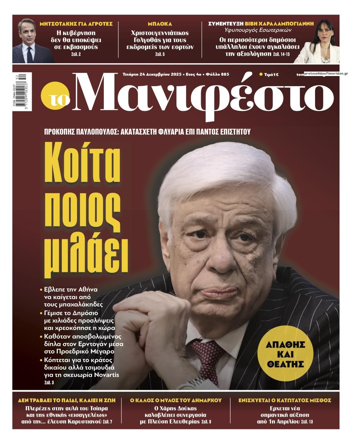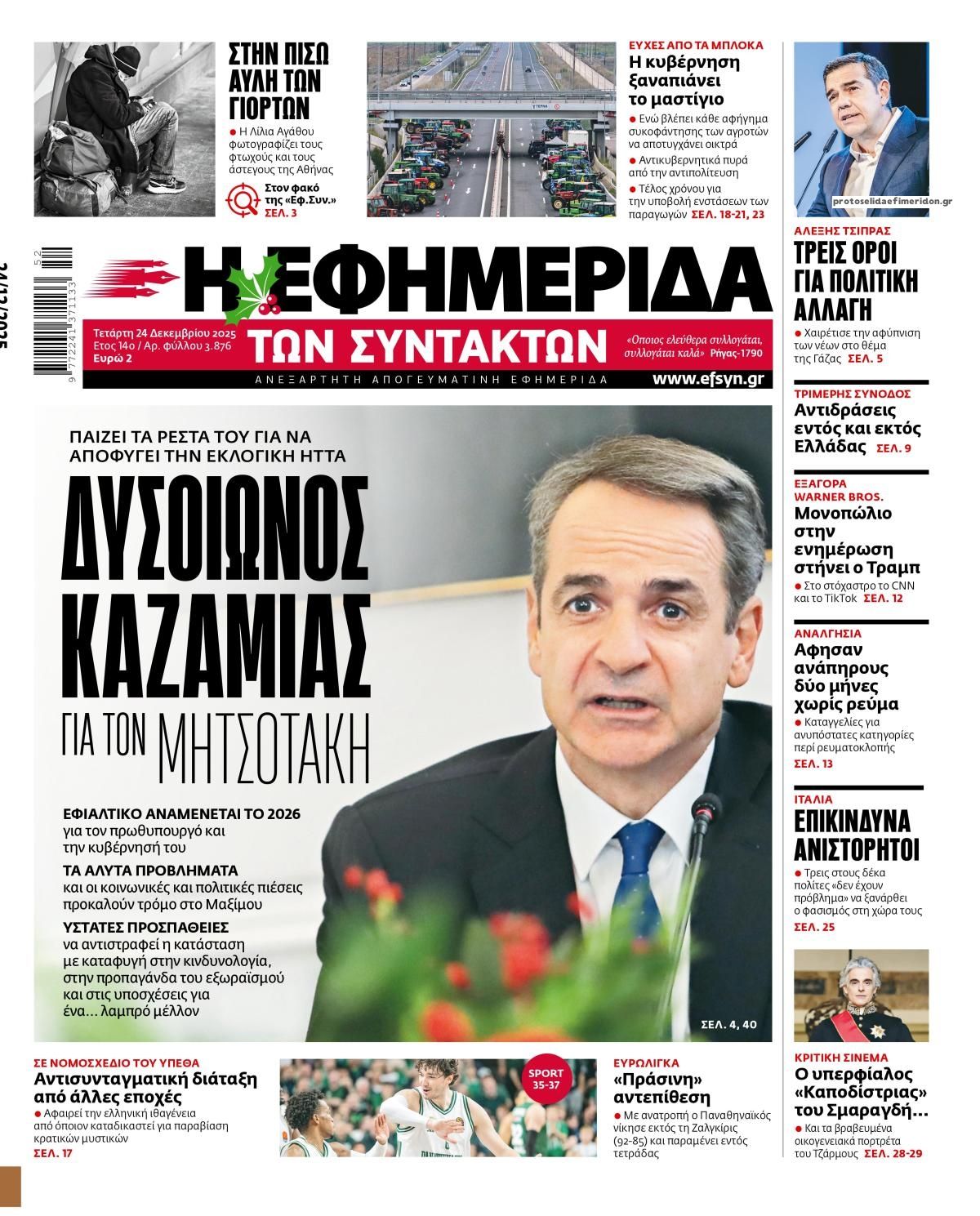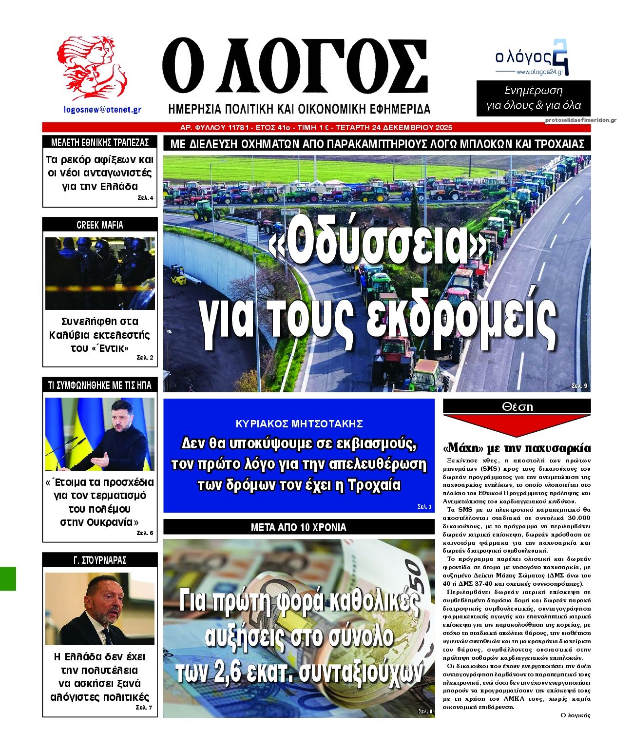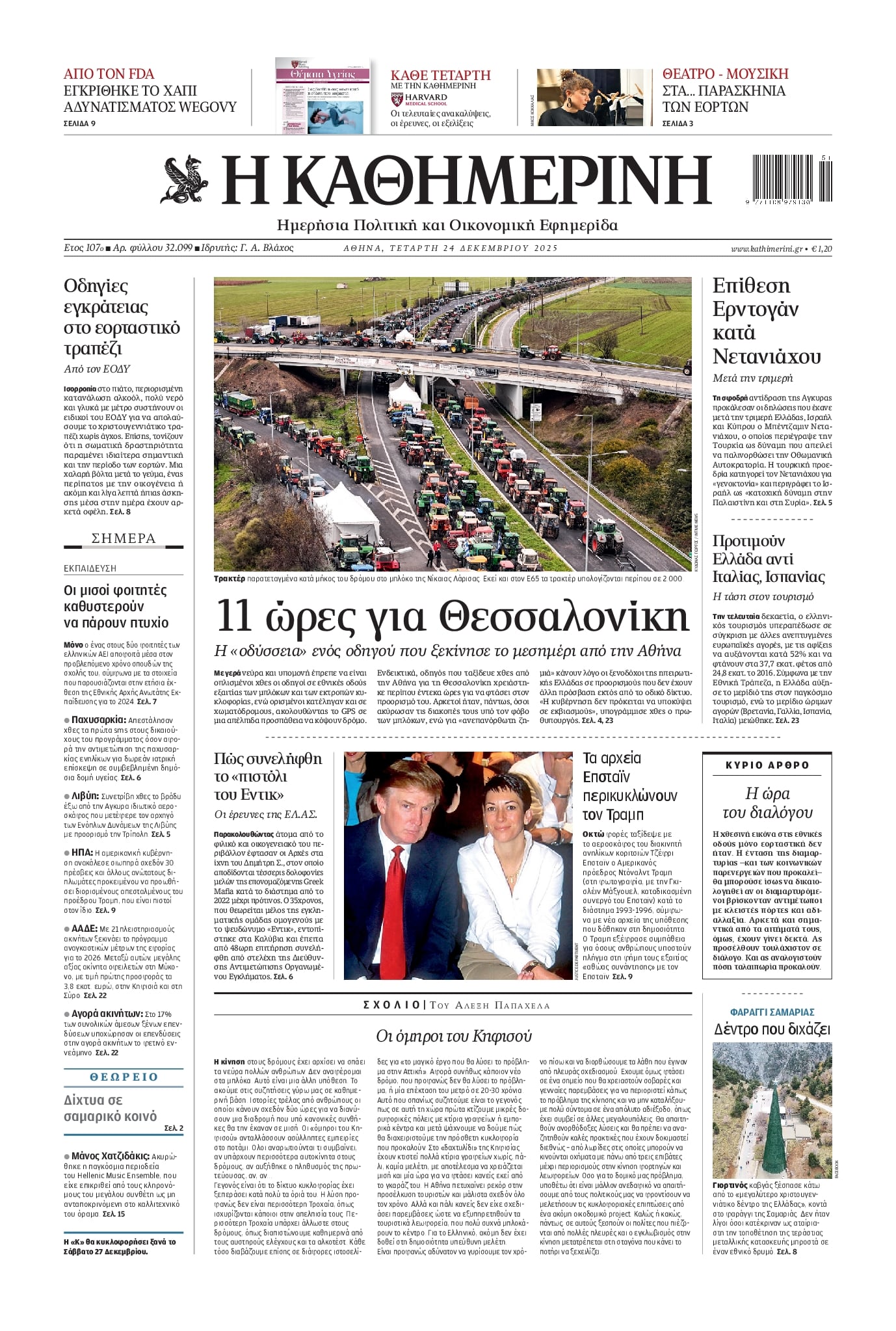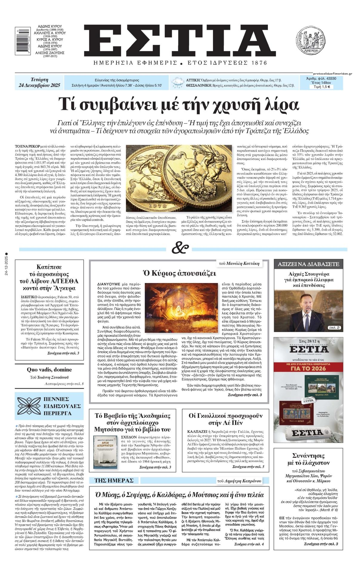 Οι πολιτικές εφημερίδες 24/12/2025 Σήφης Γαρυφαλάκης 05:38, Τετάρτη 24 Δεκεμβρίου 2025 Media Διαβάστε τα πρωτοσέλιδα από τις πολιτικές εφημερίδες, σήμερα 24/12/2025. ΕΦΗΜΕΡΙΔΕΣ ΠΟΛΙΤΙΚΕΣ ΕΦΗΜΕΡΙΔΕΣ ΠΡΩΤΟΣΕΛΙΔΑ Μοιράσου το: σχολίασε κι εσύ (0 σχόλια) Ακολουθήστε το enikos.gr στο Google News και μάθετε πρώτοι όλες τις ειδήσεις Δείτε όλες τις τελευταίες ειδήσεις από την Ελλάδα και τον Κόσμο στο enikos.gr Ειδήσεις Ροή Ειδήσεων 1 ώρα πριν Τουρκία: Αναφορές για Ελληνίδα αεροσυνοδό στο αεροσκάφος που συνετρίβη με τον αρχηγό του Γενικού Επιτελείου της Λιβύης 3 ώρες πριν Έξοδος Χριστουγέννων: Αυξημένη η κίνηση προς την Κεντρική Ελλάδα – Η εικόνα στα αγροτικά μπλόκα και οι δρόμοι που είναι ανοιχτοί 1 ώρα πριν Καιρός: Βροχές και καταιγίδες σήμερα στο μεγαλύτερο μέρος της χώρας – Πώς θα κάνουμε Χριστούγεννα, τα δεδομένα για την Πρωτοχρονιά 1 ώρα πριν Φρίκη στη Θεσσαλονίκη: 13χρονη κατήγγειλε ότι έπεσε θύμα ομαδικού βιασμού από 6 αγόρια 3 ώρες πριν Ελλάδα – Κύπρος – Ισραήλ: Η νέα αμυντική συνεργασία, το κέντρο κυβερνοασφάλειας και τα νεύρα της Τουρκίας 47 λεπτά πριν Η ζωή για 3 ζώδια γίνεται πολύ πιο εύκολη από εδώ και πέρα – «Εμπιστευτείτε τη διαίσθηση σας για να πάρετε αποφάσεις» 2 ώρες πριν Αγρότης ανακάλυψε τυχαία λείψανα δύο ανθρώπων της Εποχής του Χαλκού – Το μυστήριο πίσω από την περίεργη ταφή 2 ώρες πριν Χαμός στο διαδίκτυο με ανάρτηση μητέρας για όσους δεν έχουν παιδιά – «Κάνουν διακοπές κάθε μέρα» 1 ημέρα πριν Η Coca-Cola και ο Ελληνικός Ερυθρός Σταυρός μαζί αυτά τα Χριστούγεννα: Μια μεγάλη αγκαλιά για τους συνανθρώπους μας που έχουν ανάγκη 31 δευτερόλεπτα πριν Ο Ζελένσκι παρουσιάζει νέο ειρηνευτικό σχέδιο 20 σημείων για τον τερματισμό του πολέμου με τη Ρωσία 4 λεπτά πριν Έξοδος Χριστουγέννων – Δημογλίδου: «Πολύ καλύτερη η εικόνα σε σχέση με χθες στο εθνικό δίκτυο μέχρι Λαμία – Το πρόβλημα δεν το δημιουργεί η αστυνομία» 11 λεπτά πριν Μητρώο Δεξαμενών Ιδιωτικών Πρατηρίων Καυσίμων: Σε λειτουργία η ψηφιακή εφαρμογή – Όλες οι λεπτομέρειες 18 λεπτά πριν Τηλεθέαση (23/12): Ποιες πρωινές εκπομπές της ψυχαγωγικής ζώνης πήραν προβάδισμα; 25 λεπτά πριν ΣΥΡΙΖΑ: Το 2025 απέδειξε ότι ο πρωτογενής τομέας έχει τεθεί στο περιθώριο των κυβερνητικών επιλογών ENIKOS NETWORK Πόνος στην κοιλιά στους άνδρες: Με ποιες παθήσεις μπορεί να σχετίζεται 5 τροφές που μειώνουν τη χοληστερίνη φυσικά – Θα τις βρείτε και στο γιορτινό τραπέζι Παραμονή των Χριστουγέννων: Πώς θα λειτουργήσουν σήμερα τα καταστήματα, τα σούπερ μάρκετ, οι φούρνοι και οι λαϊκές αγορές Χριστούγεννα και Πρωτοχρονιά: Πώς κινούνται τα Μέσα Μαζικής Μεταφοράς Ο Google Assistant θα παραμείνει λίγο περισσότερο για ορισμένους χρήστες Android Τεστ προσωπικότητας: Το βάζο που θα επιλέξετε αποκαλύπτει πώς λύνετε προβλήματα στη ζωή σας περισσότερα 10:36 , Τετάρτη 24 Δεκεμβρίου 2025 Τηλεθέαση (23/12): Ποιες πρωινές εκπομπές της ψυχαγωγικής ζώνης πήραν προβάδισμα; Με αμείωτη ένταση συνεχίστηκε η «μάχη» στην πρωινή ζώνη την Τρίτη 23 Δεκεμβρίου, όπως φαίνεται... 10:09 , Τετάρτη 24 Δεκεμβρίου 2025 Την Κυριακή με τη Realnews: Ό,τι και αν αγοράσεις, σκανάρεις και κερδίζεις! Την Κυριακή με τη Realnews: Ό,τι και αν αγοράσεις, σκανάρεις και κερδίζεις! Με το PADU app, το... 10:05 , Τετάρτη 24 Δεκεμβρίου 2025 Τηλεθέαση (23/12): Σάρωσε το reunion του «Παρά Πέντε» το βράδυ της Τρίτης Το βράδυ της Τρίτης (23/12) οι τηλεθεατές παρακολούθησαν το reunion του «Παρά Πέντε». Μάλιστα,... 08:43 , Τετάρτη 24 Δεκεμβρίου 2025 Παρά Πέντε: Όλα όσα έγιν