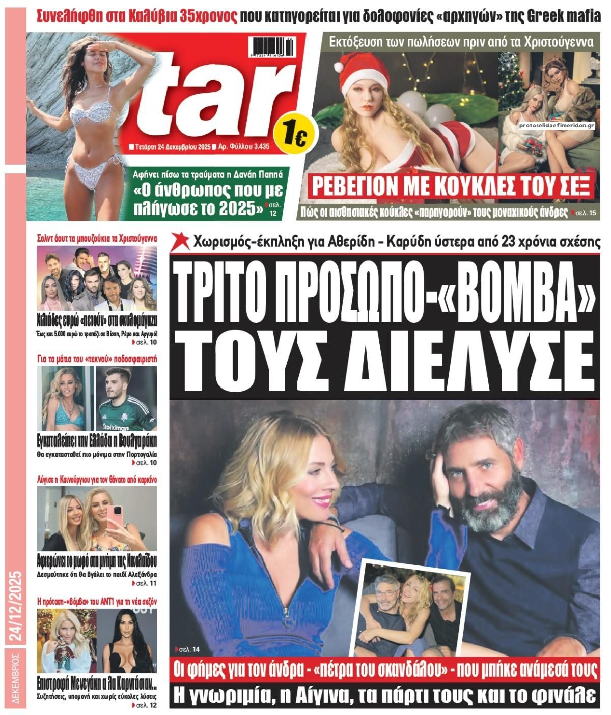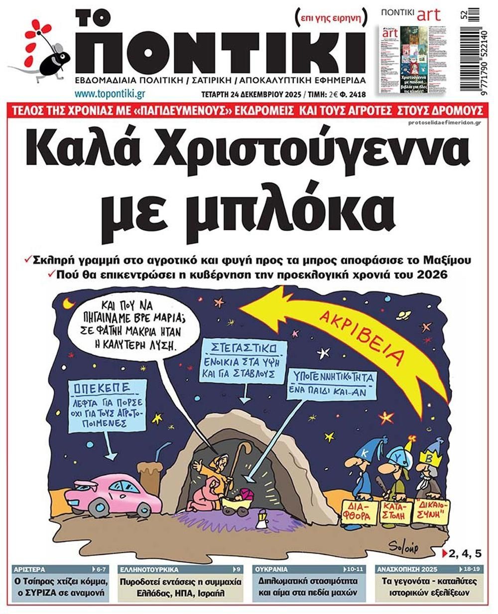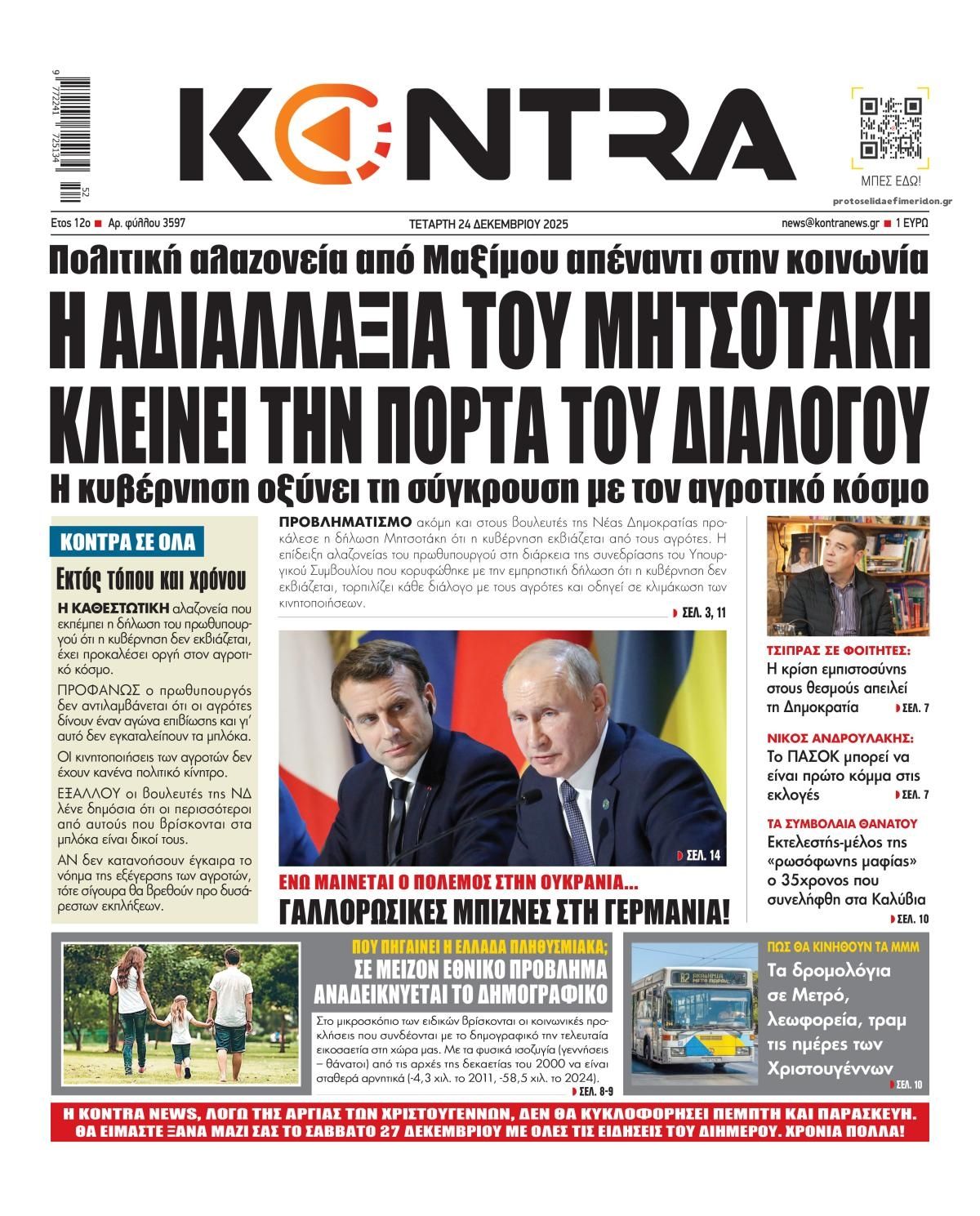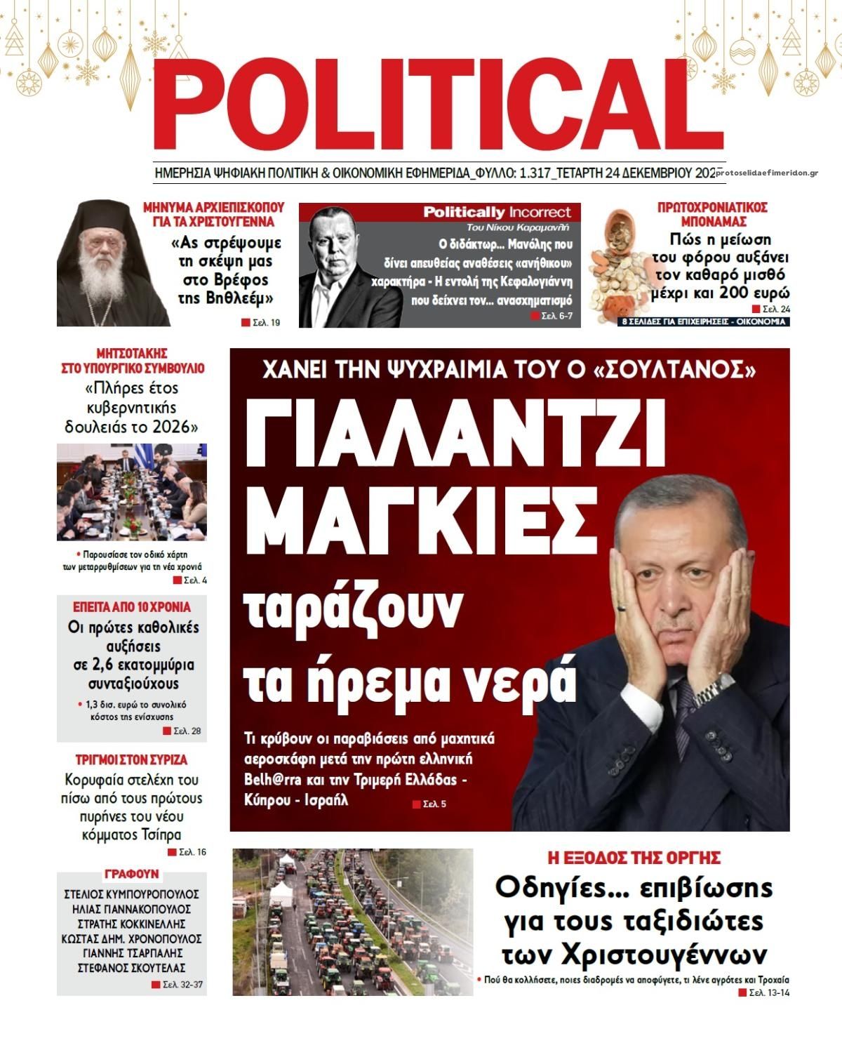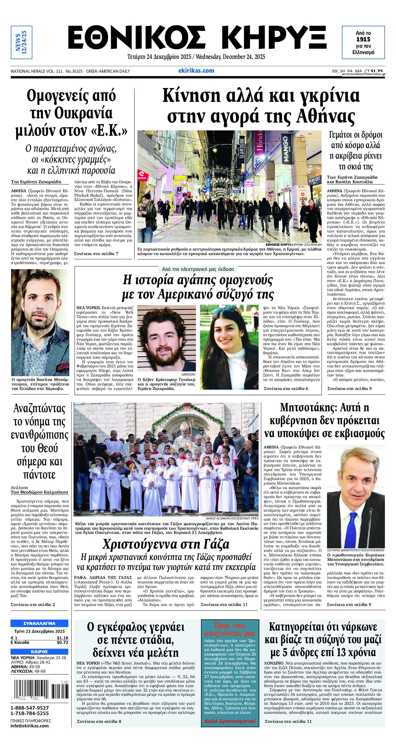 Οι πολιτικές εφημερίδες 24/12/2025 Σήφης Γαρυφαλάκης 05:38, Τετάρτη 24 Δεκεμβρίου 2025 Media Διαβάστε τα πρωτοσέλιδα από τις πολιτικές εφημερίδες, σήμερα 24/12/2025. ΕΦΗΜΕΡΙΔΕΣ ΠΟΛΙΤΙΚΕΣ ΕΦΗΜΕΡΙΔΕΣ ΠΡΩΤΟΣΕΛΙΔΑ Μοιράσου το: σχολίασε κι εσύ (0 σχόλια) Ακολουθήστε το enikos.gr στο Google News και μάθετε πρώτοι όλες τις ειδήσεις Δείτε όλες τις τελευταίες ειδήσεις από την Ελλάδα και τον Κόσμο στο enikos.gr Ειδήσεις Ροή Ειδήσεων 1 ώρα πριν Τουρκία: Αναφορές για Ελληνίδα αεροσυνοδό στο αεροσκάφος που συνετρίβη με τον αρχηγό του Γενικού Επιτελείου της Λιβύης 3 ώρες πριν Έξοδος Χριστουγέννων: Αυξημένη η κίνηση προς την Κεντρική Ελλάδα – Η εικόνα στα αγροτικά μπλόκα και οι δρόμοι που είναι ανοιχτοί 1 ώρα πριν Καιρός: Βροχές και καταιγίδες σήμερα στο μεγαλύτερο μέρος της χώρας – Πώς θα κάνουμε Χριστούγεννα, τα δεδομένα για την Πρωτοχρονιά 1 ώρα πριν Φρίκη στη Θεσσαλονίκη: 13χρονη κατήγγειλε ότι έπεσε θύμα ομαδικού βιασμού από 6 αγόρια 3 ώρες πριν Ελλάδα – Κύπρος – Ισραήλ: Η νέα αμυντική συνεργασία, το κέντρο κυβερνοασφάλειας και τα νεύρα της Τουρκίας 47 λεπτά πριν Η ζωή για 3 ζώδια γίνεται πολύ πιο εύκολη από εδώ και πέρα – «Εμπιστευτείτε τη διαίσθηση σας για να πάρετε αποφάσεις» 2 ώρες πριν Αγρότης ανακάλυψε τυχαία λείψανα δύο ανθρώπων της Εποχής του Χαλκού – Το μυστήριο πίσω από την περίεργη ταφή 2 ώρες πριν Χαμός στο διαδίκτυο με ανάρτηση μητέρας για όσους δεν έχουν παιδιά – «Κάνουν διακοπές κάθε μέρα» 1 ημέρα πριν Η Coca-Cola και ο Ελληνικός Ερυθρός Σταυρός μαζί αυτά τα Χριστούγεννα: Μια μεγάλη αγκαλιά για τους συνανθρώπους μας που έχουν ανάγκη 31 δευτερόλεπτα πριν Ο Ζελένσκι παρουσιάζει νέο ειρηνευτικό σχέδιο 20 σημείων για τον τερματισμό του πολέμου με τη Ρωσία 4 λεπτά πριν Έξοδος Χριστουγέννων – Δημογλίδου: «Πολύ καλύτερη η εικόνα σε σχέση με χθες στο εθνικό δίκτυο μέχρι Λαμία – Το πρόβλημα δεν το δημιουργεί η αστυνομία» 11 λεπτά πριν Μητρώο Δεξαμενών Ιδιωτικών Πρατηρίων Καυσίμων: Σε λειτουργία η ψηφιακή εφαρμογή – Όλες οι λεπτομέρειες 18 λεπτά πριν Τηλεθέαση (23/12): Ποιες πρωινές εκπομπές της ψυχαγωγικής ζώνης πήραν προβάδισμα; 25 λεπτά πριν ΣΥΡΙΖΑ: Το 2025 απέδειξε ότι ο πρωτογενής τομέας έχει τεθεί στο περιθώριο των κυβερνητικών επιλογών ENIKOS NETWORK Πόνος στην κοιλιά στους άνδρες: Με ποιες παθήσεις μπορεί να σχετίζεται 5 τροφές που μειώνουν τη χοληστερίνη φυσικά – Θα τις βρείτε και στο γιορτινό τραπέζι Παραμονή των Χριστουγέννων: Πώς θα λειτουργήσουν σήμερα τα καταστήματα, τα σούπερ μάρκετ, οι φούρνοι και οι λαϊκές αγορές Χριστούγεννα και Πρωτοχρονιά: Πώς κινούνται τα Μέσα Μαζικής Μεταφοράς Ο Google Assistant θα παραμείνει λίγο περισσότερο για ορισμένους χρήστες Android Τεστ προσωπικότητας: Το βάζο που θα επιλέξετε αποκαλύπτει πώς λύνετε προβλήματα στη ζωή σας περισσότερα 10:36 , Τετάρτη 24 Δεκεμβρίου 2025 Τηλεθέαση (23/12): Ποιες πρωινές εκπομπές της ψυχαγωγικής ζώνης πήραν προβάδισμα; Με αμείωτη ένταση συνεχίστηκε η «μάχη» στην πρωινή ζώνη την Τρίτη 23 Δεκεμβρίου, όπως φαίνεται... 10:09 , Τετάρτη 24 Δεκεμβρίου 2025 Την Κυριακή με τη Realnews: Ό,τι και αν αγοράσεις, σκανάρεις και κερδίζεις! Την Κυριακή με τη Realnews: Ό,τι και αν αγοράσεις, σκανάρεις και κερδίζεις! Με το PADU app, το... 10:05 , Τετάρτη 24 Δεκεμβρίου 2025 Τηλεθέαση (23/12): Σάρωσε το reunion του «Παρά Πέντε» το βράδυ της Τρίτης Το βράδυ της Τρίτης (23/12) οι τηλεθεατές παρακολούθησαν το reunion του «Παρά Πέντε». Μάλιστα,... 08:43 , Τετάρτη 24 Δεκεμβρίου 2025 Παρά Πέντε: Όλα όσα έγιν