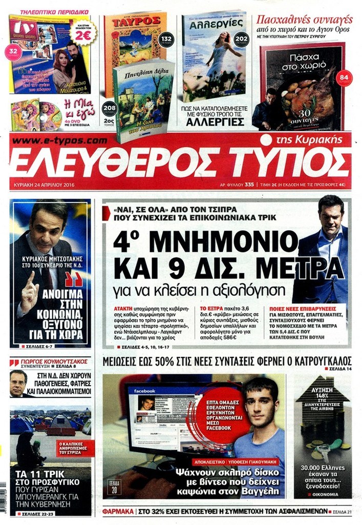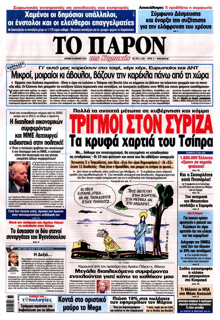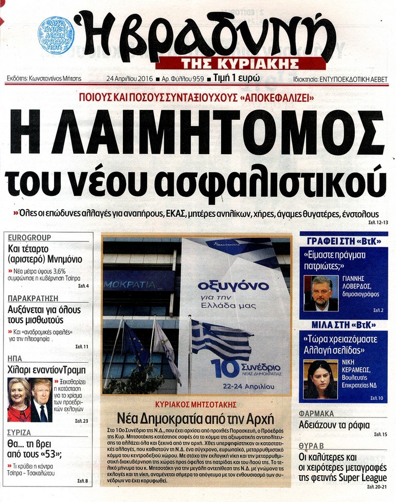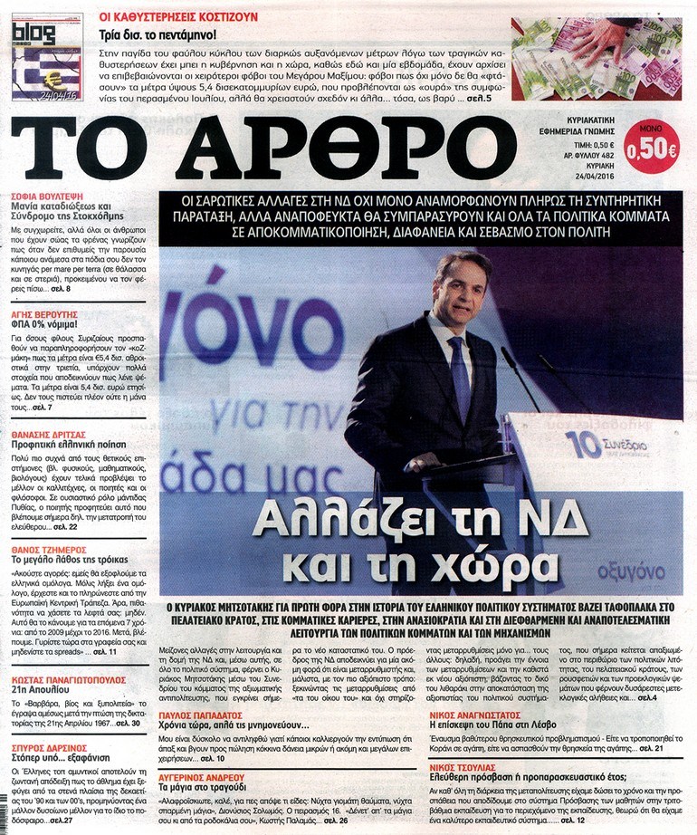 Oι πολιτικές εφημερίδες 24-4-2016 Enikos Newsroom 04:39, Κυριακή 24 Απριλίου 2016 Media Διαβάστε τα σημερινά πρωτοσέλιδα των πολιτικών εφημερίδων: ΠΟΛΙΤΙΚΕΣ ΕΦΗΜΕΡΙΔΕΣ ΠΡΩΤΟΣΕΛΙΔΑ Μοιράσου το: σχολίασε κι εσύ (0 σχόλια) Ακολουθήστε το enikos.gr στο Google News και μάθετε πρώτοι όλες τις ειδήσεις Δείτε όλες τις τελευταίες ειδήσεις από την Ελλάδα και τον Κόσμο στο enikos.gr Ειδήσεις Ροή Ειδήσεων 2 ώρες πριν Χριστούγεννα στα μπλόκα: Επιμένουν στις κινητοποιήσεις τους οι αγρότες – Ανοίγουν τα διόδια το Σαββατοκύριακο 2 ώρες πριν Ουκρανία: Η άνευ προηγουμένου επίθεση σε ρωσικό τάνκερ στη Μεσόγειο και το μήνυμα προς στον Πούτιν – Το «μακρύ χέρι» του Κιέβου 1 ώρα πριν Πούτιν: Τα μηνύματα σε Ευρώπη και ΝΑΤΟ από το μαραθώνιο «σόου» του – Η απαίτηση για «σεβασμό» και η ειρήνη «με τους όρους» της Μόσχας 2 ώρες πριν Τραμπ: Δεν αποκλείει την πιθανότητα ενός πολέμου στη Βενεζουέλα – «Ο Μαδούρο ξέρει καλύτερα από τον καθένα τι ακριβώς θέλω» 3 ώρες πριν Συνεχίζει να προκαλεί ο Μίτσκοσκι: «Για μένα το όνομα Μακεδονία είναι ιερό» 1 ώρα πριν Ανακαλύφθηκαν αρχαία χρυσά νομίσματα 2.200 ετών που απεικονίζουν τον θεό Απόλλωνα – Η άγνωστη σύνδεση με τον Φίλιππο Β΄ της Μακεδονίας 2 ώρες πριν Ύπνος: Μια κρυφή κατάσταση του εγκεφάλου πριν από τον ύπνο μπορεί να είναι το “κλειδί” για υψηλή ευφυΐα και δημιουργικότητα 3 ώρες πριν Αριθμολογία: Οι άνθρωποι που έχουν γεννηθεί αυτές τις 4 ημερομηνίες, συχνά παρεξηγούνται – «Η καλοσύνη τους κρύβει τεράστια δύναμη» 4 ώρες πριν Ξεχάστε το καθάρισμα το Σαββατοκύριακο: Ο «κανόνας των 20 λεπτών» που θα σας λύσει τα χέρια 8 λεπτά πριν Πόλεμος στην Ουκρανία: Εφτά νεκροί από ρωσική πυραυλική επίθεση στο λιμάνι της Οδησσού 11 λεπτά πριν ΗΠΑ: Η κυβέρνηση του Ντόναλντ Τραμπ άρχισε να δημοσιοποιεί τα αρχεία Έπσταϊν 23 λεπτά πριν Σάμος: Άνοιξε το μπλόκο των αγροτών στον κόμβο Κοκκαρίου – Σε νέα συνεδρίαση θα καθορίσουν την στάση τους 31 λεπτά πριν Άνω Λιόσια: Πυροβολισμοί σε επιχείρηση με χαλιά – Εντοπίστηκαν 10 κάλυκες 39 λεπτά πριν Γάζα: Ισραηλινό πλήγμα σε σχολείο που είχαν καταφύγει εκτοπισμένοι – Τουλάχιστον έξι νεκροί ENIKOS NETWORK Το ΕΚΑΒ τιμήθηκε από την Ακαδημία Αθηνών για τα 40 χρόνια προσφοράς του Έχετε πραγματικά μεγάλη καρδιά; 10 χαρακτηριστικά όσων έχουν καλοσύνη Αναστολή μέτρων αναγκαστικής εκτέλεσης για κτηνοτρόφους που πλήττονται από την ευλογιά των αιγοπροβάτων Πλήρης επάρκεια προϊόντων στις λαϊκές της Αττικής, παρά τις αγροτικές κινητοποιήσεις – Τι απαντούν οι πωλητές Χαρτογραφώντας το «σημείο χωρίς επιστροφή»: Για πρώτη φορά αποκαλύπτεται με λεπτομέρεια το ακανθώδες όριο της ατμόσφαιρας τ... Η Google καταργεί τη λειτουργία «dark web report» – Πώς θα μπορούν οι χρήστες να διαγράφουν τα δεδομένα τους περισσότερα 22:42 , Παρασκευή 19 Δεκεμβρίου 2025 Γιώργος Γιαννόπουλος για “Το σόι σου”: “Είναι ευτυχία και ευλογία αυτή η σειρά” «Είναι ευτυχία και ευλογία η συγκυρία αυτής της σειράς», θα πει ο Γιώργος Γιαννόπουλος -ο αγαπ... 20:37 , Παρασκευή 19 Δεκεμβρίου 2025 Don’t Forget The Lyrics: Η Έλλη Κοκκίνου υποδέχεται 4 παίκτες που θα κάνουν τα πάντα για να μη χάσουν ούτε… μισή λέξη από τους στίχους Το «Don’t Forget The Lyrics» επιστρέφει απόψε, Παρασκευή 19 Δεκεμβρίου, στις 21:00 με νέο επει... 19:31 , Παρασκευή 19 Δεκεμβρίου 2025 GNTM: Απόψε ο μεγάλος τελικός για τους 4 φιναλίστ Έπειτα από μήνες γεμάτους μόδα, δημιουργία και έντονες αναμετρήσεις, το GNTM 2025 κορυφώνεται,... 18:11 , Παρασκευή 19 Δεκεμβρίου 2025 Το σόι σου: Ο Άρ