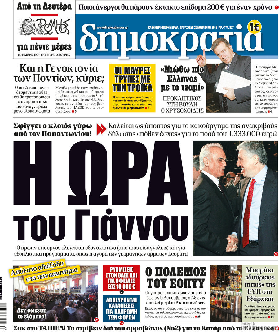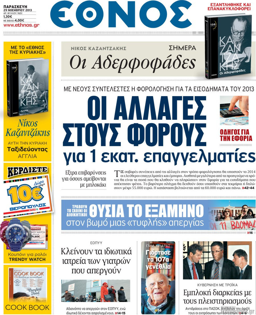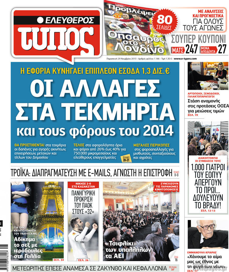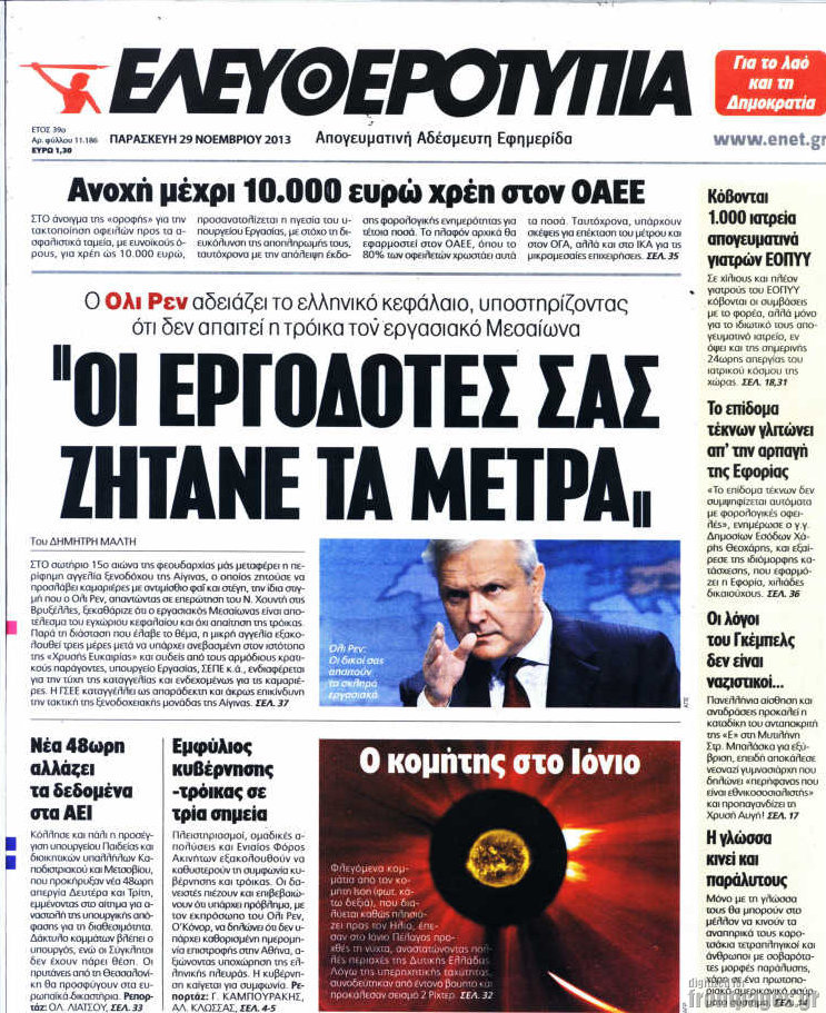 Οι πολιτικές εφημερίδες Enikos Newsroom 08:30, Παρασκευή 29 Νοεμβρίου 2013 Media Οι πολιτικές εφημερίδες Διαβάστε αναλυτικά τα πρωτοσέλιδα: ΕΦΗΜΕΡΙΔΕΣ ΠΟΛΙΤΙΚΕΣ ΕΦΗΜΕΡΙΔΕΣ ΠΡΩΤΟΣΕΛΙΔΑ Μοιράσου το: σχολίασε κι εσύ (0 σχόλια) Ακολουθήστε το enikos.gr στο Google News και μάθετε πρώτοι όλες τις ειδήσεις Δείτε όλες τις τελευταίες ειδήσεις από την Ελλάδα και τον Κόσμο στο enikos.gr Ειδήσεις Ροή Ειδήσεων 24 λεπτά πριν Αγρότες: Γιορτές στα μπλόκα με ανοιχτά διόδια – Δικογραφία στα Ιωάννινα για το σήκωμα των μπαρών 1 ώρα πριν ΕΛΑΣ: Συνελήφθησαν Υπαρχιπυροσβέστης και δύο ακόμη άτομα για κατοχή και διακίνηση ναρκωτικών ουσιών – Η καταγγελία και ο τιμοκατάλογος 4 ώρες πριν Αρχεία Έπσταϊν: Οι συγκλονιστικές φωτογραφίες – Ο Μάικλ Τζάκσον, ο Μικ Τζάγκερ και ο Κέβιν Σπέισι ανάμεσα στους διάσημους που απεικονίζονται 2 ώρες πριν Μαθητές διακινούσαν κοκαΐνη και χασίς σε σχολείο της Αττικής – 12 συλλήψεις 2 ώρες πριν Βέλγιο: Άγνωστοι έριξαν κόκκινη μπογιά στο προξενείο της Πολωνίας στις Βρυξέλλες 37 λεπτά πριν Η τύχη χαμογελά σε 3 ζώδια έως τις 28 Δεκεμβρίου – «Προσέξτε τις επιλογές σας και η επιμονή σας θα ανταμειφθεί» 5 ώρες πριν Διαιτολόγος αποκαλύπτει 9 πρωινές συνήθειες που «λιώνουν» το κοιλιακό λίπος – «Υποστηρίζουν την υγιεινή απώλεια βάρους» 6 ώρες πριν Οι 7 φράσεις που δεν λένε ποτέ οι συναισθηματικά έξυπνοι άνθρωποι κατά τη διάρκεια ενός καβγά 8 ώρες πριν Enerwave: Το νέο «ρεύμα» στη λιανική ενέργειας που αλλάζει την εμπειρία του καταναλωτή 1 λεπτό πριν Πώς δρούσε το κύκλωμα που διακινούσε ναρκωτικά σε σχολεία – Υπέβαλαν σε βασανιστήρια όσους δεν τηρούσαν τους «κανόνες πειθαρχίας» 7 λεπτά πριν Φάμελλος: «Η πρόταση για τις εκλογές έχει να κάνει με το συμφέρον της χώρας» 18 λεπτά πριν Παναθηναϊκός: Στο… «μικροσκόπιο» ο Γένσεν της Μπρέντφορντ 24 λεπτά πριν Αγρότες: Γιορτές στα μπλόκα με ανοιχτά διόδια – Δικογραφία στα Ιωάννινα για το σήκωμα των μπαρών 28 λεπτά πριν Νίκος Γιαννόπουλος: «Όποιος με χαρακτηρίζει δημοσίως μέθυσο, προκλητικό ή οτιδήποτε άλλο θα κληθεί στις δικαστικές αίθουσες» ENIKOS NETWORK Η αποχή από την αναπαραγωγή παρατείνει τη ζωή στα ζώα, σύμφωνα με μελέτη – Τι ισχύει για τους ανθρώπους; Σημαντικές επαφές στις ΗΠΑ είχε ο υπουργός Υγείας Άδωνις Γεωργιάδης Τέλη κυκλοφορίας 2026: Προσοχή στην προθεσμία εξόφλησής τους – Πώς διαμορφώνονται τα πρόστιμα σε περίπτωση καθυστέρησης Επιτροπή Ανταγωνισμού: Στο μικροσκόπιο σχολικές τσάντες και επώνυμα brands – Τι ερευνάται Χαρτογραφώντας το «σημείο χωρίς επιστροφή»: Για πρώτη φορά αποκαλύπτεται με λεπτομέρεια το ακανθώδες όριο της ατμόσφαιρας τ... Η Google καταργεί τη λειτουργία «dark web report» – Πώς θα μπορούν οι χρήστες να διαγράφουν τα δεδομένα τους περισσότερα 14:04 , Σάββατο 20 Δεκεμβρίου 2025 Η Realnews αυτής της Κυριακής (21/12/2025) Με τίτλο: «Ασπίδα προστασίας για την Ελλάδα» κυκλοφορεί, αυτήν την Κυριακή, η Realnews. Σημαντ... 12:53 , Σάββατο 20 Δεκεμβρίου 2025 Να μ’ αγαπάς: Το παρελθόν έρχεται στο φως – Καταιγιστικές εξελίξεις στα τελευταία επεισόδια του 2025 Ο Άγγελος αποκαλύπτεται, η Φωτεινή ανησυχεί για τον Λευτέρη και η Ζωή έρχεται αντιμέτωπη με το... 11:41 , Σάββατο 20 Δεκεμβρίου 2025 «Η αγάπη δεν χάνεται ποτέ»: Η μικρού μήκους ταινία κινουμένων σχεδίων που θέτει ερωτήματα για τη ζωή και τον θάνατο Ο θάνατος είναι ένα από τα πιο σκληρά θέματα που καλείται να διαχειριστεί κάποιος στη διάρκεια... 09:30 , Σάββατο 20 Δεκεμβρίου 2025 «Porto Leone: Στη γειτονιά με τα κόκκινα 