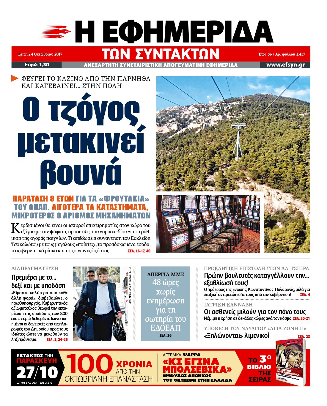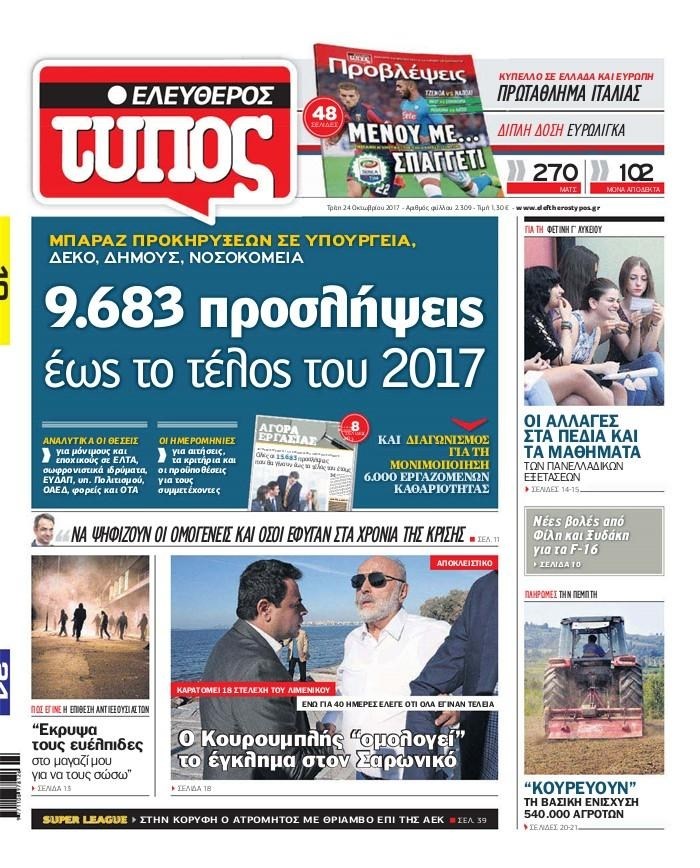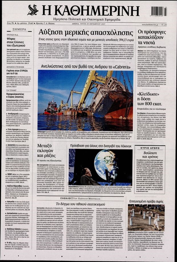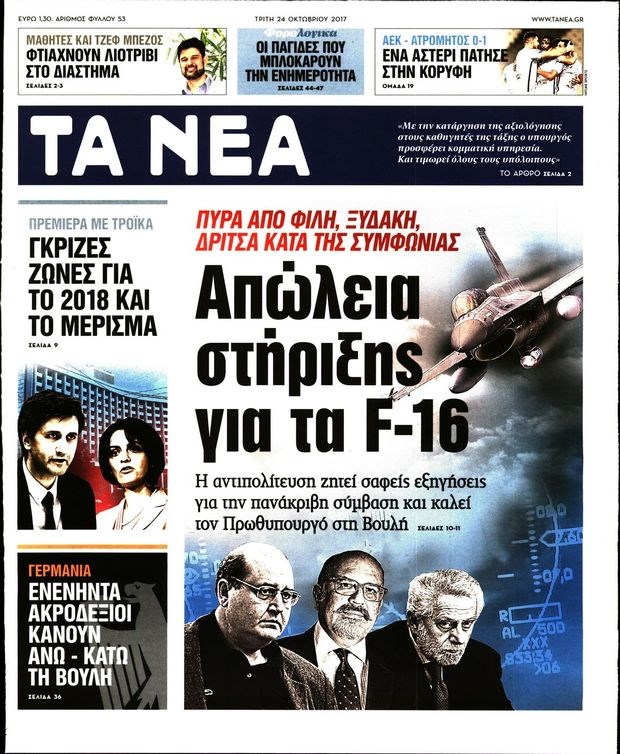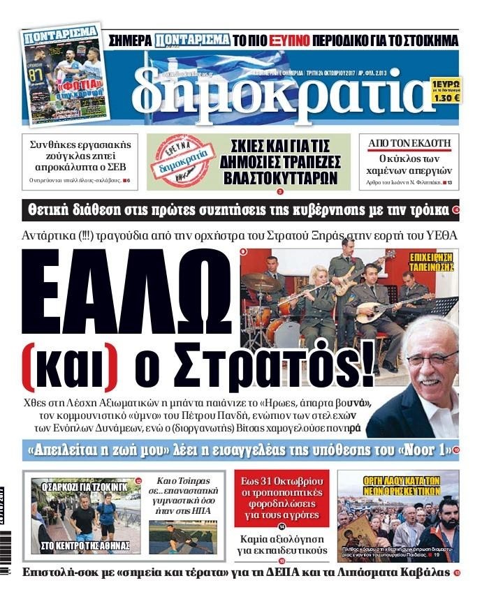 Οι πολιτικές εφημερίδες 24/10/2017 Κώστας Τεό 05:19, Τρίτη 24 Οκτωβρίου 2017 Media Διαβάστε τα σημερινά πρωτοσέλιδα των πολιτικών εφημερίδων: ΠΟΛΙΤΙΚΕΣ ΕΦΗΜΕΡΙΔΕΣ ΠΡΩΤΟΣΕΛΙΔΑ Μοιράσου το: σχολίασε κι εσύ (0 σχόλια) Ακολουθήστε το enikos.gr στο Google News και μάθετε πρώτοι όλες τις ειδήσεις Δείτε όλες τις τελευταίες ειδήσεις από την Ελλάδα και τον Κόσμο στο enikos.gr Ειδήσεις Ροή Ειδήσεων 4 ώρες πριν Υπόθεση Έπσταϊν: Το Υπουργείο Δικαιοσύνης δημοσιοποίησε μια σειρά από εξαιρετικά επεξεργασμένα αρχεία – «Λείπουν τα πιο σημαντικά έγγραφα», λένε οι Δημοκρατικοί 50 λεπτά πριν Γιορτές με μπλόκα για τους αγρότες: Ανοίγουν διόδια και μοιράζουν προϊόντα στους ταξιδιώτες 1 ώρα πριν Εξαφάνιση 33χρονου γιατρού στην Κρήτη: «Άναψα τα φώτα, τρόμαξε και άρχισε να τρέχει στα χωράφια» – Η τελευταία διαδρομή και η μαρτυρία «κλειδί» 3 ώρες πριν Ο «χάρτης» με τις αυξήσεις και τις φοροελαφρύνσεις του 2026 – Ποιοι και πόσα κερδίζουν 1 ώρα πριν Τα αρχεία του Έπσταϊν αποκαλύπτουν φωτογραφία του έκπτωτου πρίγκιπα Άντριου – Είναι ξαπλωμένος στην αγκαλιά 5 γυναικών 1 ώρα πριν Μία νέα «χρυσή» περίοδος αρχίζει για 3 ζώδια από σήμερα – «Μία αναπάντεχη ευκαιρία οδηγεί στην επιτυχία» 5 ώρες πριν Αυγά: Πόσα μπορείτε να τρώτε την ημέρα με ασφάλεια για μέγιστη πρόσληψη πρωτεΐνης 3 ώρες πριν Αρχαιολόγοι ανακάλυψαν σε χωράφι απεικόνιση 600 ετών ενός Αγίου – Τα στοιχεία που δείχνουν ότι μαρτύρησε 2 ώρες πριν Αγχώνεται για το χριστουγεννιάτικο δώρο που πήρε στην πλούσια σύντροφό του – «Φοβάμαι πως θα το βρει φθηνιάρικο, φοράει βραχιόλια Cartier» 7 λεπτά πριν Τα Labubu «μετακομίζουν» στο Χόλιγουντ: Η Sony Pictures ετοιμάζει live-action ταινία με τον σκηνοθέτη του «Wonka» 15 λεπτά πριν Νέες ταυτότητες: Μεγάλη αναμονή για ραντεβού στην Αττική – Τέλος τα ταξίδια εκτός Ελλάδος από τον Αύγουστο για όσους δεν έχουν αλλάξει 23 λεπτά πριν Οι 7 φράσεις που δεν λένε ποτέ οι συναισθηματικά έξυπνοι άνθρωποι κατά τη διάρκεια ενός καβγά 26 λεπτά πριν Τηλεθέαση (19/12): Ανατροπές και πρωτιές στην πρωινή ζώνη 34 λεπτά πριν Πώς η κλιματική αλλαγή επηρεάζει εγκύους και βρέφη – Οι επιπτώσεις των υψηλών θερμοκρασιών ENIKOS NETWORK Είστε μόνιμα απρόσεκτοι; 3 σημάδια που δείχνουν ότι μπορεί να είναι σύμπτωμα πάθησης Πόσα κιλά παίρνουμε πραγματικά τα Χριστούγεννα, σύμφωνα με την επιστήμη – Πώς να το αποτρέψουμε; e-ΕΦΚΑ και ΔΥΠΑ: Έρχονται νέες πληρωμές έως τις 24 Δεκεμβρίου – Ποιοι πάνε ταμείο Επίδομα παιδιού: Τι αλλάζει από το 2026 – Το όφελος από τις φορολογικές ελαφρύνσεις Χαρτογραφώντας το «σημείο χωρίς επιστροφή»: Για πρώτη φορά αποκαλύπτεται με λεπτομέρεια το ακανθώδες όριο της ατμόσφαιρας τ... Η Google καταργεί τη λειτουργία «dark web report» – Πώς θα μπορούν οι χρήστες να διαγράφουν τα δεδομένα τους περισσότερα 09:30 , Σάββατο 20 Δεκεμβρίου 2025 «Porto Leone: Στη γειτονιά με τα κόκκινα φανάρια» – Ο Χρόνης αποκαλύπτει στην Αλεξάνδρα το μυστικό για το παιδί της Λένας Η μεγάλη δραματική σειρά του Apha «Porto Leone: Στη γειτονιά με τα κόκκινα φανάρια» μας μεταφέ... 08:14 , Σάββατο 20 Δεκεμβρίου 2025 Τρομεροί γονείς: Η Μαρία Καβογιάννη εισβάλλει στο σπίτι της οικογένειας Στεφανίδη Όσα θα δούμε στο νέο διπλό επεισόδιο της σειράς «Τρομεροί γονείς», σήμερα Σάββατο 20 Δεκεμβρίο... 05:48 , Σάββατο 20 Δεκεμβρίου 2025 Οι οικονομικές εφημερίδες 20/12/2025 Διαβάστε τα πρωτοσέλιδα από τις οικονομικές εφημερίδες, σήμερα 20/12/2025. 05:43 , Σάββατο 20 Δεκεμβρίου 2025 Οι αθλητικές εφημερίδες 20/12/2025 Διαβάστε τα πρωτοσέλιδα α