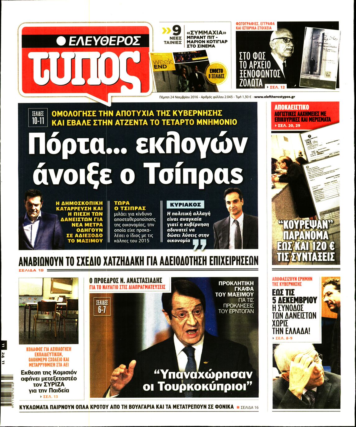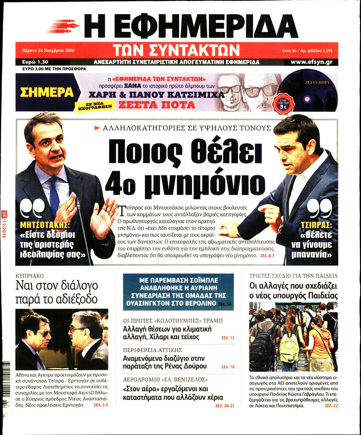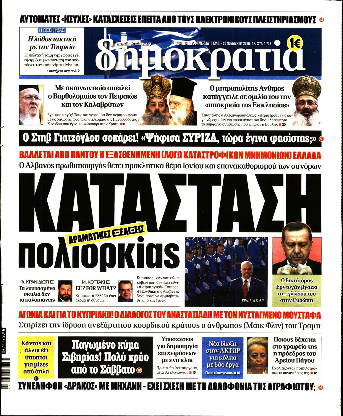 Οι πολιτικές εφημερίδες 24/11/2016 Enikos Newsroom 02:53, Πέμπτη 24 Νοεμβρίου 2016 Media Διαβάστε τα σημερινά πρωτοσέλιδα των πολιτικών εφημερίδων: ΠΟΛΙΤΙΚΕΣ ΕΦΗΜΕΡΙΔΕΣ ΠΡΩΤΟΣΕΛΙΔΑ Μοιράσου το: σχολίασε κι εσύ (0 σχόλια) Ακολουθήστε το enikos.gr στο Google News και μάθετε πρώτοι όλες τις ειδήσεις Δείτε όλες τις τελευταίες ειδήσεις από την Ελλάδα και τον Κόσμο στο enikos.gr Ειδήσεις Ροή Ειδήσεων 14 λεπτά πριν Καιρός: Νέο έκτακτο δελτίο επιδείνωσης από την ΕΜΥ – Ποιες περιοχές θα «χτυπήσει» η κακοκαιρία τα Χριστούγεννα 1 ώρα πριν Live – Έξοδος Χριστουγέννων: Αυξημένη η κίνηση στις Εθνικές Οδούς – Εικόνα αποσυμφόρησης με νέες λωρίδες κυκλοφορίας στα αγροτικά μπλόκα 36 λεπτά πριν Αεροπορικό δυστύχημα στην Τουρκία: Στο μικροσκόπιο ο καταγραφέας ήχου και το μαύρο κουτί – Η αεροσυνοδός Maria Pappa ανάμεσα στα θύματα 2 ώρες πριν Ο Ζελένσκι παρουσίασε νέο ειρηνευτικό σχέδιο 20 σημείων για τον τερματισμό του πολέμου στην Ουκρανία 3 ώρες πριν Φρίκη στη Θεσσαλονίκη: 13χρονη κατήγγειλε ότι έπεσε θύμα ομαδικού βιασμού από 6 αγόρια 2 ώρες πριν Η ζωή για 3 ζώδια γίνεται πολύ πιο εύκολη από εδώ και πέρα – «Εμπιστευτείτε τη διαίσθηση σας για να πάρετε αποφάσεις» 3 ώρες πριν Χαμός στο διαδίκτυο με ανάρτηση μητέρας για όσους δεν έχουν παιδιά – «Κάνουν διακοπές κάθε μέρα» 1 ημέρα πριν Η Coca-Cola και ο Ελληνικός Ερυθρός Σταυρός μαζί αυτά τα Χριστούγεννα: Μια μεγάλη αγκαλιά για τους συνανθρώπους μας που έχουν ανάγκη 1 ώρα πριν Γυναίκα που έχασε 30 κιλά αποκαλύπτει τα μυστικά της επιτυχίας της – «Οι υδατάνθρακες είναι καύσιμο του οργανισμού, όχι εχθρός» 10 λεπτά πριν Σεισμός 6 Ρίχτερ στην Ταϊβάν 14 λεπτά πριν Καιρός: Νέο έκτακτο δελτίο επιδείνωσης από την ΕΜΥ – Ποιες περιοχές θα «χτυπήσει» η κακοκαιρία τα Χριστούγεννα 17 λεπτά πριν Την Κυριακή με τη Realnews: Δωροεπιταγή 10€ 20 λεπτά πριν Έξοδος εκδρομέων για τα Χριστούγεννα: Στείλε βίντεο ή φωτογραφίες στο enikos.gr – Αποθήκευσε τον αριθμό 6944 05 05 05 21 λεπτά πριν Οι άνθρωποι που αποφεύγουν να γιορτάσουν τα Χριστούγεννα με την οικογένειά τους, συνήθως είχαν αυτές τις 8 εμπειρίες στην παιδική ηλικία ENIKOS NETWORK Στο επίκεντρο οι ανάγκες των ατόμων με διαβήτη-Τρεις προτάσεις προς τον ΕΟΦ Πόνος στην κοιλιά στους άνδρες: Με ποιες παθήσεις μπορεί να σχετίζεται Δήμος προσλαμβάνει απόφοιτους Γυμνασίου: Έως και τις 29 Δεκεμβρίου 2025 οι αιτήσεις-Ποιους αφορά Δημόσιο: Αυξημένες οι καθαρές αποδοχές των υπαλλήλων – Δείτε αναλυτικά παραδείγματα Ο Google Assistant θα παραμείνει λίγο περισσότερο για ορισμένους χρήστες Android Τεστ προσωπικότητας: Το βάζο που θα επιλέξετε αποκαλύπτει πώς λύνετε προβλήματα στη ζωή σας περισσότερα 12:05 , Τετάρτη 24 Δεκεμβρίου 2025 Έξοδος εκδρομέων για τα Χριστούγεννα: Στείλε βίντεο ή φωτογραφίες στο enikos.gr – Αποθήκευσε τον αριθμό 6944 05 05 05 Πολλοί έχουν επιλέξει να περάσουν τις γιορτές εκτός πόλης, ωστόσο και φέτος η μαζική έξοδος απ... 10:36 , Τετάρτη 24 Δεκεμβρίου 2025 Τηλεθέαση (23/12): Ποιες πρωινές εκπομπές της ψυχαγωγικής ζώνης πήραν προβάδισμα; Με αμείωτη ένταση συνεχίστηκε η «μάχη» στην πρωινή ζώνη την Τρίτη 23 Δεκεμβρίου, όπως φαίνεται... 10:09 , Τετάρτη 24 Δεκεμβρίου 2025 Την Κυριακή με τη Realnews: Ό,τι και αν αγοράσεις, σκανάρεις και κερδίζεις! Την Κυριακή με τη Realnews: Ό,τι και αν αγοράσεις, σκανάρεις και κερδίζεις! Με το PADU app, το... 10:05 , Τετάρτη 24 Δεκεμβρίου 2025 Τηλεθέαση (23/12): Σάρωσε το reunion του «Παρά Πέντε» το βράδυ της Τρίτης Το βράδυ της Τρίτης (23/12) οι τηλεθεατές παρακολούθησαν το reunion το