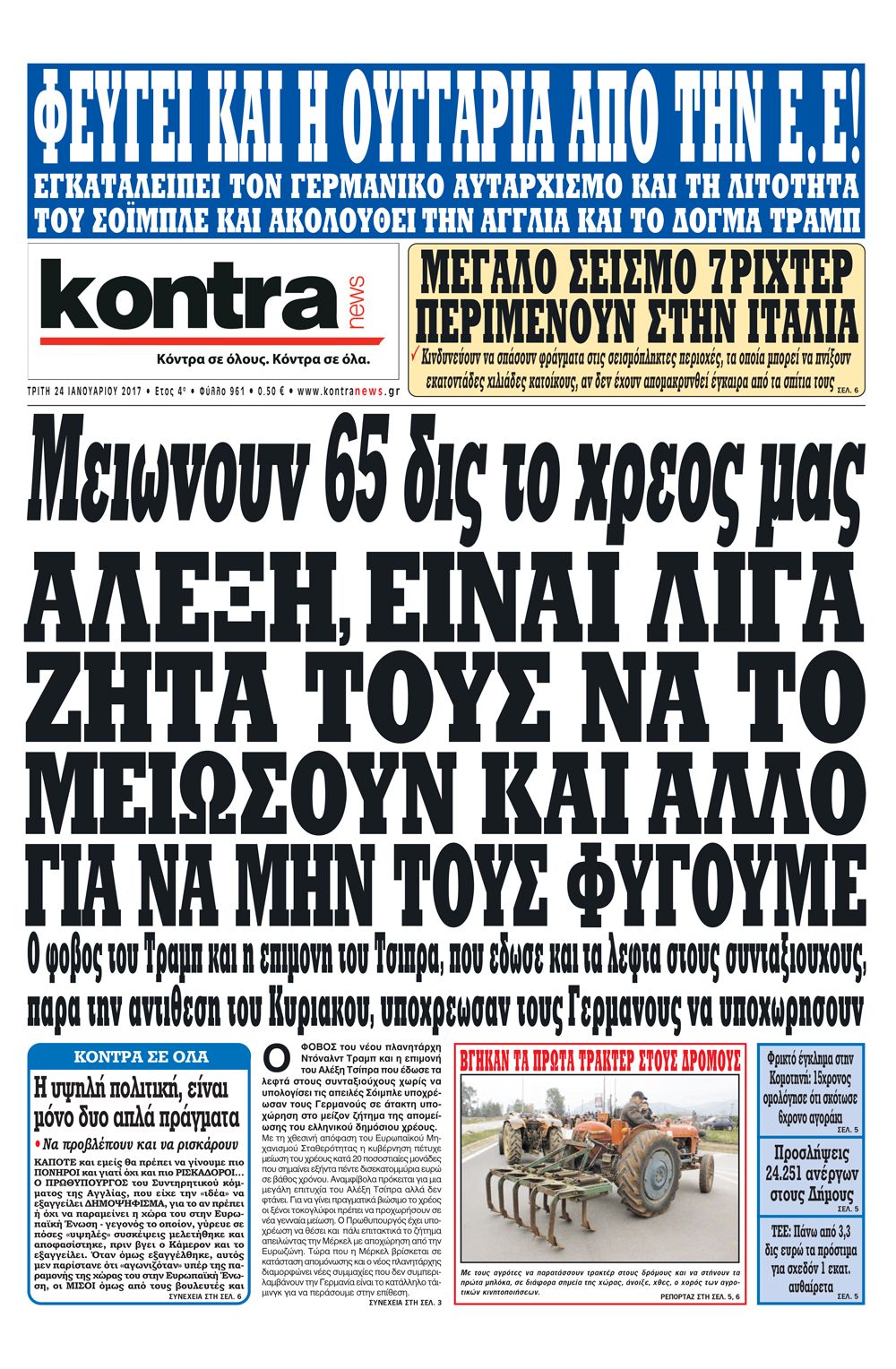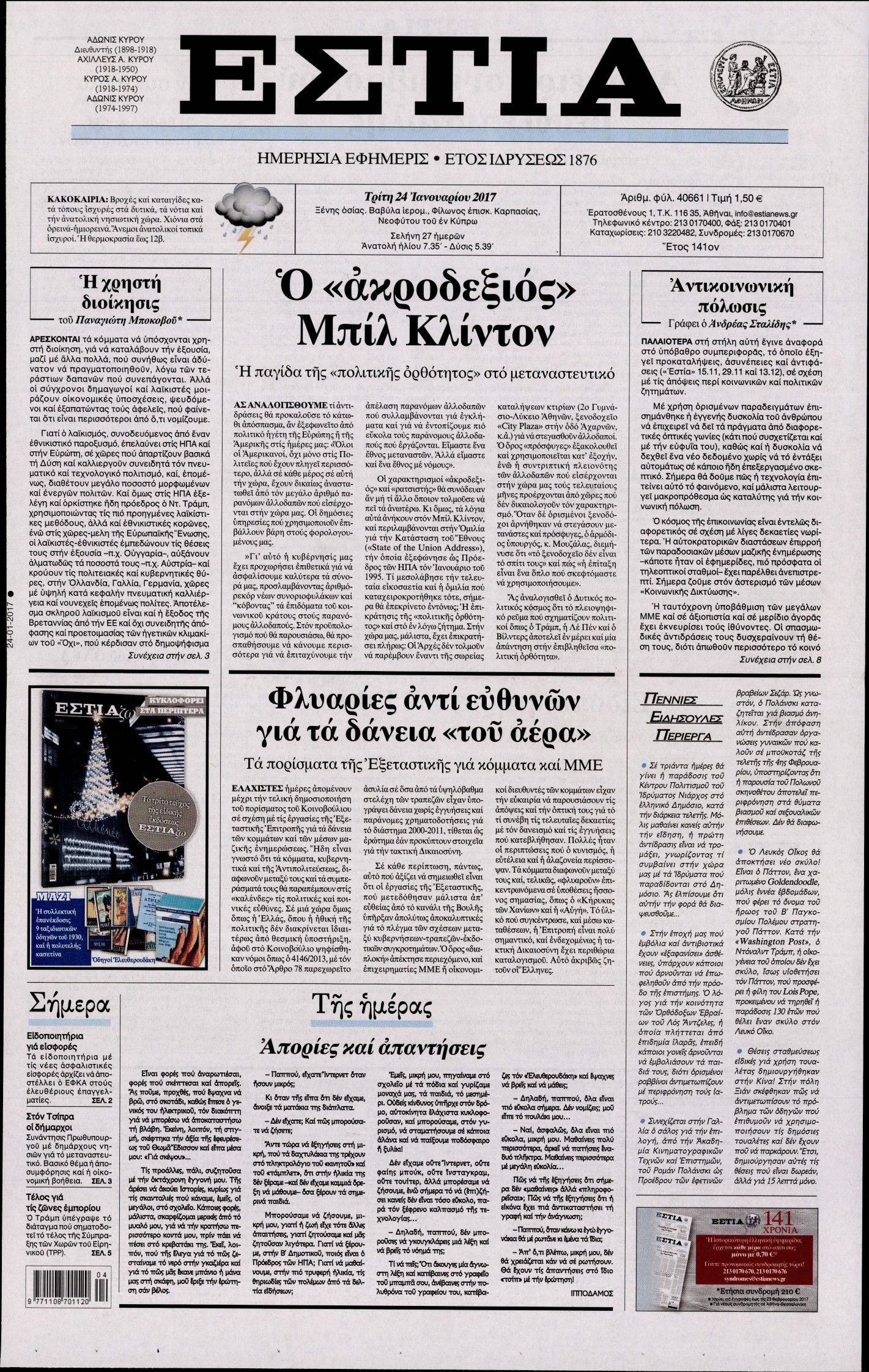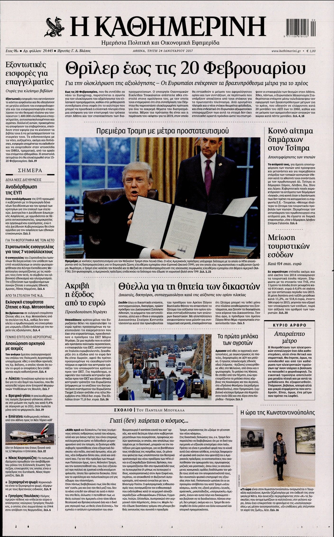 Οι πολιτικές εφημερίδες 24/1/2017 Enikos Newsroom 06:09, Τρίτη 24 Ιανουαρίου 2017 Media Διαβάστε τα σημερινά πρωτοσέλιδα των πολιτικών εφημερίδων: ΠΟΛΙΤΙΚΕΣ ΕΦΗΜΕΡΙΔΕΣ ΠΡΩΤΟΣΕΛΙΔΑ Μοιράσου το: σχολίασε κι εσύ (0 σχόλια) Ακολουθήστε το enikos.gr στο Google News και μάθετε πρώτοι όλες τις ειδήσεις Δείτε όλες τις τελευταίες ειδήσεις από την Ελλάδα και τον Κόσμο στο enikos.gr Ειδήσεις Ροή Ειδήσεων 2 ώρες πριν Κύκλωμα διακίνησης ναρκωτικών σε σχολεία: Βίντεο ντοκουμέντο από τα βασανιστήρια στους ανήλικους – Συζητούσαν για το πώς θα κάνουν «ξέπλυμα χρήματος» 47 λεπτά πριν Κλιμακώνουν τις κινητοποιήσεις τους οι αγρότες: Κλείνουν τη Δευτέρα τις σήραγγες των Τεμπών για τα φορτηγά – Ανοίγουν την Τρίτη τους δρόμους για τους εκδρομείς 2 ώρες πριν Αιματηρό επεισόδιο στον Άγιο Παντελεήμονα – Δύο τραυματίες, αναζητείται ο δράστης 55 λεπτά πριν ΗΠΑ: Αυξάνουν την πίεση στην Βενεζουέλα – Το νέο ρεσάλτο σε τάνκερ και ο στόχος του Τραμπ 1 ώρα πριν Κασσελάκης για παραίτηση Μάλαμα: «Η πορεία μας δεν θα καθοριστεί από μεμονωμένα πρόσωπα, μηχανισμούς και προσωπικές ατζέντες» 2 ώρες πριν Ύπνος: Τι είναι ο «κανόνας 3-3-3» που χρησιμοποιεί ένας γιατρός για να ξεχωρίσει την κόπωση από την αϋπνία 3 ώρες πριν Αριθμολογία: Οι άνθρωποι που έχουν γεννηθεί αυτές τις 4 ημερομηνίες, είναι οι πιο πιστοί και αφοσιωμένοι σύντροφοι 42 λεπτά πριν Αρχαιολογικό θρίλερ στην καρδιά της Ευρώπης: Παράξενο θραύσμα με ανάγλυφα και σφηνοειδή γραφή ανακαλύφθηκε σε μέρος που δεν περίμενε κανείς 2 ημέρες πριν Enerwave: Το νέο «ρεύμα» στη λιανική ενέργειας που αλλάζει την εμπειρία του καταναλωτή 23 λεπτά πριν Super League: Καλά… ΑΕΚούγεννα με «κιτρινόμαυρη» κορυφή, σε απόσταση αναπνοής ο Ολυμπιακός, στο -2 ο ΠΑΟΚ – Τα αποτελέσματα και η βαθμολογία 39 λεπτά πριν ΑΕΚ – ΟΦΗ 2-1: Γιορτές στην κορυφή με… ανατροπή 42 λεπτά πριν Αρχαιολογικό θρίλερ στην καρδιά της Ευρώπης: Παράξενο θραύσμα με ανάγλυφα και σφηνοειδή γραφή ανακαλύφθηκε σε μέρος που δεν περίμενε κανείς 47 λεπτά πριν Κλιμακώνουν τις κινητοποιήσεις τους οι αγρότες: Κλείνουν τη Δευτέρα τις σήραγγες των Τεμπών για τα φορτηγά – Ανοίγουν την Τρίτη τους δρόμους για τους εκδρομείς 48 λεπτά πριν Γουίτκοφ: «Εποικοδομητικές και παραγωγικές» οι συνομιλίες στο Μαϊάμι ENIKOS NETWORK Οι γυναίκες έχουν βρει μια νέα απόλαυση στην κρεβατοκάμαρα που οι περισσότεροι άνδρες αγνοούν Christmas glow: 5 χρυσές συμβουλές για επιδερμίδα που λάμπει από ομορφιά τα Χριστούγεννα Νέο έτος ρεκόρ για τον ελληνικό τουρισμό το 2025: «Είμαστε μέσα στους 10 πλέον επισκέψιμους προορισμούς παγκοσμίως» λέει η ... Τιμές καυσίμων: Πόσο θα πληρώσουν οι εκδρομείς των Χριστουγέννων – Το κόστος μετακινήσεων σε δημοφιλείς προορισμούς Χαρτογραφώντας το «σημείο χωρίς επιστροφή»: Για πρώτη φορά αποκαλύπτεται με λεπτομέρεια το ακανθώδες όριο της ατμόσφαιρας τ... Η Google καταργεί τη λειτουργία «dark web report» – Πώς θα μπορούν οι χρήστες να διαγράφουν τα δεδομένα τους περισσότερα 21:30 , Κυριακή 21 Δεκεμβρίου 2025 Ο Δικαστής: Στα χέρια της Αστυνομίας βίντεο, που ανατρέπει όλα τα δεδομένα – Στενεύει ο κλοιός γύρω από τον Δικαστή Καταιγιστικές εξελίξεις στο τελευταίο επεισόδιο της χρονιάς της σειράς “Ο Δικαστής”... 17:18 , Κυριακή 21 Δεκεμβρίου 2025 «Η Μεγάλη Χίμαιρα»: Μάγεψε το κοινό κατά την avant-première της προβολής της Την Πρωτοχρονιά (Πέμπτη 1η Ιανουαρίου 2026) στο ERTFLIX θα γίνει η πρεμιέρα της πολυαναμενόμεν... 15:08 , Κυριακή 21 Δεκεμβρίου 2025 Μια νύχτα μόνο: Η Αρετή κ