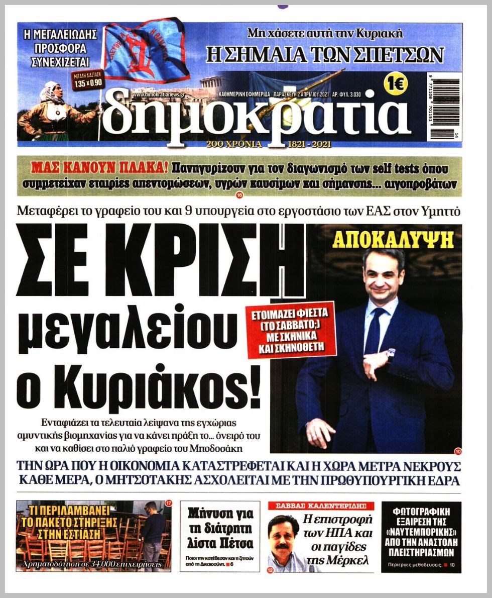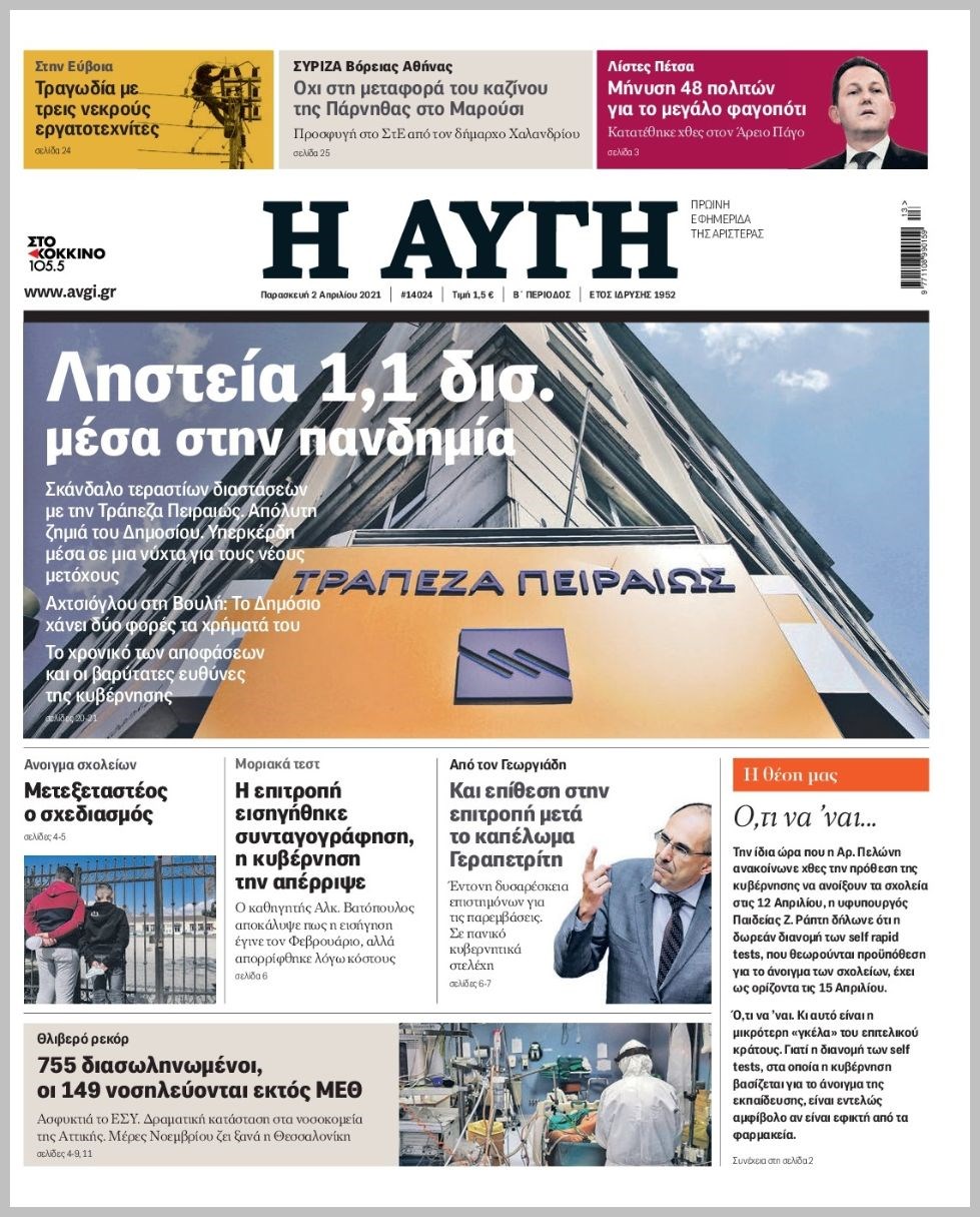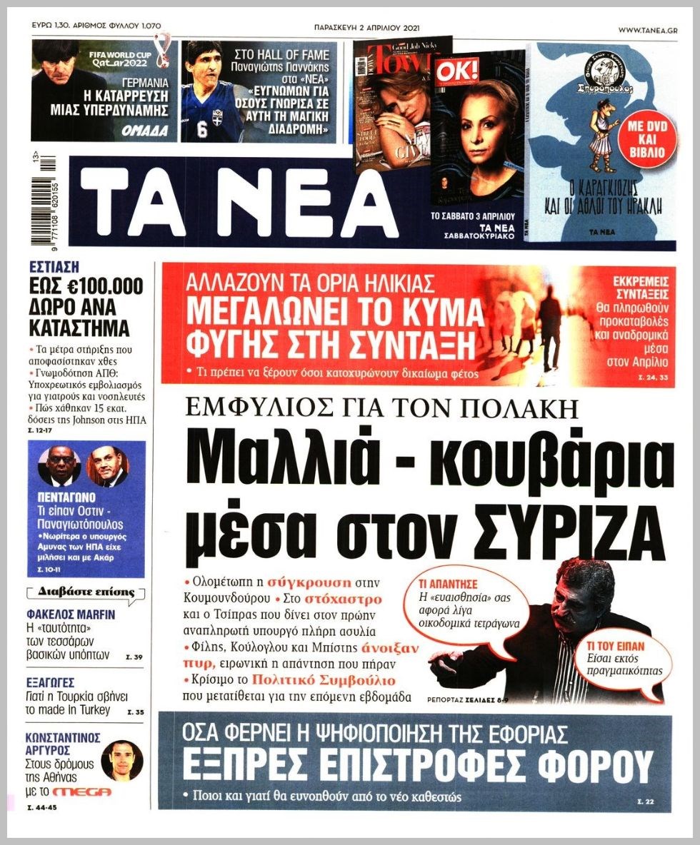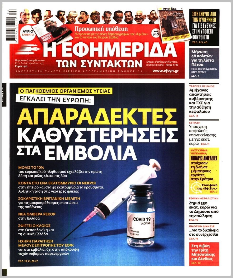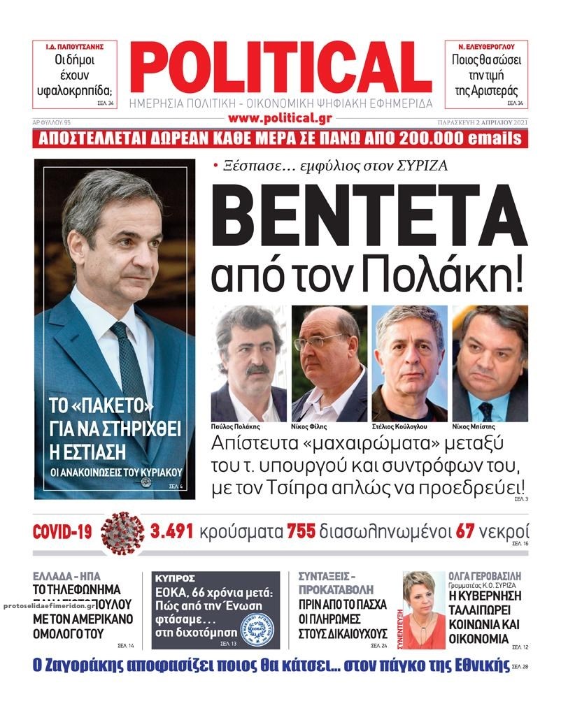 Οι πολιτικές εφημερίδες 2/4/2021 Διονύσης Νίκκας 06:10, Παρασκευή 02 Απριλίου 2021 Media Διαβάστε τα πρωτοσέλιδα των πολιτικών εφημερίδων… ΕΦΗΜΕΡΙΔΕΣ ΠΡΩΤΟΣΕΛΙΔΑ Μοιράσου το: σχολίασε κι εσύ (0 σχόλια) Ακολουθήστε το enikos.gr στο Google News και μάθετε πρώτοι όλες τις ειδήσεις Δείτε όλες τις τελευταίες ειδήσεις από την Ελλάδα και τον Κόσμο στο enikos.gr Ειδήσεις Ροή Ειδήσεων 4 ώρες πριν Υπόθεση Έπσταϊν: Το Υπουργείο Δικαιοσύνης δημοσιοποίησε μια σειρά από εξαιρετικά επεξεργασμένα αρχεία – «Λείπουν τα πιο σημαντικά έγγραφα», λένε οι Δημοκρατικοί 46 λεπτά πριν Γιορτές με μπλόκα για τους αγρότες: Ανοίγουν διόδια και μοιράζουν προϊόντα στους ταξιδιώτες 1 ώρα πριν Εξαφάνιση 33χρονου γιατρού στην Κρήτη: «Άναψα τα φώτα, τρόμαξε και άρχισε να τρέχει στα χωράφια» – Η τελευταία διαδρομή και η μαρτυρία «κλειδί» 3 ώρες πριν Ο «χάρτης» με τις αυξήσεις και τις φοροελαφρύνσεις του 2026 – Ποιοι και πόσα κερδίζουν 1 ώρα πριν Τα αρχεία του Έπσταϊν αποκαλύπτουν φωτογραφία του έκπτωτου πρίγκιπα Άντριου – Είναι ξαπλωμένος στην αγκαλιά 5 γυναικών 1 ώρα πριν Μία νέα «χρυσή» περίοδος αρχίζει για 3 ζώδια από σήμερα – «Μία αναπάντεχη ευκαιρία οδηγεί στην επιτυχία» 5 ώρες πριν Αυγά: Πόσα μπορείτε να τρώτε την ημέρα με ασφάλεια για μέγιστη πρόσληψη πρωτεΐνης 3 ώρες πριν Αρχαιολόγοι ανακάλυψαν σε χωράφι απεικόνιση 600 ετών ενός Αγίου – Τα στοιχεία που δείχνουν ότι μαρτύρησε 2 ώρες πριν Αγχώνεται για το χριστουγεννιάτικο δώρο που πήρε στην πλούσια σύντροφό του – «Φοβάμαι πως θα το βρει φθηνιάρικο, φοράει βραχιόλια Cartier» 4 λεπτά πριν Τα Labubu «μετακομίζουν» στο Χόλιγουντ: Η Sony Pictures ετοιμάζει live-action ταινία με τον σκηνοθέτη του «Wonka» 11 λεπτά πριν Νέες ταυτότητες: Μεγάλη αναμονή για ραντεβού στην Αττική – Τέλος τα ταξίδια εκτός Ελλάδος από τον Αύγουστο για όσους δεν έχουν αλλάξει 20 λεπτά πριν Οι 7 φράσεις που δεν λένε ποτέ οι συναισθηματικά έξυπνοι άνθρωποι κατά τη διάρκεια ενός καβγά 23 λεπτά πριν Τηλεθέαση (19/12): Ανατροπές και πρωτιές στην πρωινή ζώνη 31 λεπτά πριν Πώς η κλιματική αλλαγή επηρεάζει εγκύους και βρέφη – Οι επιπτώσεις των υψηλών θερμοκρασιών ENIKOS NETWORK Είστε μόνιμα απρόσεκτοι; 3 σημάδια που δείχνουν ότι μπορεί να είναι σύμπτωμα πάθησης Πόσα κιλά παίρνουμε πραγματικά τα Χριστούγεννα, σύμφωνα με την επιστήμη – Πώς να το αποτρέψουμε; e-ΕΦΚΑ και ΔΥΠΑ: Έρχονται νέες πληρωμές έως τις 24 Δεκεμβρίου – Ποιοι πάνε ταμείο Επίδομα παιδιού: Τι αλλάζει από το 2026 – Το όφελος από τις φορολογικές ελαφρύνσεις Χαρτογραφώντας το «σημείο χωρίς επιστροφή»: Για πρώτη φορά αποκαλύπτεται με λεπτομέρεια το ακανθώδες όριο της ατμόσφαιρας τ... Η Google καταργεί τη λειτουργία «dark web report» – Πώς θα μπορούν οι χρήστες να διαγράφουν τα δεδομένα τους περισσότερα 09:30 , Σάββατο 20 Δεκεμβρίου 2025 «Porto Leone: Στη γειτονιά με τα κόκκινα φανάρια» – Ο Χρόνης αποκαλύπτει στην Αλεξάνδρα το μυστικό για το παιδί της Λένας Η μεγάλη δραματική σειρά του Apha «Porto Leone: Στη γειτονιά με τα κόκκινα φανάρια» μας μεταφέ... 08:14 , Σάββατο 20 Δεκεμβρίου 2025 Τρομεροί γονείς: Η Μαρία Καβογιάννη εισβάλλει στο σπίτι της οικογένειας Στεφανίδη Όσα θα δούμε στο νέο διπλό επεισόδιο της σειράς «Τρομεροί γονείς», σήμερα Σάββατο 20 Δεκεμβρίο... 05:48 , Σάββατο 20 Δεκεμβρίου 2025 Οι οικονομικές εφημερίδες 20/12/2025 Διαβάστε τα πρωτοσέλιδα από τις οικονομικές εφημερίδες, σήμερα 20/12/2025. 05:43 , Σάββατο 20 Δεκεμβρίου 2025 Οι αθλητικές εφημερίδες 20/12/2025 Διαβάστε τα πρωτοσέλιδα από τις αθλη