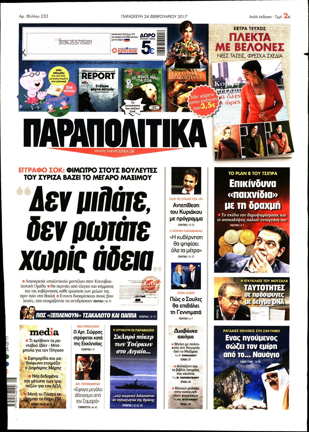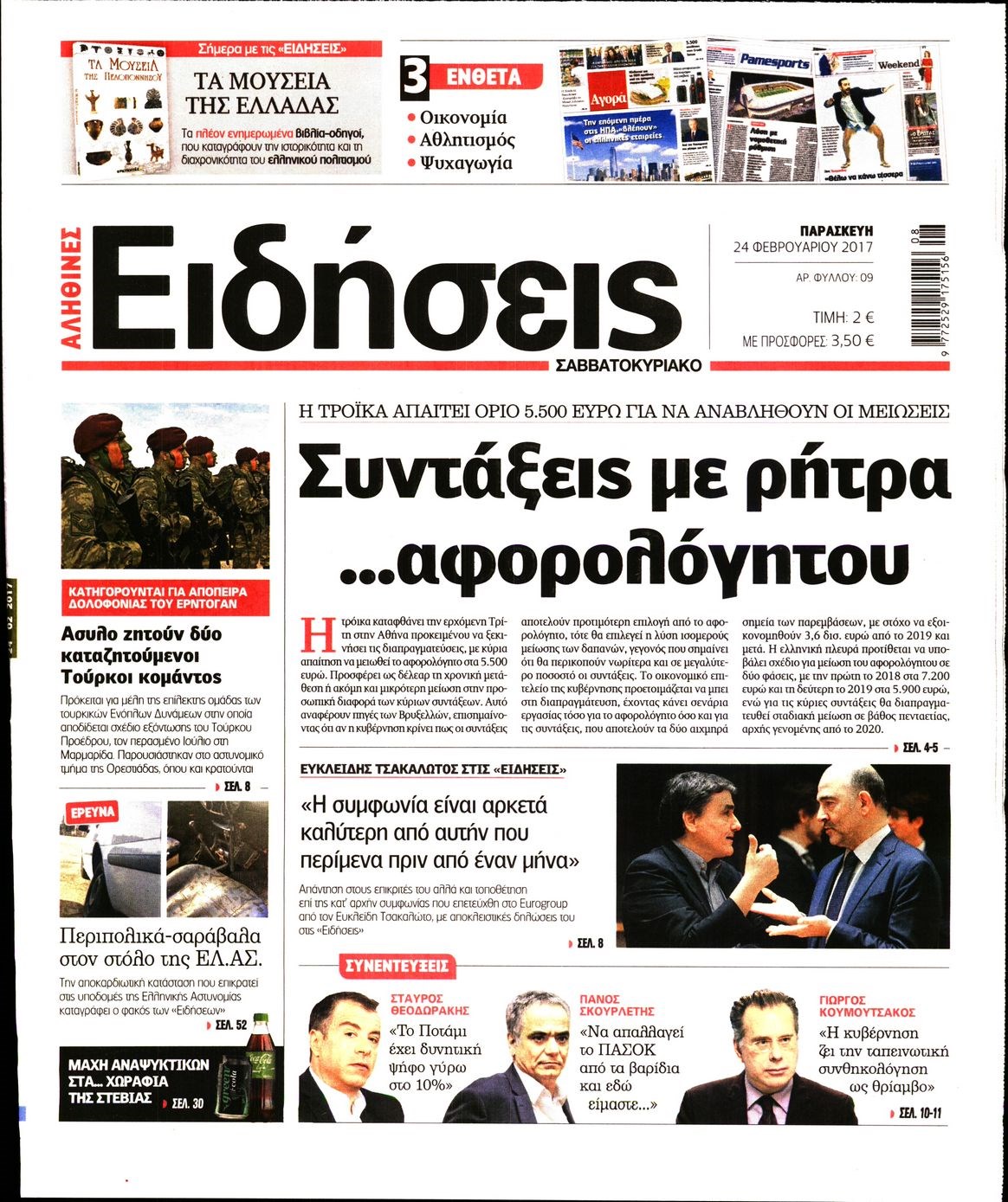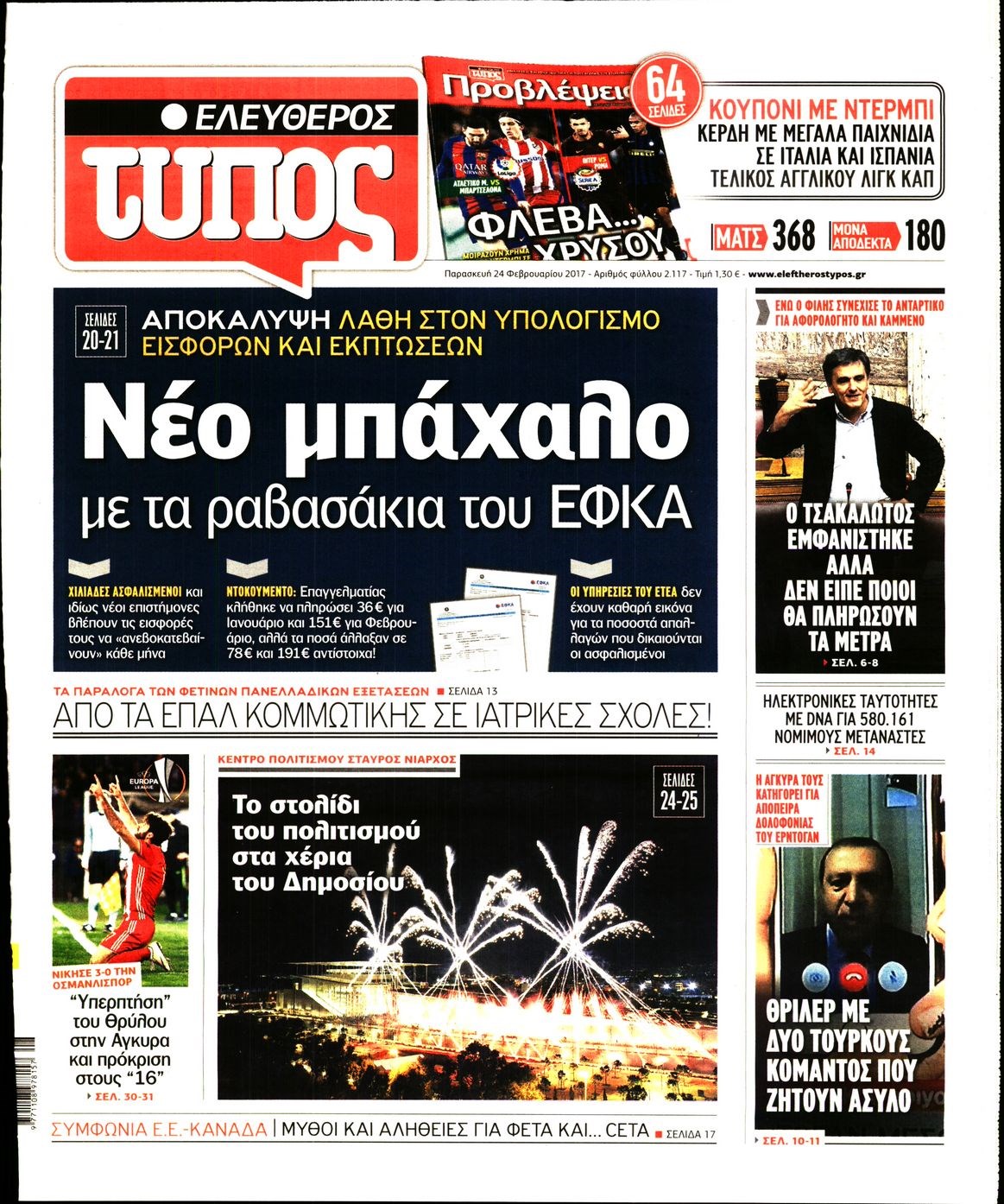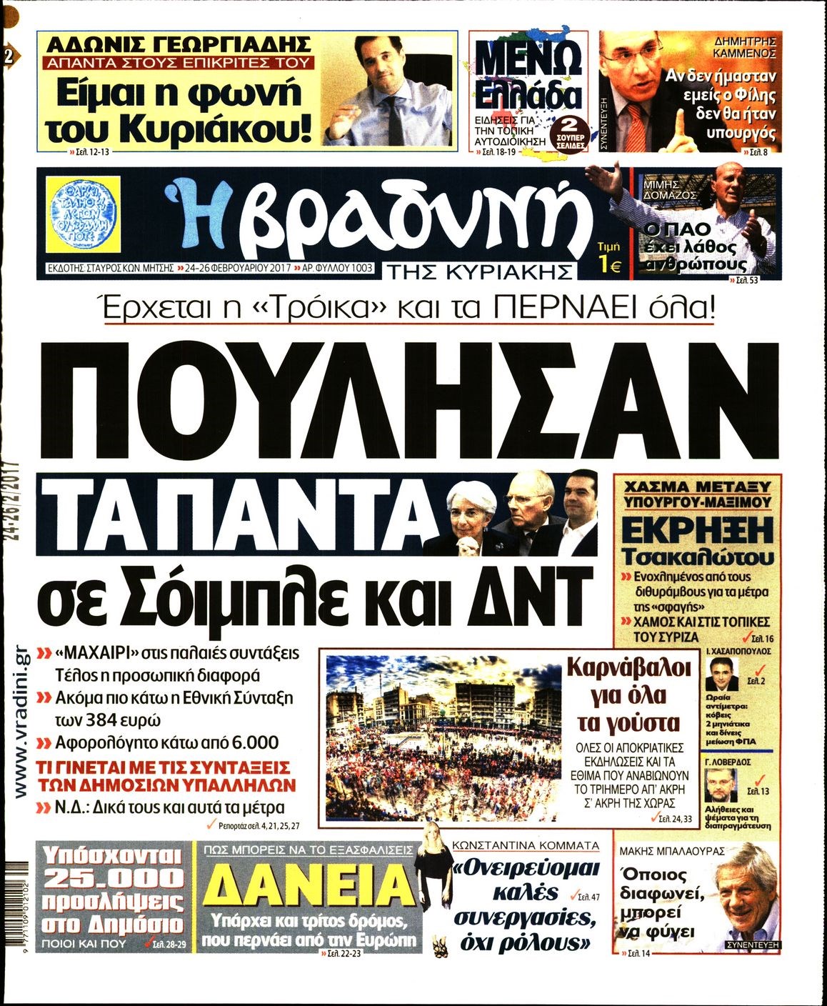 Οι πολιτικές εφημερίδες 24/2/2017 Enikos Newsroom 06:53, Παρασκευή 24 Φεβρουαρίου 2017 Media Διαβάστε τα σημερινά πρωτοσέλιδα των πολιτικών εφημερίδων: ΠΟΛΙΤΙΚΕΣ ΕΦΗΜΕΡΙΔΕΣ ΠΡΩΤΟΣΕΛΙΔΑ Μοιράσου το: σχολίασε κι εσύ (0 σχόλια) Ακολουθήστε το enikos.gr στο Google News και μάθετε πρώτοι όλες τις ειδήσεις Δείτε όλες τις τελευταίες ειδήσεις από την Ελλάδα και τον Κόσμο στο enikos.gr Ειδήσεις Ροή Ειδήσεων 45 λεπτά πριν Υπόθεση Έπσταϊν: Το Υπουργείο Δικαιοσύνης δημοσιοποίησε μια σειρά από εξαιρετικά επεξεργασμένα αρχεία – «Λείπουν τα πιο σημαντικά έγγραφα», λένε οι Δημοκρατικοί 2 ώρες πριν Σαρωτικοί οι έλεγχοι στους δρόμους ενόψει εορτών – Μπλόκα της τροχαίας σε κεντρικές αρτηρίες της Αττικής 56 λεπτά πριν ΟΝΕΧ – MEGATUGS: Ξεκίνησε η ναυπήγηση ρυμουλκών στην Ελλάδα – Προθάλαμος πολεμικών πλοίων – Δείτε φωτογραφίες και βίντεο 48 λεπτά πριν Καιρός: Αλλαγή σκηνικού σήμερα με βροχές και πτώση της θερμοκρασίας – Οι προβλέψεις των μετεωρολόγων για τα Χριστούγεννα 10 ώρες πριν Χριστούγεννα στα μπλόκα: Επιμένουν στις κινητοποιήσεις τους οι αγρότες – Ανοίγουν τα διόδια το Σαββατοκύριακο 3 ώρες πριν Αυγά: Πόσα μπορείτε να τρώτε την ημέρα με ασφάλεια για μέγιστη πρόσληψη πρωτεΐνης 3 ώρες πριν Τα ζώδια σήμερα, Σάββατο 20 Δεκεμβρίου: Παρθένοι, το σύμπαν σας δίνει το κλειδί 2 ώρες πριν Οπτική ψευδαίσθηση: Μόνο αν είσαι ο Σέρλοκ Χολμς θα βρεις τον αριθμό «87» σε 7 δευτερόλεπτα 25 λεπτά πριν Αρχαιολόγοι ανακάλυψαν σε χωράφι απεικόνιση 600 ετών ενός Αγίου – Τα στοιχεία που δείχνουν ότι μαρτύρησε 1 λεπτό πριν Η τέλεια συνταγή για cookies με κομμάτια σοκολάτας 9 λεπτά πριν MyHealth App: Τα στοιχεία για τον Προσωπικό Βοηθό Υγείας Πολίτη – Τι ερωτήματα έγιναν μέσα σε 7 ημέρες 17 λεπτά πριν Τρομεροί γονείς: Η Μαρία Καβογιάννη εισβάλλει στο σπίτι της οικογένειας Στεφανίδη 25 λεπτά πριν Αρχαιολόγοι ανακάλυψαν σε χωράφι απεικόνιση 600 ετών ενός Αγίου – Τα στοιχεία που δείχνουν ότι μαρτύρησε 32 λεπτά πριν Mega χριστουγεννιάτικη φορολοταρία: «Κλείδωσε» η ημερομηνία για την κλήρωση – Ερωτήσεις και απαντήσεις ENIKOS NETWORK Το τεστ των 10 δευτερολέπτων που μπορεί να προβλέψει το προσδόκιμο ζωής σας – Τι λέει ειδικός του Cleveland Επιλέξτε καρέκλα για να μάθετε ποια είναι τα κρυφά χαρακτηριστικά σας – Τι αποκάλυψε για εσάς αυτό το τεστ προσωπικότητας; Mega χριστουγεννιάτικη φορολοταρία: «Κλείδωσε» η ημερομηνία για την κλήρωση – Ερωτήσεις και απαντήσεις Αναστολή μέτρων αναγκαστικής εκτέλεσης για κτηνοτρόφους που πλήττονται από την ευλογιά των αιγοπροβάτων Χαρτογραφώντας το «σημείο χωρίς επιστροφή»: Για πρώτη φορά αποκαλύπτεται με λεπτομέρεια το ακανθώδες όριο της ατμόσφαιρας τ... Η Google καταργεί τη λειτουργία «dark web report» – Πώς θα μπορούν οι χρήστες να διαγράφουν τα δεδομένα τους περισσότερα 08:14 , Σάββατο 20 Δεκεμβρίου 2025 Τρομεροί γονείς: Η Μαρία Καβογιάννη εισβάλλει στο σπίτι της οικογένειας Στεφανίδη Όσα θα δούμε στο νέο διπλό επεισόδιο της σειράς «Τρομεροί γονείς», σήμερα Σάββατο 20 Δεκεμβρίο... 05:48 , Σάββατο 20 Δεκεμβρίου 2025 Οι οικονομικές εφημερίδες 20/12/2025 Διαβάστε τα πρωτοσέλιδα από τις οικονομικές εφημερίδες, σήμερα 20/12/2025. 05:43 , Σάββατο 20 Δεκεμβρίου 2025 Οι αθλητικές εφημερίδες 20/12/2025 Διαβάστε τα πρωτοσέλιδα από τις αθλητικές εφημερίδες, σήμερα 20/12/2025. 05:38 , Σάββατο 20 Δεκεμβρίου 2025 Οι πολιτικές εφημερίδες 20/12/2025 Διαβάστε τα πρωτοσέλιδα από τις πολιτικές εφημερίδες, σήμερα 20/12/2025. ΤΕΛΕΥΤΑΙΕΣ ΕΙΔΗΣΕΙΣ 9 λεπτά πριν MyHealth App: Τα στοιχεία γ